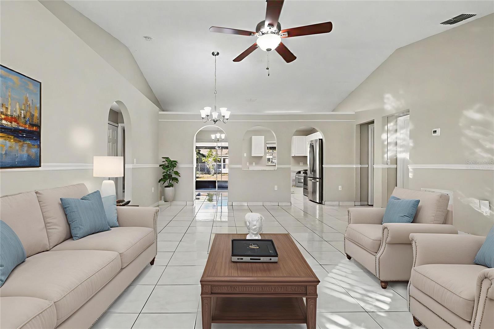 One or more photo(s) has been virtually staged. Welcome to this charming home offering great curb appeal and a functional, inviting layout. Featuring three bedrooms and two bathrooms, this property provides comfortable living spaces including a spacious family room and a separate dining room ideal for gatherings. The kitchen showcases cabinetry and is equipped with a dishwasher, microwave, and range, making it ready for everyday use. Tile flooring runs throughout the home, offering durability and easy maintenance. A garage adds convenience and additional storage. Screened in Florida room is perfect for entertaining. Step outside to enjoy the open backyard, providing plenty of space to relax, entertain, or personalize to your needs. This home presents a wonderful opportunity for comfortable living in a well-maintained setting.