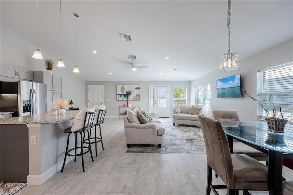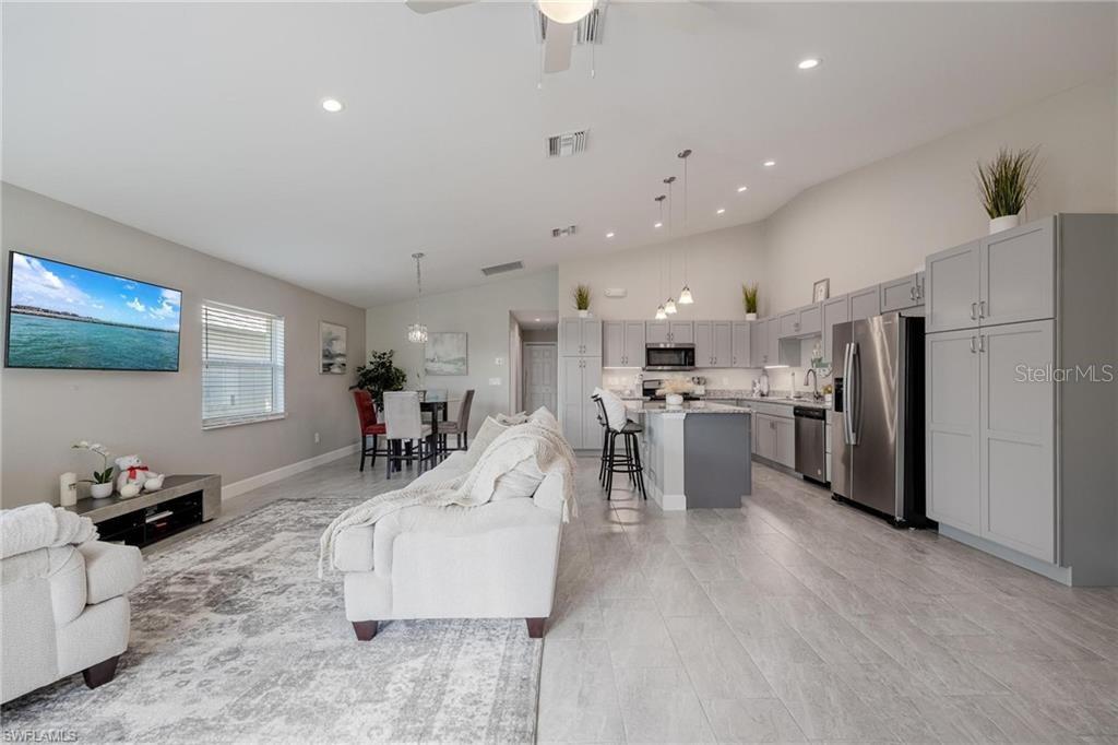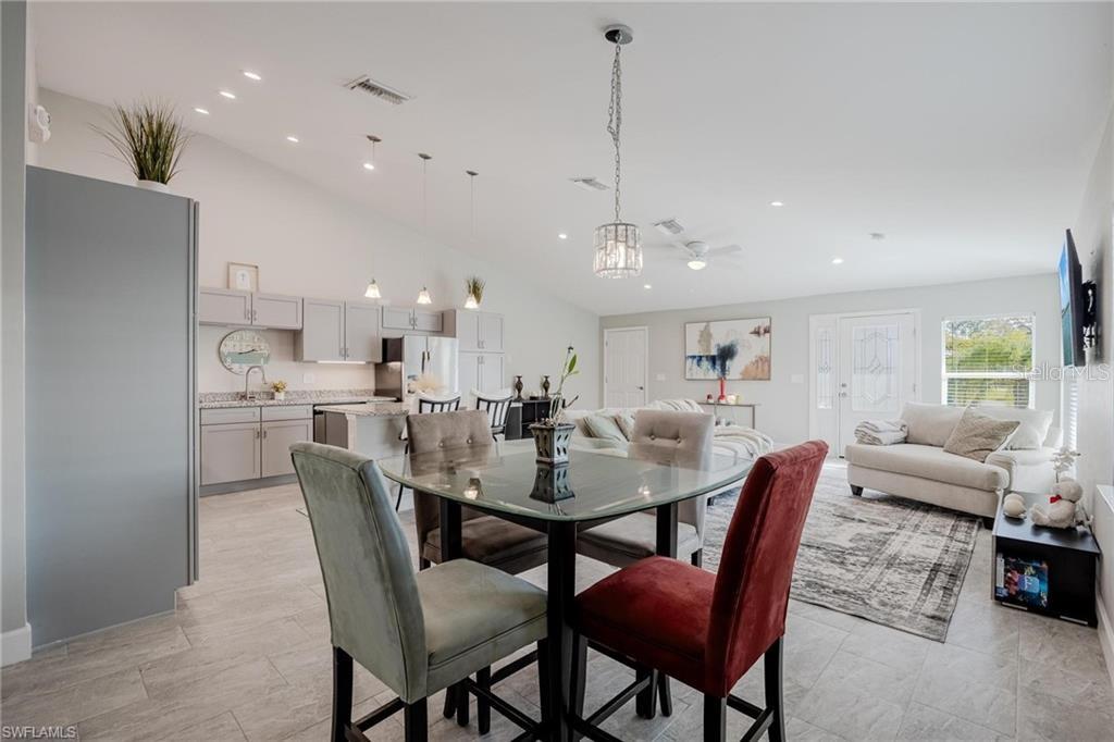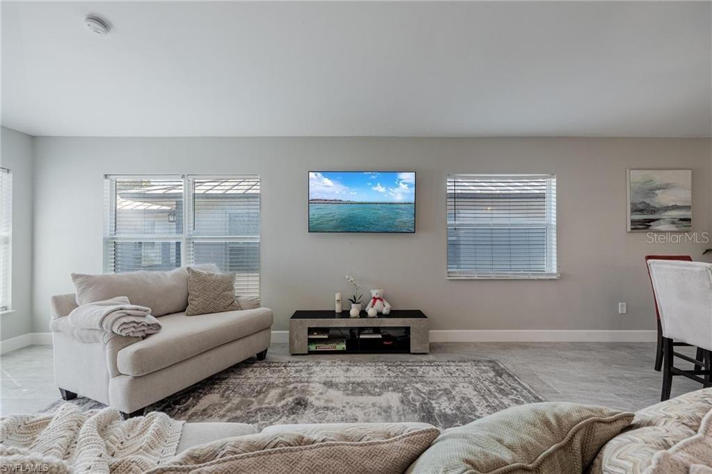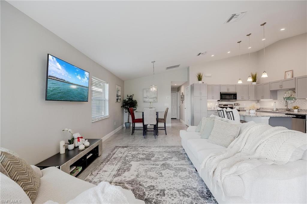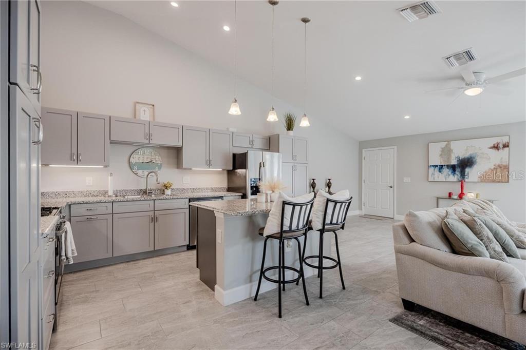 AN EXCELLENT STARTER/RETIREMENT HOME, RENTAL INVESTMENT OR CONVENIENT PLACE FOR A PARENT(S) OR EMPLOYEE. Come see this former Model Home! It's not only gorgeous & well taken care of it is concrete block construction & a seamless galvalume metal roof. This villa is energy efficient with solar roof exhaust fan & skylight. The stove, insta-hot water tank & dryer are all natural gas. It also comes with led lighting inside & low voltage accent lighting outside. Storm ready with hurricane impact windows & doors, fiberoptics, underground utilities & each room wired for TV. This home features a spacious open floor plan with cathedral ceiling & island kitchen. There are 2 bedrooms & 2 fully tiled bathrooms plus a laundry/utility closet with gas stack washer & dryer. Your breath will be taken away by the spectacular kitchen with upgraded gray tone cabinets, granite counter tops, island with bar seating, and stainless steel appliances. City Village allows you to relax & enjoy life without the worry of outside lawn or building maintenance—enjoy a “no hassle” lifestyle. City Village is a small community of 18 total homes for a total of 36 villas with easy access to SR 80, shopping and dining.
