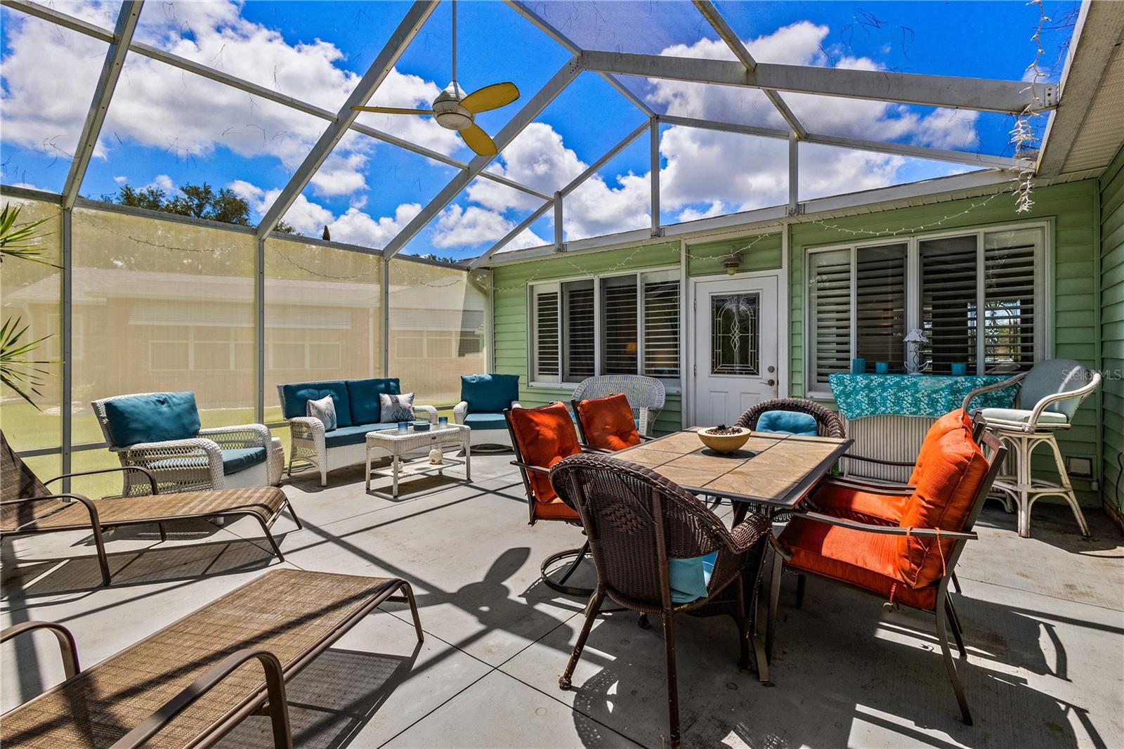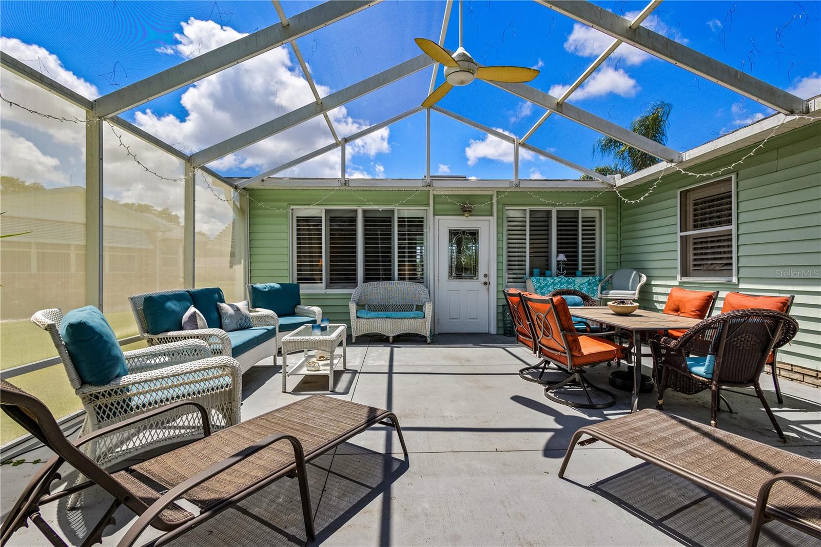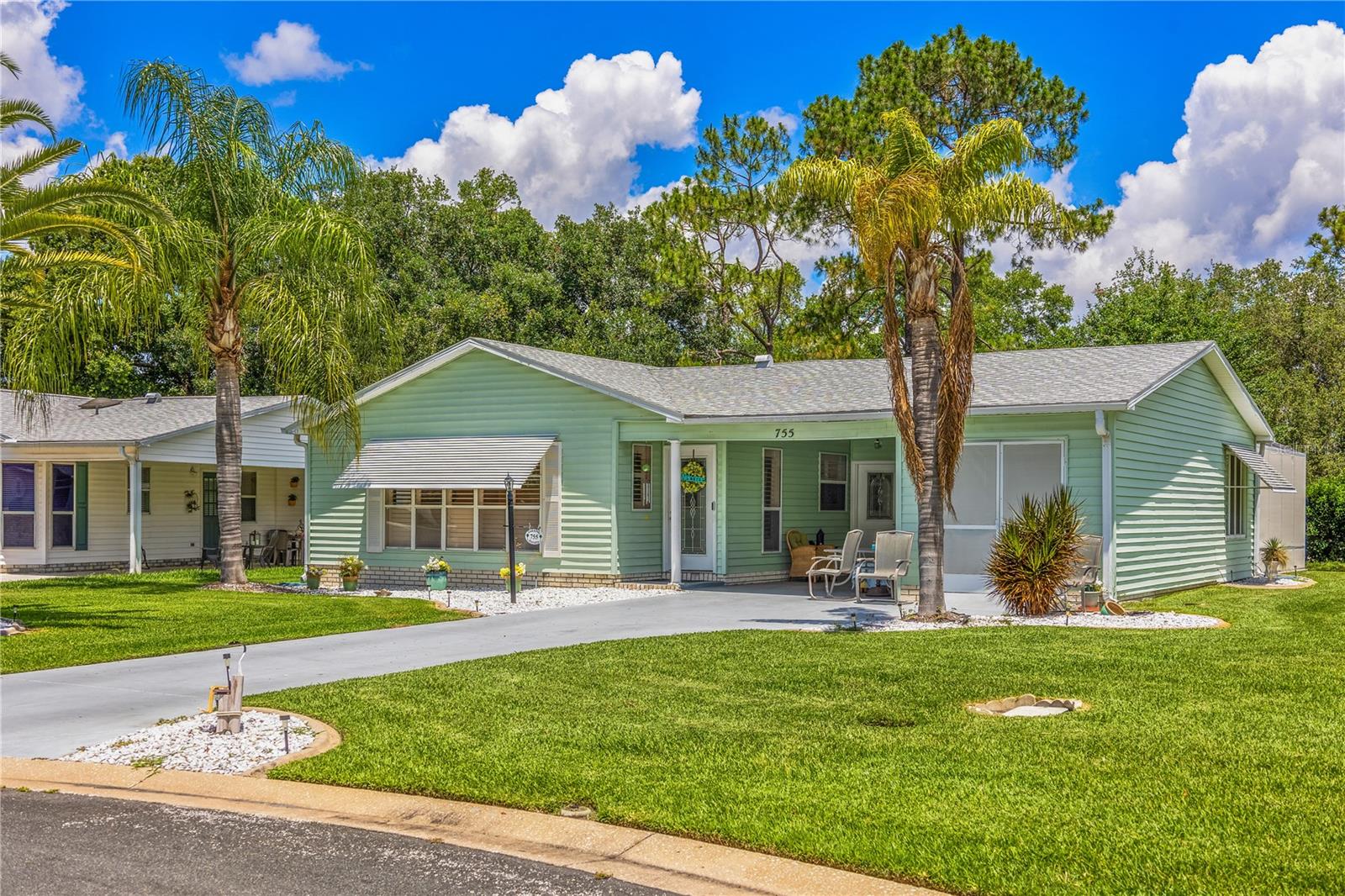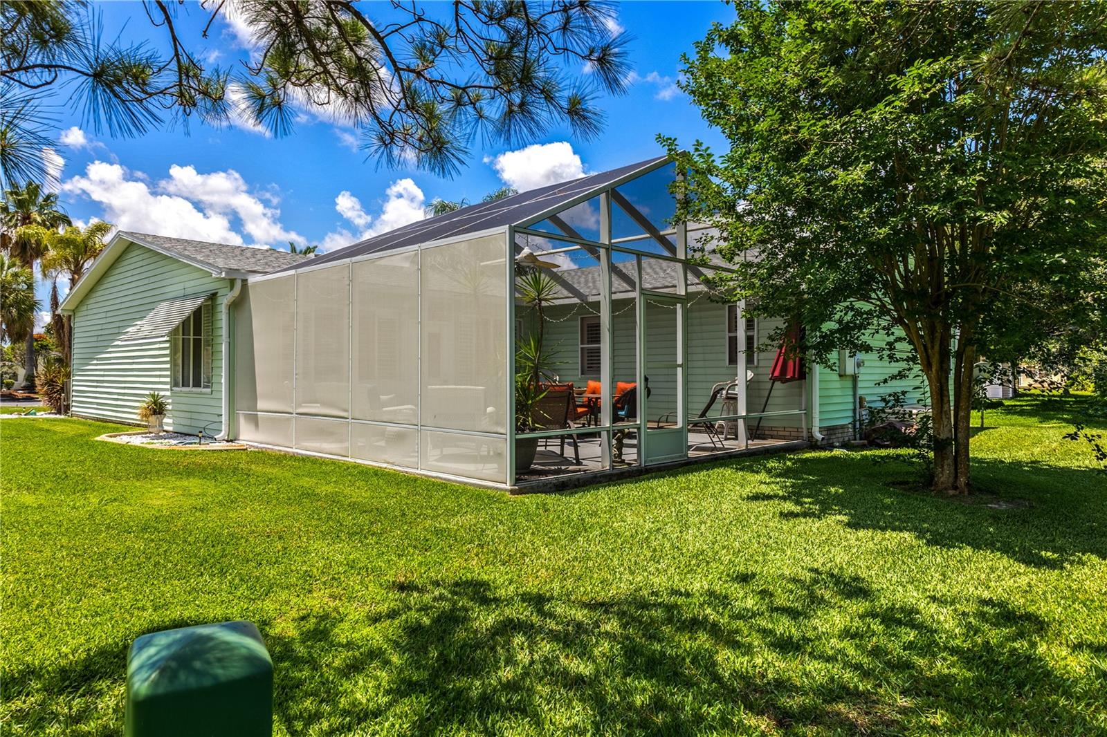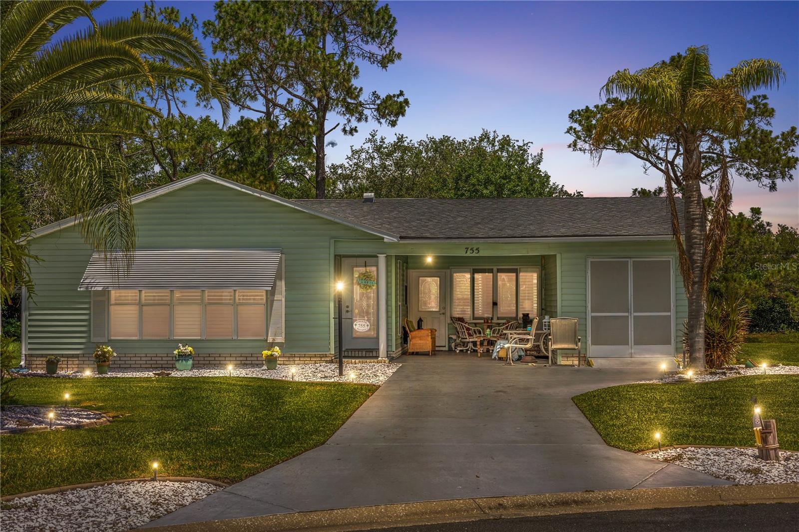 ~Best location in town~ NO BOND! Roof 2022. Welcome to best of coastal-style living in this pristine cottage 2/2 home! Just minutes to Spanish Springs and nestled in the highly desired Village of El Cortez on a cul-de-sac, this adorable home is the hub of entertaining with a large, central carport beckoning neighbors to join you for morning coffee. The large lanai overlooks a private backyard with mature trees. Your private backyard oasis has NO NEIGHBORS BEHIND YOU. The kitchen offers QUARTZ COUNTERTOPS, an eat-in breakfast bar, pantry and an INSIDE LAUNDRY room, Plantation shutters, Skylights, BEAUTIFUL front door. The bedrooms are spacious with the primary bedroom offering a large closet, new extended vanity space with walk in shower. Located in the world's largest 55+ community, The Villages, and conveniently located minutes to the popular SPANISH SPRINGS TOWN SAUARE with newer restaurants (Coastal del Mar, Bella Vita) and entertainment, including the new Blondie's outside bar. You don't want to miss your opportunity to own your slice of heaven! Chula Vista Clubhouse, pool and mail station and the Multi-Modal Path is just steps away for your morning walk. Spanish Springs Town Square is less than 1 mile away for all your Shopping, Restaurants and Entertainment. This home is truly a magical find, schedule your showing today.