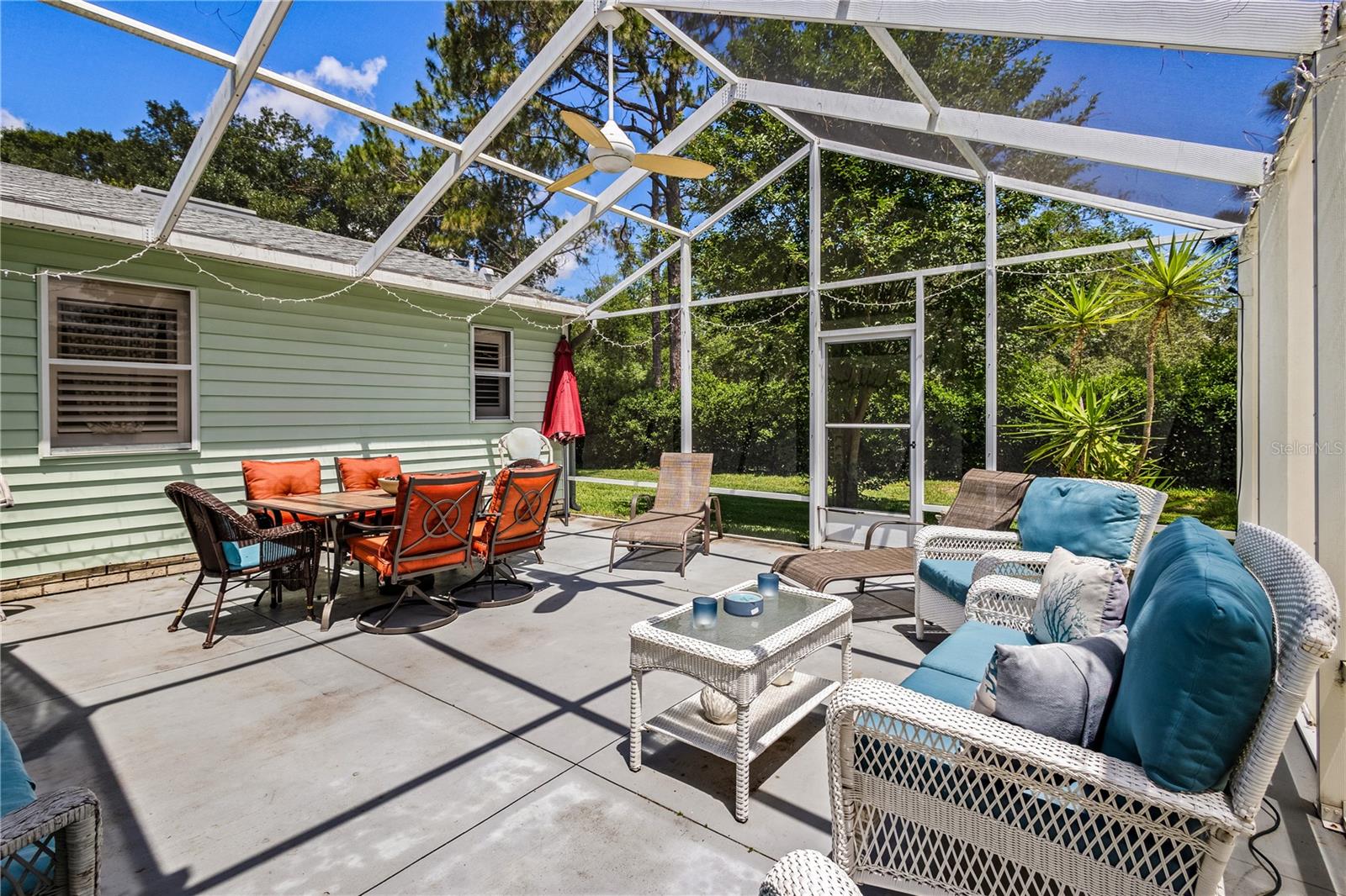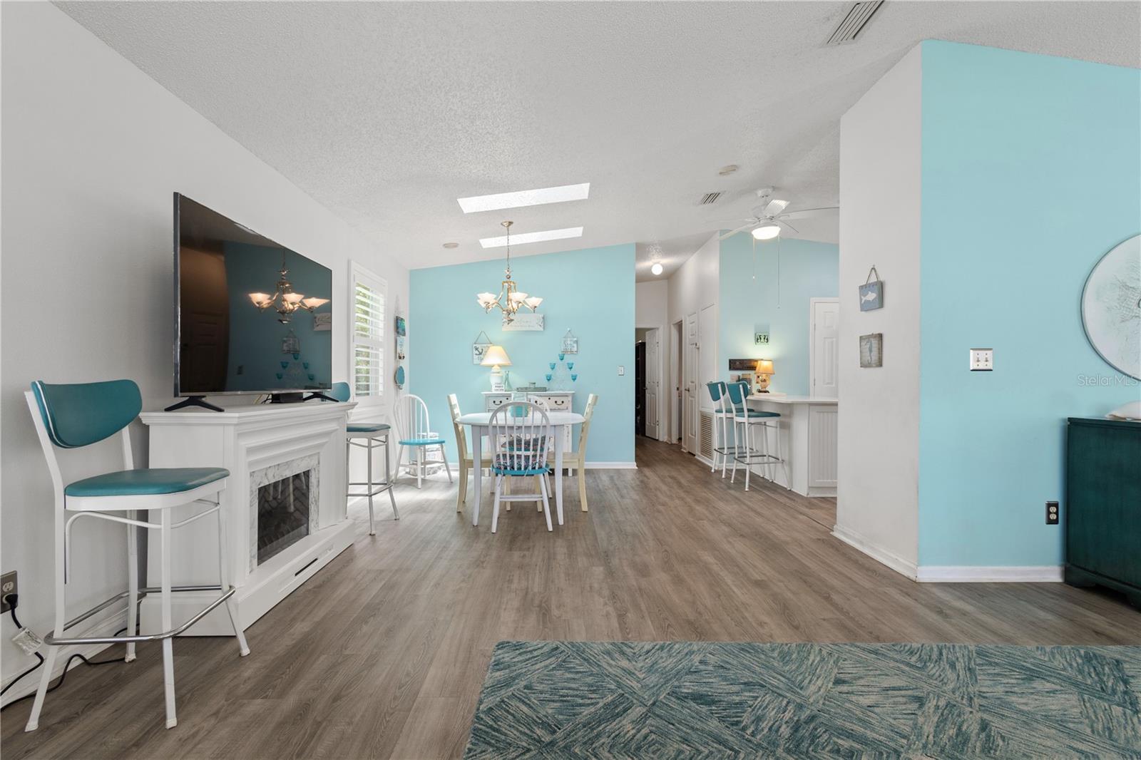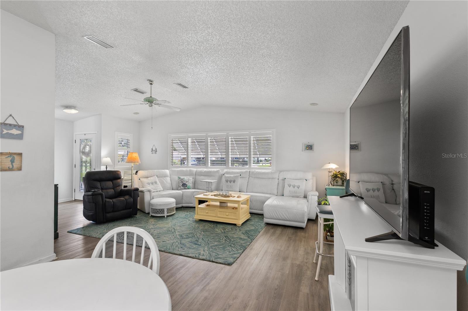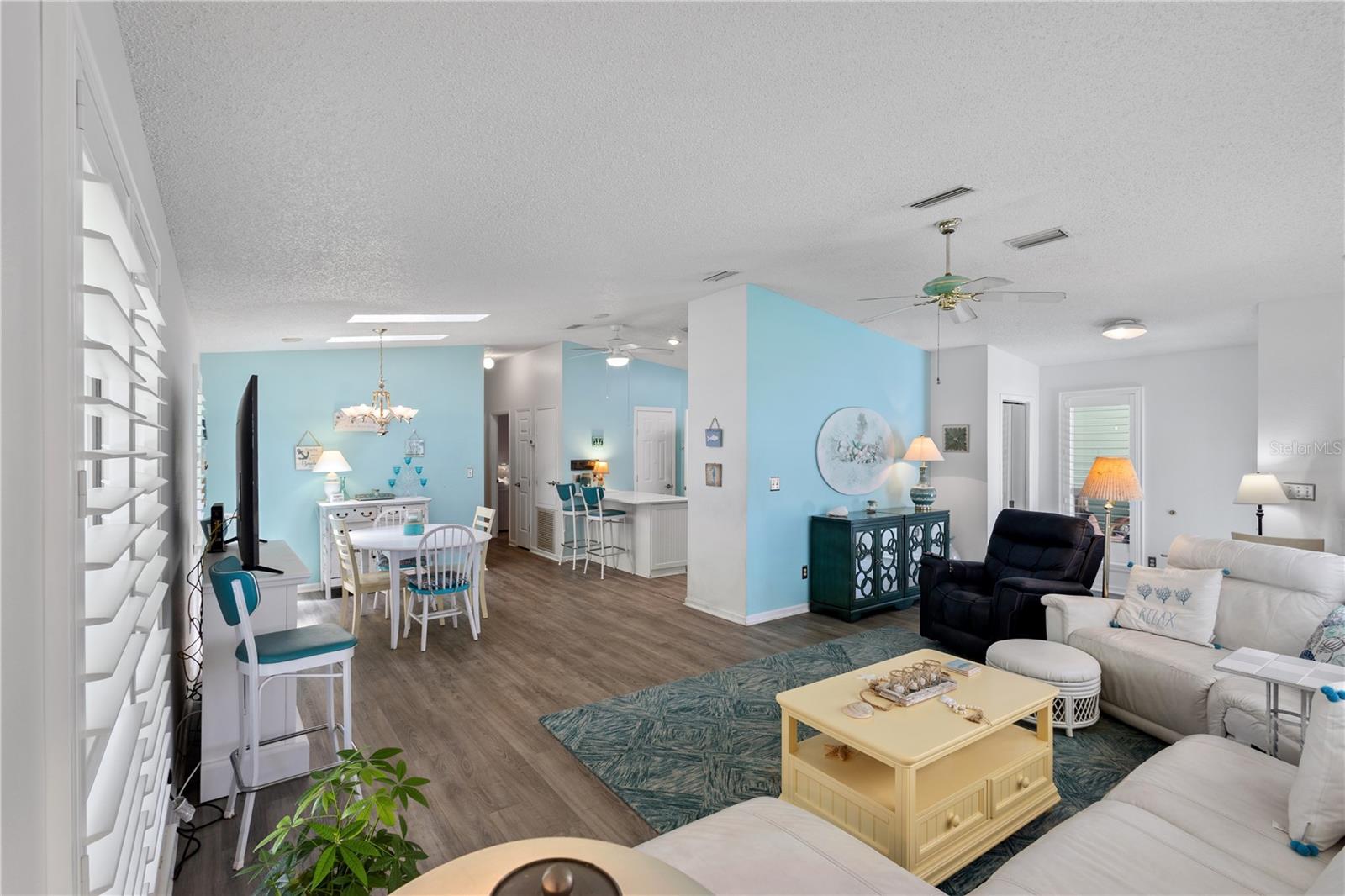~Best location in town~ NO BOND! Roof 2022. Welcome to best of coastal-style living in this pristine cottage 2/2 home! Just minutes to Spanish Springs and nestled in the highly desired Village of El Cortez on a cul-de-sac, this adorable home is the hub of entertaining with a large, central carport beckoning neighbors to join you for morning coffee. The large lanai overlooks a private backyard with mature trees. Your private backyard oasis has NO NEIGHBORS BEHIND YOU. The kitchen offers QUARTZ COUNTERTOPS, an eat-in breakfast bar, pantry and an INSIDE LAUNDRY room, Plantation shutters, Skylights, BEAUTIFUL front door. The bedrooms are spacious with the primary bedroom offering a large closet, new extended vanity space with walk in shower. Located in the world's largest 55+ community, The Villages, and conveniently located minutes to the popular SPANISH SPRINGS TOWN SAUARE with newer restaurants (Coastal del Mar, Bella Vita) and entertainment, including the new Blondie's outside bar. You don't want to miss your opportunity to own your slice of heaven! Chula Vista Clubhouse, pool and mail station and the Multi-Modal Path is just steps away for your morning walk. Spanish Springs Town Square is less than 1 mile away for all your Shopping, Restaurants and Entertainment. This home is truly a magical find, schedule your showing today.
