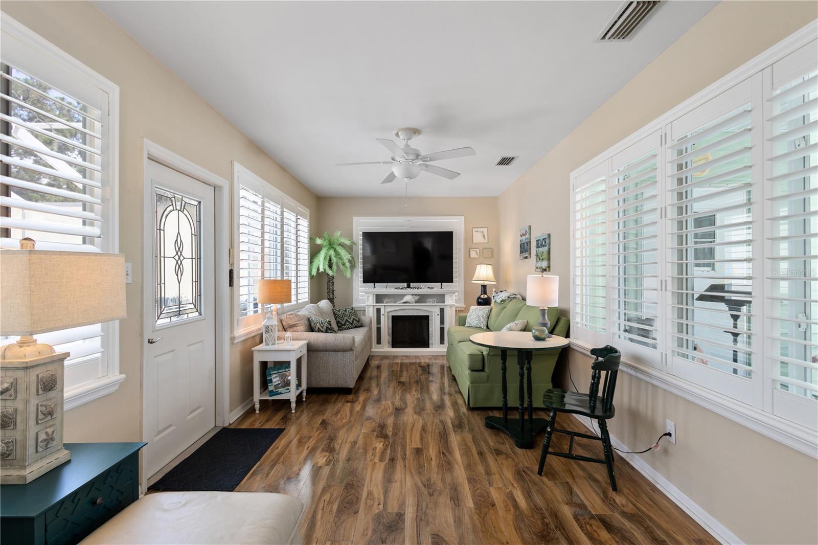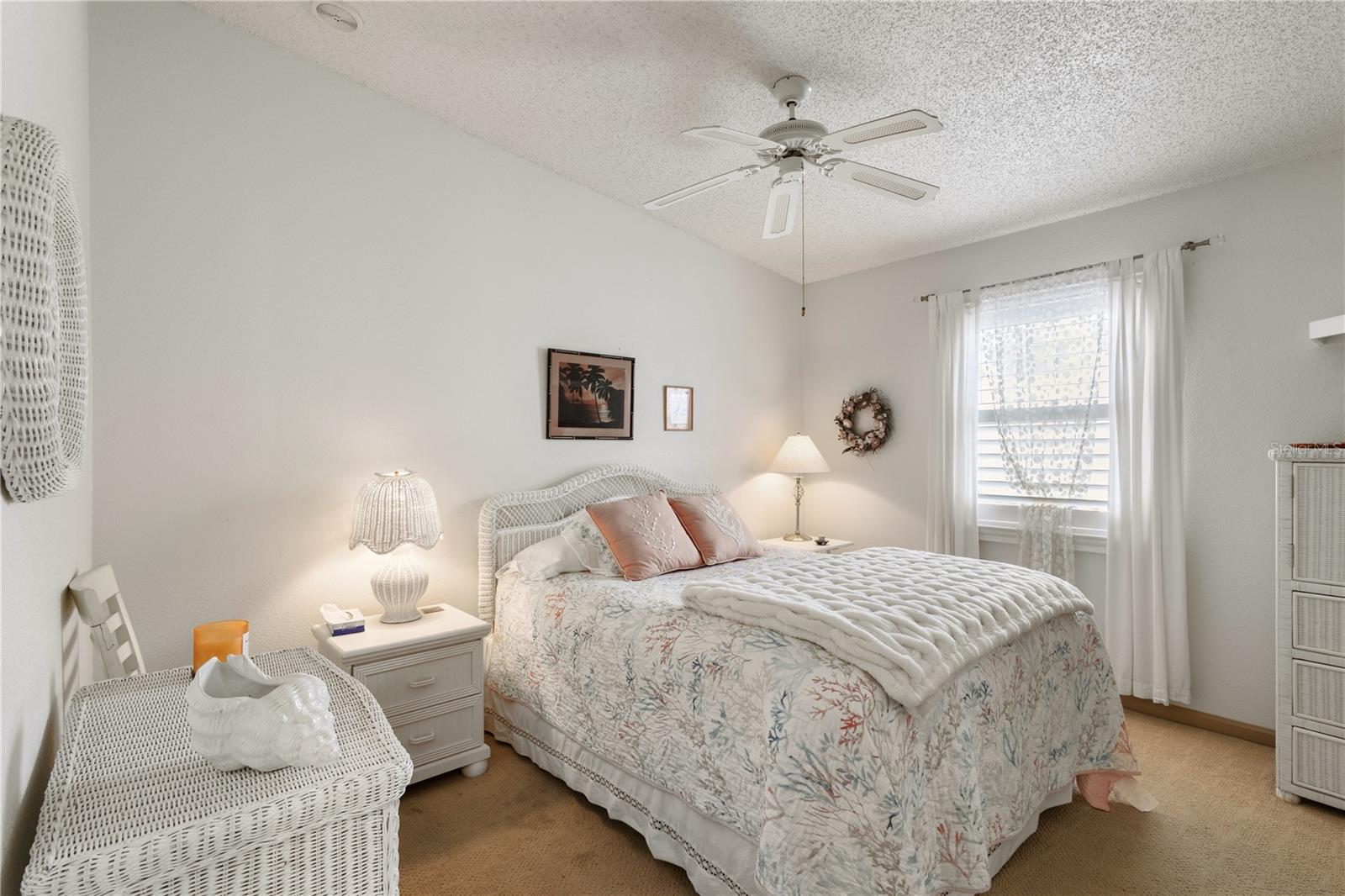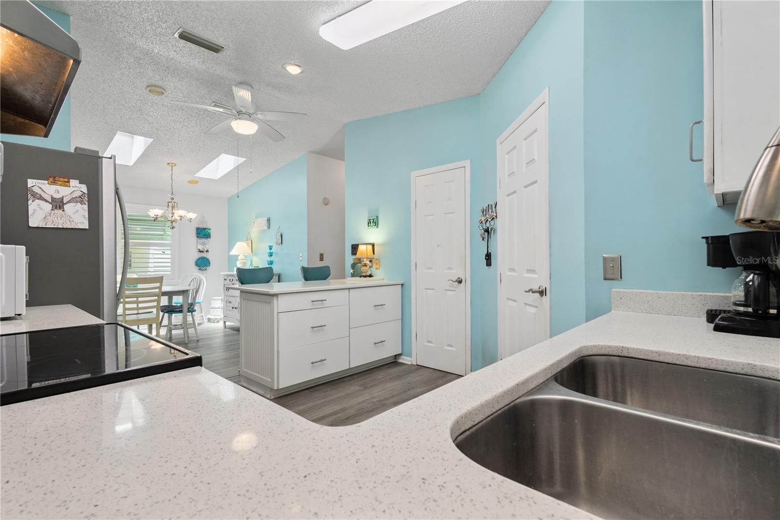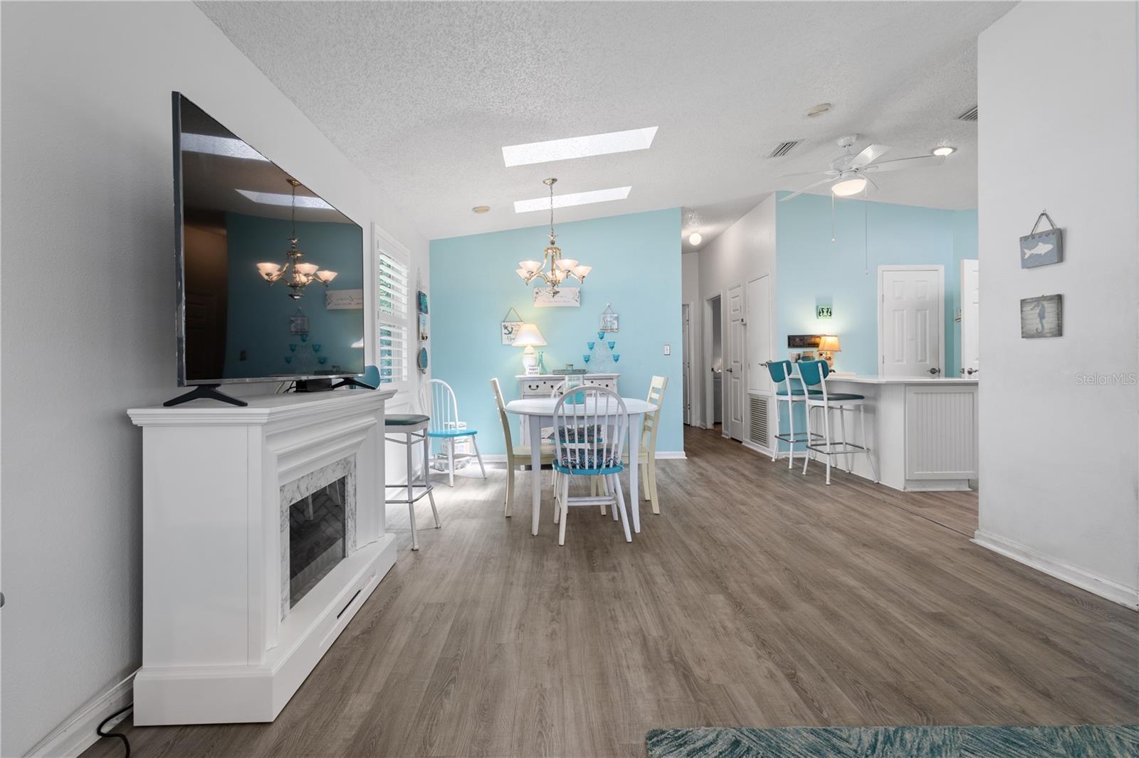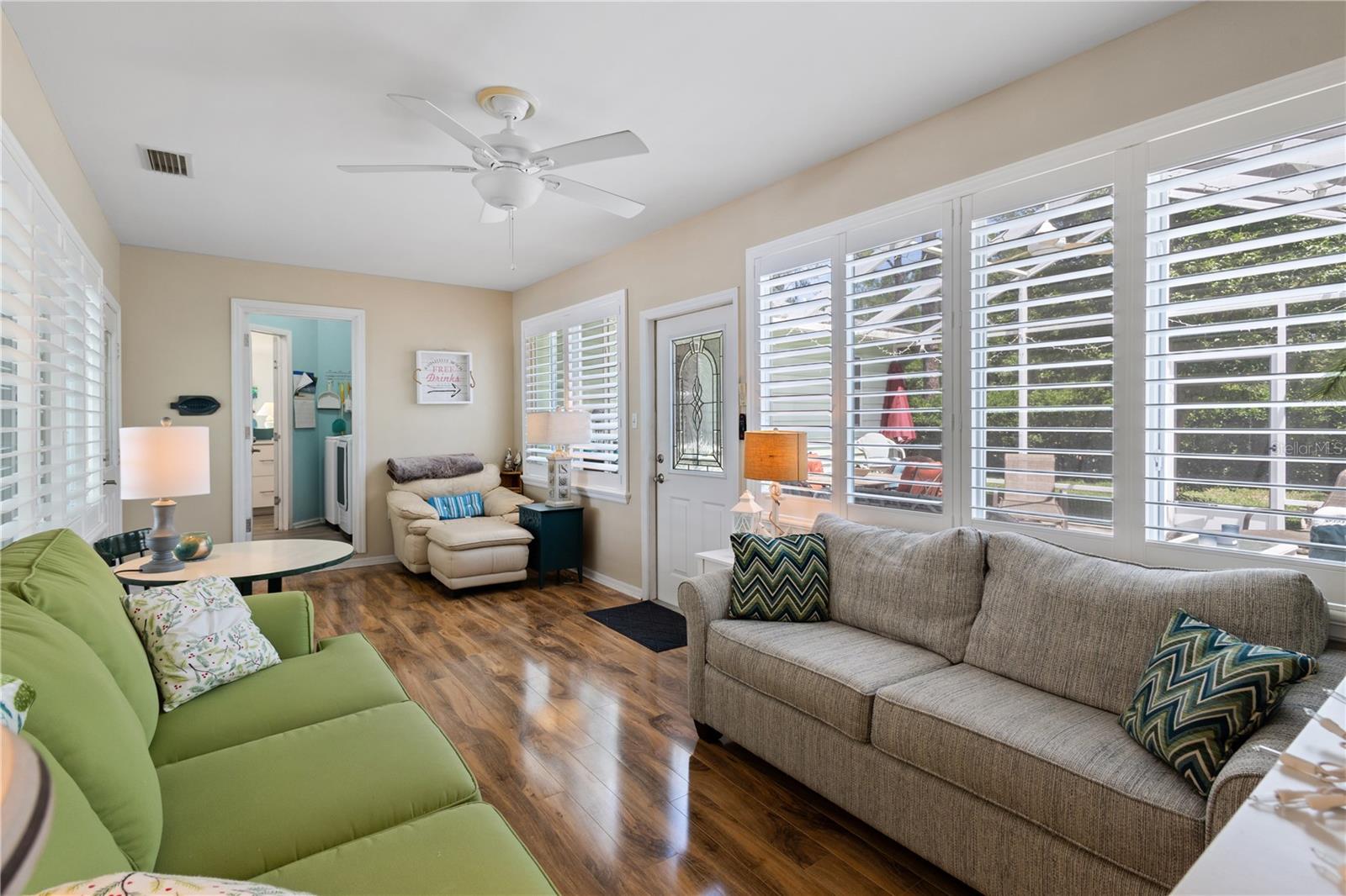 ~Best location in town~ NO BOND! Roof 2022. Welcome to best of coastal-style living in this pristine cottage 2/2 home! Just minutes to Spanish Springs and nestled in the highly desired Village of El Cortez on a cul-de-sac, this adorable home is the hub of entertaining with a large, central carport beckoning neighbors to join you for morning coffee. The large lanai overlooks a private backyard with mature trees. Your private backyard oasis has NO NEIGHBORS BEHIND YOU. The kitchen offers QUARTZ COUNTERTOPS, an eat-in breakfast bar, pantry and an INSIDE LAUNDRY room, Plantation shutters, Skylights, BEAUTIFUL front door. The bedrooms are spacious with the primary bedroom offering a large closet, new extended vanity space with walk in shower. Located in the world's largest 55+ community, The Villages, and conveniently located minutes to the popular SPANISH SPRINGS TOWN SAUARE with newer restaurants (Coastal del Mar, Bella Vita) and entertainment, including the new Blondie's outside bar. You don't want to miss your opportunity to own your slice of heaven! Chula Vista Clubhouse, pool and mail station and the Multi-Modal Path is just steps away for your morning walk. Spanish Springs Town Square is less than 1 mile away for all your Shopping, Restaurants and Entertainment. This home is truly a magical find, schedule your showing today.