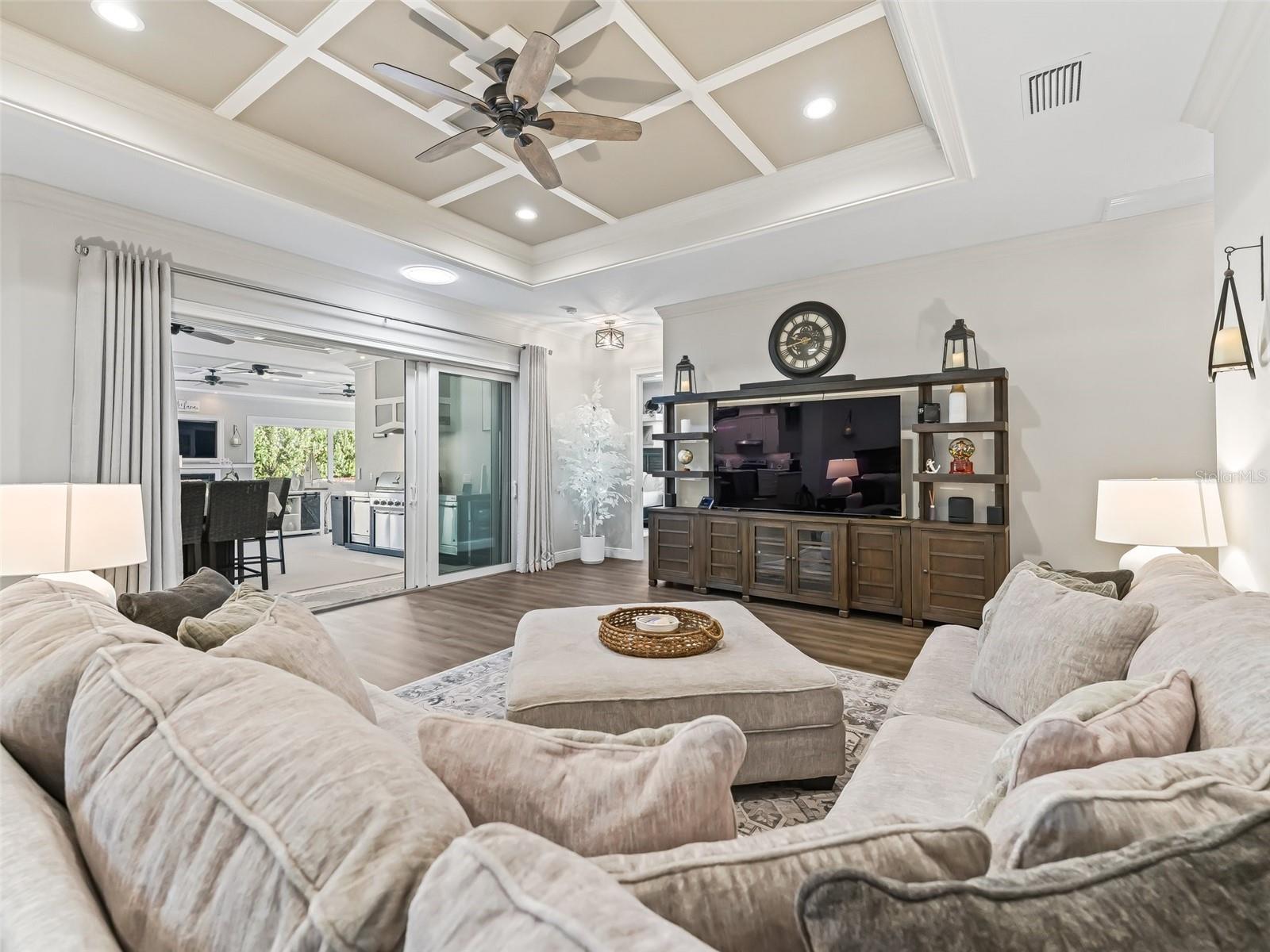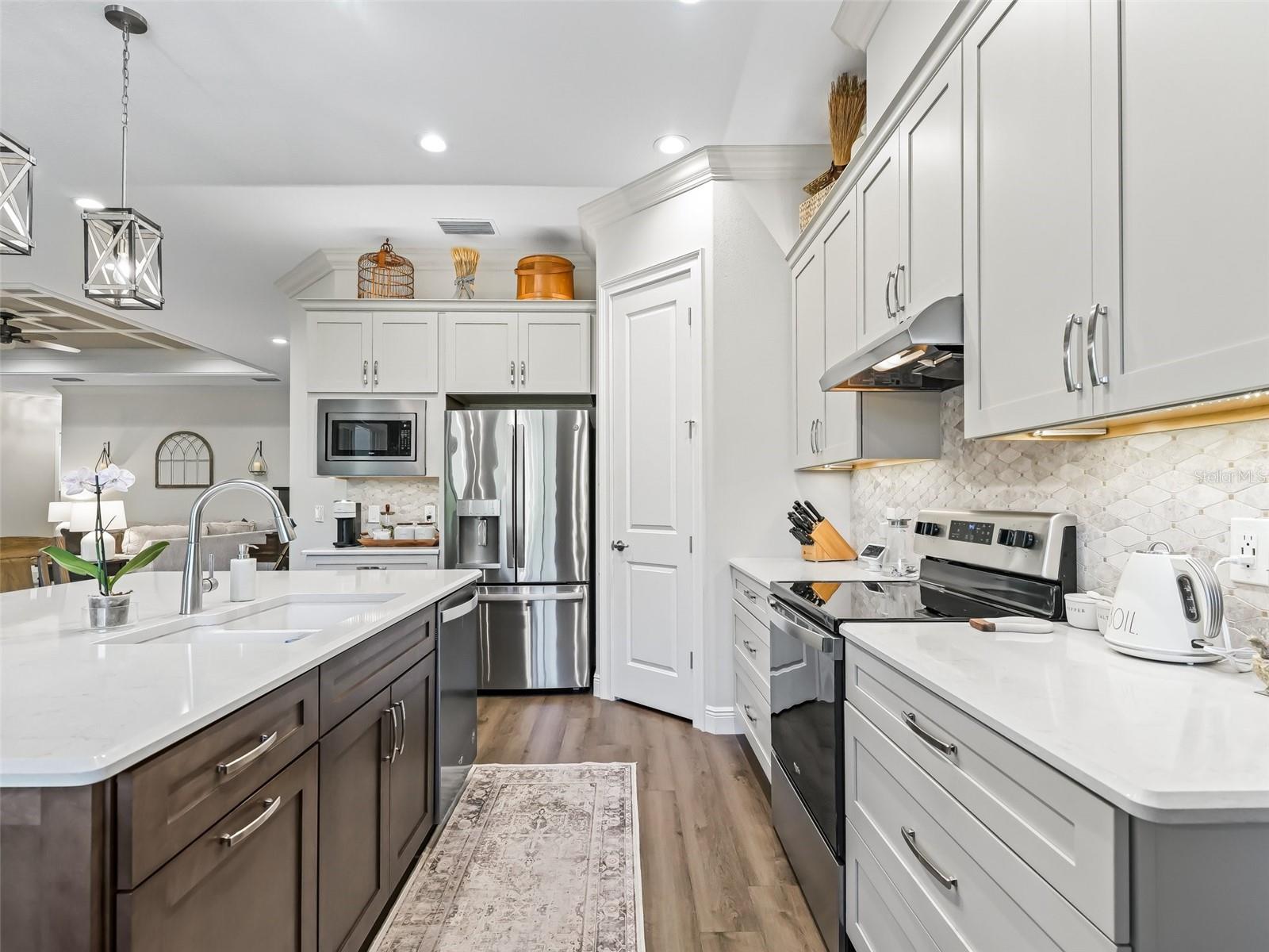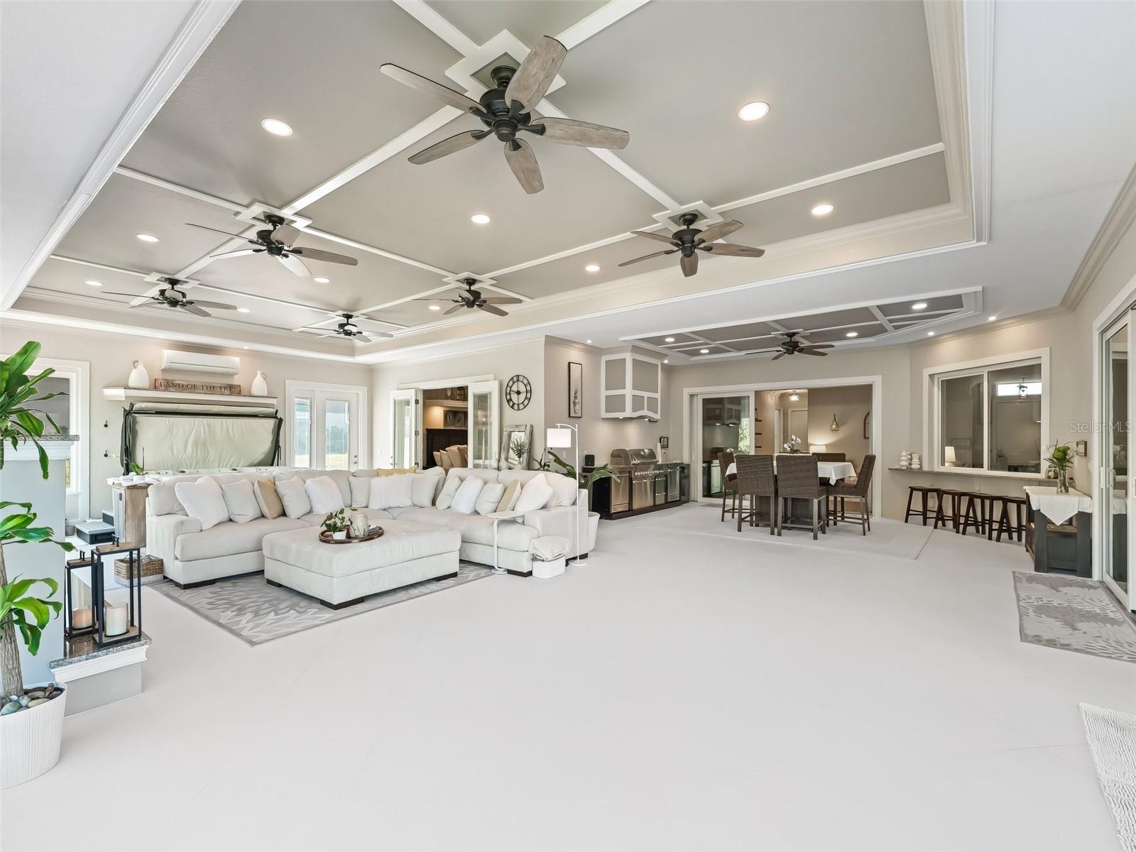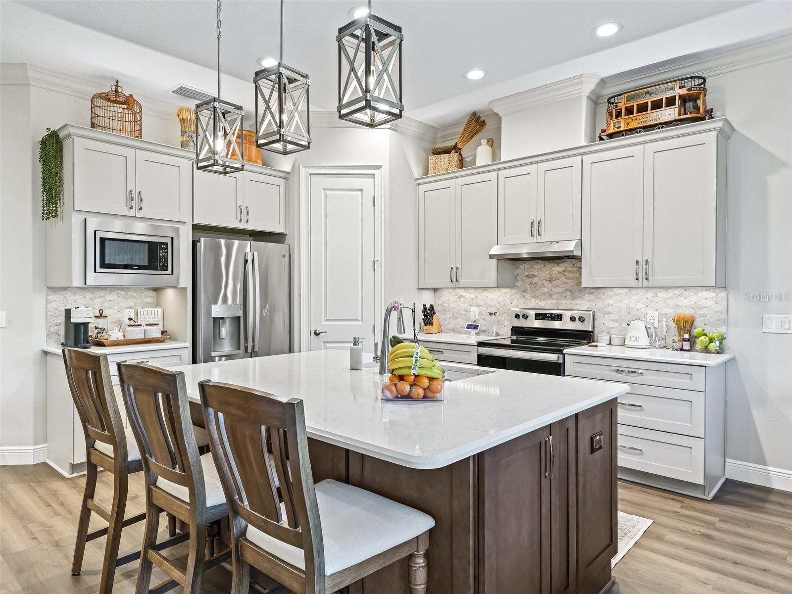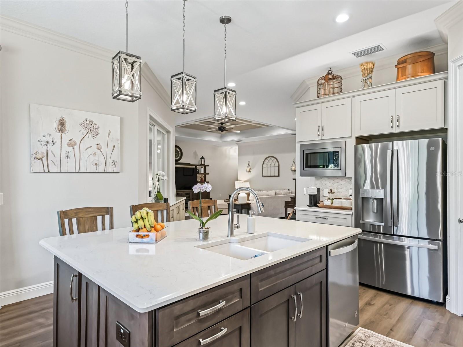 Experience the Florida Lifestyle of Your Dreams in Ultimate Luxury! Welcome to your exquisite custom home, beautifully situated among the rolling hills of the prestigious Bella Vista, within the Harbor Hills Country Club. Revel in breathtaking sunset views while surrounded by an array of luxurious features and modern amenities. This opulent home boasts enduring block and stucco construction with decorative exterior corbels, lush landscaping, ambient low-voltage landscape lighting, and programmable recessed soffit lighting. The extended paver driveway & walkways lead you to an entrance adorned with insulated double-pane low-E windows, 8-foot tall interior doors, refined custom millwork, elegant crown and base moldings, cased window and door openings, rounded corners, designer lighting, and luxurious vinyl plank flooring, complemented by PICO wireless dimmer switches. The great room opens up into the 1,152 square foot entertainer's outdoor paradise, seamlessly merging indoor and outdoor spaces, perfect for enjoying the wonderful Florida climate year-round. The lanai is a true masterpiece, measuring 22' x 39', and features a custom-built entertainment center, a 42-inch gas fireplace, elegant wood-milled ceiling detail, and an abundance of 54-inch ceiling fans with recessed lights. The fully equipped stainless steel summer kitchen, complete with a 36-inch Charbroil 5-burner gas grill, granite countertops, a decorative vented hood, and under-counter refrigerators, invites you to host unforgettable gatherings. Experience unparalleled privacy with automated blinds, beautiful white ceramic tile, and a 120-gallon owned buried gas tank for the summer kitchen and fireplace. The generous two-car and golf cart garage is equipped with insulated garage doors, insulated ceiling, ample elevated storage platforms, pegboard, heavy-duty aluminum pull-down attic stairs, and epoxy-coated floor, complete with a service door with touch keypad and automatic sensor lighting, plus a mini split air conditioner. The home office exudes sophistication with full glass French doors, a 54-inch ceiling fan, and crown molding. Indulge your culinary skills in the meticulously designed gourmet kitchen that includes Quartz countertops, stone backsplash, an extensive island with additional storage, under and above cabinet lighting, built-in refrigerator, crown molding, double trash pull-out, large pots and pans drawers, built-in microwave, and a vented hood. Gather around the three barstools at the island or effortlessly serve from the buffet counter with cabinetry and a pass-through serving window to the lanai. Relax in the spacious owner's suite, enhanced with ambient lighting, individual nightstand lamps with switches conveniently placed near the bed, crown molding, and dual walk-in closets with custom built-ins and motion-activated lighting. The opulent owner's bathroom features double vanities with a linen closet, a dedicated dressing area, Quartz countertops, and an indulgently spacious walk-in shower with dual shower heads, benches, a private commode, and a pocket door leading to the well-appointed laundry room equipped with Quartz countertops and custom cabinetry. The pride of ownership is evident the moment you enter this exquisite custom home, enhanced by the addition of owned solar panels for a sustainable lifestyle. Call today to schedule your appointment and embrace the luxurious lifestyle you deserve!