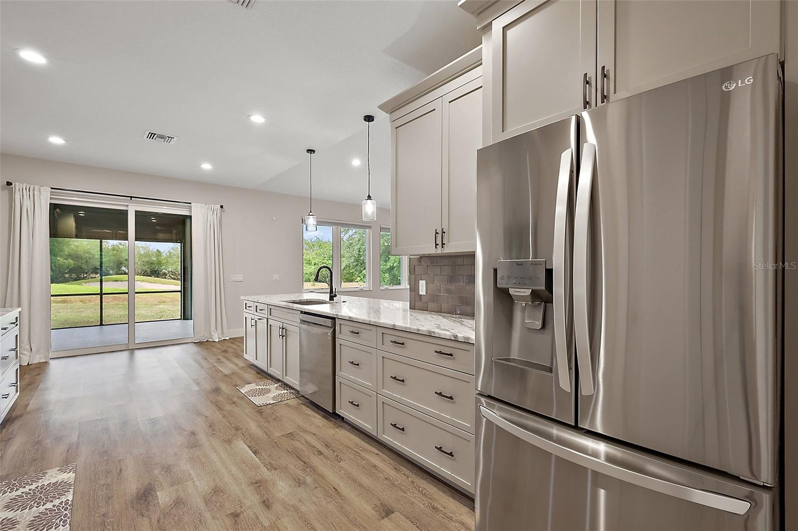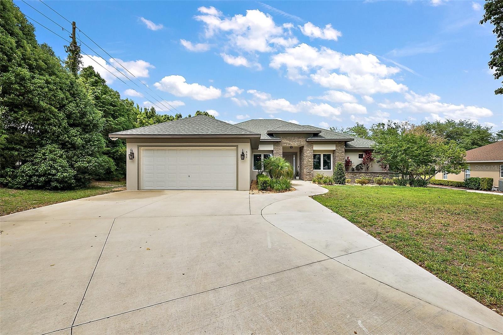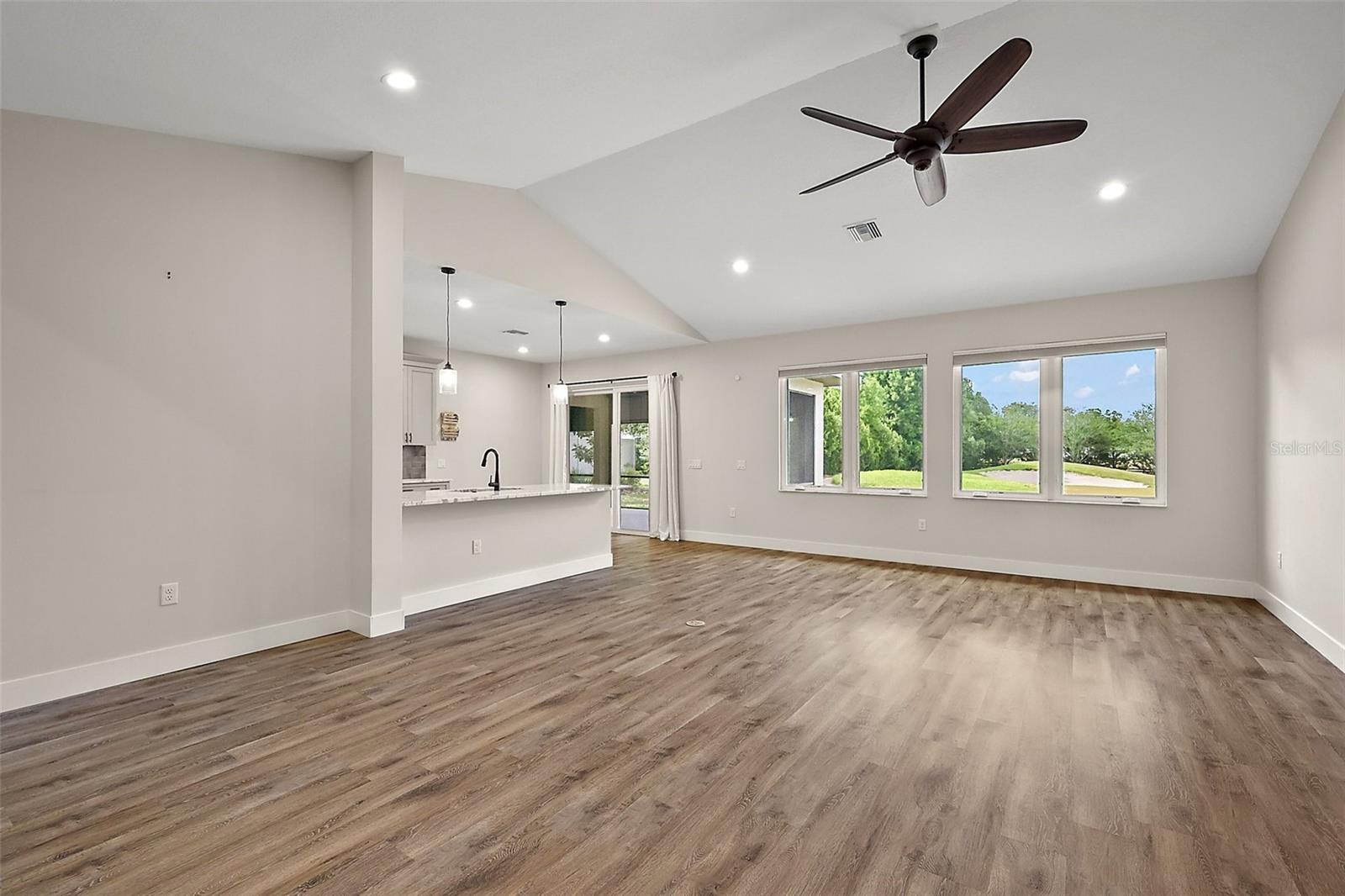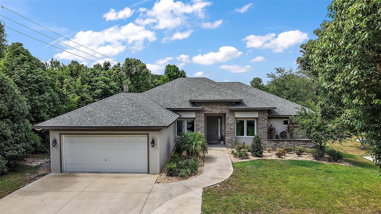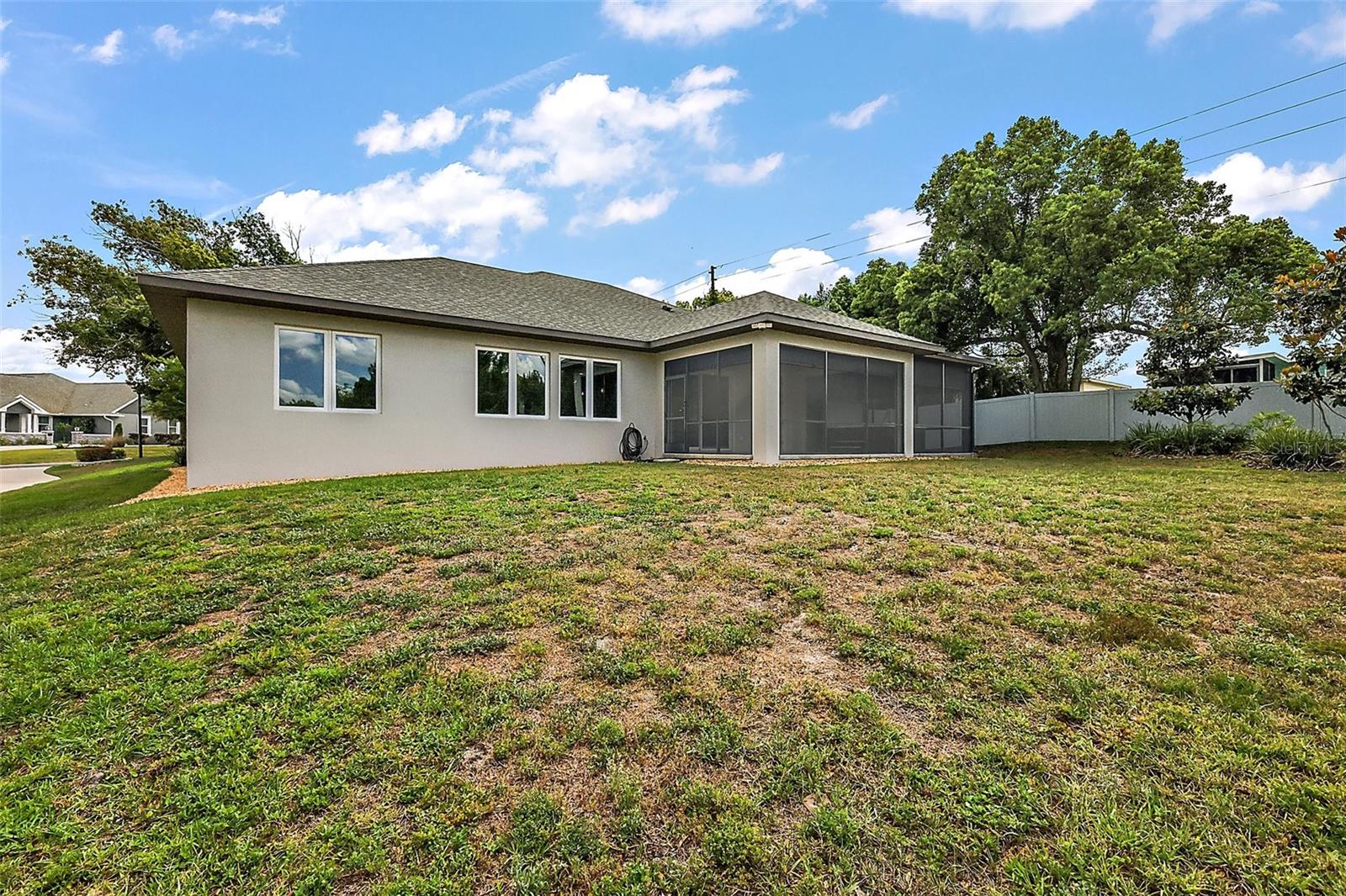 GOLF COURSE FRONTAGE LUXURY 3/2 HOME WITH PRIVATE DEN AND LANAI. Welcome home to this refined, sought-after gated community, The Lakes of Lady Lake. This HOA-maintained community features a public golf course on-site, so no membership is required to play. Arrive home to your impressive abode on a one-third-acre lot with beautiful mature shade trees and an oversized driveway providing abundant parking for guests. Additionally, the garage features a 60-amp charging station for electric cars and epoxy floors. Warm, inviting tones blend with stacked stone accents, creating a classic architecture with a modern flair. Take the paved path to the covered front portico and step inside to find a natural light-infused interior complemented by soothing neutral tones, high ceilings, and elegant finishes. Enjoy the style-savvy choices made here, with luxury wood laminate flooring flowing seamlessly throughout all the living areas. The thoughtful continuity continues with the same cabinetry and counters found in the kitchen, bathrooms, and laundry. The front dining room offers large windows, custom crown molding, and wide baseboards and door casings. Imagine the holiday meals you will host here! The living room and kitchen are open-concept, delivering a wow factor. Vaulted ceilings feature recessed lighting, enhancing the sense of space. The floors has convenient outlets for table lamps, and the views of the 15th hole from oversized windows are truly amazing! What a great space for entertaining or enjoying a family game night. The kitchen is stunning with custom Shaker-style cabinetry, including an abundance of convenient storage drawers, gorgeous granite counters, classic tile backsplash, LG stainless appliances (microwave replaced 2024), a walk-in pantry, expansive breakfast bar, and a dining nook with a glass slider to the screened lanai which the current owners added. It features epoxy floors, remote-controlled blinds for shade and added privacy, and a 7-person hot tub. You’re well on your way to creating your epic outdoor oasis. Back inside, you will find a dedicated private den which the current owners outfitted with custom storage cabinetry and an expansive counter creating the perfect space for a home office or an amazing hobby room. Enter through a private door to discover the primary suite, a space of beauty and serenity where you can retreat for privacy and rejuvenation. The cozy carpet adds warmth, the tray ceiling is trimmed with crown molding, and there are two huge closets. The en-suite features a spa-worthy design, including dual granite sink vanities and a doorless, walk-in tiled shower. Two guest rooms share a full bathroom with a tub/shower and a door for access to the lanai/hot tub. The storage here is impressive, featuring a large laundry room with storage cabinets, a sink, and shelves, as well as a huge adjacent storage closet. To reduce energy bills, this home features sprayed insulation in the attic. Enjoy relaxing or entertaining outdoors, surrounded by entrancing golf course views. Spanish Springs Town Center of the Villages is nearby. With its prime location and outstanding features, this property is a rare find, offering an unparalleled lifestyle in one of the most sought-after communities.