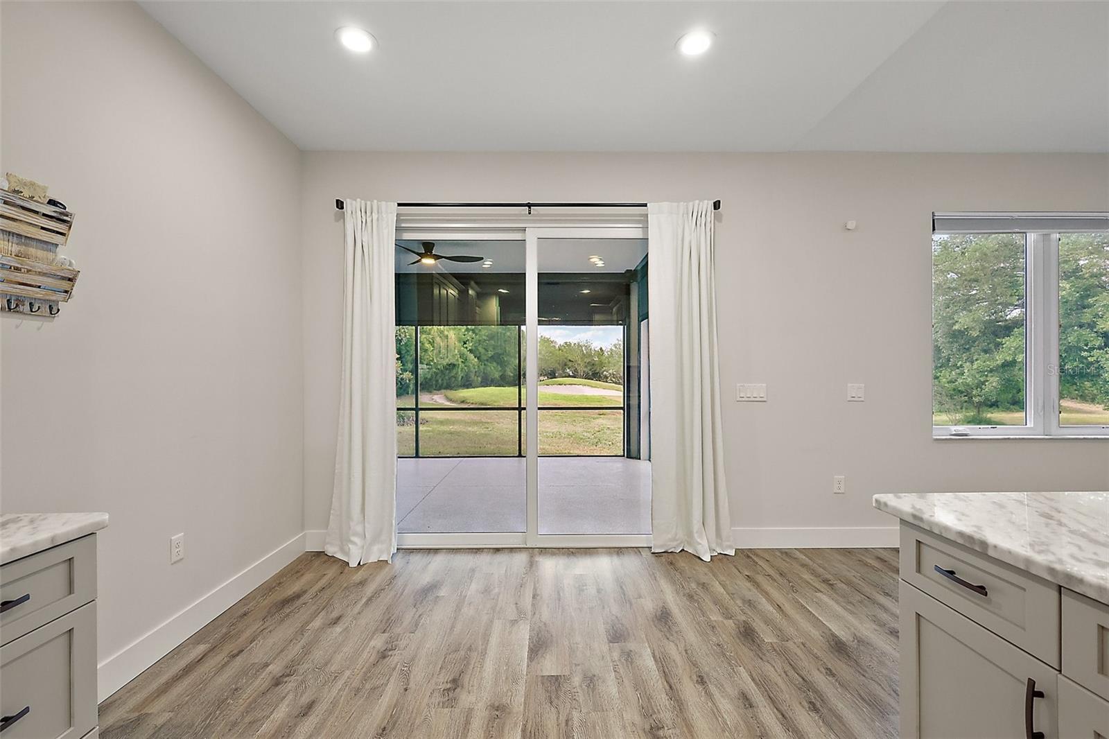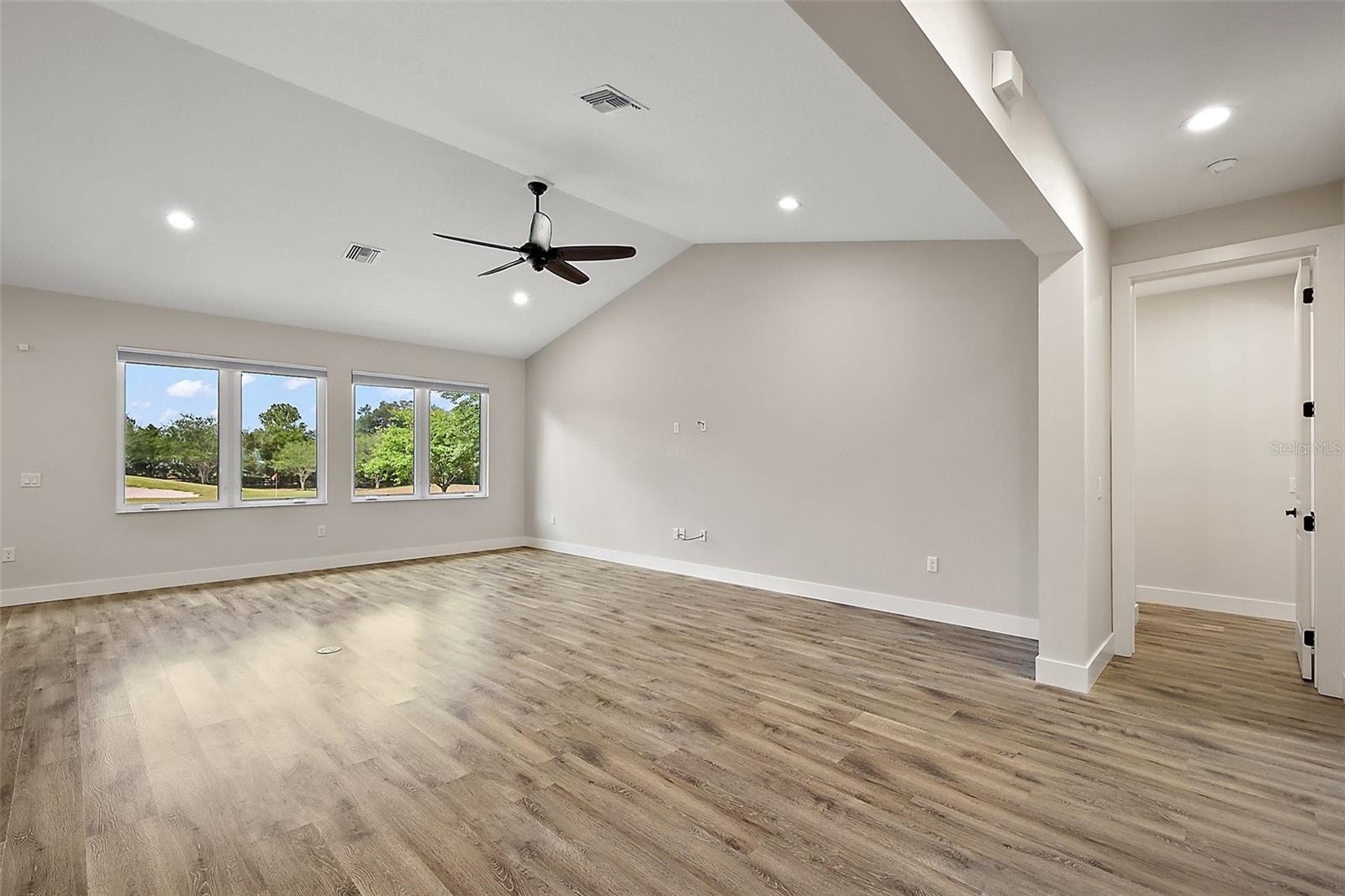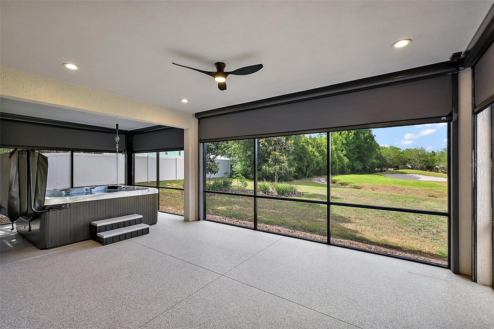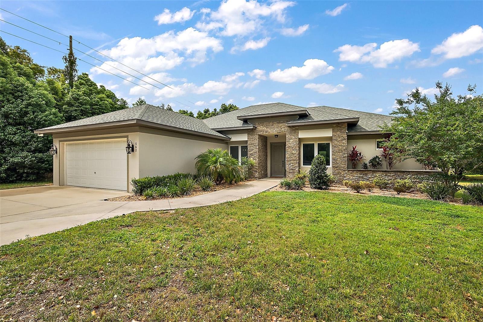GOLF COURSE FRONTAGE LUXURY 3/2 HOME WITH PRIVATE DEN AND LANAI. Welcome home to this refined, sought-after gated community, The Lakes of Lady Lake. This HOA-maintained community features a public golf course on-site, so no membership is required to play. Arrive home to your impressive abode on a one-third-acre lot with beautiful mature shade trees and an oversized driveway providing abundant parking for guests. Additionally, the garage features a 60-amp charging station for electric cars and epoxy floors. Warm, inviting tones blend with stacked stone accents, creating a classic architecture with a modern flair. Take the paved path to the covered front portico and step inside to find a natural light-infused interior complemented by soothing neutral tones, high ceilings, and elegant finishes. Enjoy the style-savvy choices made here, with luxury wood laminate flooring flowing seamlessly throughout all the living areas. The thoughtful continuity continues with the same cabinetry and counters found in the kitchen, bathrooms, and laundry. The front dining room offers large windows, custom crown molding, and wide baseboards and door casings. Imagine the holiday meals you will host here! The living room and kitchen are open-concept, delivering a wow factor. Vaulted ceilings feature recessed lighting, enhancing the sense of space. The floors has convenient outlets for table lamps, and the views of the 15th hole from oversized windows are truly amazing! What a great space for entertaining or enjoying a family game night. The kitchen is stunning with custom Shaker-style cabinetry, including an abundance of convenient storage drawers, gorgeous granite counters, classic tile backsplash, LG stainless appliances (microwave replaced 2024), a walk-in pantry, expansive breakfast bar, and a dining nook with a glass slider to the screened lanai which the current owners added. It features epoxy floors, remote-controlled blinds for shade and added privacy, and a 7-person hot tub. You’re well on your way to creating your epic outdoor oasis. Back inside, you will find a dedicated private den which the current owners outfitted with custom storage cabinetry and an expansive counter creating the perfect space for a home office or an amazing hobby room. Enter through a private door to discover the primary suite, a space of beauty and serenity where you can retreat for privacy and rejuvenation. The cozy carpet adds warmth, the tray ceiling is trimmed with crown molding, and there are two huge closets. The en-suite features a spa-worthy design, including dual granite sink vanities and a doorless, walk-in tiled shower. Two guest rooms share a full bathroom with a tub/shower and a door for access to the lanai/hot tub. The storage here is impressive, featuring a large laundry room with storage cabinets, a sink, and shelves, as well as a huge adjacent storage closet. To reduce energy bills, this home features sprayed insulation in the attic. Enjoy relaxing or entertaining outdoors, surrounded by entrancing golf course views. Spanish Springs Town Center of the Villages is nearby. With its prime location and outstanding features, this property is a rare find, offering an unparalleled lifestyle in one of the most sought-after communities.
