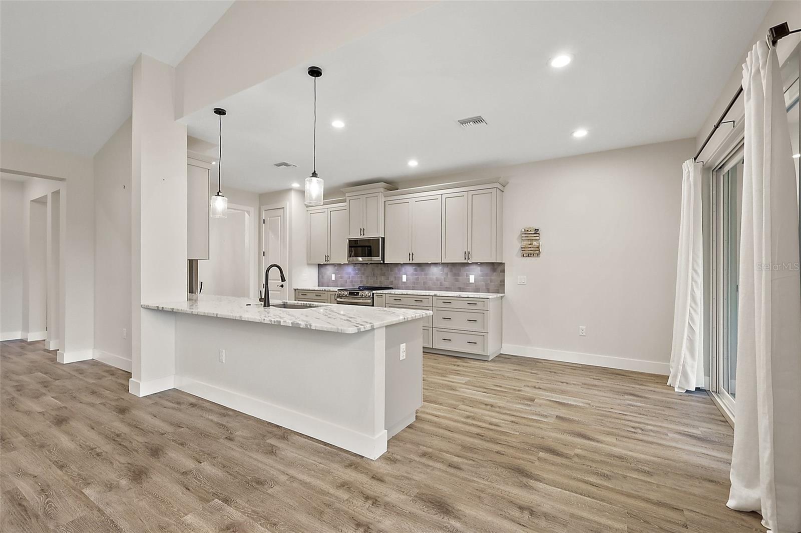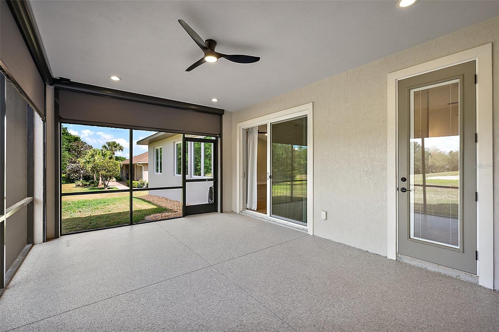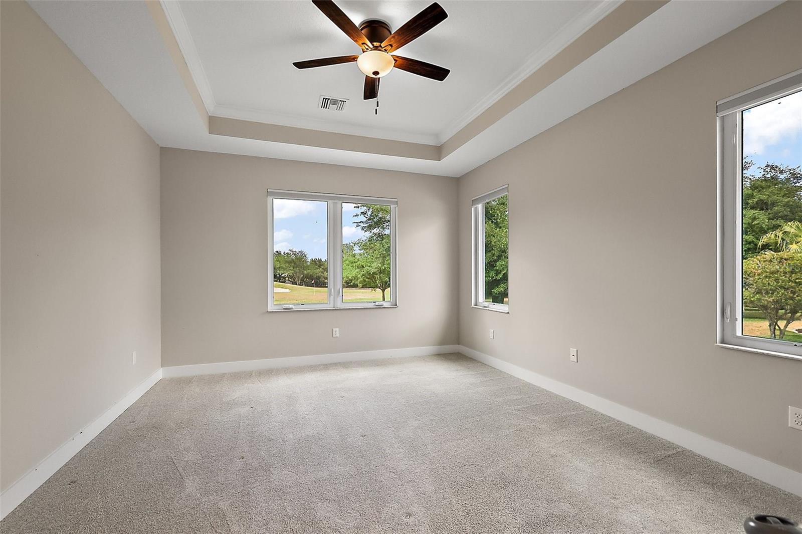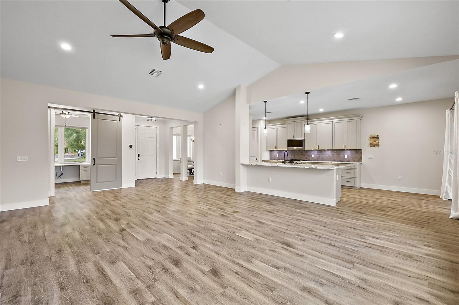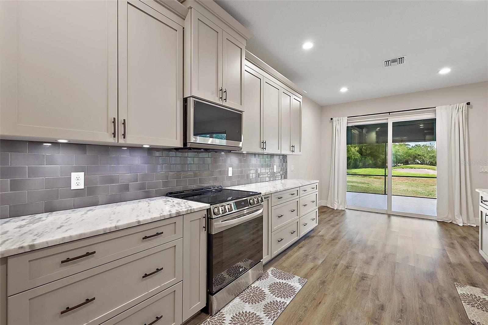 GOLF COURSE FRONTAGE LUXURY 3/2 HOME WITH PRIVATE DEN AND LANAI. Welcome home to this refined, sought-after gated community, The Lakes of Lady Lake. This HOA-maintained community features a public golf course on-site, so no membership is required to play. Arrive home to your impressive abode on a one-third-acre lot with beautiful mature shade trees and an oversized driveway providing abundant parking for guests. Additionally, the garage features a 60-amp charging station for electric cars and epoxy floors. Warm, inviting tones blend with stacked stone accents, creating a classic architecture with a modern flair. Take the paved path to the covered front portico and step inside to find a natural light-infused interior complemented by soothing neutral tones, high ceilings, and elegant finishes. Enjoy the style-savvy choices made here, with luxury wood laminate flooring flowing seamlessly throughout all the living areas. The thoughtful continuity continues with the same cabinetry and counters found in the kitchen, bathrooms, and laundry. The front dining room offers large windows, custom crown molding, and wide baseboards and door casings. Imagine the holiday meals you will host here! The living room and kitchen are open-concept, delivering a wow factor. Vaulted ceilings feature recessed lighting, enhancing the sense of space. The floors has convenient outlets for table lamps, and the views of the 15th hole from oversized windows are truly amazing! What a great space for entertaining or enjoying a family game night. The kitchen is stunning with custom Shaker-style cabinetry, including an abundance of convenient storage drawers, gorgeous granite counters, classic tile backsplash, LG stainless appliances (microwave replaced 2024), a walk-in pantry, expansive breakfast bar, and a dining nook with a glass slider to the screened lanai which the current owners added. It features epoxy floors, remote-controlled blinds for shade and added privacy, and a 7-person hot tub. You’re well on your way to creating your epic outdoor oasis. Back inside, you will find a dedicated private den which the current owners outfitted with custom storage cabinetry and an expansive counter creating the perfect space for a home office or an amazing hobby room. Enter through a private door to discover the primary suite, a space of beauty and serenity where you can retreat for privacy and rejuvenation. The cozy carpet adds warmth, the tray ceiling is trimmed with crown molding, and there are two huge closets. The en-suite features a spa-worthy design, including dual granite sink vanities and a doorless, walk-in tiled shower. Two guest rooms share a full bathroom with a tub/shower and a door for access to the lanai/hot tub. The storage here is impressive, featuring a large laundry room with storage cabinets, a sink, and shelves, as well as a huge adjacent storage closet. To reduce energy bills, this home features sprayed insulation in the attic. Enjoy relaxing or entertaining outdoors, surrounded by entrancing golf course views. Spanish Springs Town Center of the Villages is nearby. With its prime location and outstanding features, this property is a rare find, offering an unparalleled lifestyle in one of the most sought-after communities.
