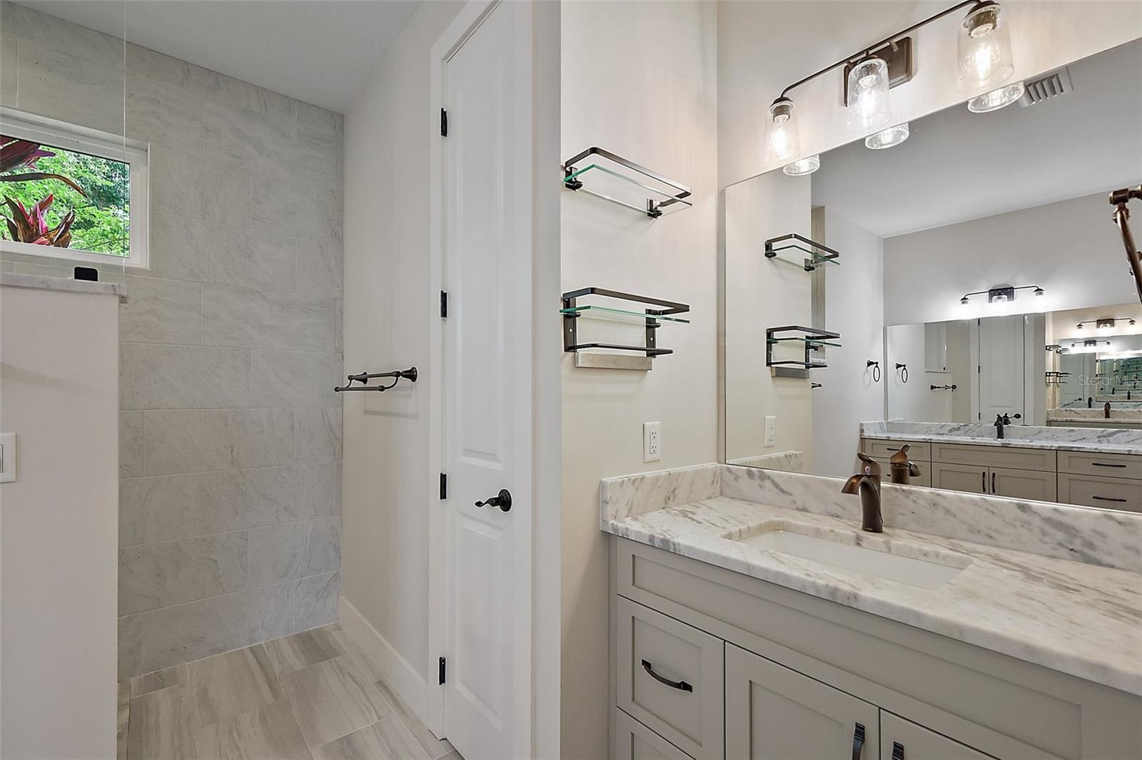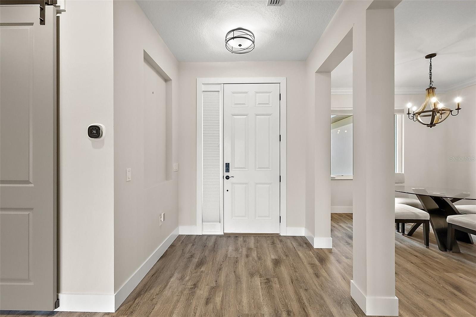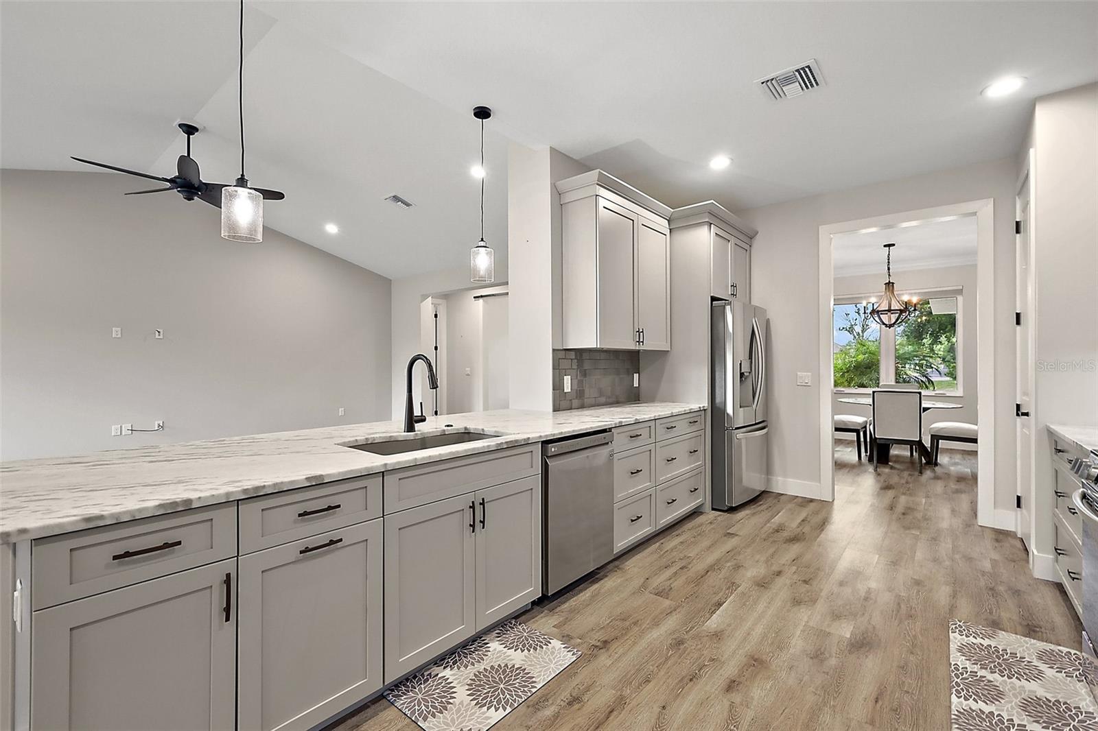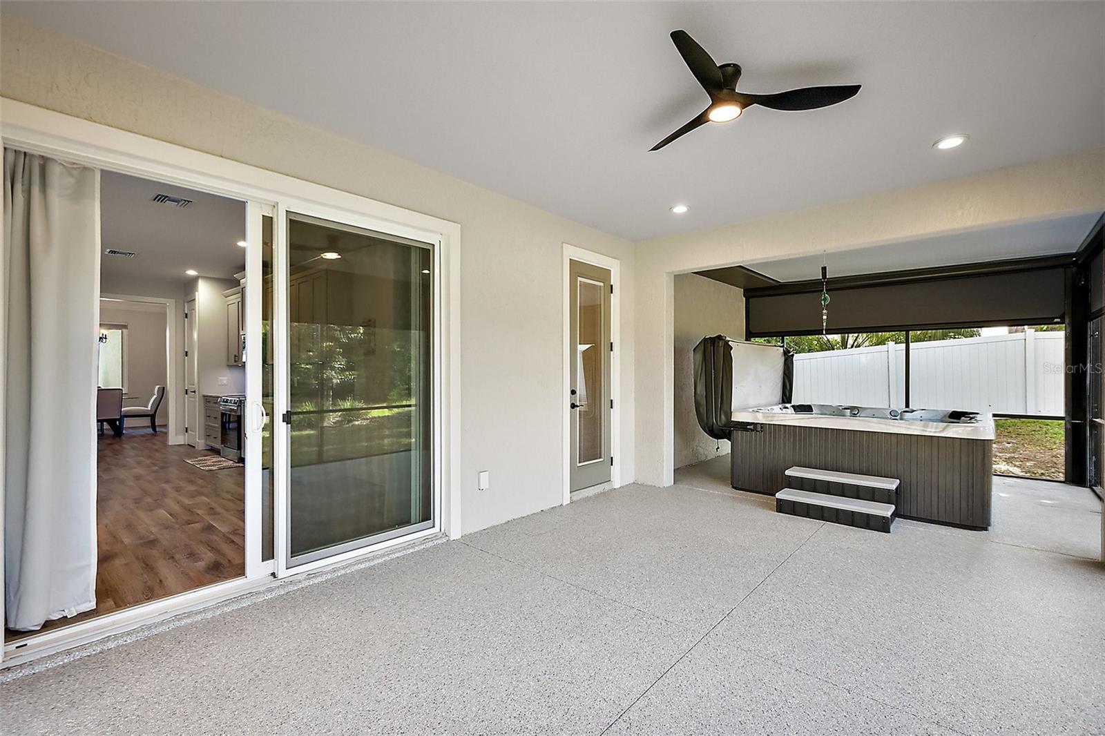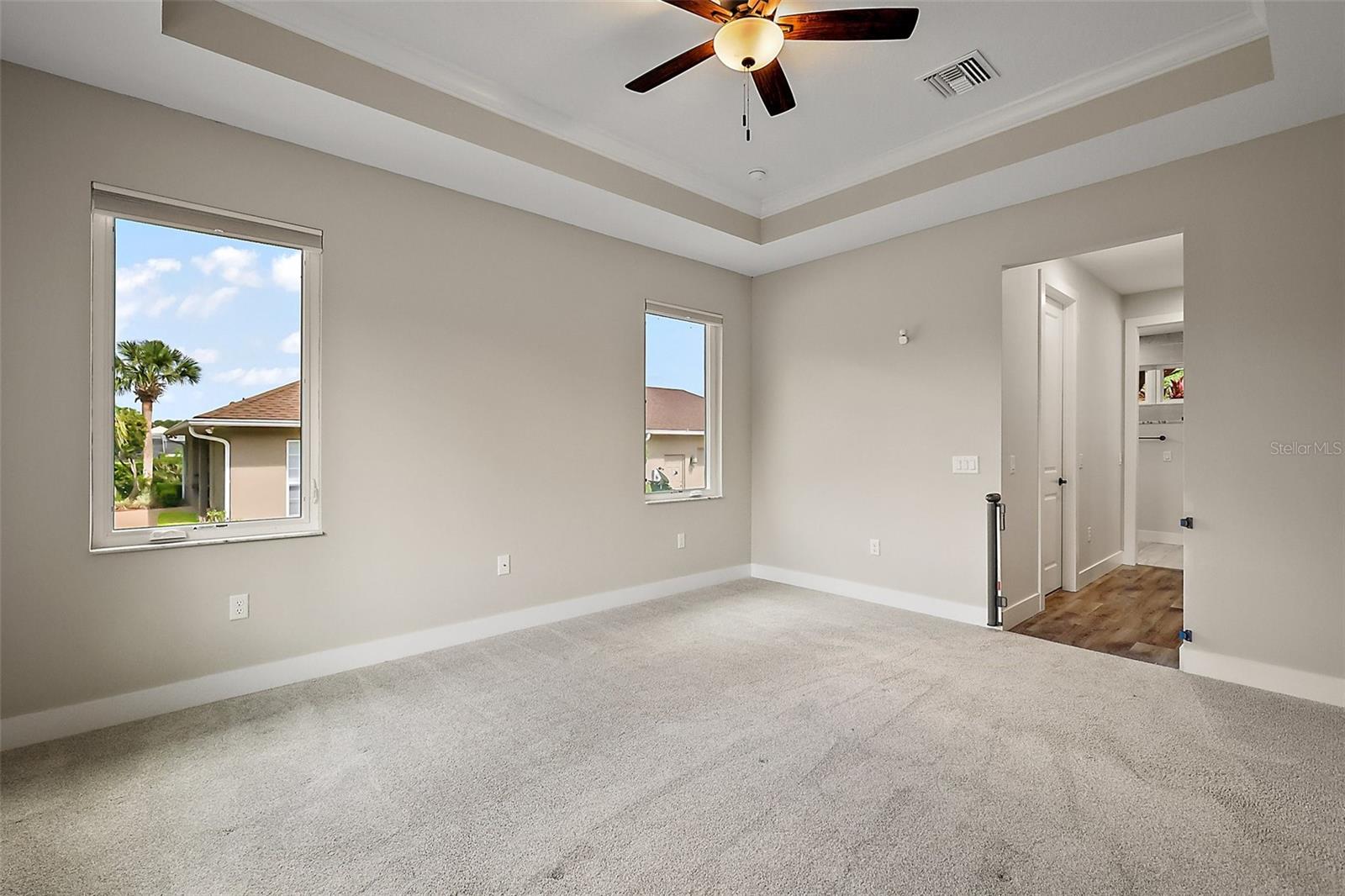 GOLF COURSE FRONTAGE LUXURY 3/2 HOME WITH PRIVATE DEN AND LANAI. Welcome home to this refined, sought-after gated community, The Lakes of Lady Lake. This HOA-maintained community features a public golf course on-site, so no membership is required to play. Arrive home to your impressive abode on a one-third-acre lot with beautiful mature shade trees and an oversized driveway providing abundant parking for guests. Additionally, the garage features a 60-amp charging station for electric cars and epoxy floors. Warm, inviting tones blend with stacked stone accents, creating a classic architecture with a modern flair. Take the paved path to the covered front portico and step inside to find a natural light-infused interior complemented by soothing neutral tones, high ceilings, and elegant finishes. Enjoy the style-savvy choices made here, with luxury wood laminate flooring flowing seamlessly throughout all the living areas. The thoughtful continuity continues with the same cabinetry and counters found in the kitchen, bathrooms, and laundry. The front dining room offers large windows, custom crown molding, and wide baseboards and door casings. Imagine the holiday meals you will host here! The living room and kitchen are open-concept, delivering a wow factor. Vaulted ceilings feature recessed lighting, enhancing the sense of space. The floors has convenient outlets for table lamps, and the views of the 15th hole from oversized windows are truly amazing! What a great space for entertaining or enjoying a family game night. The kitchen is stunning with custom Shaker-style cabinetry, including an abundance of convenient storage drawers, gorgeous granite counters, classic tile backsplash, LG stainless appliances (microwave replaced 2024), a walk-in pantry, expansive breakfast bar, and a dining nook with a glass slider to the screened lanai which the current owners added. It features epoxy floors, remote-controlled blinds for shade and added privacy, and a 7-person hot tub. You’re well on your way to creating your epic outdoor oasis. Back inside, you will find a dedicated private den which the current owners outfitted with custom storage cabinetry and an expansive counter creating the perfect space for a home office or an amazing hobby room. Enter through a private door to discover the primary suite, a space of beauty and serenity where you can retreat for privacy and rejuvenation. The cozy carpet adds warmth, the tray ceiling is trimmed with crown molding, and there are two huge closets. The en-suite features a spa-worthy design, including dual granite sink vanities and a doorless, walk-in tiled shower. Two guest rooms share a full bathroom with a tub/shower and a door for access to the lanai/hot tub. The storage here is impressive, featuring a large laundry room with storage cabinets, a sink, and shelves, as well as a huge adjacent storage closet. To reduce energy bills, this home features sprayed insulation in the attic. Enjoy relaxing or entertaining outdoors, surrounded by entrancing golf course views. Spanish Springs Town Center of the Villages is nearby. With its prime location and outstanding features, this property is a rare find, offering an unparalleled lifestyle in one of the most sought-after communities.
