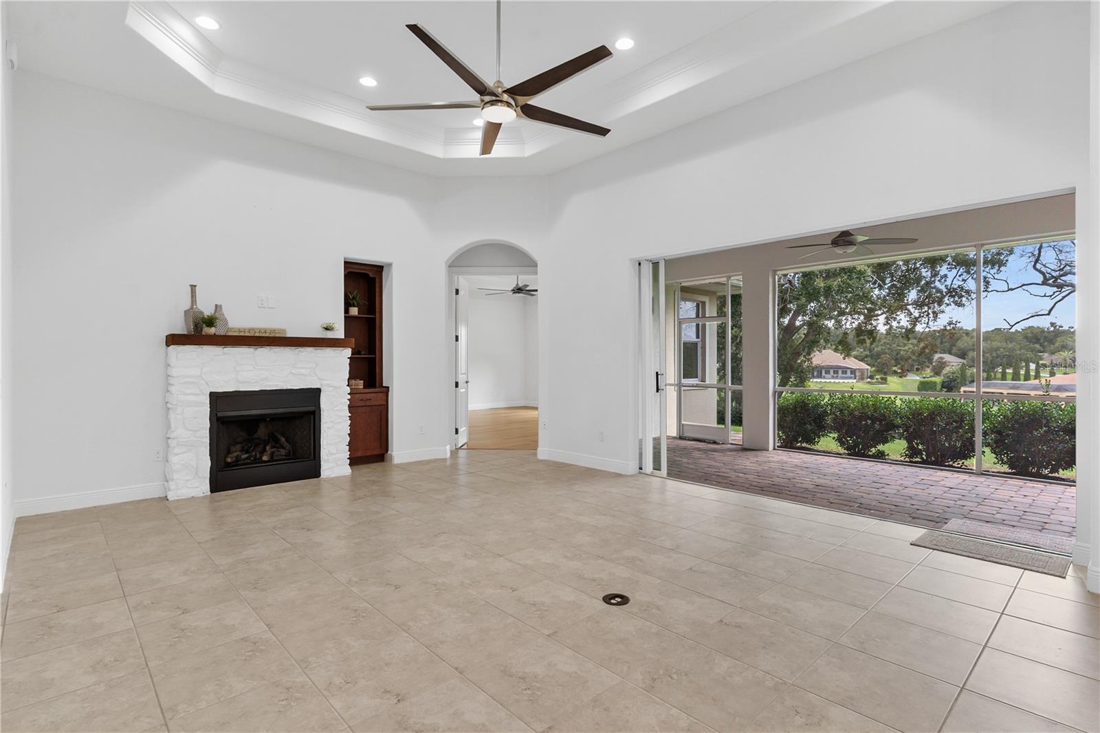 ATTENTION BUYERS…Seller is open to a lease option or lease purchase possibility!! AMAZING HOME...UNIQUE IN DESIGN! Look no further and don't miss this golden opportunity to own this stunning four-bedroom, three-bath home featuring 3 en suites! Lease purchase possible with acceptable terms to seller. Located on the 6th fairway with spectacular views in a secure, 24/7 guard gated, prestigious Golfing Community! The brick paver driveway greets you as you step through the front screen porch to enter your "move in ready"...like new home! This residence features a bright and airy open-concept layout with a 3-way split floor plan! Soaring ceilings and wall-to-wall sliding glass doors flood the space with natural light and frame breathtaking golf course views. The oversized foyer leads you to the heart of the home... the spacious kitchen! Fit for the chef, this gourmet kitchen blends functionality with style—complete with a large center island, granite countertops, stainless steel appliances to include a double oven range, two pantries, abundant cabinetry with pull out shelving/ drawers and a wine bar with a built-in wine rack and wine cooler. The elegant dining area showcases a sparkling crystal chandelier and direct access to the lanai, perfect for effortless indoor-outdoor entertaining. The spacious great room is enhanced by a cozy stone gas fireplace for "romantic evenings" at home! Enter through double doors to your luxurious primary suite offering a spa-like retreat with dual raised vanities, oversized soaking tub, walk-in shower, water closet for privacy, two generous walk-in closets, automatic window shades and serene views of the fairway. En suite #2 with walk in closet include its own bathroom features a pocket door to hall, servicing guests & bedroom 4 with huge walk-in closet! In addition, enjoy en suite 3 with its own private bath! Convenient inside laundry room with lots of cabinets & built in sink! The oversized screened lanai—equipped with an automatic screen—overlooks the lush golf course and offers a peaceful outdoor sanctuary. The backyard, enclosed by a new black iron fence with a 6-foot gate, is adorned with blooming Confederate jasmine for added privacy and beauty, perfect area for your kids to play or your pet to roam freely...Additional highlights include: A deep 2.5-car garage includes extra space (11 x 9.6) for golf cart or extra storage Custom wood cabinetry, real oak hardwood and porcelain tile flooring Upgraded LED recessed lighting and oversized ceiling fans Recent updates such as: Full interior repaint (walls, doors, moldings, baseboards). New crystal light fixtures in foyer and dining room Premium hardwood oak flooring. The residents enjoy privacy and tranquility just minutes from The Villages. In addition to the HOA cost there is a Monthly Minimum Social Membership Required of $180 per month offering access to a wide range of luxury amenities to include clubhouse with fitness center, Olympic size pool, tennis, racquet and pickle ball! Plus, access to boating/fishing on the Harris Chain of Lakes!! For additional fees...Golf membership and RV/Boat storage available. This home seamlessly blends luxury, comfort, and resort-style living in one of Central Florida’s most desirable golf communities. Call today for the start of your new beginning vacationing from home!