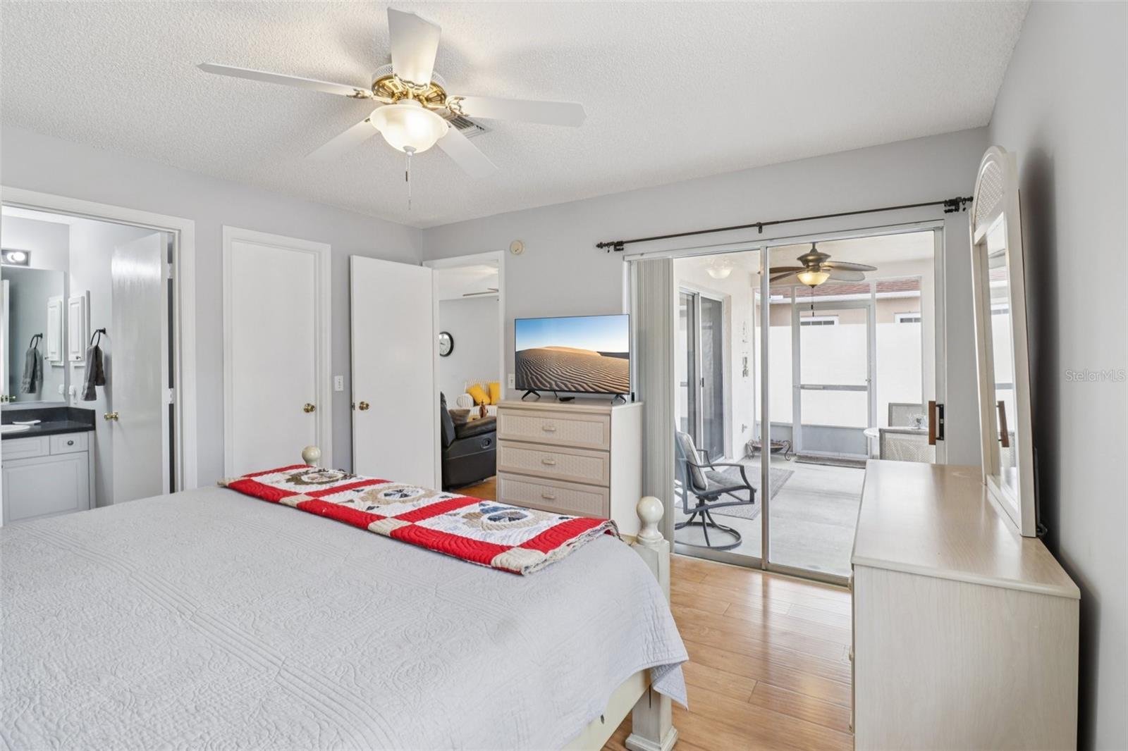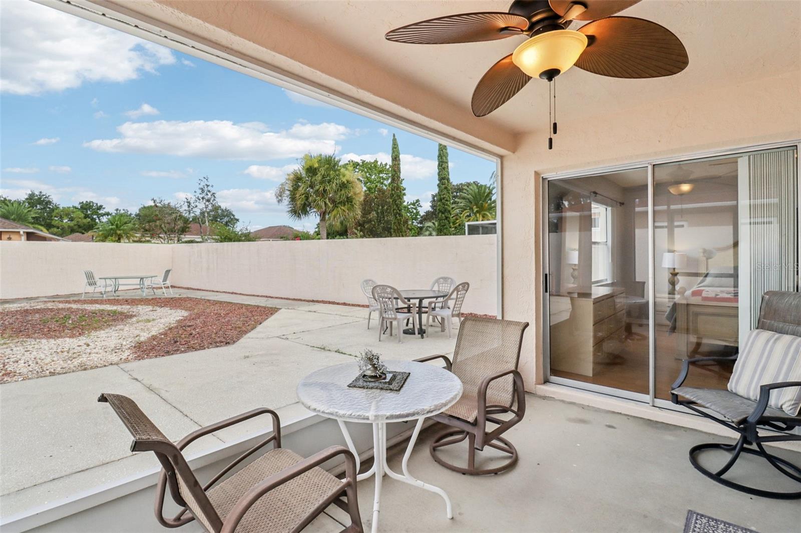 No Bond and Turnkey—this 2-bedroom, 2-bath Block & Stucco Hacienda Villa is a rare find, located in the Village of Del Mar just steps from Spanish Springs. The home features a galley-style kitchen with beautifully refaced cabinets, a spacious living and dining area, and a master suite with private lanai access, a large walk-in closet, and a walk-in shower. The second bedroom offers a generous double closet, while the guest bath includes a full tub and shower combo. The oversized screened lanai opens up to an absolutely massive courtyard—large enough for a pool, home expansion, or even your own pickleball court. With a roof from 2008, HVAC from 2015, and a water heater from 2019, the major systems are in great shape. You’re perfectly positioned to walk to Spanish Springs Town Square and just a short golf cart ride to Lake Sumter Landing, Tierra Del Sol Country Club, Hacienda Regional Rec Center, The Villages Regional Hospital, shopping, and dining. Whether you’re looking for a full-time residence, vacation escape, or high-income rental (where $4,000/month is common in peak season), this villa is an incredible opportunity. Schedule your private showing today—or request a FaceTime tour if you’re out of the area—and experience all this beautiful property provides.