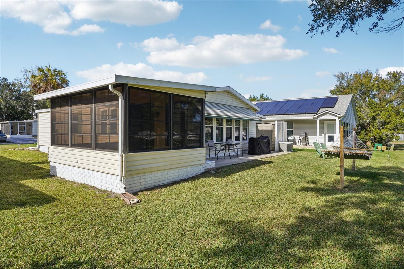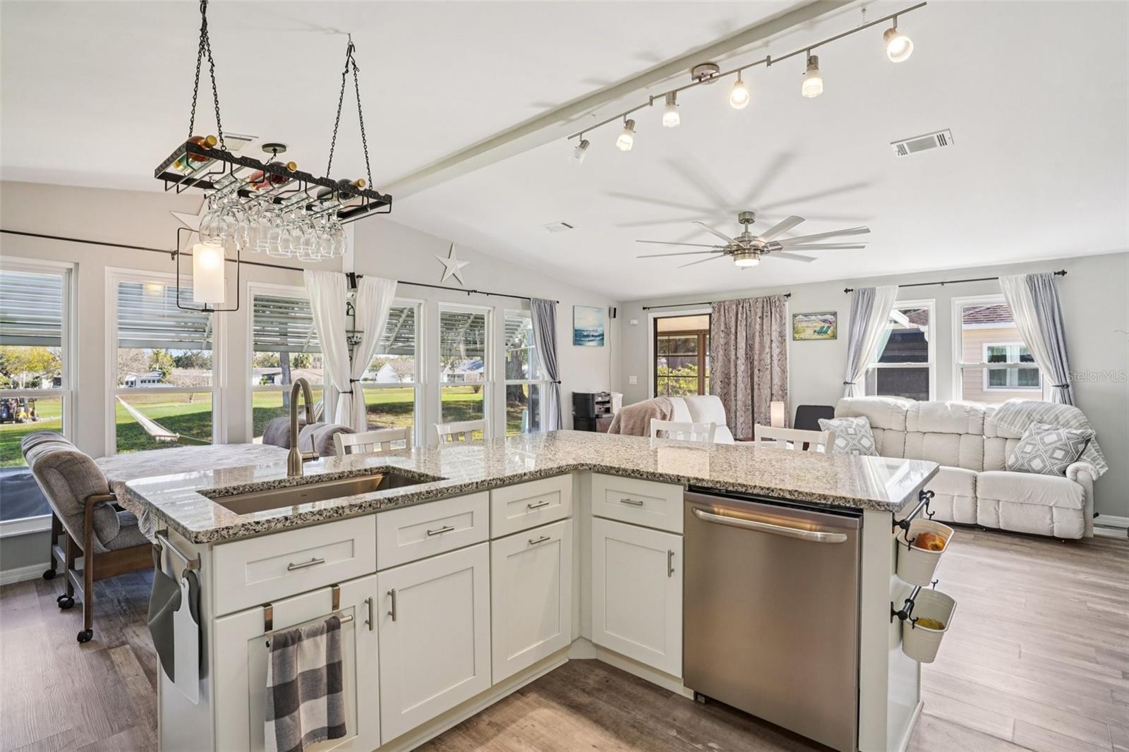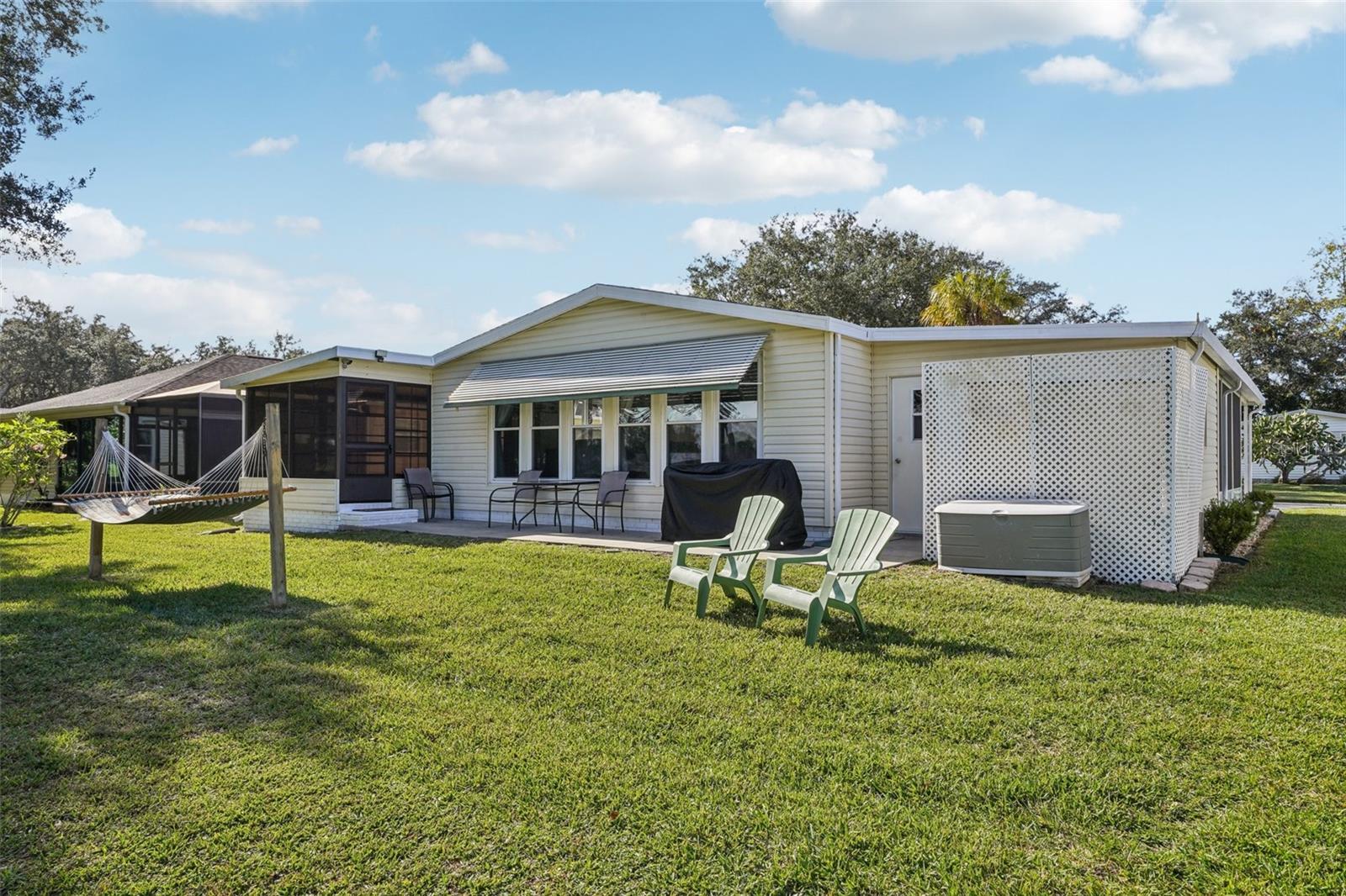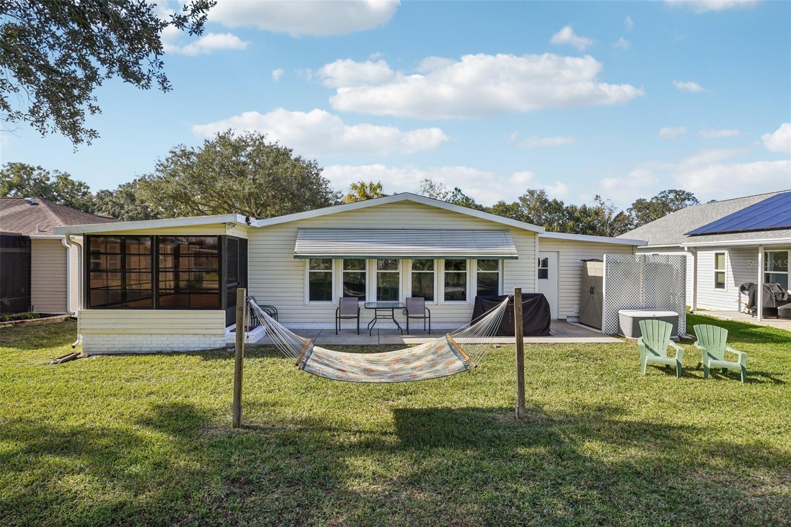 Claim your piece of paradise in the world's most exciting retirement community, The Villages, FL!!! This TURNKEY, MOVE-IN READY GOLF-FRONT RETREAT is where comfort, style, and breathtaking views come together! This beautifully upgraded 2-bedroom, 2-bath home with 1,144 sq. ft. is perfectly positioned to capture sweeping golf course vistas from nearly every angle—whether you’re relaxing by the large double-paned windows in the living, dining, and kitchen areas, unwinding in the Florida room, enjoying the back patio, or swaying gently in a hammock overlooking the fairway. The absolute showstopper is the FULLY UPGRADED KITCHEN, designed to impress and inspire, featuring soft-close wood cabinetry, GRANITE COUNTERTOPS, a stylish tile backsplash, pull-out drawers, and a massive island that’s perfect for entertaining or casual dining. NEW LUXURY VINYL PLANK FLOORING flows seamlessly throughout the home, enhancing both beauty and durability. The ENCLOSED SCREENED CARPORT with sliding doors adds versatile living space—ideal as a bonus room, hobby area, or breezy lounge. Additional highlights include a NOVA WHOLE-HOUSE WATER FILTRATION SYSTEM, Wi-Fi-controlled thermostat, surround sound in the living room, and a cozy ELECTRIC FIREPLACE for added ambiance. Outside, you’ll love the WIDENED DRIVEWAY accented with solar lighting and a convenient outdoor storage shed. Peace of mind comes standard with major updates already completed: ROOF (2019), HVAC (2020), and HOT WATER HEATER (2023). This is GOLF-FRONT LIVING AT IT'S FINEST—stylish, serene, and truly move-in ready. Just bring your suitcase and start enjoying the view and all the world-class amenities in The Villages: endless recreation, championship golf, live entertainment, dining, shopping, and beautiful town squares—all connected by scenic golf-cart paths. With friendly neighbors, an active lifestyle, and sunshine year-round, The Villages is the perfect place to relax, explore, and truly enjoy life. Schedule your private showing today!