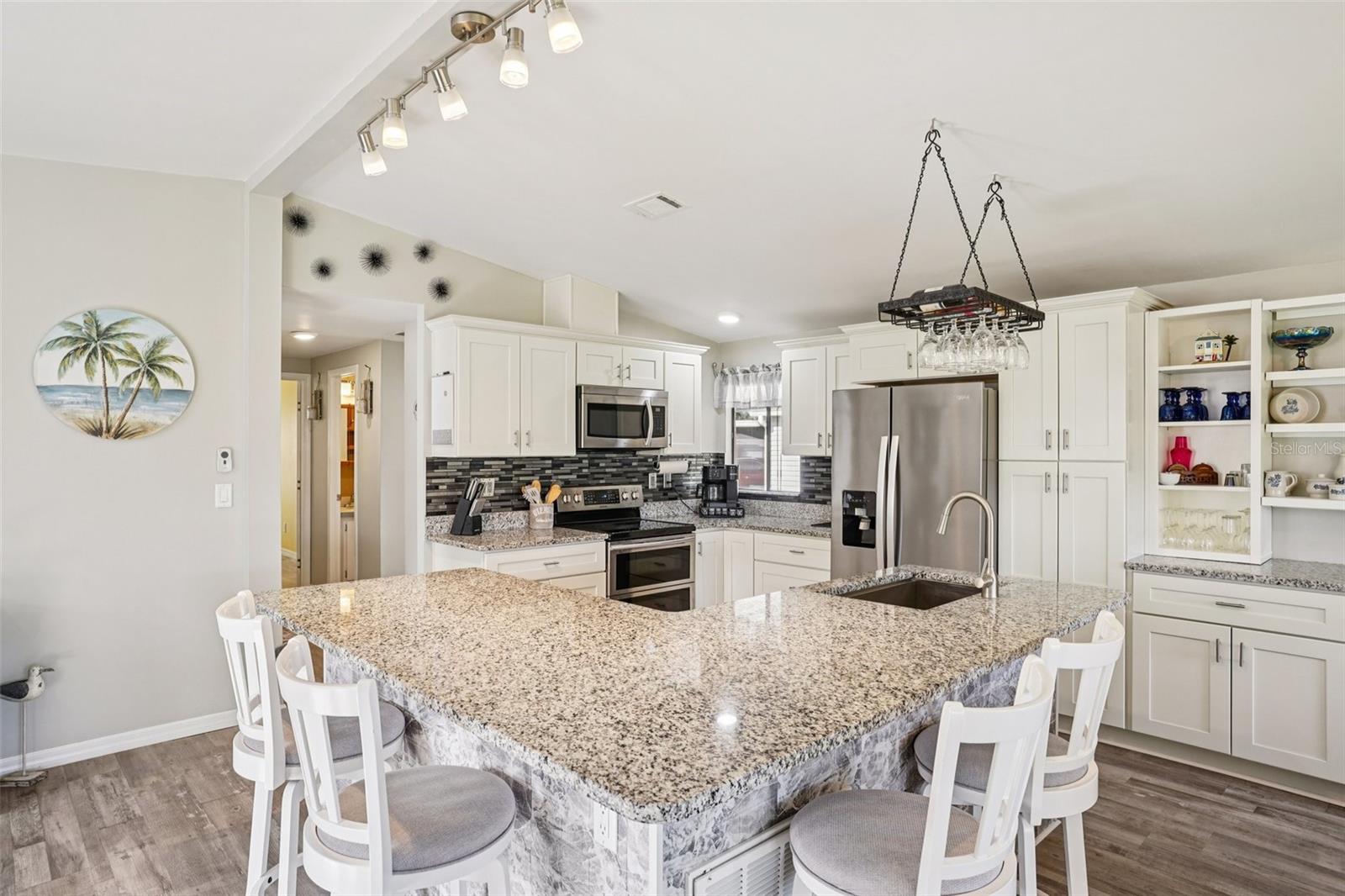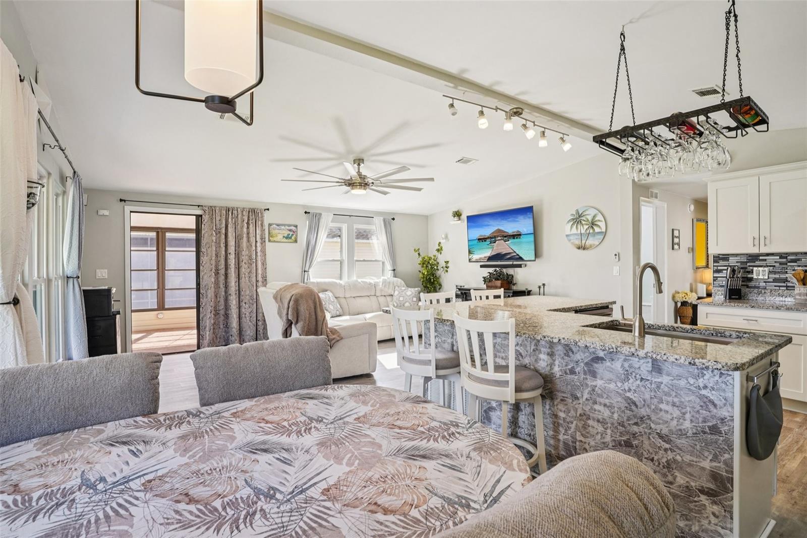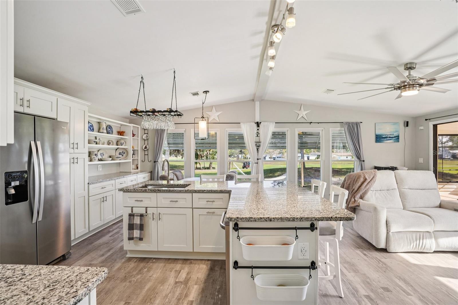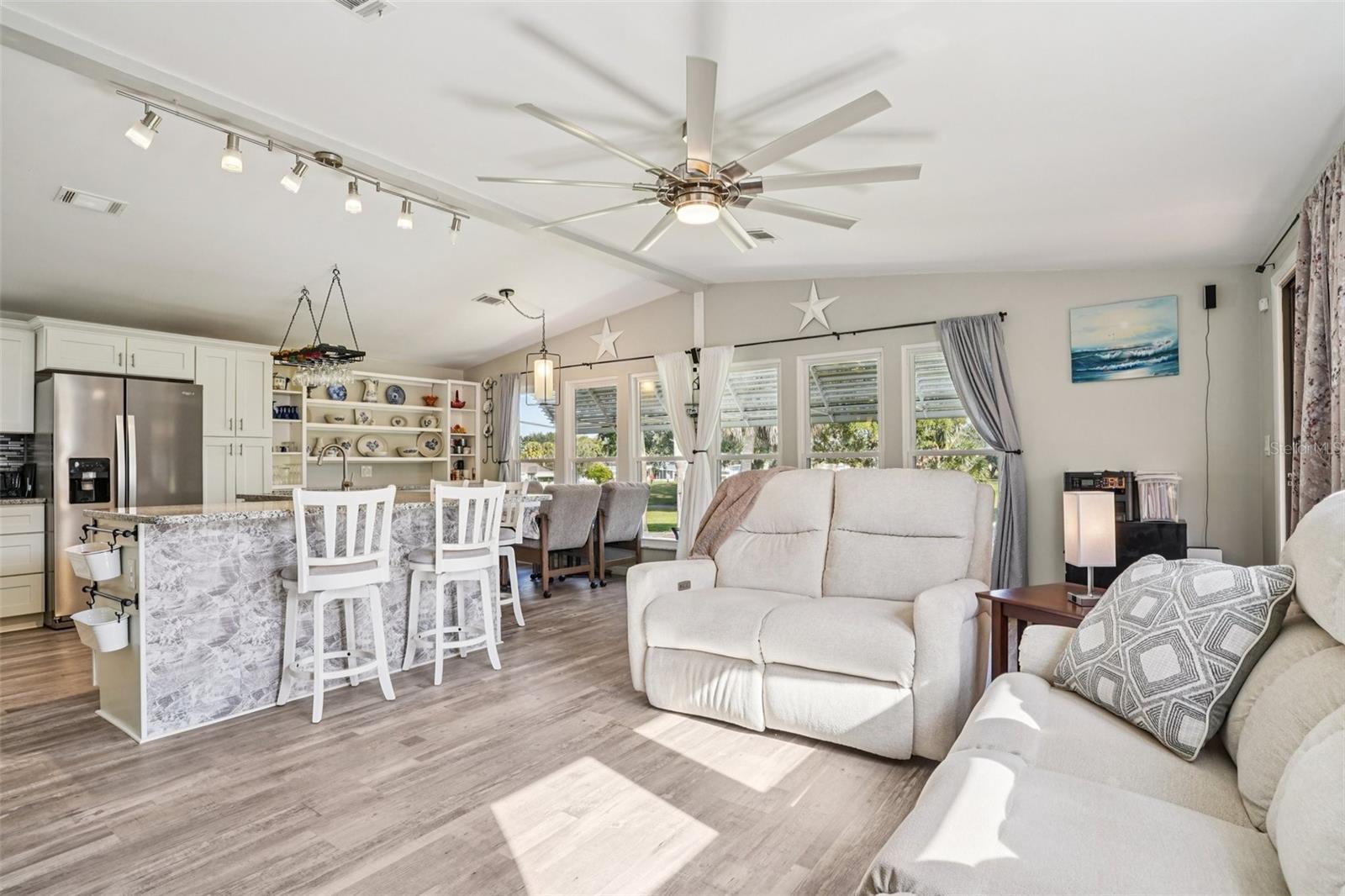 Claim your piece of paradise in the world's most exciting retirement community, The Villages, FL!!! This TURNKEY, MOVE-IN READY GOLF-FRONT RETREAT is where comfort, style, and breathtaking views come together! This beautifully upgraded 2-bedroom, 2-bath home with 1,144 sq. ft. is perfectly positioned to capture sweeping golf course vistas from nearly every angle—whether you’re relaxing by the large double-paned windows in the living, dining, and kitchen areas, unwinding in the Florida room, enjoying the back patio, or swaying gently in a hammock overlooking the fairway. The absolute showstopper is the FULLY UPGRADED KITCHEN, designed to impress and inspire, featuring soft-close wood cabinetry, GRANITE COUNTERTOPS, a stylish tile backsplash, pull-out drawers, and a massive island that’s perfect for entertaining or casual dining. NEW LUXURY VINYL PLANK FLOORING flows seamlessly throughout the home, enhancing both beauty and durability. The ENCLOSED SCREENED CARPORT with sliding doors adds versatile living space—ideal as a bonus room, hobby area, or breezy lounge. Additional highlights include a NOVA WHOLE-HOUSE WATER FILTRATION SYSTEM, Wi-Fi-controlled thermostat, surround sound in the living room, and a cozy ELECTRIC FIREPLACE for added ambiance. Outside, you’ll love the WIDENED DRIVEWAY accented with solar lighting and a convenient outdoor storage shed. Peace of mind comes standard with major updates already completed: ROOF (2019), HVAC (2020), and HOT WATER HEATER (2023). This is GOLF-FRONT LIVING AT IT'S FINEST—stylish, serene, and truly move-in ready. Just bring your suitcase and start enjoying the view and all the world-class amenities in The Villages: endless recreation, championship golf, live entertainment, dining, shopping, and beautiful town squares—all connected by scenic golf-cart paths. With friendly neighbors, an active lifestyle, and sunshine year-round, The Villages is the perfect place to relax, explore, and truly enjoy life. Schedule your private showing today!