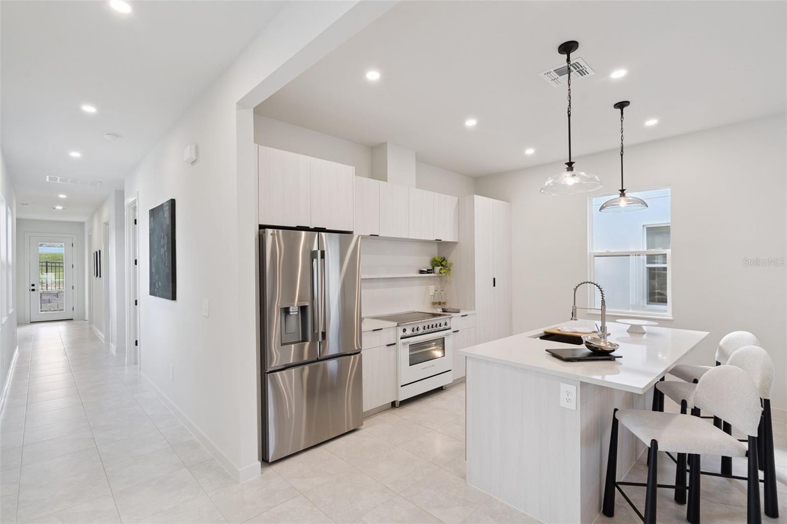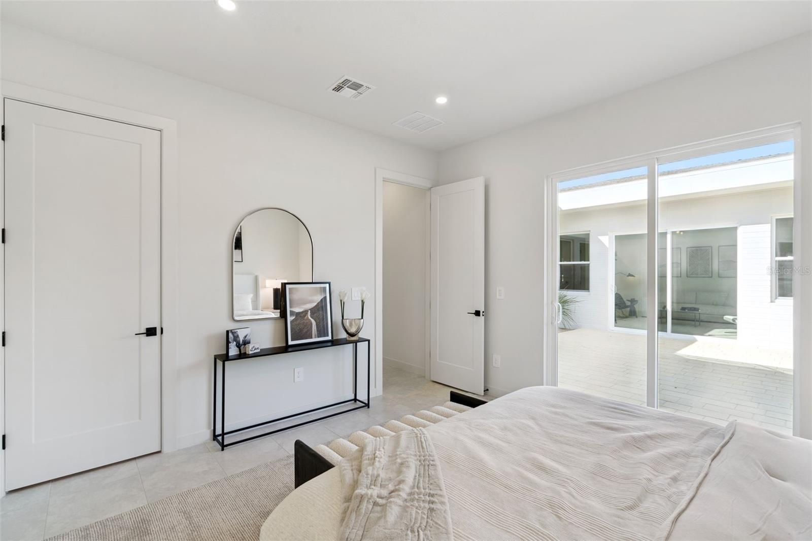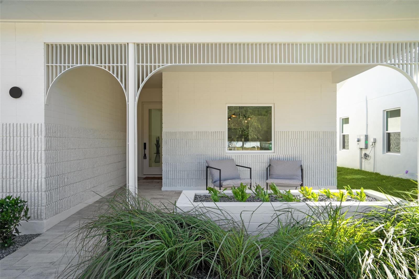 Completed Model home, move in ready, loaded with upgrades! This captivating single-story Cypress home presents a fresh, modern aesthetic and an effortlessly livable open layout. Its clean architectural lines and welcoming presence are immediately evident from the curb, featuring a striking contemporary facade with a two-car garage and a beautifully detailed covered entryway. Step inside to an interior bathed in natural light, where the smart, flowing layout connects the open-concept living, dining, and kitchen areas. The living room is an inviting space with sleek, light-colored flooring, a modern linear fireplace flanked by built-in shelving, and a massive sliding glass door that seamlessly extends the living space to the outdoors. The gourmet kitchen boasts light, flat-panel cabinetry, a generous island with seating, stainless steel appliances, and is perfectly positioned to serve the adjacent dining area. Just beyond the main living spaces, a private central courtyard offers a beautiful outdoor retreat, tiled and enclosed by the home's structure. The luxurious primary bathroom features a double vanity with ample storage, contemporary black fixtures, and a spacious glass-enclosed shower with stylish tiling. The secondary bathroom maintains the home's modern, sophisticated design with a double vanity and sleek black fixtures. Outside, the home is part of a dynamic new community. Boulevard Oaks is designed for connection and activity, centered around The Oasis clubhouse with inviting lounge areas and a resort-style swimming pool. Expansive greenspaces, walking trails, and pickleball courts offer residents numerous options for an active outdoor lifestyle, all nestled behind a welcoming, oak tree-lined boulevard.