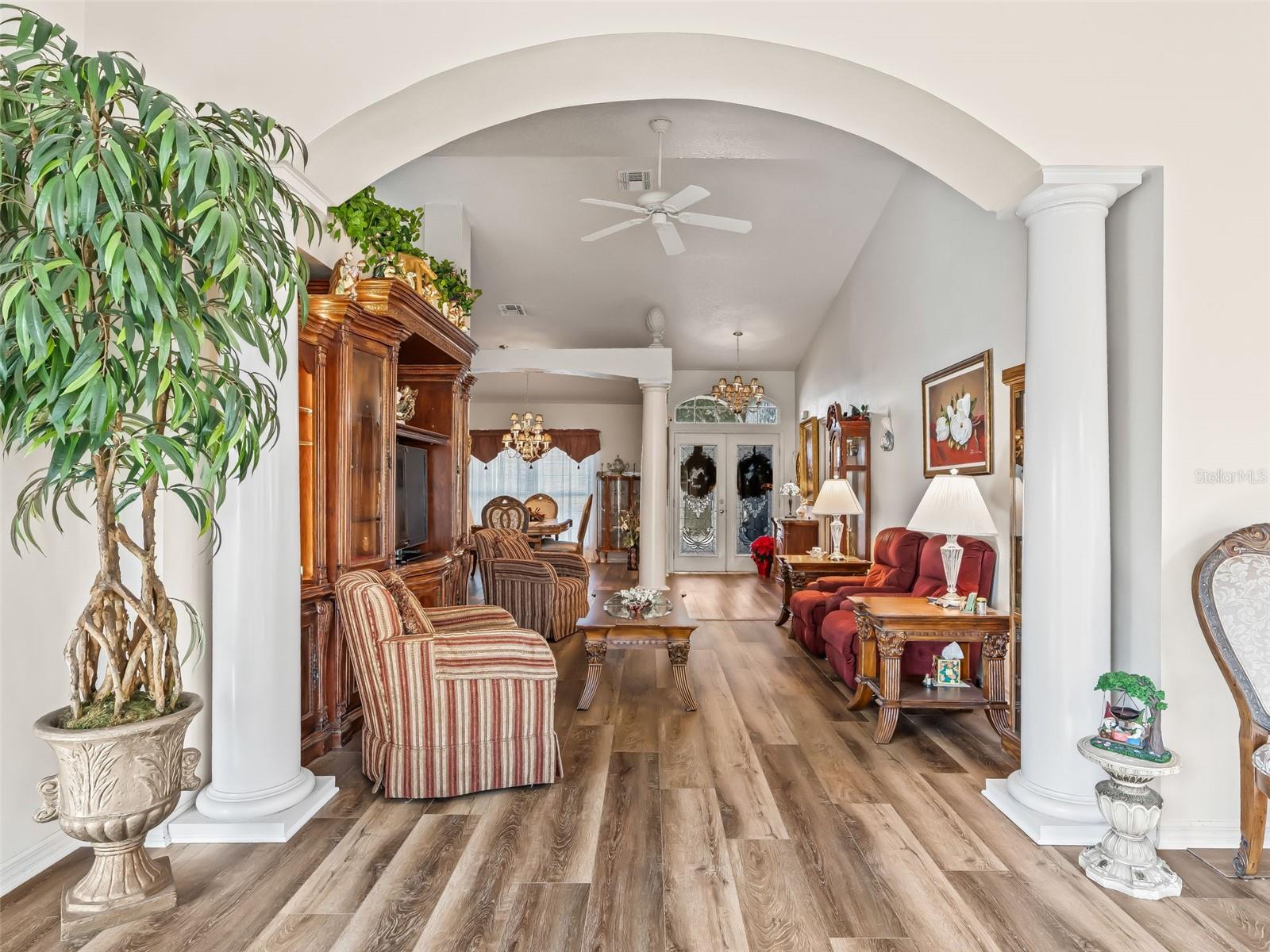 Beautiful Family Neighborhood Golf Course Community in The Lakes of Lady Lake! Whole House Solar System (Balance Paid at Closing)! ROOF 2025! HVAC 2025! Golf Front on the 7th Fairway 3/2 Concrete Block and Stucco Designer Home with a Side Facing 2 Car Garage on a Quiet Cul De Sac Lot! This Exceptional home exudes Tremendous curb appeal featuring a Gorgeous Painted Concrete Driveway and Walkway, Professional Low Maintenance Landscaping, Stunning Front Porch with Stone Pillars, and an Elegant Leaded Glass Double Door Entry! Upon entering you are greeted by an Open Concept Floor Plan, High ceilings, and Designer Chandeliers! The New Custom Gourmet Kitchen showcases French Provincial Cabinetry featuring soft close draws with pullouts, and under & over cabinet LED lighting, Quartz countertops, Two Pantries cabinets with pullouts, a Generous Breakfast Bar, White Appliances (2023), Stainless Refrigerator (2024), and an Eat in Area. Enjoy the additional living space in the 24 x 10 Family room which flows seamlessly from the Living area, providing the perfect Gathering area for Entertaining Family, and Friends! The Luxurious Primary suite boasts a Tray ceiling, Walk in Closet, and a En Suite bathroom. The En Suite features a Two sink Vanity, Large Soaking Tub, and a Walk in Shower. The Split Floor Plan offers maximum Privacy for both the Owners and their Guest, with the Primary suite commanding one side of the home while the guest bedrooms and guest bathroom are located on the opposite side of the home, providing plenty space for your guests! Retreat to the Back Deck to Enjoy Relaxing Evenings Soaking in the Spectacular View as the Sun Sets over the Golf Course! Take advantage of the Fantastic Florida weather and Tropical Breezes while you BBQ, and Dine Outdoors! The 2 Car Garage offers pull down Attic stairs, and Wall Mounted Cabinets for additional storage! This Stunning Custom Home offers a Well Designed Floor Plan, Beautiful Upgrades, and a Fantastic Location! All New Windows (2023), Front Door Glass (2023). Close to The Villages, Spanish Springs Town Square, The Villages Regional Hospital, Restaurants, Banks, Medical, The VA Hospital, and more! The Whole House Solar System saves on your Electric Bill Year Round! THIS HOME IS A MUST SEE! MOVTIVATED SELLER!!!