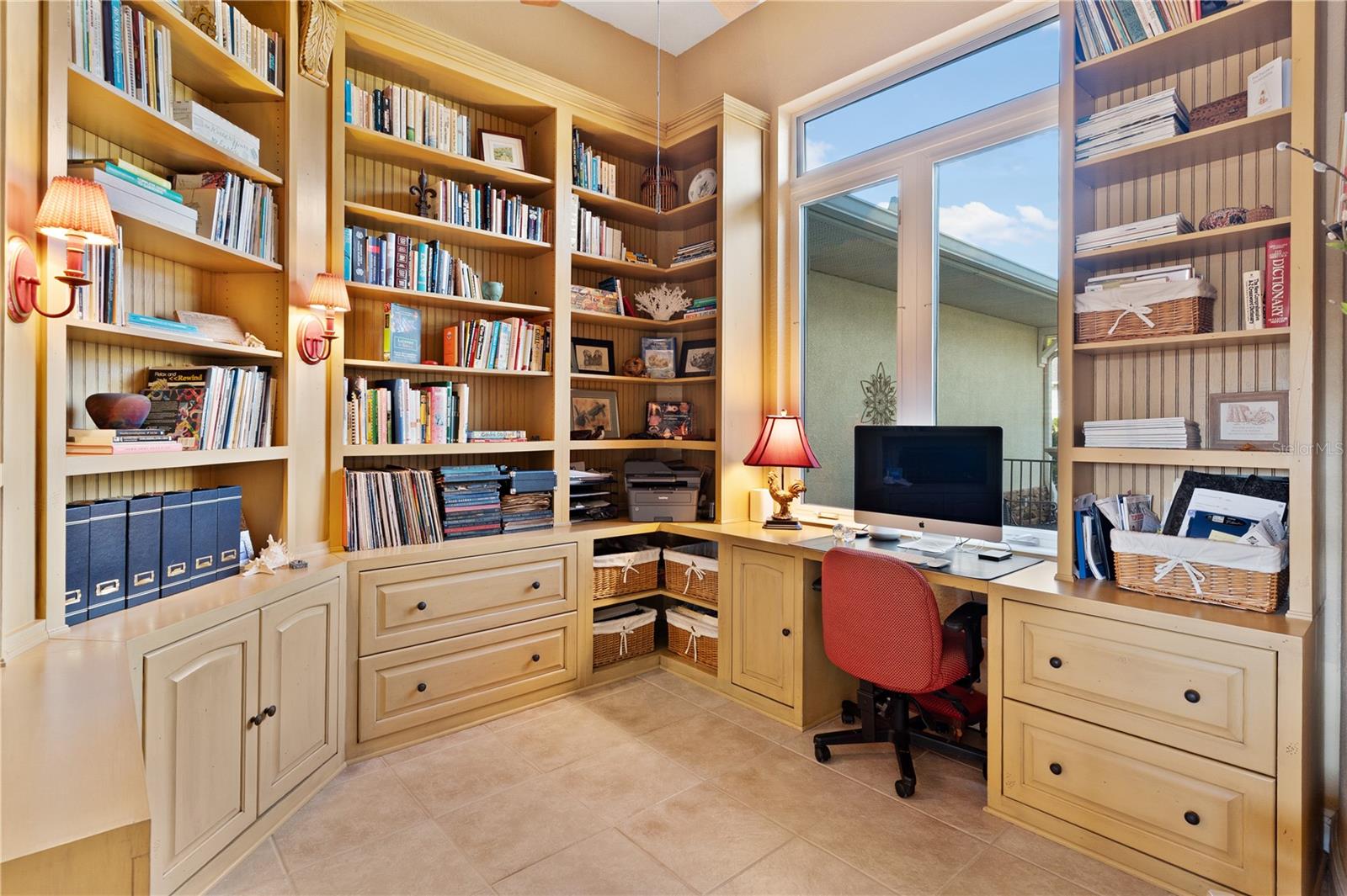 STUNNING POOL HOME...WITH WATERVIEW! Custom built "Castello" model... 3-bedroom, 2.5-bath with 2,457 sq ft. of living area plus an oversized 2 car with a separate golf car garage! Located in a desirable, manned 24/7guard gated golfing community, situated on a peaceful pond with fountain views. Exterior features a brick-paved driveway, fresh landscaping, and an iron-gated, front courtyard. Inside, enjoy custom design details, 8-foot doors, volume ceilings, tinted windows and more...Greet and impress your guests in the turret-style foyer with a chandelier! Working from home will be a delight with the custom cabinetry, built in desk and French doors for privacy! The great room offers built-in surround sound & sliding glass doors leading to lanai. Kitchen is designed and "fit for the Chef"...entertaining is a breeze with the 6 BURNER GAS RANGE, commercial grade range hood, Dishwasher plus two full size wall ovens! Also, features maple wood cabinetry with desk or bar area, granite countertops, large island and snack bar! The primary suite has two walk-in closets, sliding doors to lanai and a spa-style bath with dual vanities, soaking tub, walk-in shower, and water closet. Bedrooms 2 & 3 feature pocket doors to guest bath and share this brilliant design of a Jack-n-Jill bath with dual sinks!! Enjoy Florida living at its finest and affordable! Covered lanai with tongue-and-groove cedar ceiling, speakers, birdcage enclosure, and an electric-heated saltwater pool with sun shelf, waterfall, and child safety fence overlooking the pond. Additional highlights include a guest half bath, custom laundry room, 2-car plus a separate golf cart garage, and new roof in 2025.Septic uses the state-of -the-art treatment technology "Distributed Wastewater Treatment System"! For additional fees, residents can have the option to enjoy access to the Country Club amenities including golf, swimming, tennis, pickleball, fitness center, RV/Boat storage and a private marina on Lake Griffin all within the scenic, treed neighborhood featuring sidewalks & rolling hills for your walking pleasure!! Rare find and "one of a kind" opportunity you won’t want to miss!!!