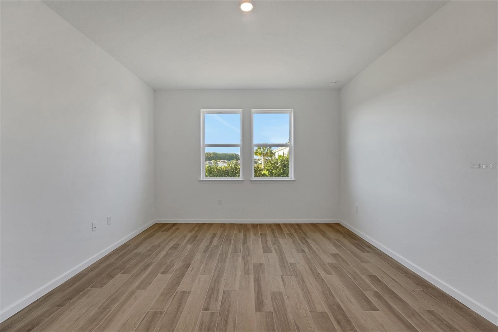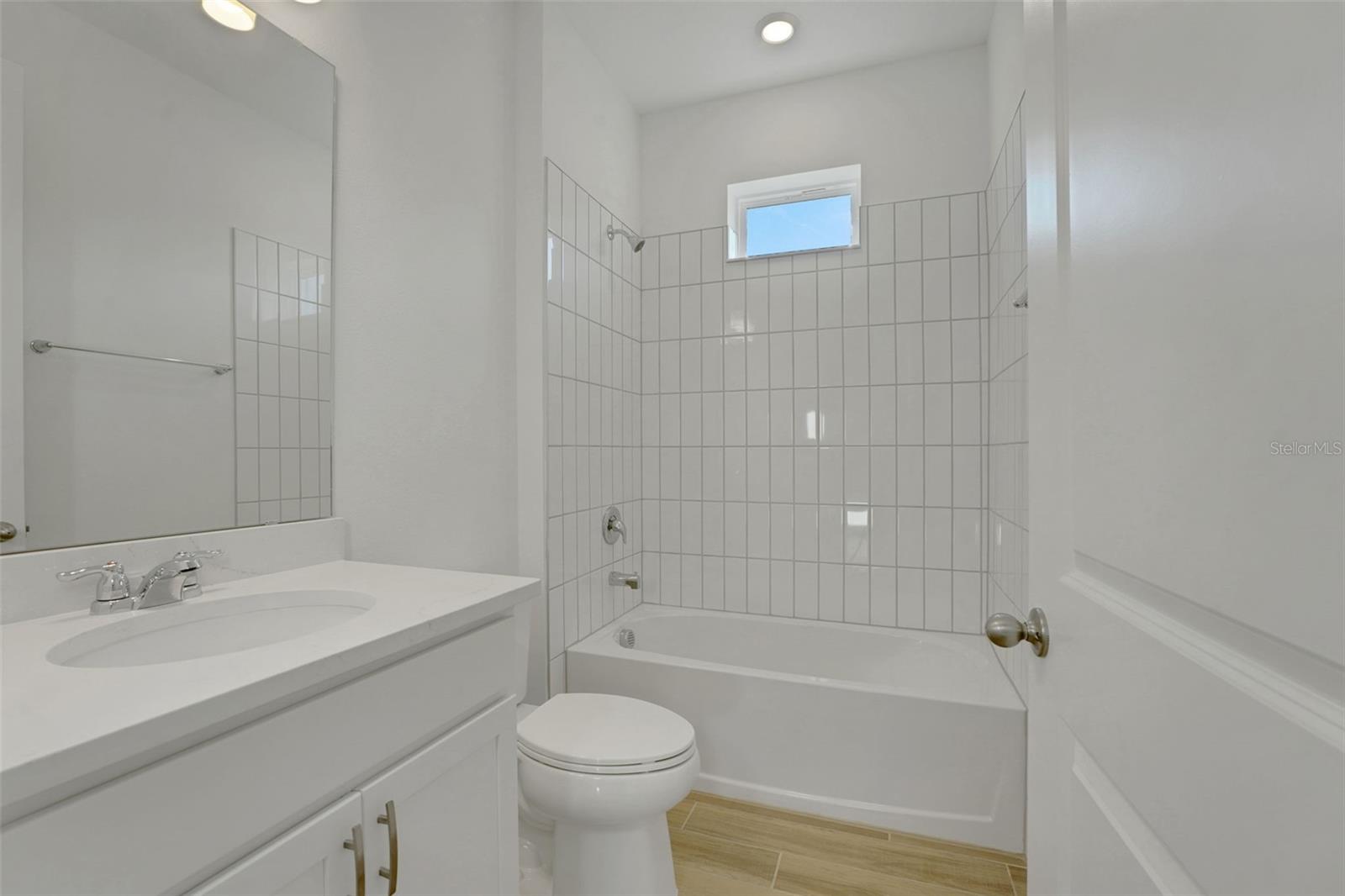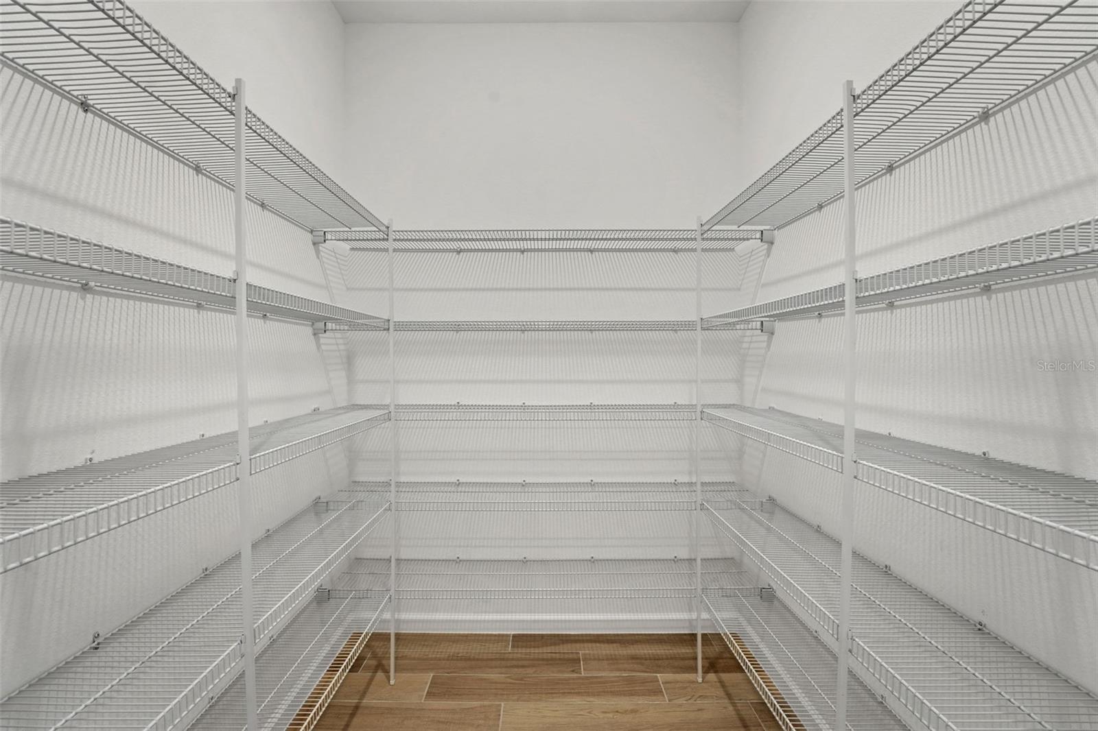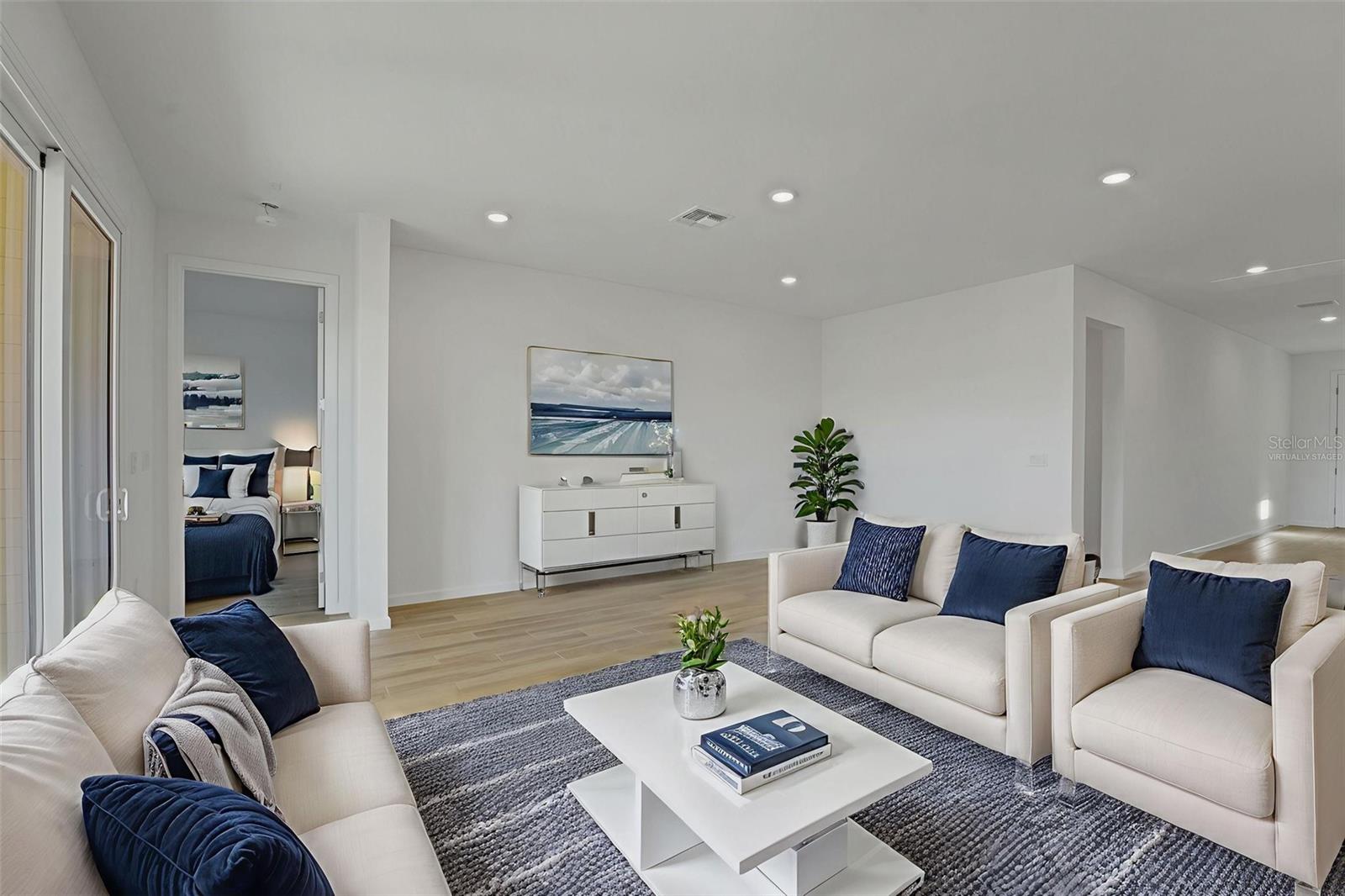 One or more photo(s) has been virtually staged. The Key West–style Fairfield Plan offers a spacious and inviting layout with three bedrooms, two baths, and a two-car garage. The open-concept kitchen, living, and dining area is designed for everyday comfort and entertaining, featuring 5.25-inch baseboards, eight-foot doors, and a striking nine-foot sliding glass door that opens to the covered lanai. The kitchen is the heart of the home, with a large center island topped with quartz countertops, upgraded 42-inch cabinets, and a walk-in pantry for plenty of storage. The living area is finished with upgraded laminate flooring, adding both style and durability. The primary suite provides a relaxing retreat with a generous walk-in closet, while the spacious laundry room adds extra convenience. Brick pavers on the driveway and walkway, along with the charming Key West–inspired exterior, give this home its distinctive character and curb appeal