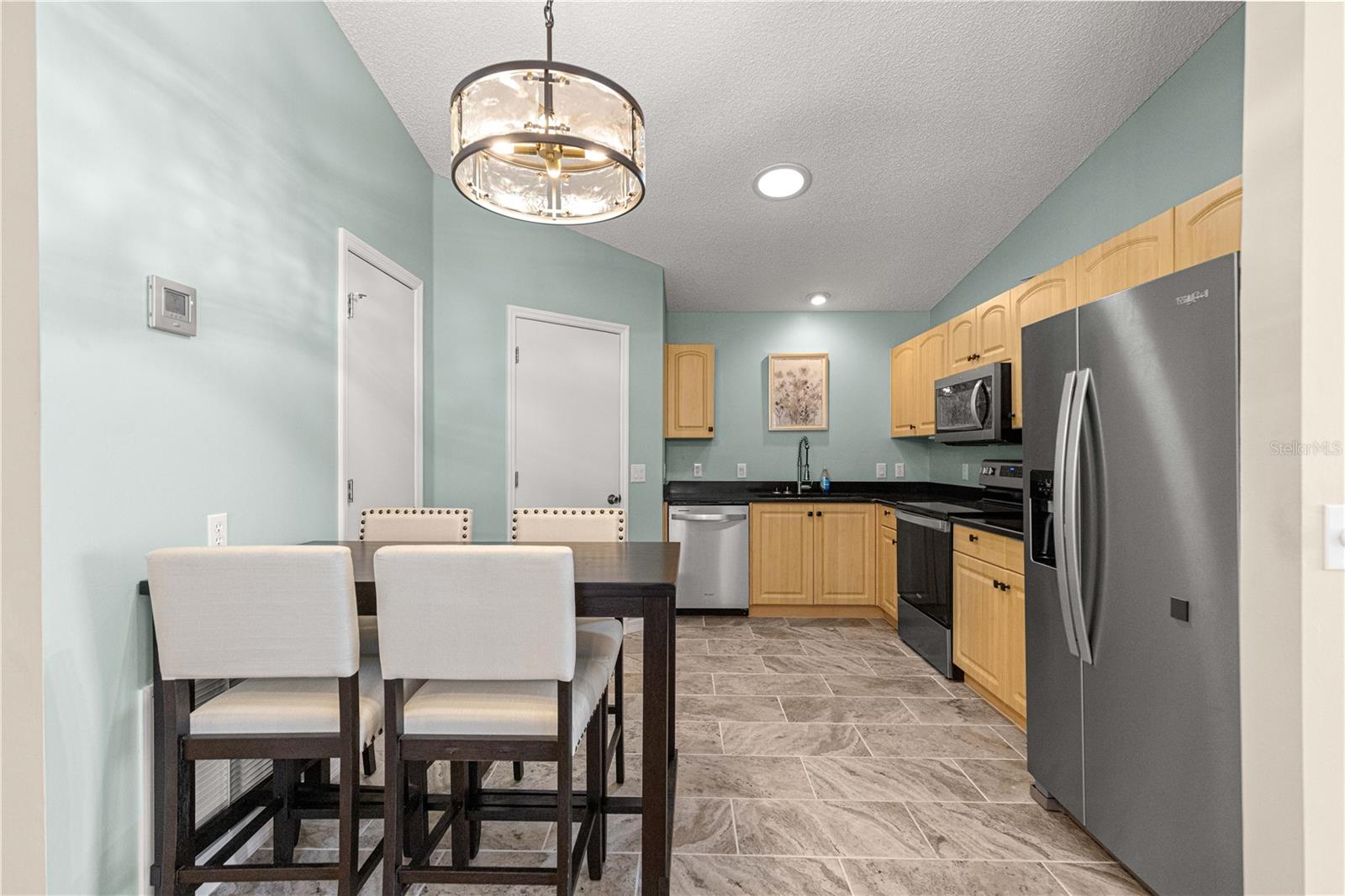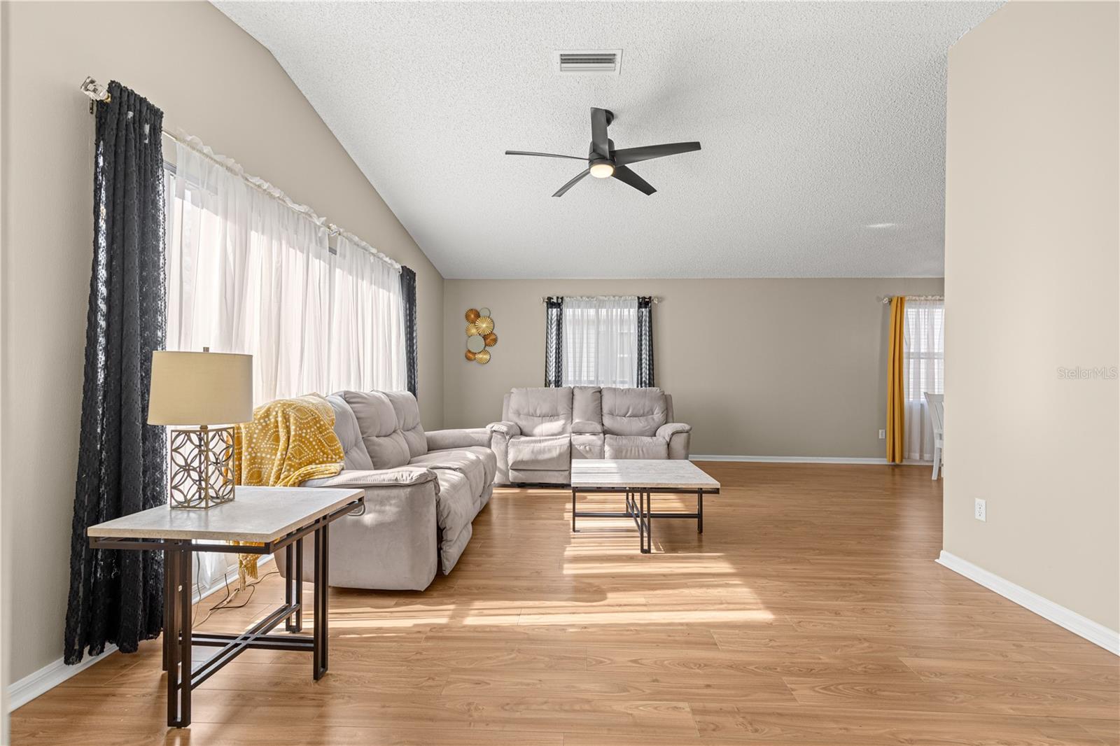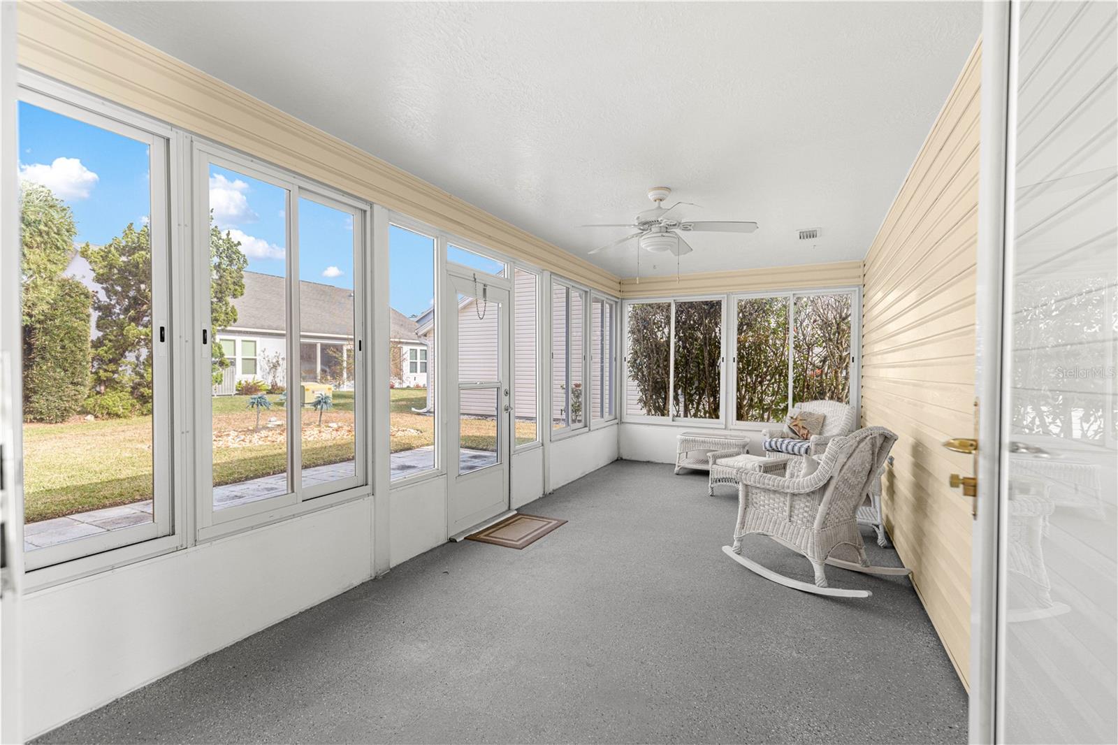 BEAUTIFUL Santiago model Village home featuring 2 bedrooms and 2 bathrooms, located in the highly desirable Village of Rio Grande with the BOND FULLY PAID. This PRIME location home offers an EXPANDED 2-car garage, vaulted ceilings, room for a pool, and is being offered partially furnished for added convenience. MAJOR updates include a NEW ROOF (2025) and HOT WATER HEATER (2023). In 2024, the kitchen was completely refreshed with NEW stainless steel appliances, including refrigerator, stove, microwave, and dishwasher, along with GRANITE countertops, new sink and faucet, and garbage disposal. A NEW washing machine was also installed. Additional upgrades include NEW ceiling fans, NEW light fixtures in the dining and kitchen areas, all interior electrical outlets and covers replaced, and all windows screened. The garage door opener and remote entry motor, along with the garage wire pulley and wheels, were replaced in 2024. Both bathrooms have been beautifully REMOLDED. The master bathroom (2024) features a NEW walk-in shower with updated hardware and GRANITE countertop. The guest bathroom (2024) was completely renovated with NEW flooring, walls, mirrors, sink, accessories, and a walk-in shower. Both toilets were replaced as part of the upgrades. The home also features a glass-enclosed, climate-controlled lanai, providing additional year-round living space. Ideally located near Championship and Executive golf courses, restaurants, and just a short distance to Spanish Springs and Lake Sumter, this home combines extensive upgrades, comfort, and a truly prime location in one of The Villages’ most sought-after areas.