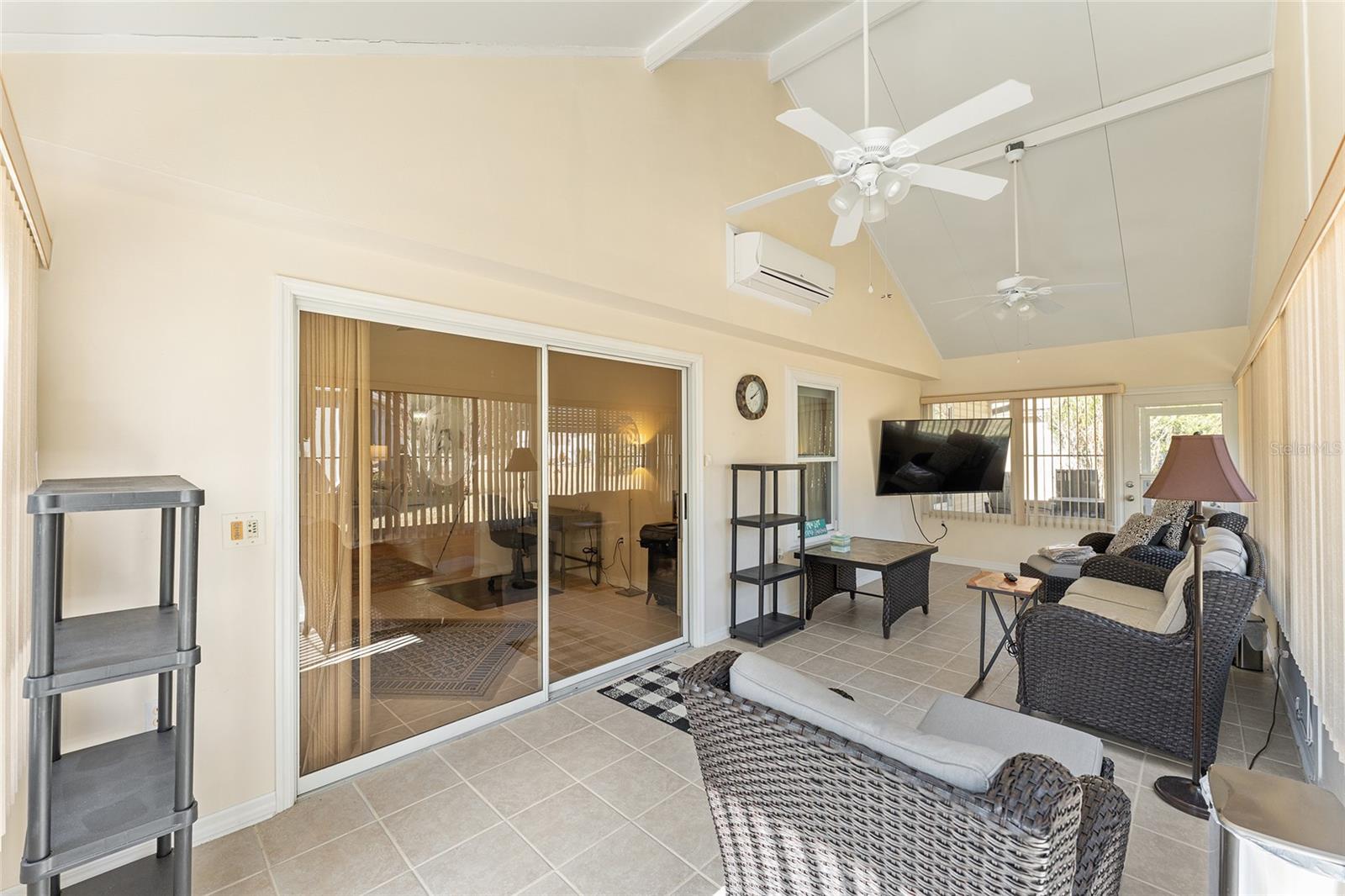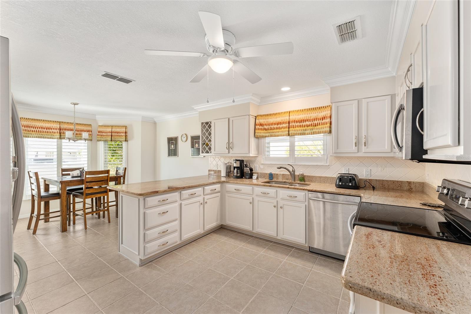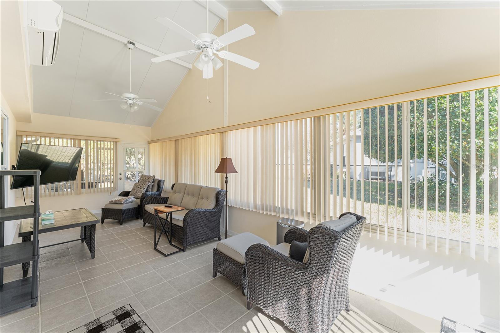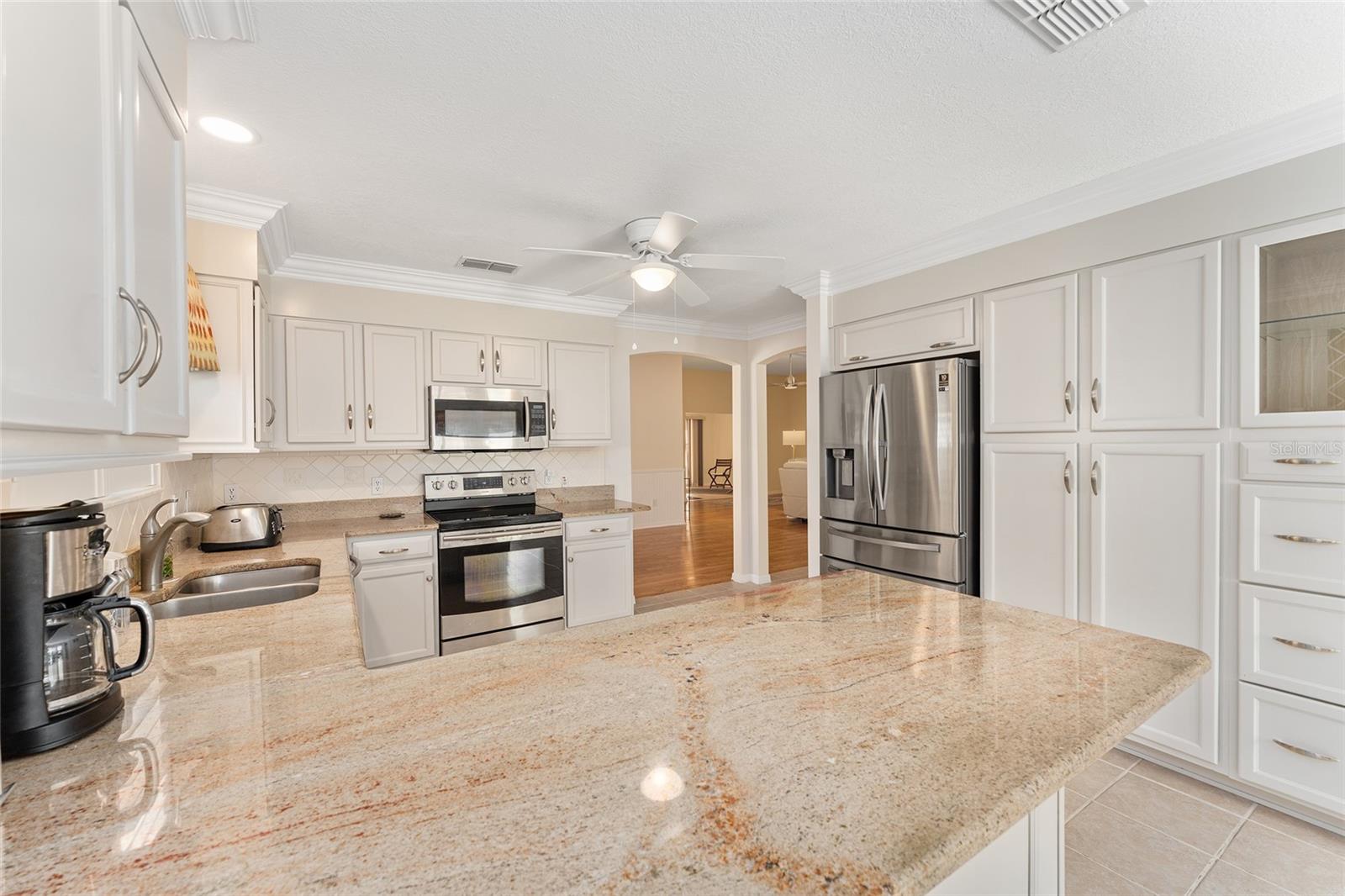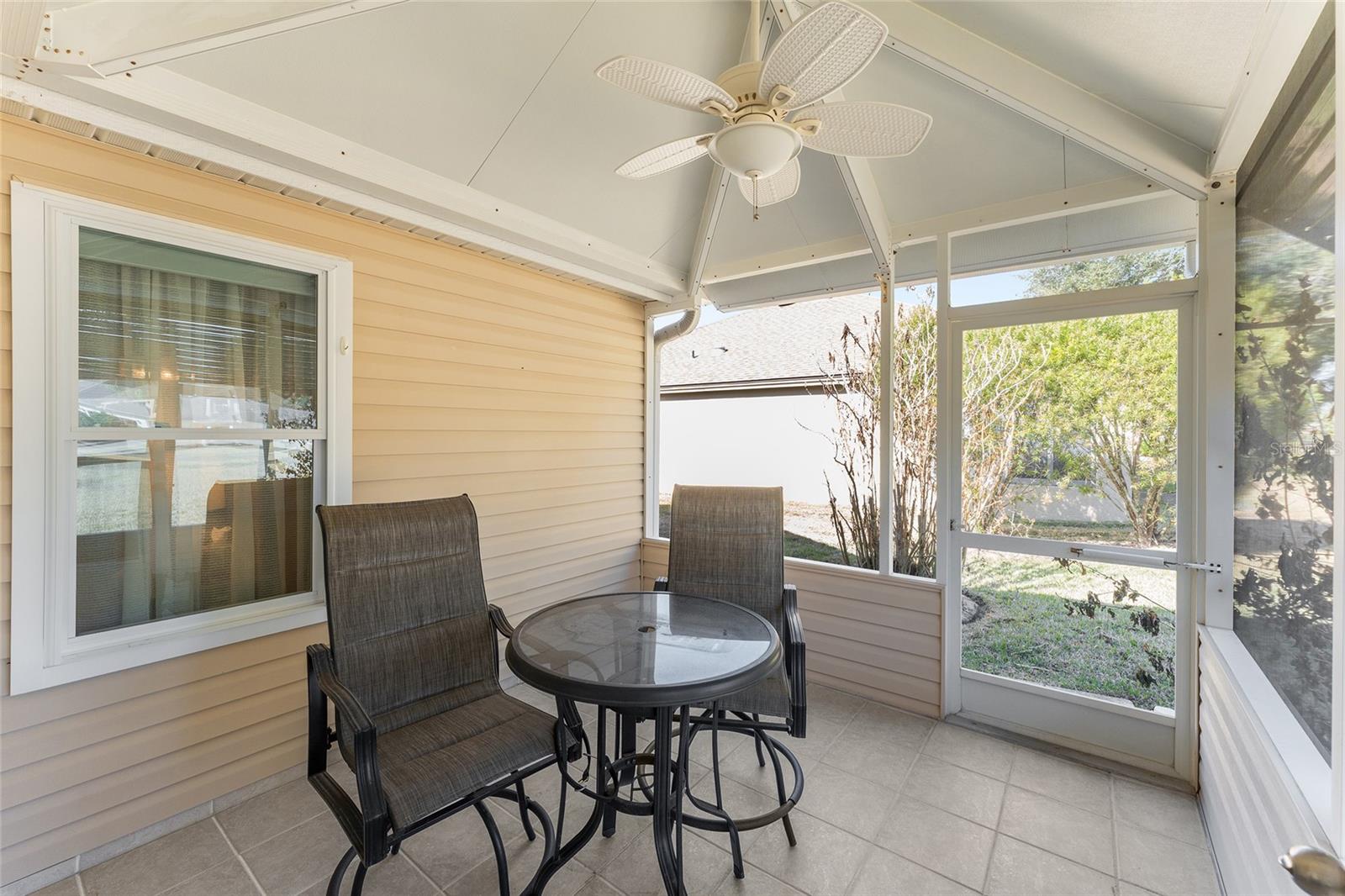 ~NO BOND~ ~2022 HOT WATER HEATER~ ~2014 ROOF~ ~ 2010 TRANE HVAC~ ~TURNKEY w/GOLF CART~ ~LARGE GLASS ENCLOSED LANAI~ Welcome to this beautifully maintained SAUSALITO model located in the sought-after Village of HACIENDA in The Villages. Offered TURNKEY and set on a desirable lot that backs up to a cul-de-sac with mature landscaping, this home is truly move-in ready and packed with thoughtful upgrades. Step inside to soaring HIGH VAULTED ceilings and a welcoming entryway featuring CERAMIC tile flooring and a COAT CLOSET with shelving. The spacious living room showcases LAMINATE flooring, a SOLAR TUBE for abundant natural light, and an open flow into the dining area, which also features laminate flooring and updated lighting—perfect for entertaining. The kitchen is both stylish and functional, boasting CERAMIC tile flooring, GRANITE countertops, CROWN MOLDING, TILE backsplash, PLANTATION SHUTTERS, rollout cabinets, a ceiling fan, and a cozy eat-in area. In addition, the kitchen cabinets have been extended to provide even more storage! The primary suite offers LAMINATE flooring, HIGH VAULTED ceilings, a ceiling fan, updated lighting, and 2 WALK-IN CLOSETS. The ensuite bath impresses with CERAMIC tile flooring, a WALK-IN JETTA STONE SHOWER with FRAMELESS GLASS DOORS, DOUBLE sinks, and GRANITE countertops. 2 additional bedrooms provide flexibility for guests or a home office, each featuring LAMINATE flooring, built-in closets, ceiling fans, and updated lighting. The guest bath includes CERAMIC tile, a tiled shower-tub combo with glass doors, a SOLAR TUBE, linen closet, and GRANITE countertops. Enjoy the convenience of an INSIDE LAUNDRY ROOM with CERAMIC tile, laundry tub, and cabinets. The highlight of the home is the expansive GLASS-ENCLOSED LANAI, finished with CERAMIC tile, HIGH CEILINGS, under heat and air with a mini-split air conditioner, 2 ceiling fans, and an adjoining screened-in area with an additional ceiling fan—ideal for year-round relaxation. Additional features include garage cabinets, and a SOLAR ATTIC FAN in the garage. The property is located between Spanish Springs Town Square and Lake Sumter Landing, both are less than a 15 minute golf cart ride. Shopping, dining and medical all convenient along Hwy 441.