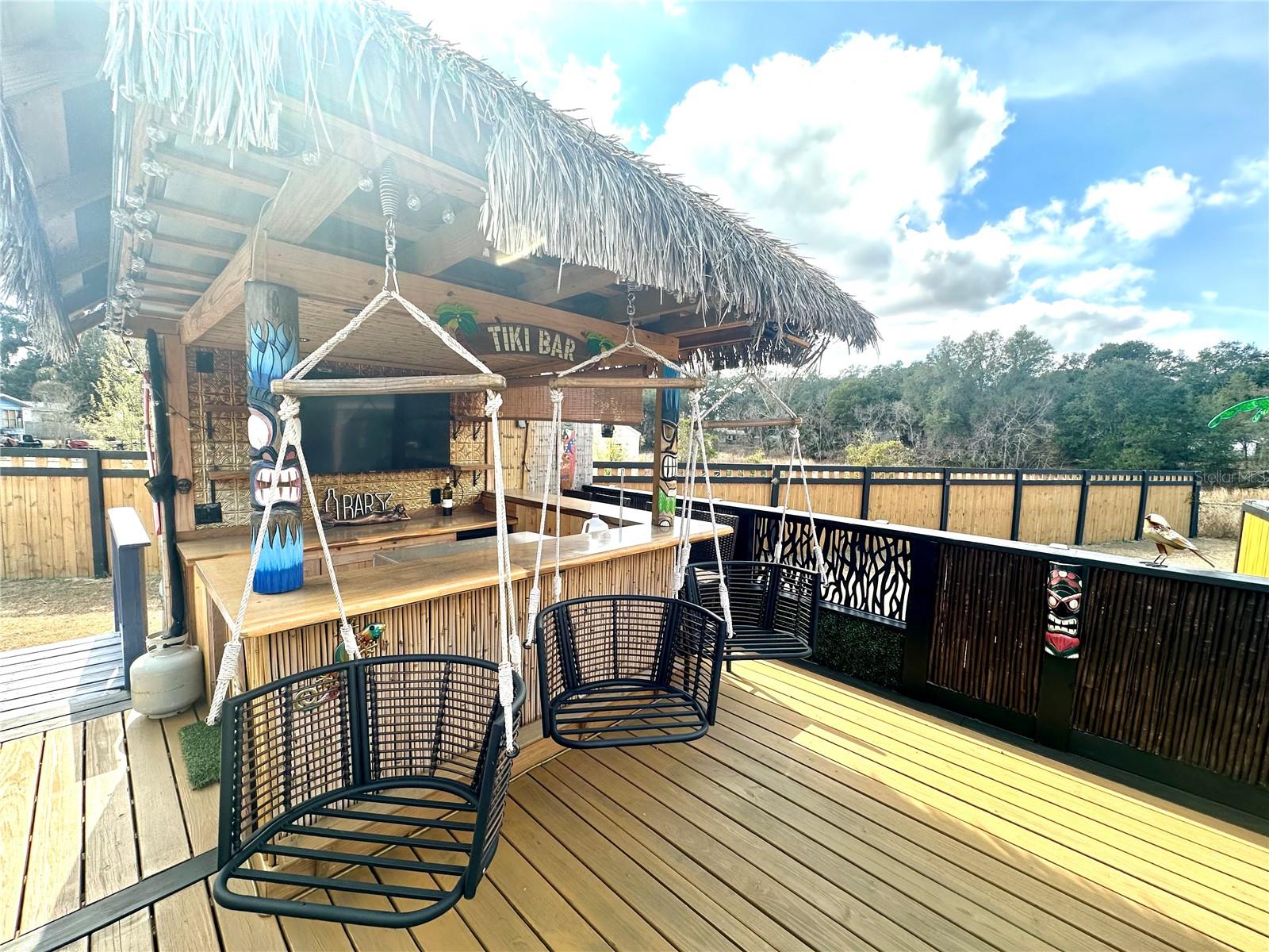 Step into your very own tropical oasis! This backyard is designed for entertaining and unforgettable social gatherings. Enjoy evenings at the custom tiki-bar, and unwind after a long day in the hot tub with swim spa. Inside you will find a spacious layout with seamless flow between the living and entertaining areas. This spacious and well maintained 3-bedroom, 2-bath manufactured home perfectly blends comfort, style, and functionality — all just minutes from everything you need! Situated on a large, level lot, this property immediately welcomes you with a charming covered front porch — the perfect place to enjoy your morning coffee or relax in the evenings. Step inside and you’ll be impressed by the expansive open floorplan featuring two separate living areas, giving you incredible flexibility for entertaining, and additional family space. The heart of the home is the stunning island kitchen, designed with both beauty and practicality in mind. You’ll love the solid surface countertops, abundant cabinetry, and spacious layout that flows seamlessly into the main living area — ideal for hosting gatherings or everyday living. The neutral color palette throughout creates a bright, modern feel, while no carpeting means easy maintenance and a clean, cohesive look. Elegant plantation shutters throughout add charm, privacy, and a timeless touch to every room. The split bedroom layout provides added privacy. The primary suite offers a generous space and natural light leading in to a custom designed ensuite bathroom that will absolutely impress! The iOUTDOOR entertaining space features a Tiki bar that’s ready for weekend cookouts, game-day parties, or evening get-togethers. After entertaining, unwind in the beautiful swim spa and enjoy your own private oasis. This outdoor area truly sets this property apart. For the hobbyist or anyone needing serious storage space, this property is a handyman’s or car collectors dream come true! With a two car garage and additional oversized storage building with fenced yard and ample room to park all your toys — boats, RVs, golf carts, or recreational vehicles — there’s space for it all without restrictions of a HOA. Conveniently located just 2 minutes from The Villages and Stonecrest, Spruce Creek South golf courses, you’ll enjoy easy access to golf, shopping, dining, entertainment, and medical facilities while still having the freedom of your own spacious property. Homes with this combination of location, space, upgrades, and entertaining features are hard to find. Don’t pass this one by — schedule your private showing today!