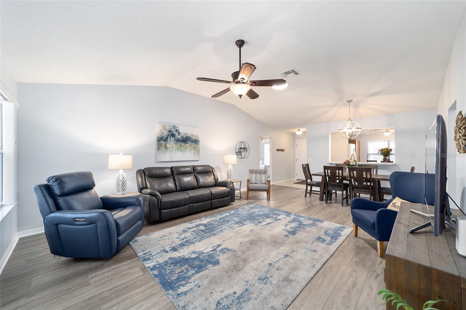 BOND PAID! Welcome home to your beautifully updated Wisteria model — full of warmth, comfort, and thoughtful upgrades. Step through the foyer and you’ll immediately notice the high ceilings, elegant luxury vinyl plank flooring, and abundant natural light streaming through the solar tube and enclosed lanai. The kitchen is bright and inviting, featuring light quartz countertops, ample wooden cabinetry, newer appliances, and space for a cozy breakfast table. Your primary suite offers a large bedroom, a generous walk-in closet, and a spacious en-suite bath with a glass-enclosed shower and double sinks. Sliding doors provide private access to the lanai. Guest bedrooms and the second bath are located on the opposite side of the home, ensuring privacy for both homeowners and guests. Additional highlights include inside laundry, PEX plumbing (2022), roof (2016), HVAC (2009), water heater (2022), and a NOVA water filtration system (2024). Recent updates also feature a new garage door, fresh interior paint (home and garage), new flooring, painted driveway, garage, lanai, and patio, refreshed landscaping, irrigation updates, and a new outdoor shutoff. Many light fixtures have also been replaced, and the solar tube adds additional brightness. The garage easily accommodates a car plus two golf carts stacked. Location is everything! You’re just 1.6 miles to Spanish Springs and 2 miles to Lake Sumter Landing, with Tierra Del Sol Championship Golf Course, restaurant, and theater right at the end of your street. The newly renovated De La Vista Executive Golf Course also reopens nearby in March. The rec center and pool are just four blocks away. Space launches can be seen out our front door! Whether you’re seeking a forever home, an investment property, or a seasonal retreat, this residence truly checks every box. Non-Ad Valorem Assessments are $774.86