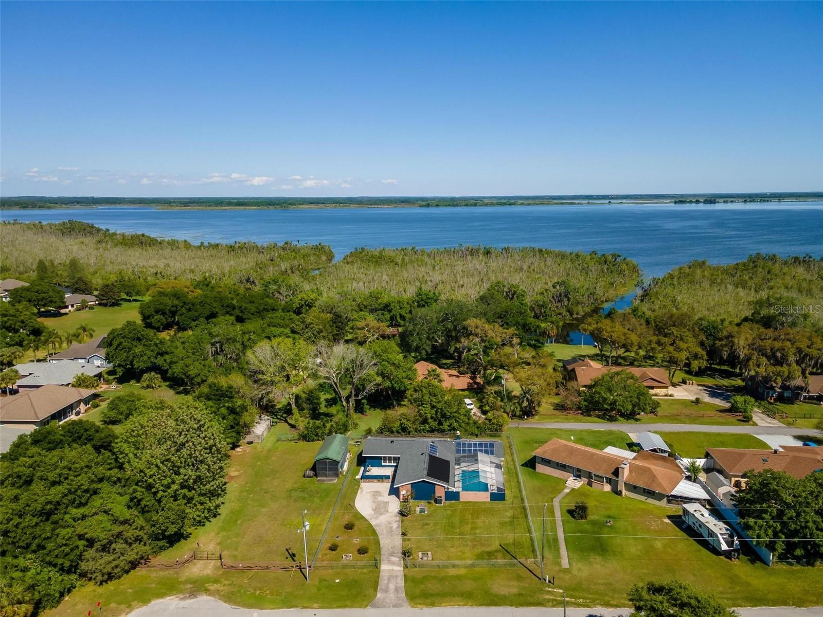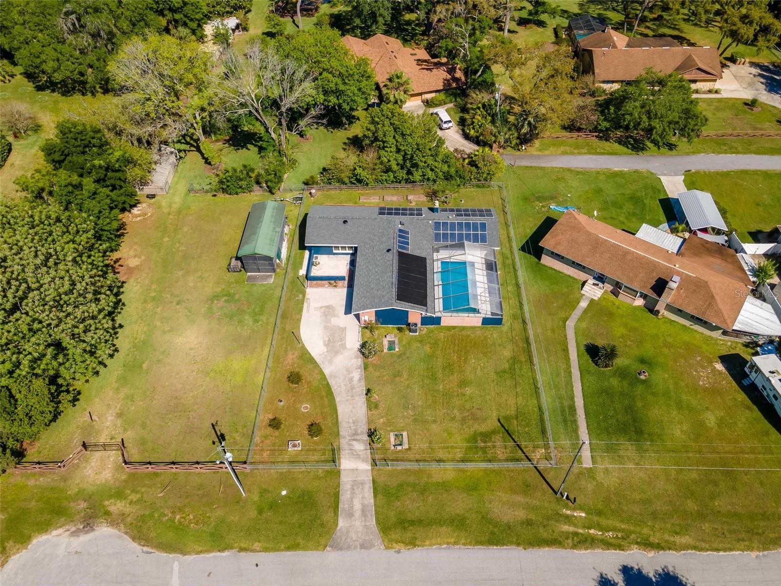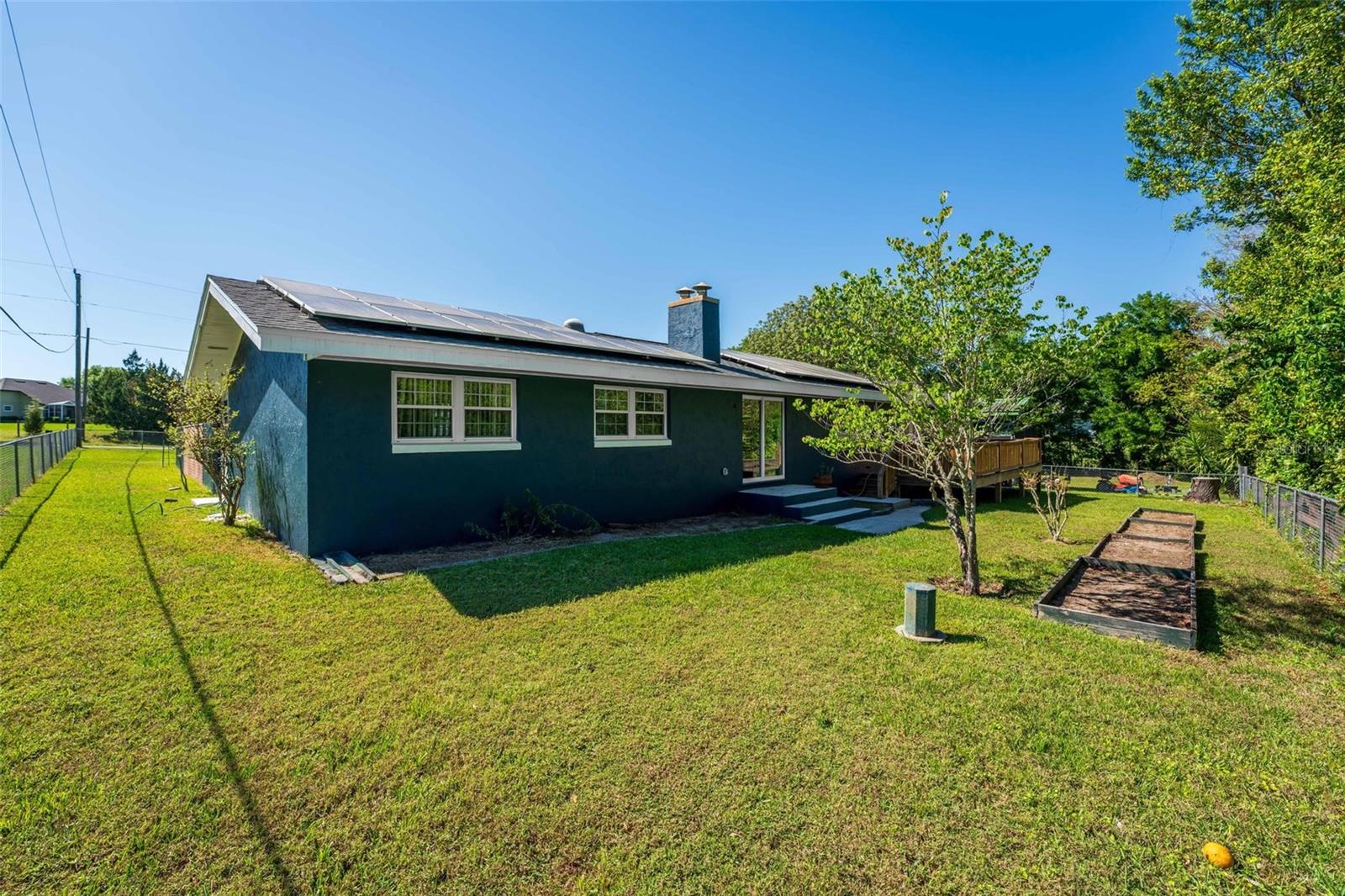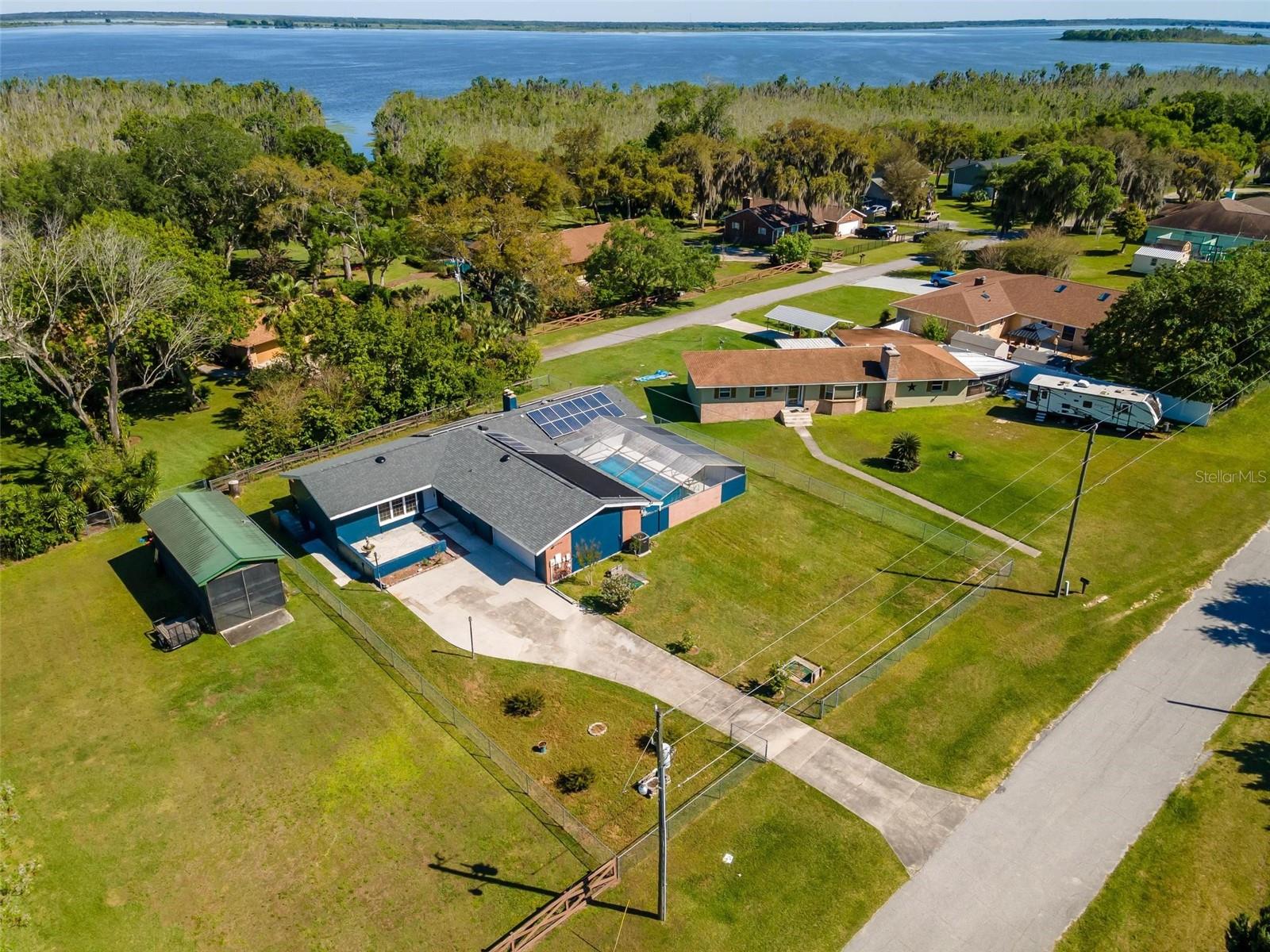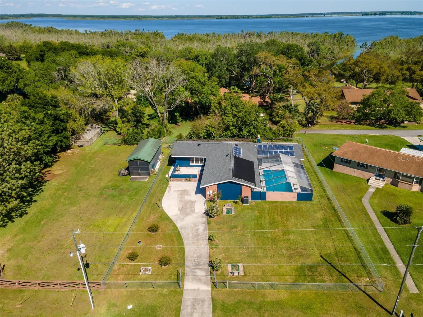 Charming 3 Bedroom 2 Bath Pool Home in Lady Lake. This property features a NEW ROOF in 2024 with 42 solar panels, New LVP flooring, PRICE REDUCTION! Updated sliding doors and windows, Huge Pool with New liner 2024, fresh paint inside and outside, plus a private community boat ramp just down the road. The property is a completely fenced in on the ~1/3 acre lot. The main area of the house spans ~2000 sf with a nice primary bedroom wing complete with direct access to the pool deck, it's own 2 sink bathroom, and a full size laundry room with sink and cabinets. The other 2 bedrooms share a hallway bathroom with the hall bathroom. The kitchen features granite, a built in oven in addition to your range for plenty of cooking options, opens to the family room which holds your stone face fireplace, and has access to the pool in the front and the deck in the back. Behind the kitchen is the dining area and then your large bonus living area. Downstairs you will find the unfinished basement complete with sump pump. Behind the house there is a lovely deck area for lounging running almost 2/3 of the length of the house.