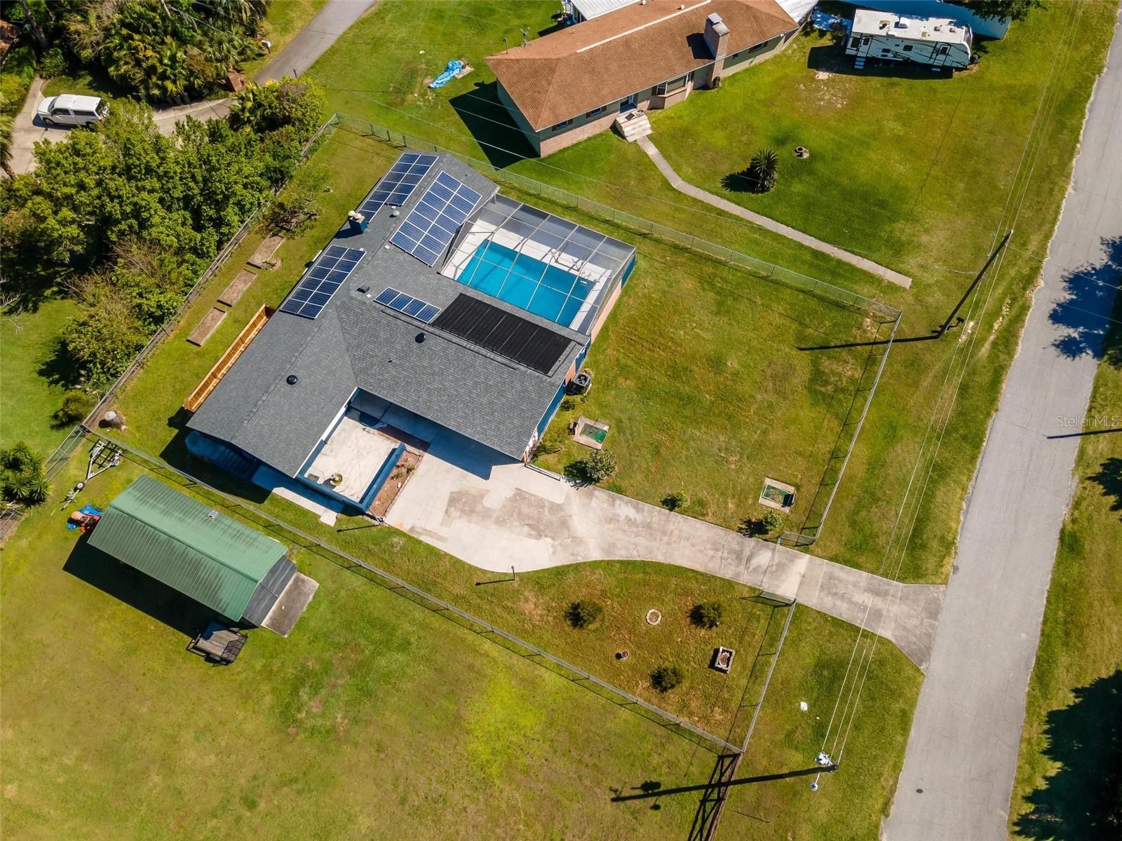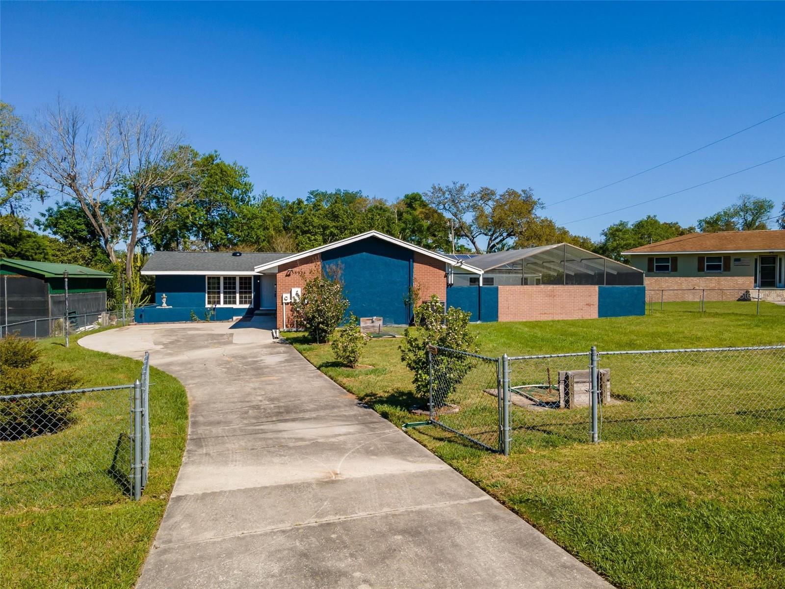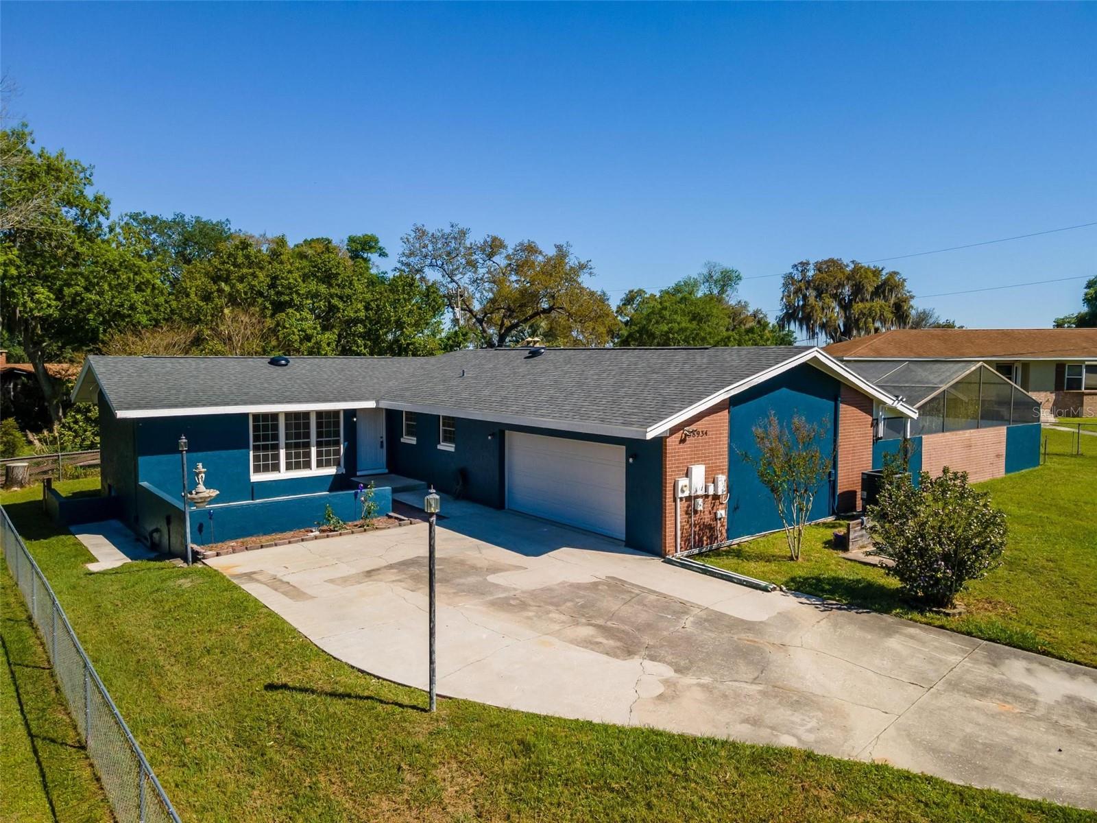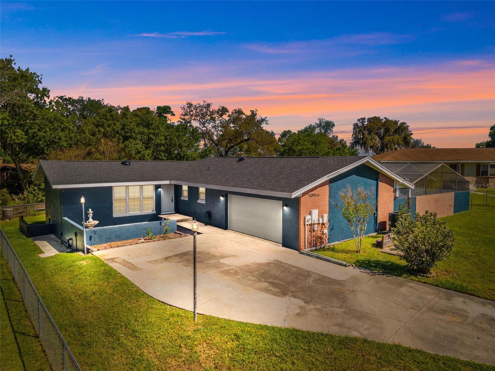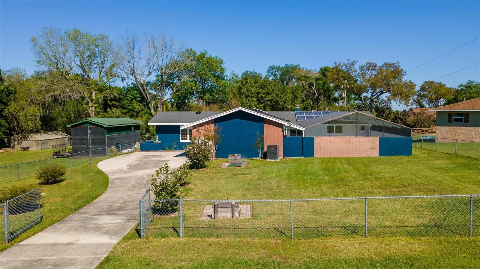 Charming 3 Bedroom 2 Bath Pool Home in Lady Lake. This property features a NEW ROOF in 2024 with 42 solar panels, New LVP flooring, PRICE REDUCTION! Updated sliding doors and windows, Huge Pool with New liner 2024, fresh paint inside and outside, plus a private community boat ramp just down the road. The property is a completely fenced in on the ~1/3 acre lot. The main area of the house spans ~2000 sf with a nice primary bedroom wing complete with direct access to the pool deck, it's own 2 sink bathroom, and a full size laundry room with sink and cabinets. The other 2 bedrooms share a hallway bathroom with the hall bathroom. The kitchen features granite, a built in oven in addition to your range for plenty of cooking options, opens to the family room which holds your stone face fireplace, and has access to the pool in the front and the deck in the back. Behind the kitchen is the dining area and then your large bonus living area. Downstairs you will find the unfinished basement complete with sump pump. Behind the house there is a lovely deck area for lounging running almost 2/3 of the length of the house.