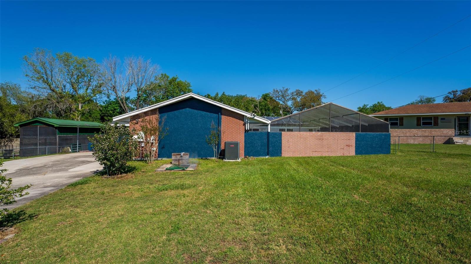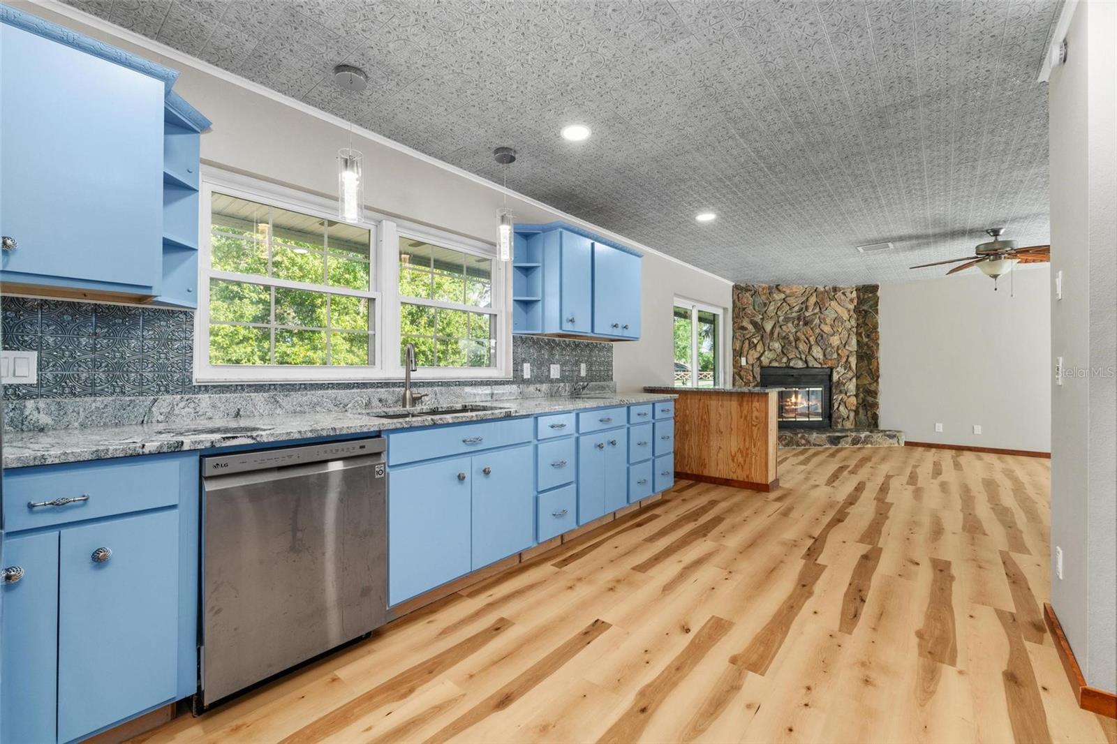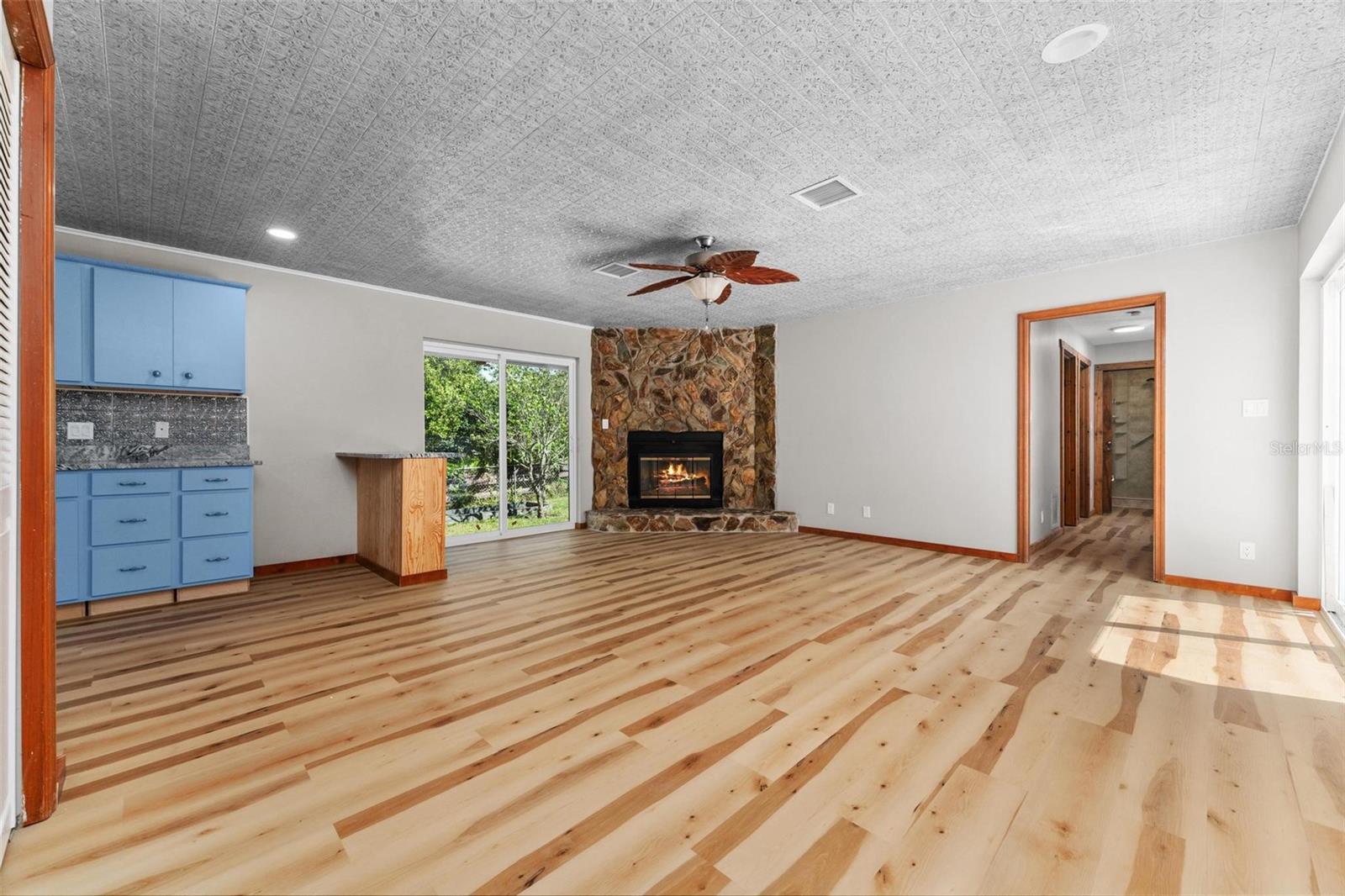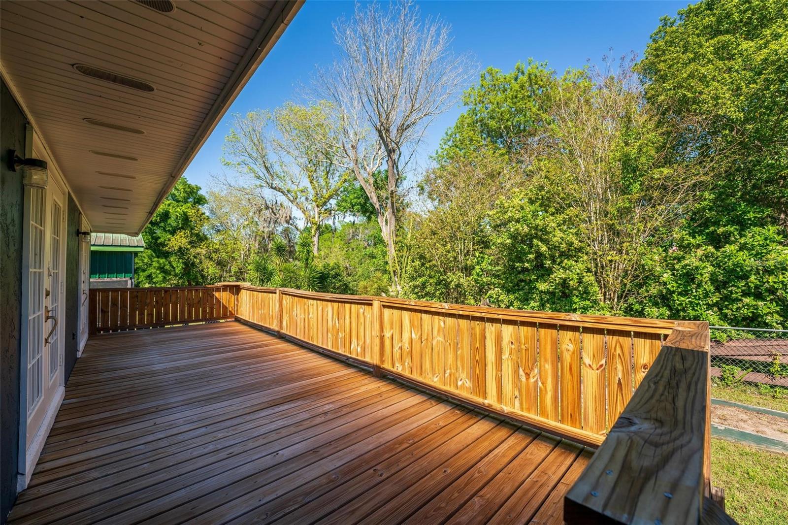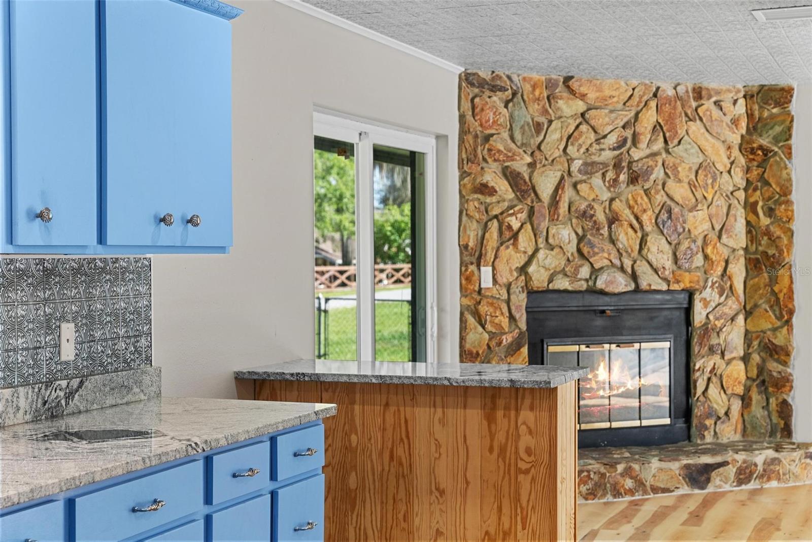 Charming 3 Bedroom 2 Bath Pool Home in Lady Lake. This property features a NEW ROOF in 2024 with 42 solar panels, New LVP flooring, PRICE REDUCTION! Updated sliding doors and windows, Huge Pool with New liner 2024, fresh paint inside and outside, plus a private community boat ramp just down the road. The property is a completely fenced in on the ~1/3 acre lot. The main area of the house spans ~2000 sf with a nice primary bedroom wing complete with direct access to the pool deck, it's own 2 sink bathroom, and a full size laundry room with sink and cabinets. The other 2 bedrooms share a hallway bathroom with the hall bathroom. The kitchen features granite, a built in oven in addition to your range for plenty of cooking options, opens to the family room which holds your stone face fireplace, and has access to the pool in the front and the deck in the back. Behind the kitchen is the dining area and then your large bonus living area. Downstairs you will find the unfinished basement complete with sump pump. Behind the house there is a lovely deck area for lounging running almost 2/3 of the length of the house.