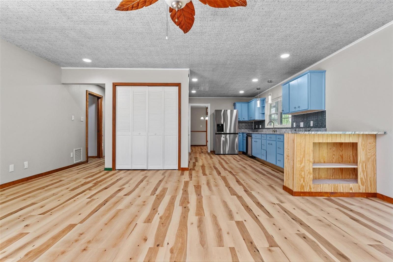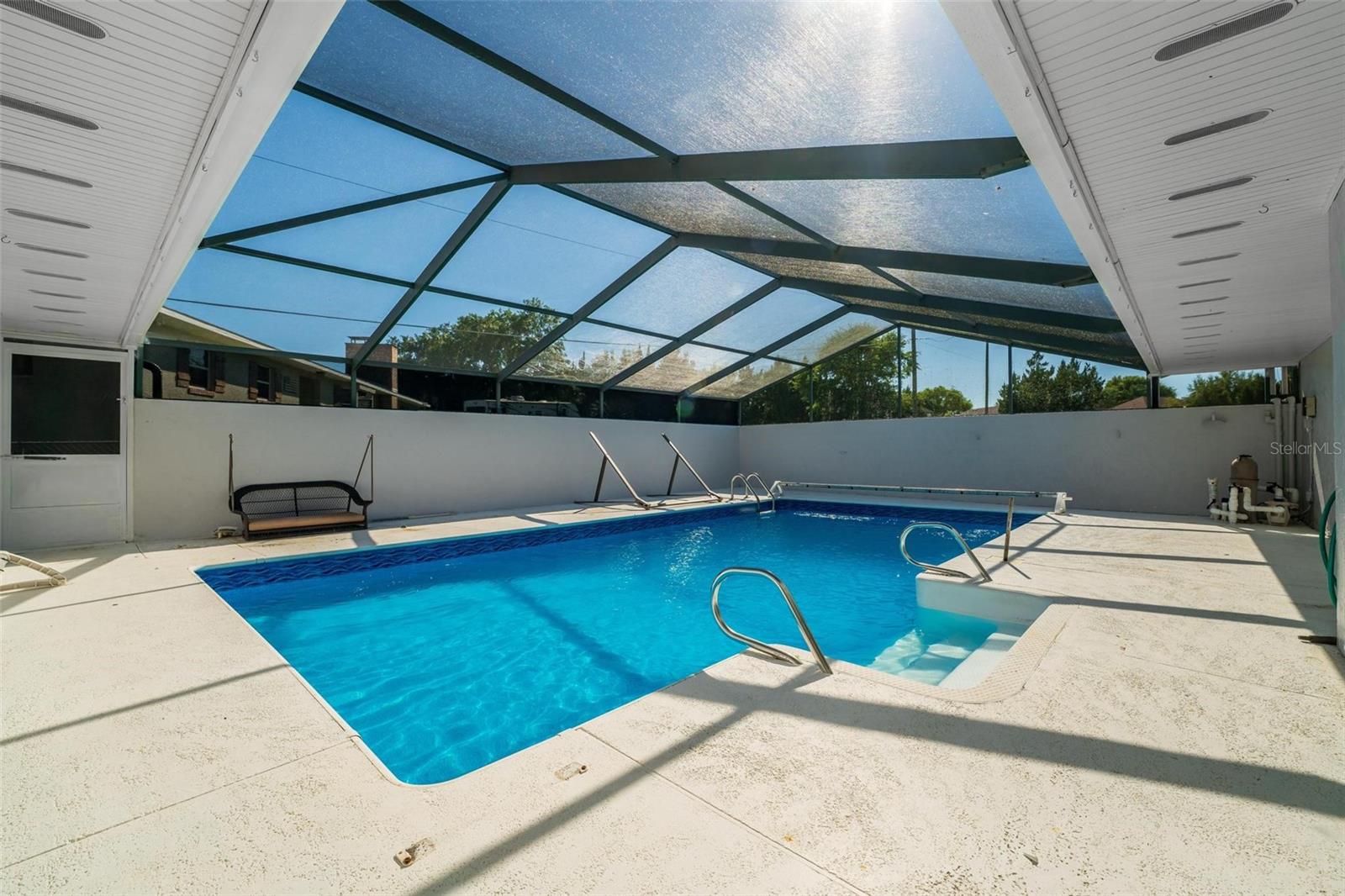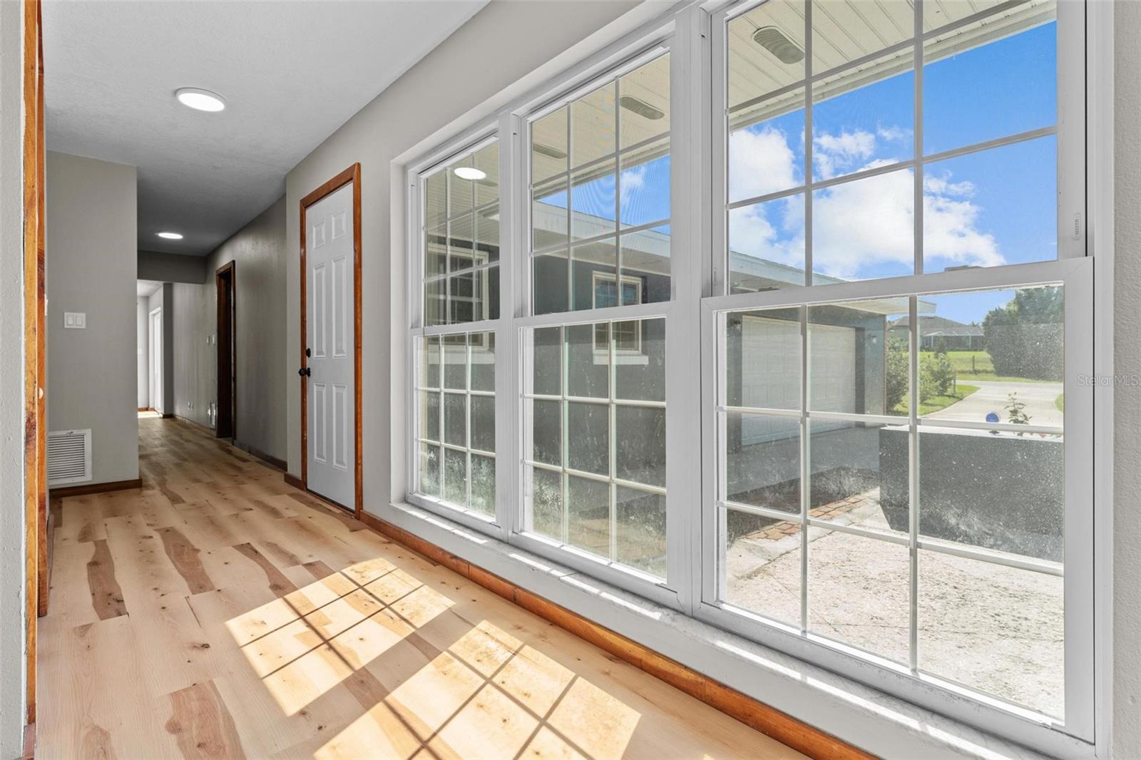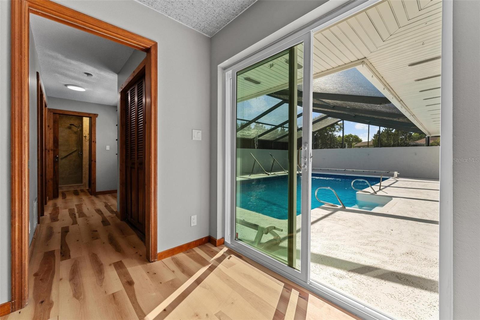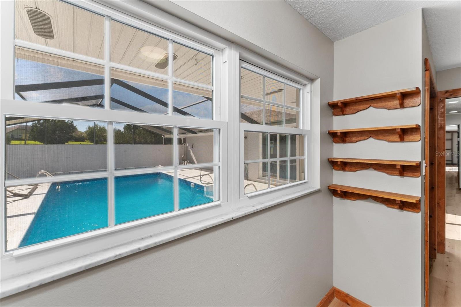 Charming 3 Bedroom 2 Bath Pool Home in Lady Lake. This property features a NEW ROOF in 2024 with 42 solar panels, New LVP flooring, PRICE REDUCTION! Updated sliding doors and windows, Huge Pool with New liner 2024, fresh paint inside and outside, plus a private community boat ramp just down the road. The property is a completely fenced in on the ~1/3 acre lot. The main area of the house spans ~2000 sf with a nice primary bedroom wing complete with direct access to the pool deck, it's own 2 sink bathroom, and a full size laundry room with sink and cabinets. The other 2 bedrooms share a hallway bathroom with the hall bathroom. The kitchen features granite, a built in oven in addition to your range for plenty of cooking options, opens to the family room which holds your stone face fireplace, and has access to the pool in the front and the deck in the back. Behind the kitchen is the dining area and then your large bonus living area. Downstairs you will find the unfinished basement complete with sump pump. Behind the house there is a lovely deck area for lounging running almost 2/3 of the length of the house.