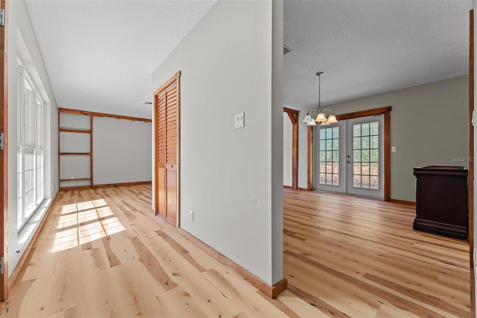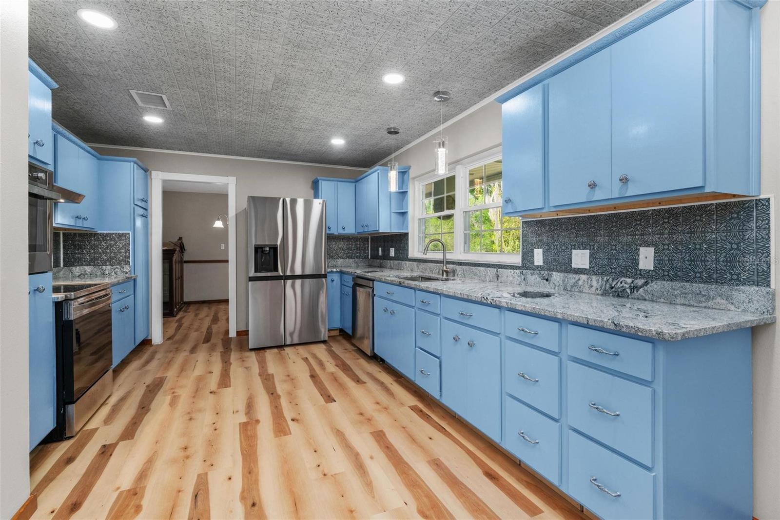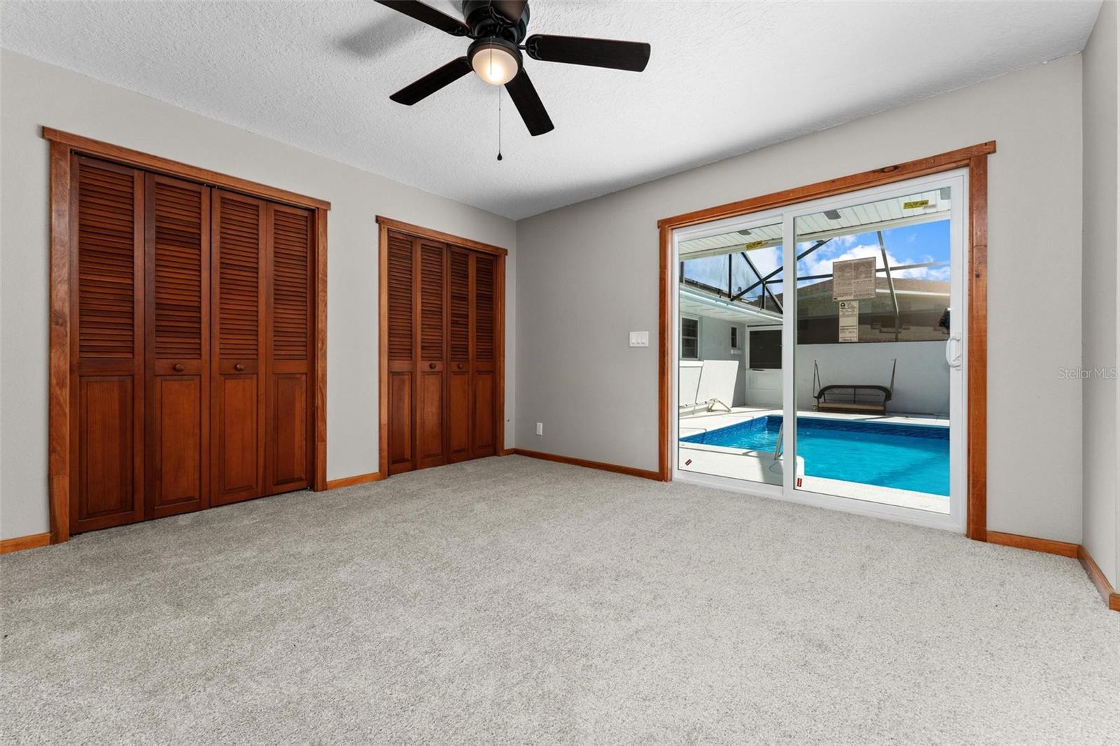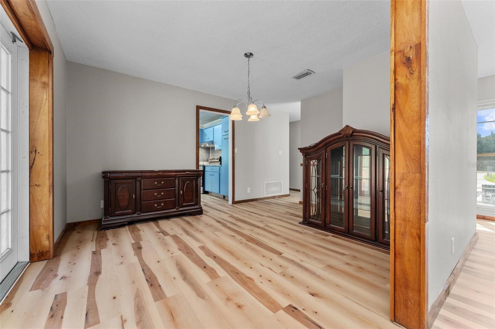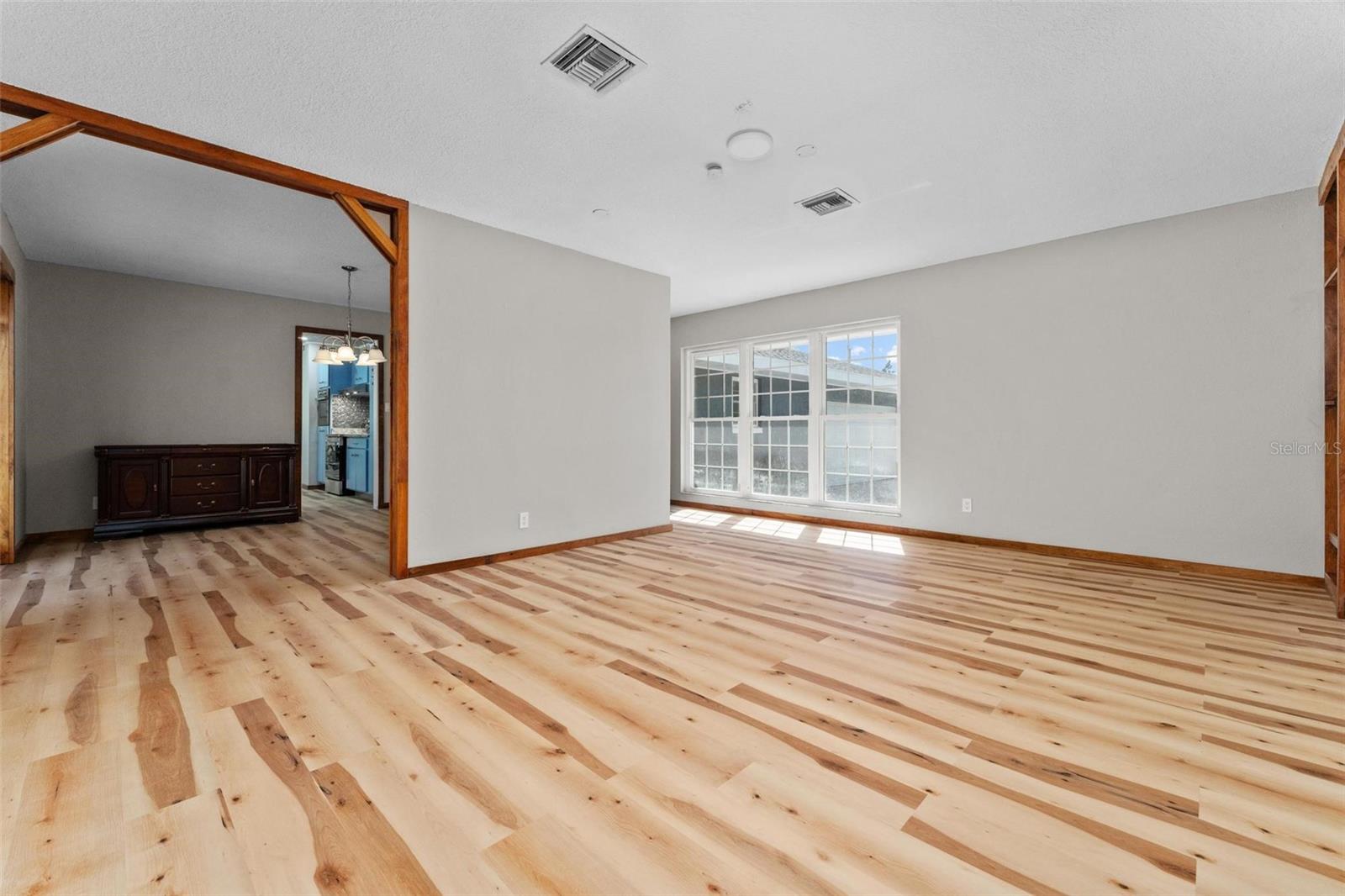 Charming 3 Bedroom 2 Bath Pool Home in Lady Lake. This property features a NEW ROOF in 2024 with 42 solar panels, New LVP flooring, PRICE REDUCTION! Updated sliding doors and windows, Huge Pool with New liner 2024, fresh paint inside and outside, plus a private community boat ramp just down the road. The property is a completely fenced in on the ~1/3 acre lot. The main area of the house spans ~2000 sf with a nice primary bedroom wing complete with direct access to the pool deck, it's own 2 sink bathroom, and a full size laundry room with sink and cabinets. The other 2 bedrooms share a hallway bathroom with the hall bathroom. The kitchen features granite, a built in oven in addition to your range for plenty of cooking options, opens to the family room which holds your stone face fireplace, and has access to the pool in the front and the deck in the back. Behind the kitchen is the dining area and then your large bonus living area. Downstairs you will find the unfinished basement complete with sump pump. Behind the house there is a lovely deck area for lounging running almost 2/3 of the length of the house.