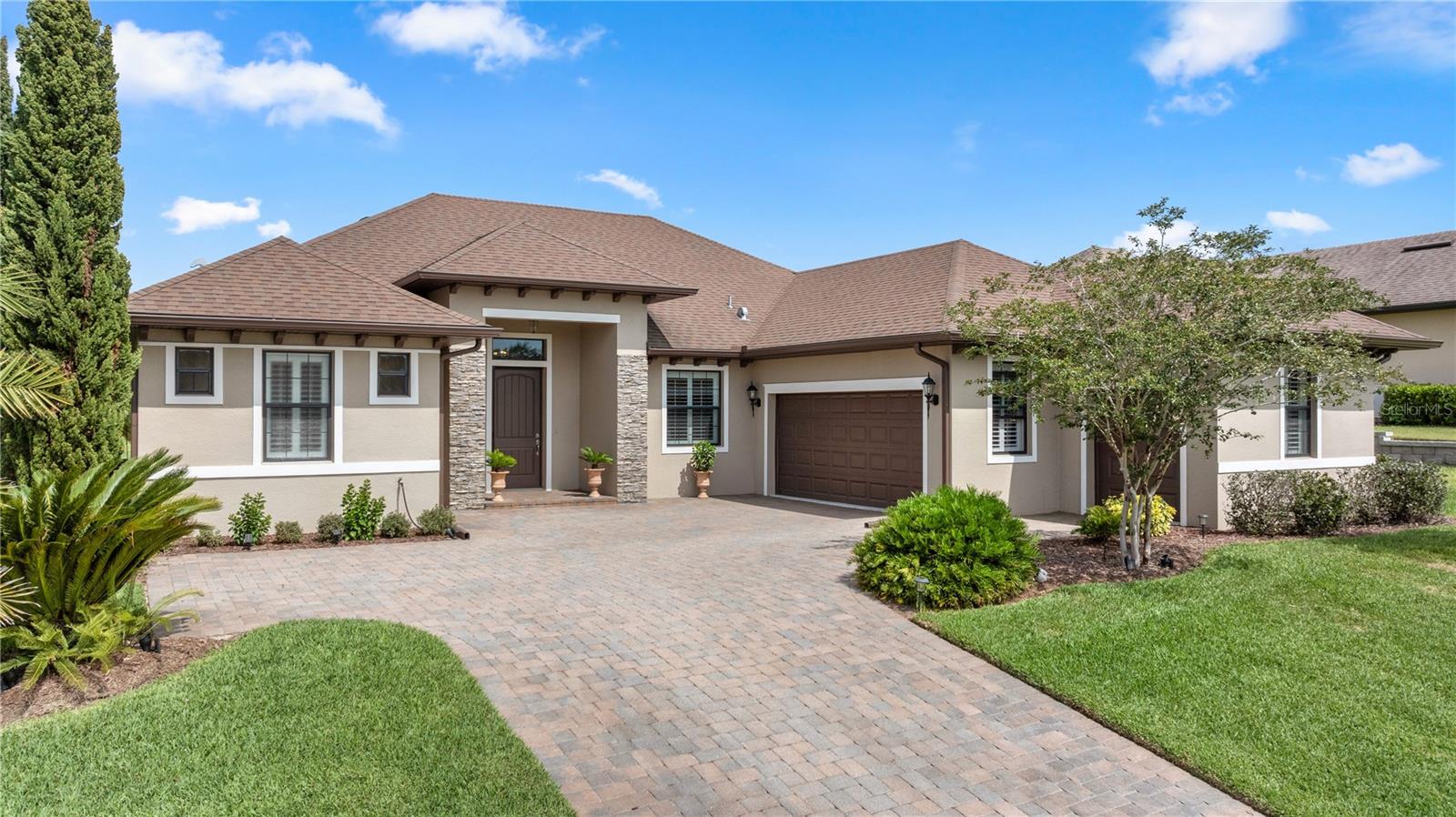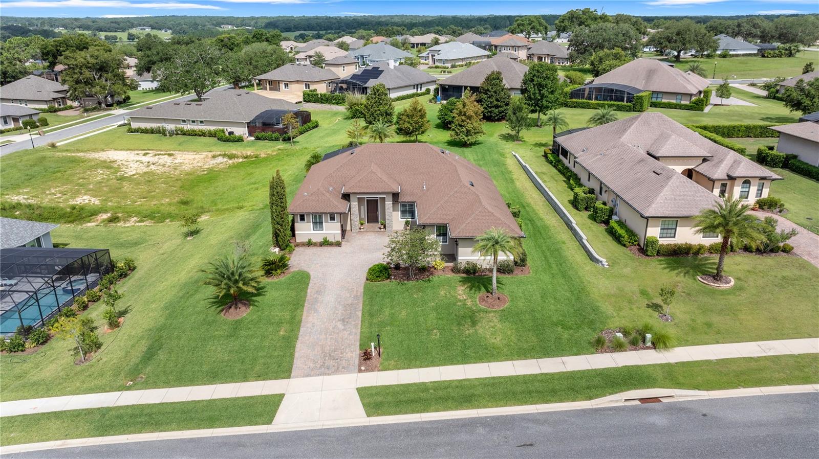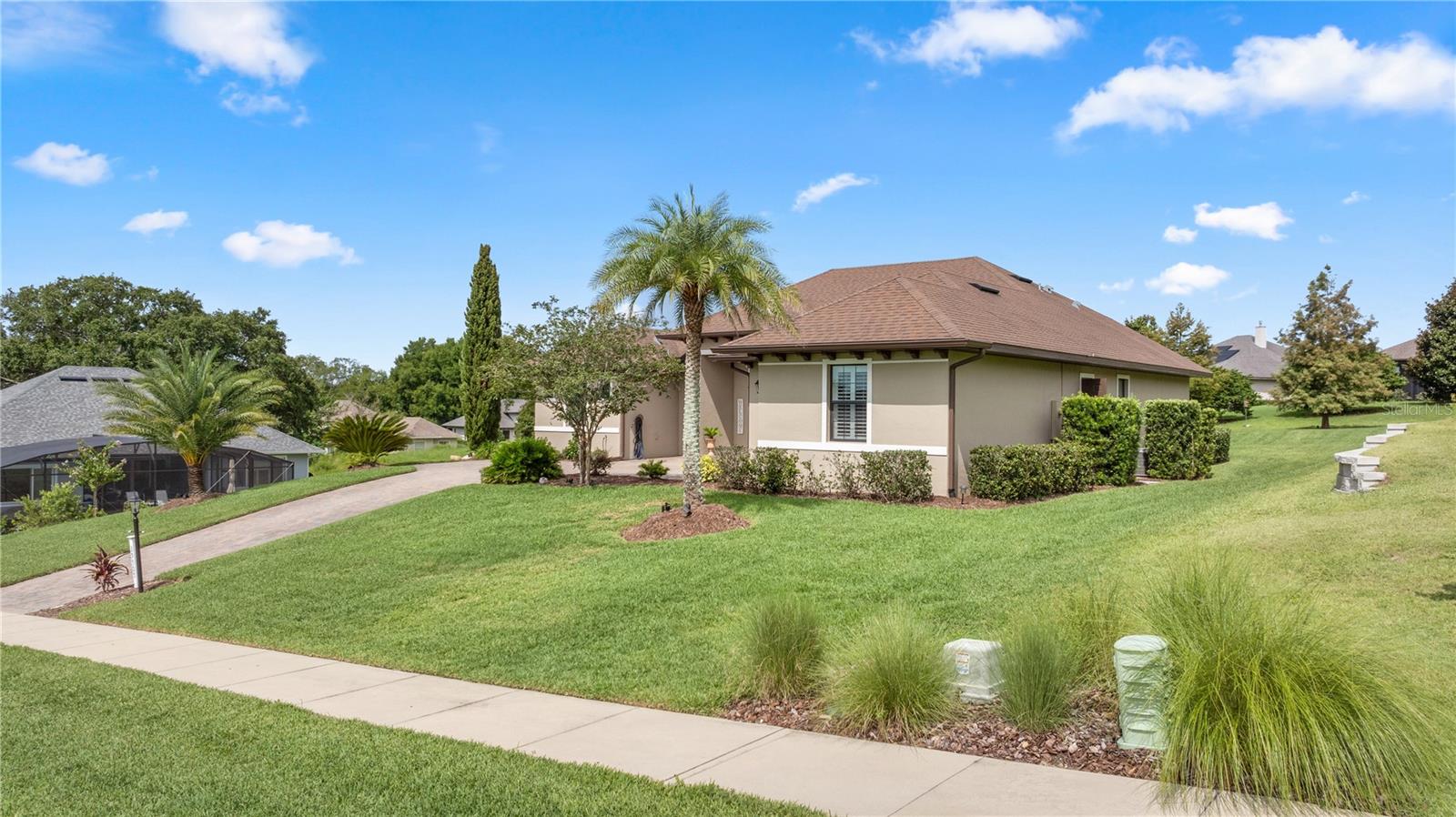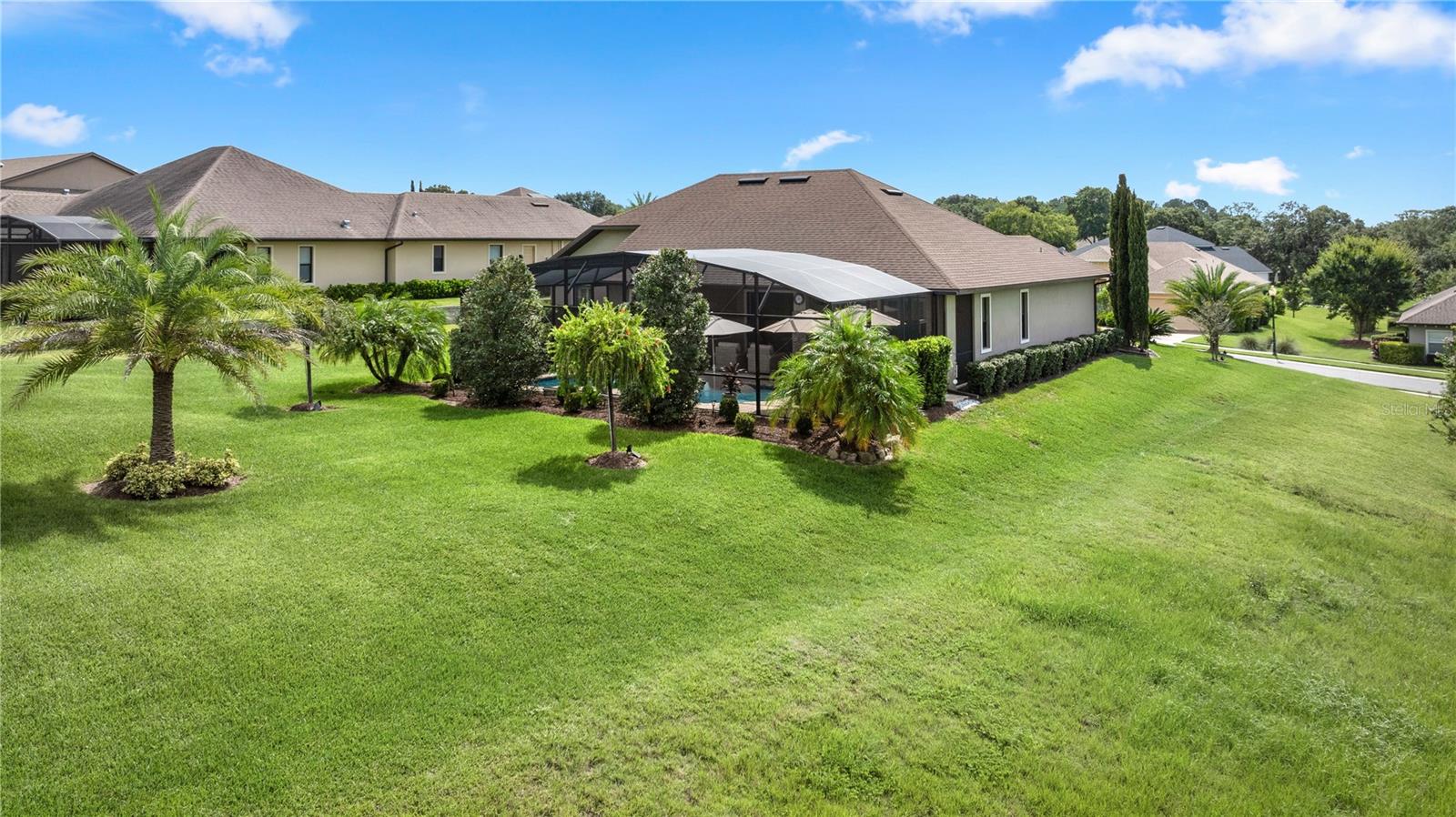 WELCOME HOME! this stunning custom SAGO model home is nestled on an expansive elevated lot offering glimpses of Lake Griffin. This pristine home welcomes you with a paver driveway that leads to a side-entry garage featuring a golf cart bay and a grand front entrance. Step into the foyer and be greeted by views of the stunning pool with a waterfall and a charming outdoor living area, accessible through triple glass sliders. Adjacent to the foyer is a versatile space ideal for a home office or den. The kitchen is a culinary delight, showcasing stainless steel appliances, a spacious island with seating for four, elegant pendant lighting, 42-inch wood cabinets, granite countertops, and a walk-in pantry, all flowing seamlessly into the open living area. The master suite, located away from the guest bedrooms, offers a spa-like retreat with double vanities, a glass-enclosed walk-in shower, a relaxing soaking tub, and two walk-in closets, one of which provides attic access. This thoughtfully designed split floor plan ensures privacy for both you and your guests and includes a convenient indoor laundry room. Additional features of this meticulously maintained home include 30-year architectural shingles, extra insulation, recessed lighting, a mix of 18x18 ceramic tile and carpeting, rocker switches, solid surface window sills, and plantation shutters. The garage is equipped with pull-down stairs leading to a stand-up storage area. The expansive lot is beautifully landscaped and features a 7 zone irrigation system. The community is just 10 minutes from The Villages and is close to medical facilities, shopping, and dining. Located in the highly sought after HARBOR HILLS, this gated community offers a range of amenities including a country club, restaurant, golf, tennis, fitness center, clubs, swimming, and boating. The spectacular views of Lake Griffin from the community are a must-see! Schedule a private showing today!