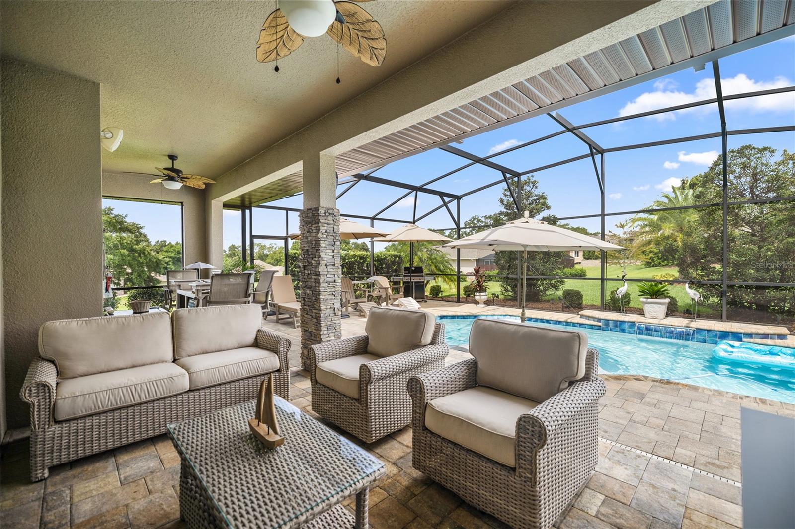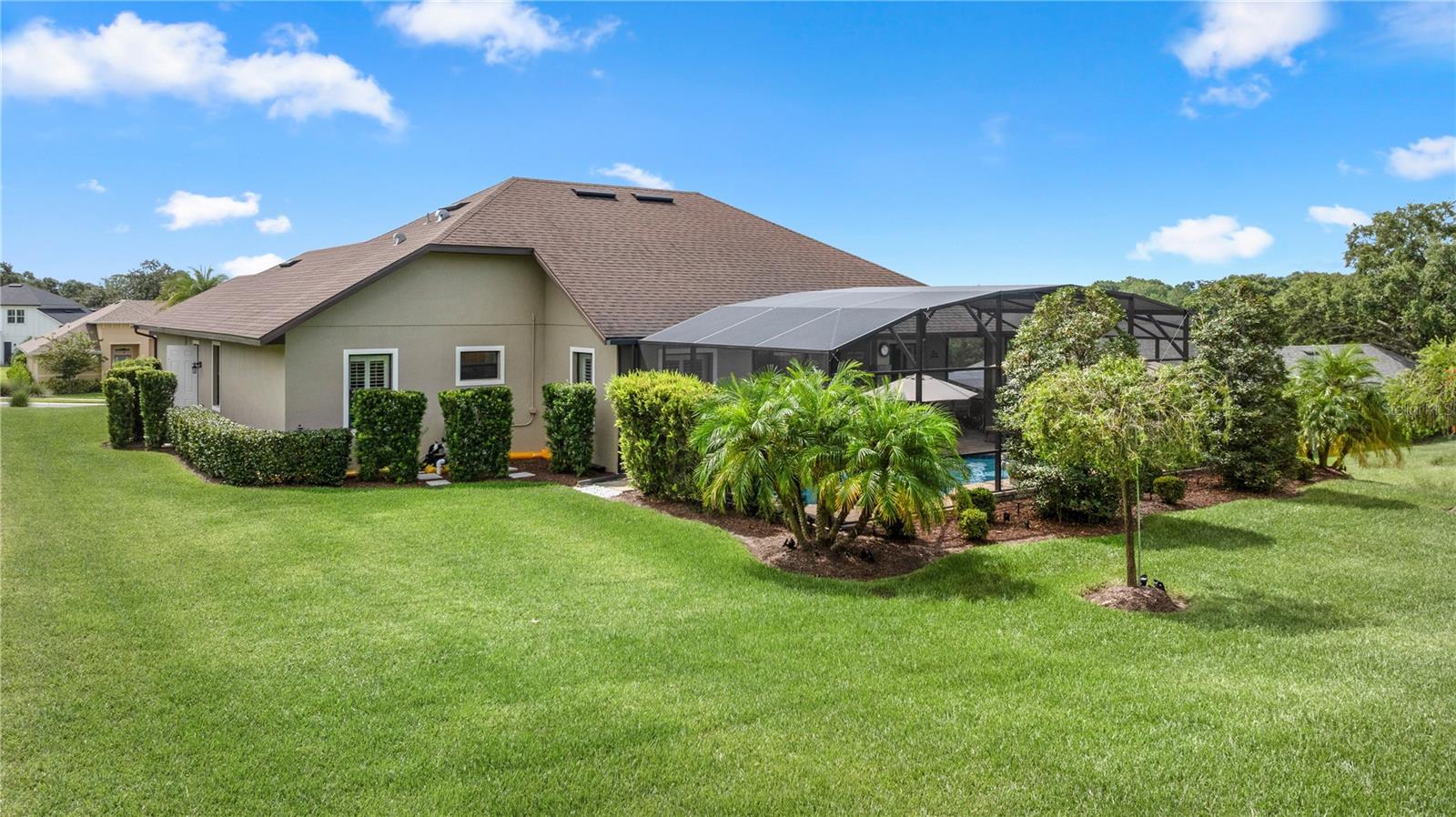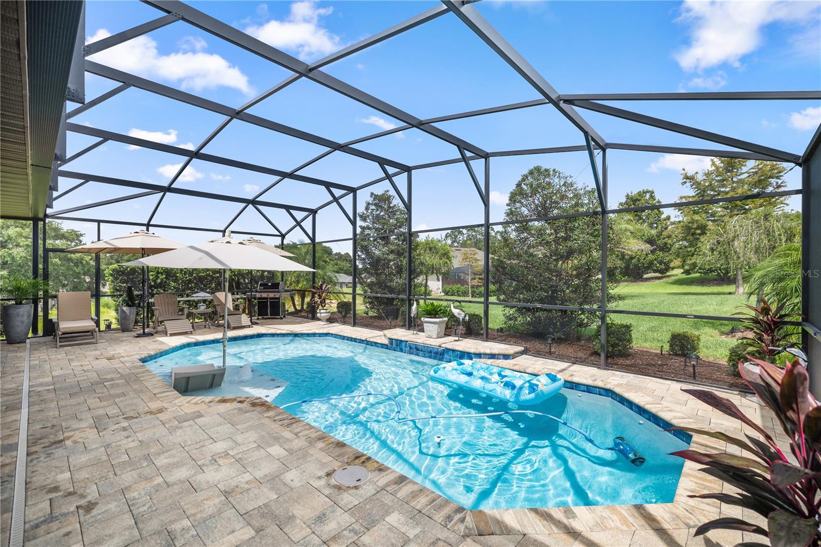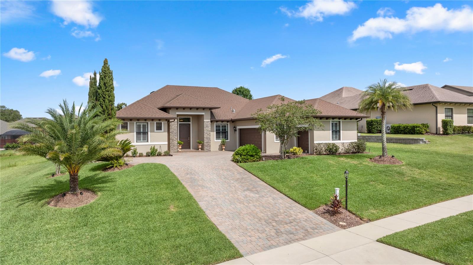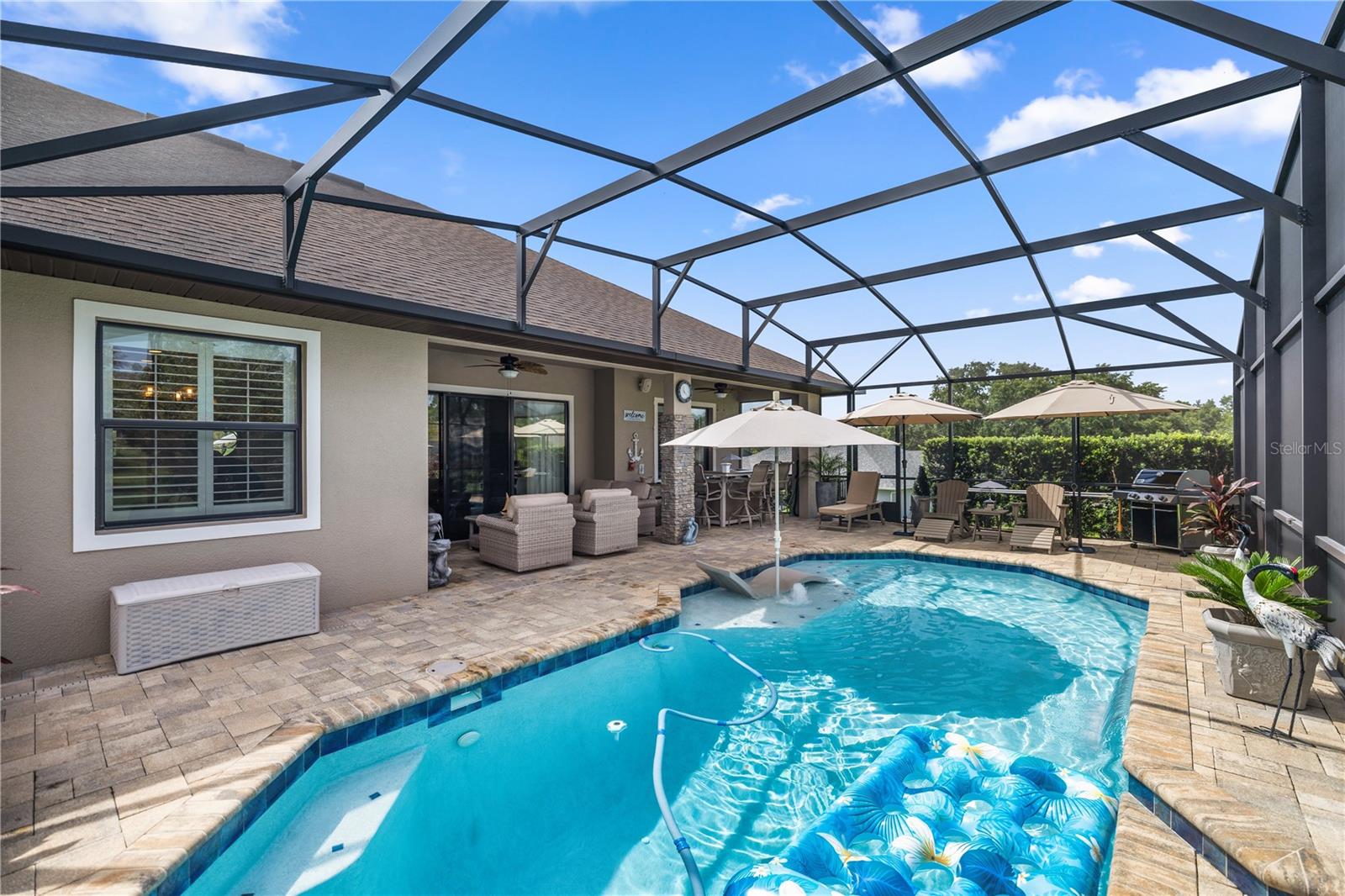 WELCOME HOME! this stunning custom SAGO model home is nestled on an expansive elevated lot offering glimpses of Lake Griffin. This pristine home welcomes you with a paver driveway that leads to a side-entry garage featuring a golf cart bay and a grand front entrance. Step into the foyer and be greeted by views of the stunning pool with a waterfall and a charming outdoor living area, accessible through triple glass sliders. Adjacent to the foyer is a versatile space ideal for a home office or den. The kitchen is a culinary delight, showcasing stainless steel appliances, a spacious island with seating for four, elegant pendant lighting, 42-inch wood cabinets, granite countertops, and a walk-in pantry, all flowing seamlessly into the open living area. The master suite, located away from the guest bedrooms, offers a spa-like retreat with double vanities, a glass-enclosed walk-in shower, a relaxing soaking tub, and two walk-in closets, one of which provides attic access. This thoughtfully designed split floor plan ensures privacy for both you and your guests and includes a convenient indoor laundry room. Additional features of this meticulously maintained home include 30-year architectural shingles, extra insulation, recessed lighting, a mix of 18x18 ceramic tile and carpeting, rocker switches, solid surface window sills, and plantation shutters. The garage is equipped with pull-down stairs leading to a stand-up storage area. The expansive lot is beautifully landscaped and features a 7 zone irrigation system. The community is just 10 minutes from The Villages and is close to medical facilities, shopping, and dining. Located in the highly sought after HARBOR HILLS, this gated community offers a range of amenities including a country club, restaurant, golf, tennis, fitness center, clubs, swimming, and boating. The spectacular views of Lake Griffin from the community are a must-see! Schedule a private showing today!