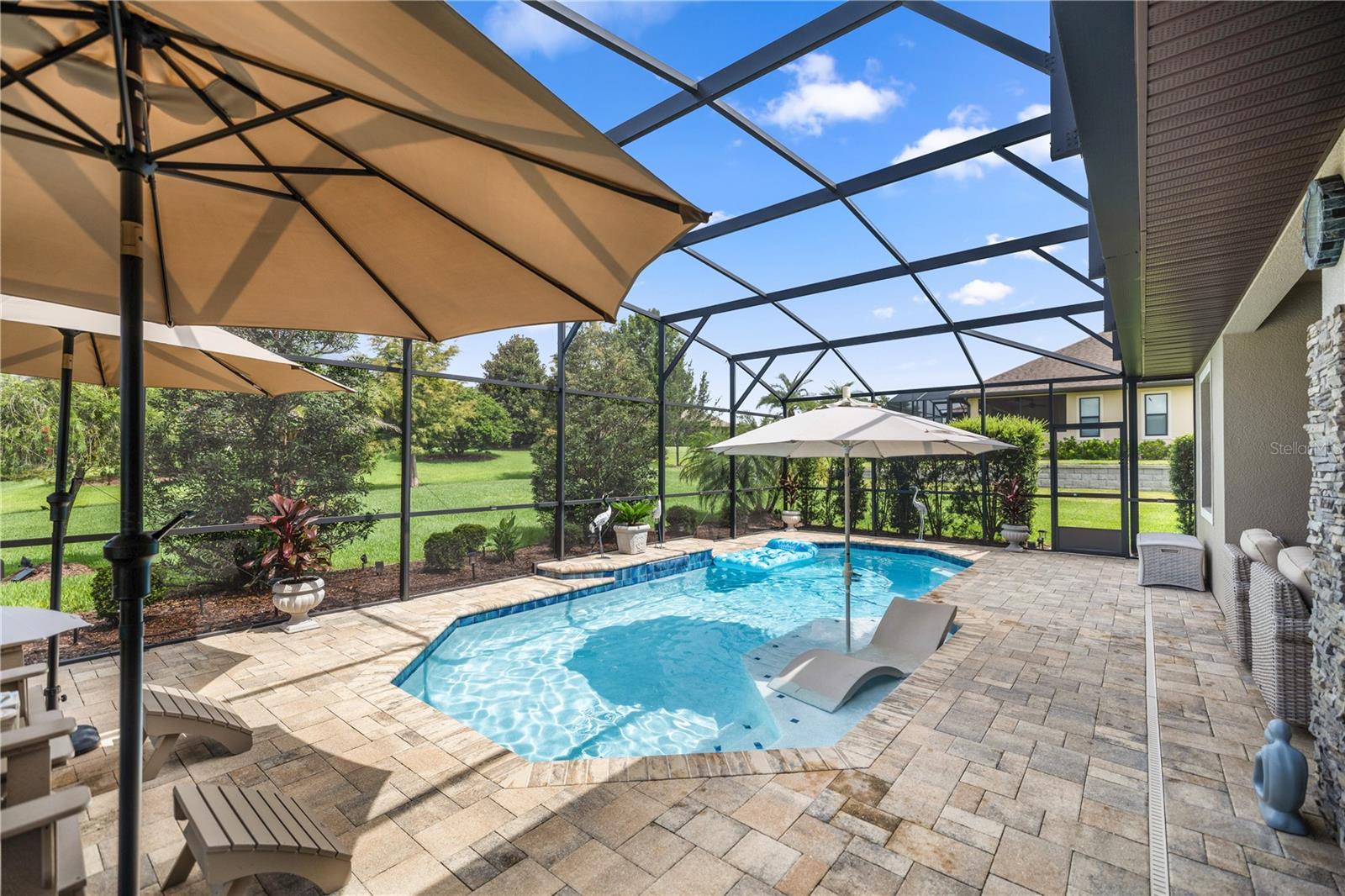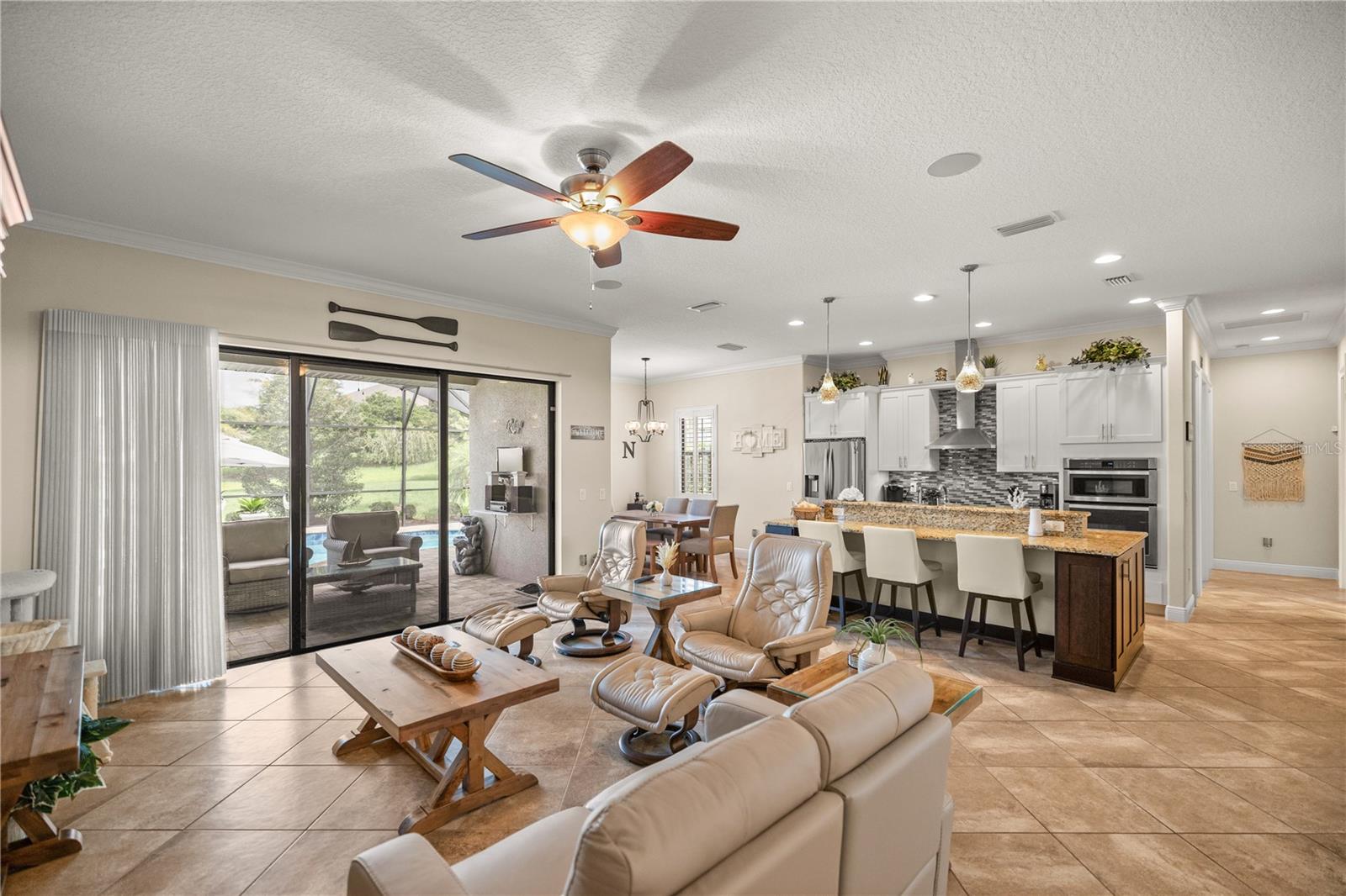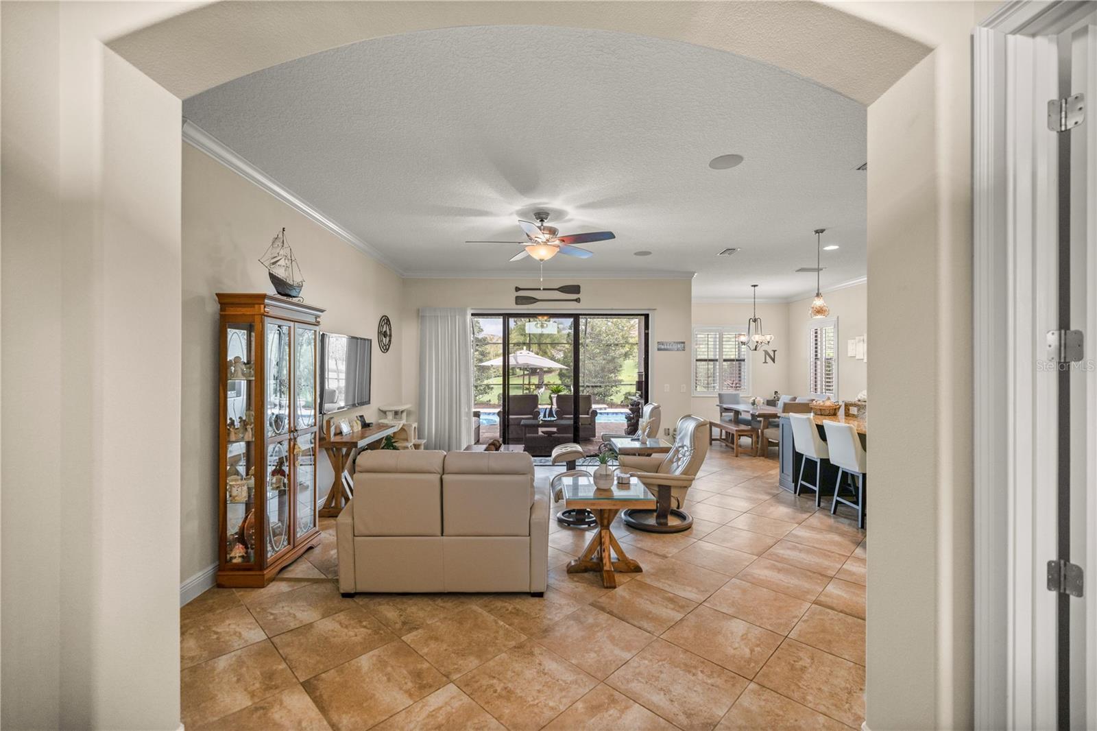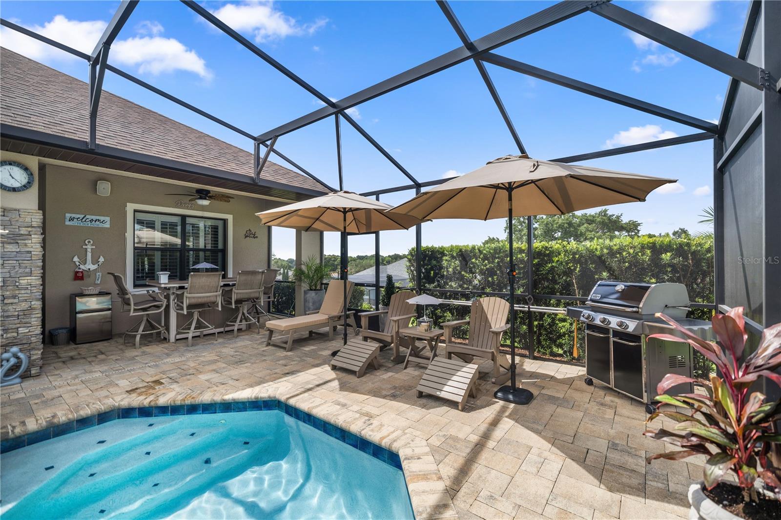 WELCOME HOME! this stunning custom SAGO model home is nestled on an expansive elevated lot offering glimpses of Lake Griffin. This pristine home welcomes you with a paver driveway that leads to a side-entry garage featuring a golf cart bay and a grand front entrance. Step into the foyer and be greeted by views of the stunning pool with a waterfall and a charming outdoor living area, accessible through triple glass sliders. Adjacent to the foyer is a versatile space ideal for a home office or den. The kitchen is a culinary delight, showcasing stainless steel appliances, a spacious island with seating for four, elegant pendant lighting, 42-inch wood cabinets, granite countertops, and a walk-in pantry, all flowing seamlessly into the open living area. The master suite, located away from the guest bedrooms, offers a spa-like retreat with double vanities, a glass-enclosed walk-in shower, a relaxing soaking tub, and two walk-in closets, one of which provides attic access. This thoughtfully designed split floor plan ensures privacy for both you and your guests and includes a convenient indoor laundry room. Additional features of this meticulously maintained home include 30-year architectural shingles, extra insulation, recessed lighting, a mix of 18x18 ceramic tile and carpeting, rocker switches, solid surface window sills, and plantation shutters. The garage is equipped with pull-down stairs leading to a stand-up storage area. The expansive lot is beautifully landscaped and features a 7 zone irrigation system. The community is just 10 minutes from The Villages and is close to medical facilities, shopping, and dining. Located in the highly sought after HARBOR HILLS, this gated community offers a range of amenities including a country club, restaurant, golf, tennis, fitness center, clubs, swimming, and boating. The spectacular views of Lake Griffin from the community are a must-see! Schedule a private showing today!
