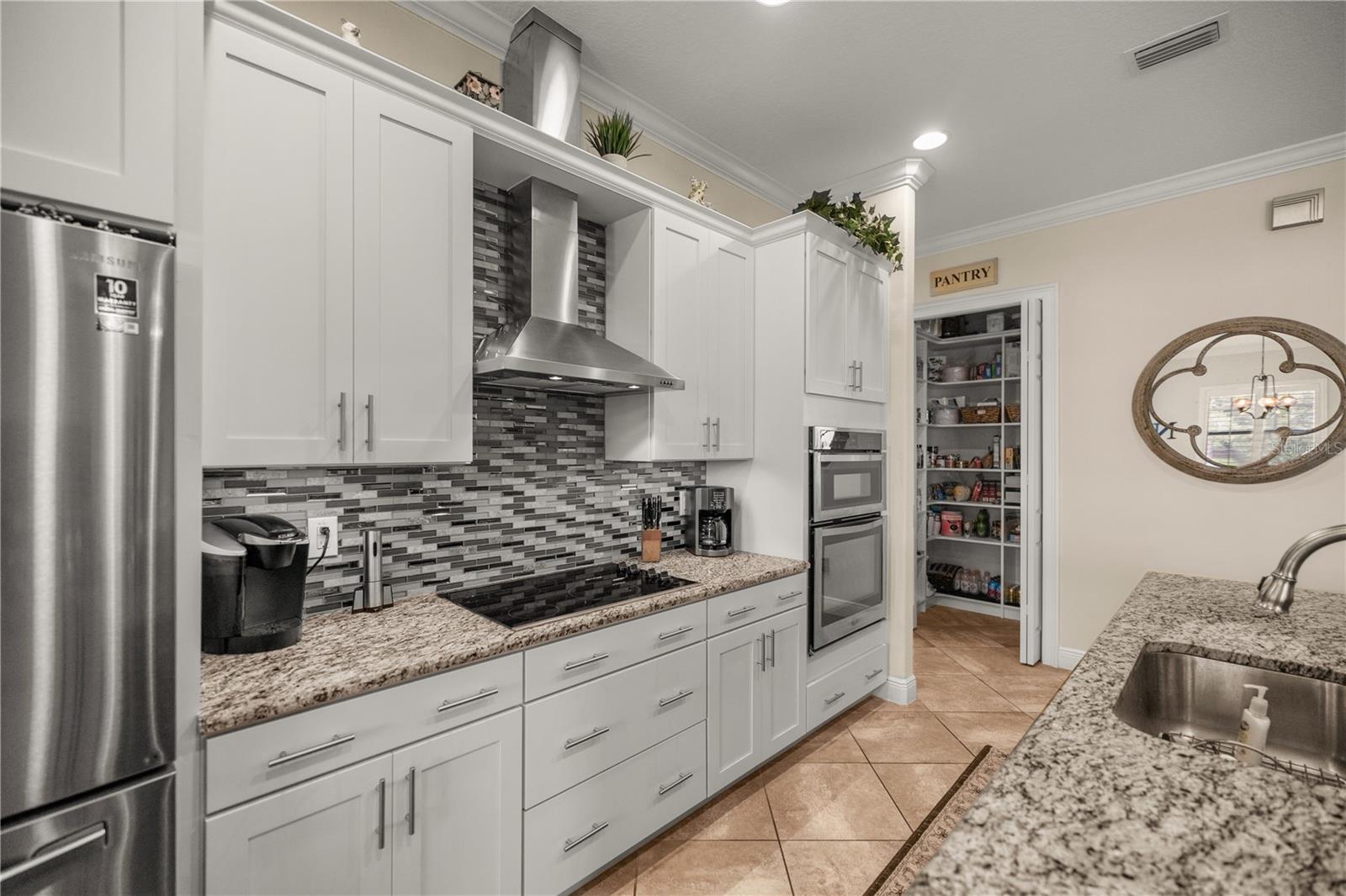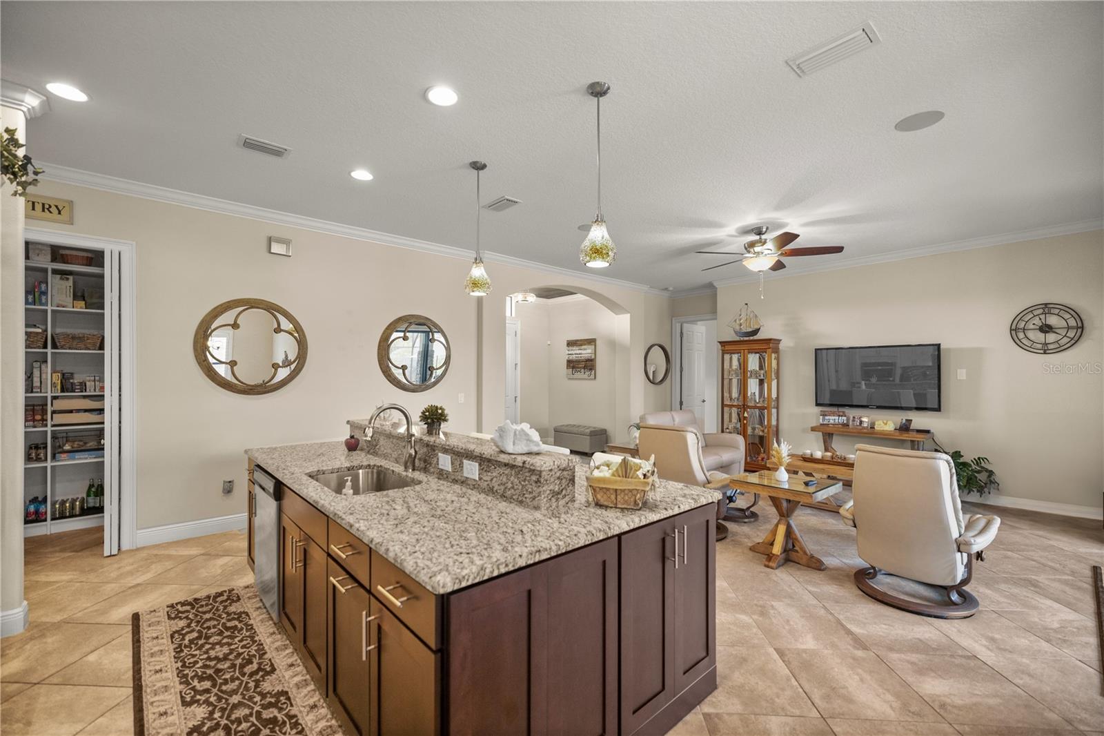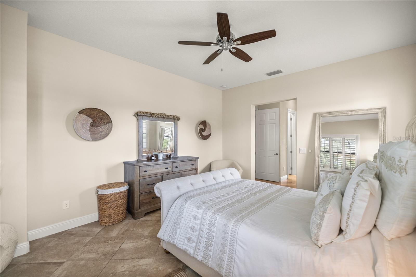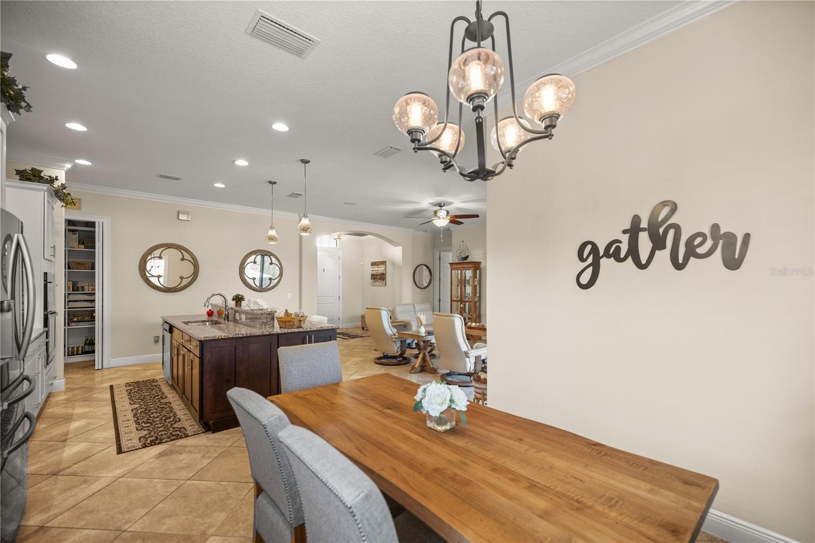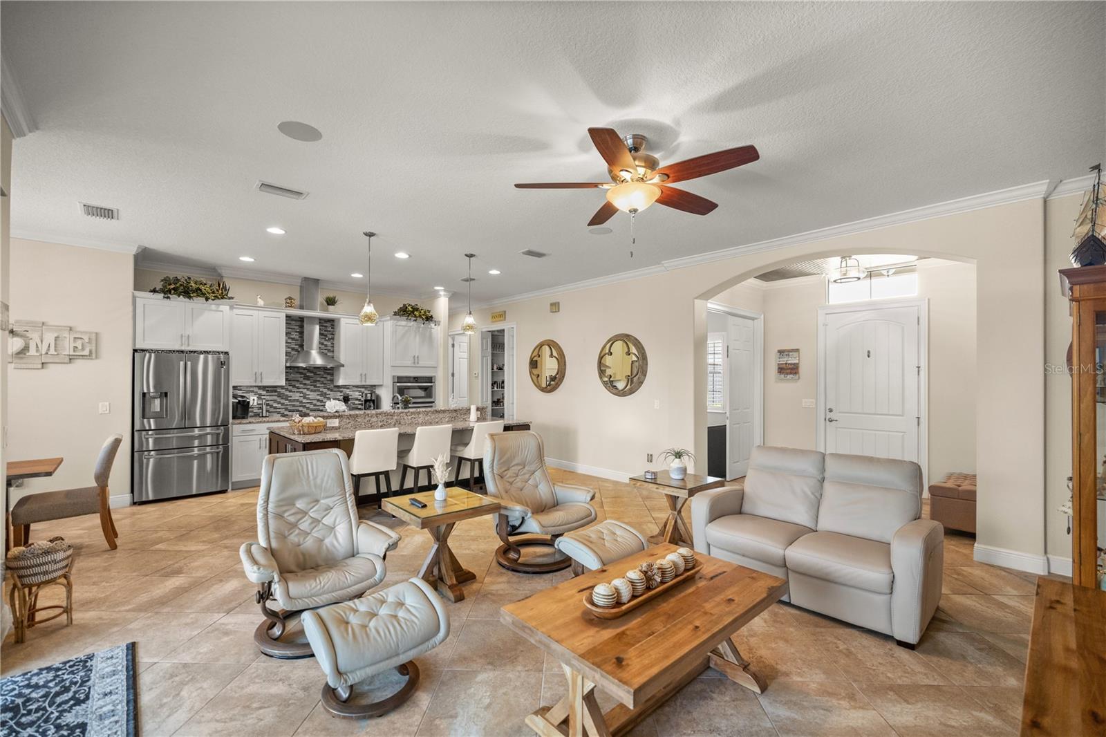 WELCOME HOME! this stunning custom SAGO model home is nestled on an expansive elevated lot offering glimpses of Lake Griffin. This pristine home welcomes you with a paver driveway that leads to a side-entry garage featuring a golf cart bay and a grand front entrance. Step into the foyer and be greeted by views of the stunning pool with a waterfall and a charming outdoor living area, accessible through triple glass sliders. Adjacent to the foyer is a versatile space ideal for a home office or den. The kitchen is a culinary delight, showcasing stainless steel appliances, a spacious island with seating for four, elegant pendant lighting, 42-inch wood cabinets, granite countertops, and a walk-in pantry, all flowing seamlessly into the open living area. The master suite, located away from the guest bedrooms, offers a spa-like retreat with double vanities, a glass-enclosed walk-in shower, a relaxing soaking tub, and two walk-in closets, one of which provides attic access. This thoughtfully designed split floor plan ensures privacy for both you and your guests and includes a convenient indoor laundry room. Additional features of this meticulously maintained home include 30-year architectural shingles, extra insulation, recessed lighting, a mix of 18x18 ceramic tile and carpeting, rocker switches, solid surface window sills, and plantation shutters. The garage is equipped with pull-down stairs leading to a stand-up storage area. The expansive lot is beautifully landscaped and features a 7 zone irrigation system. The community is just 10 minutes from The Villages and is close to medical facilities, shopping, and dining. Located in the highly sought after HARBOR HILLS, this gated community offers a range of amenities including a country club, restaurant, golf, tennis, fitness center, clubs, swimming, and boating. The spectacular views of Lake Griffin from the community are a must-see! Schedule a private showing today!