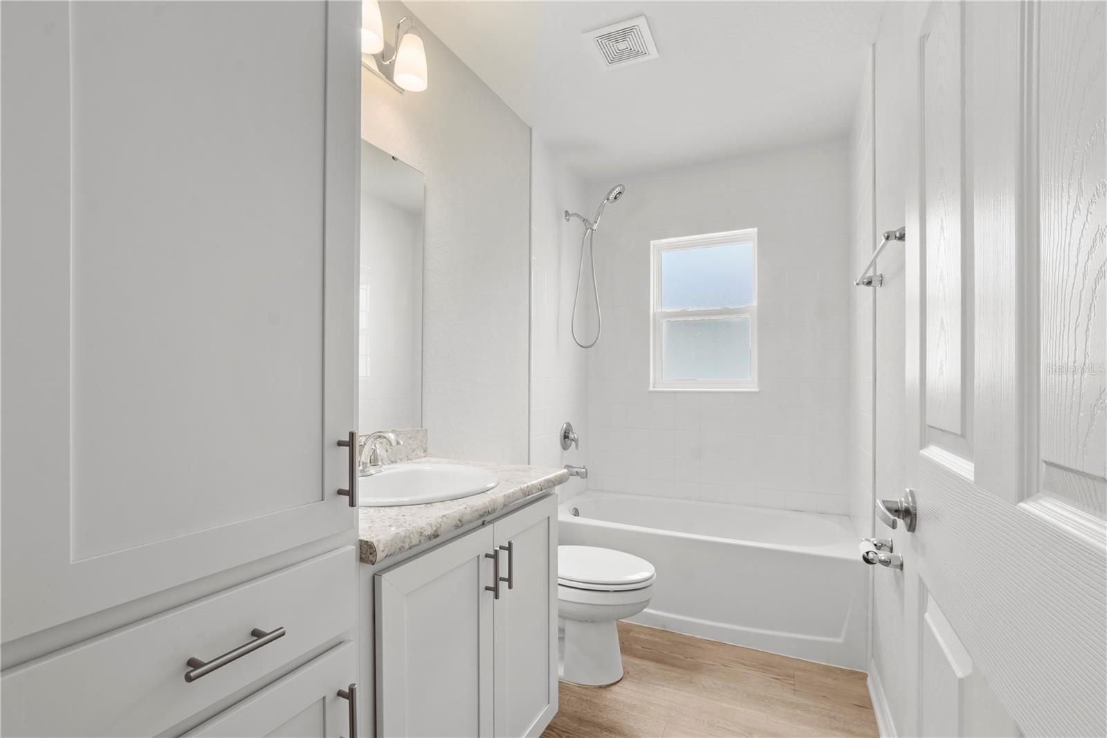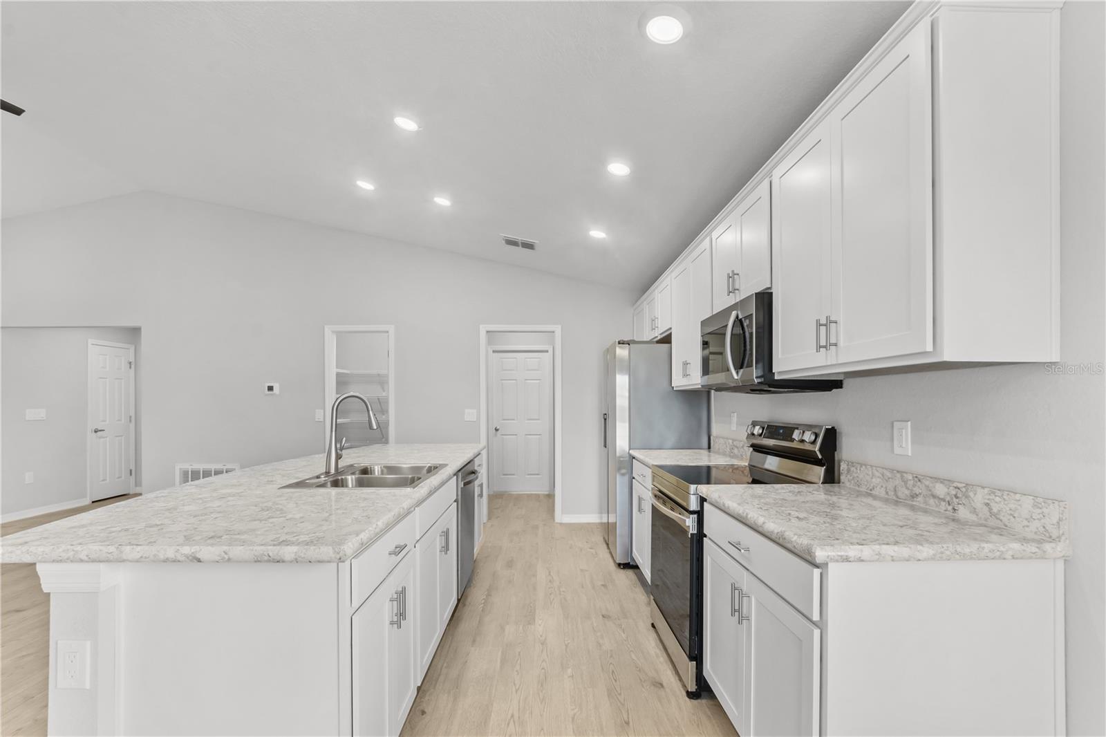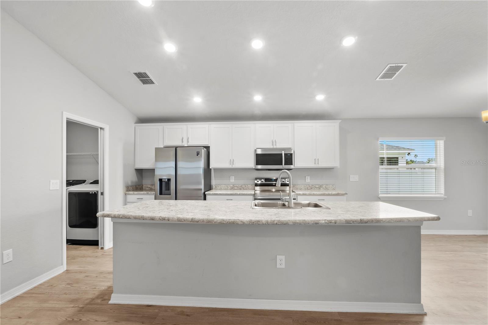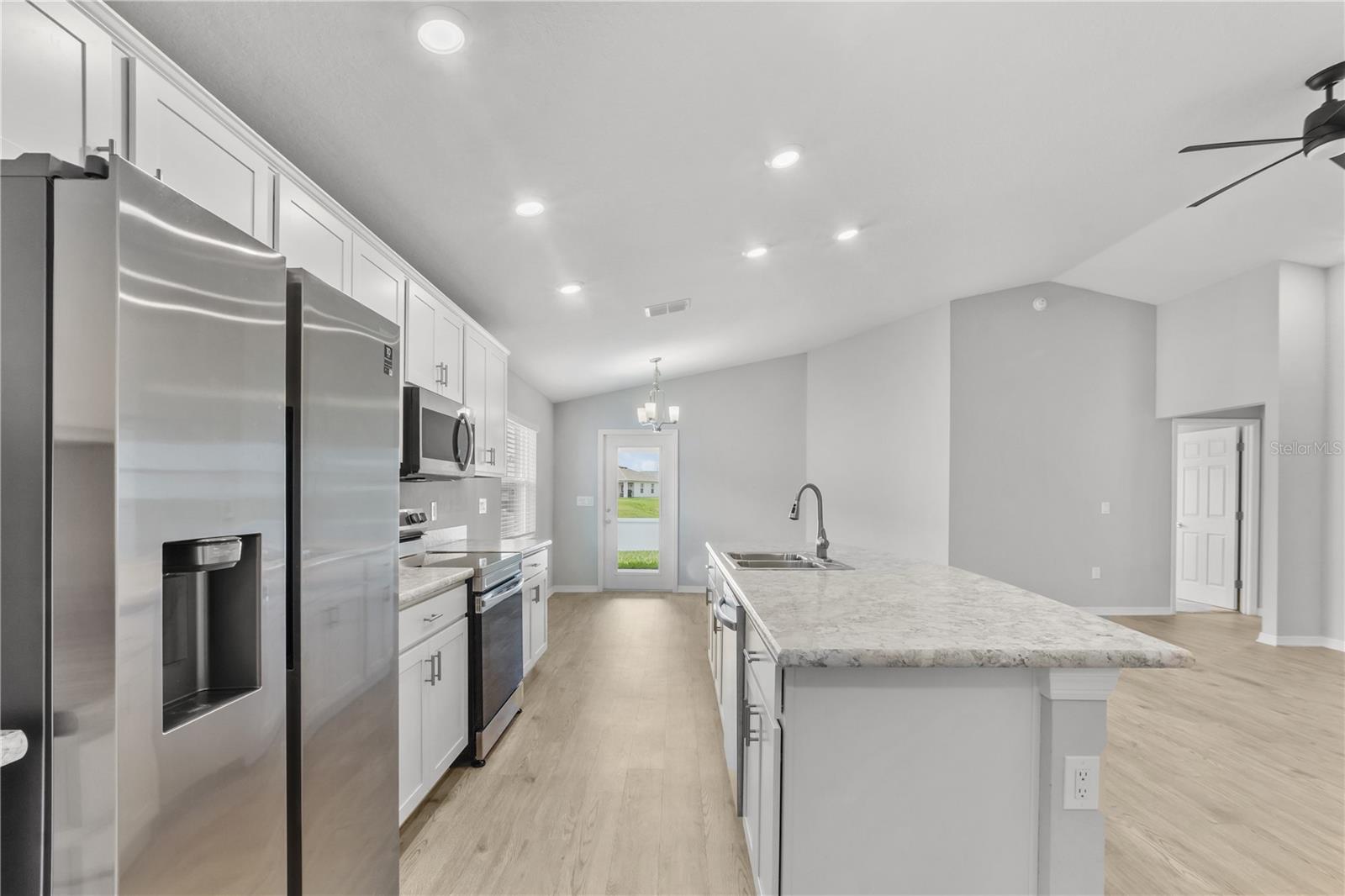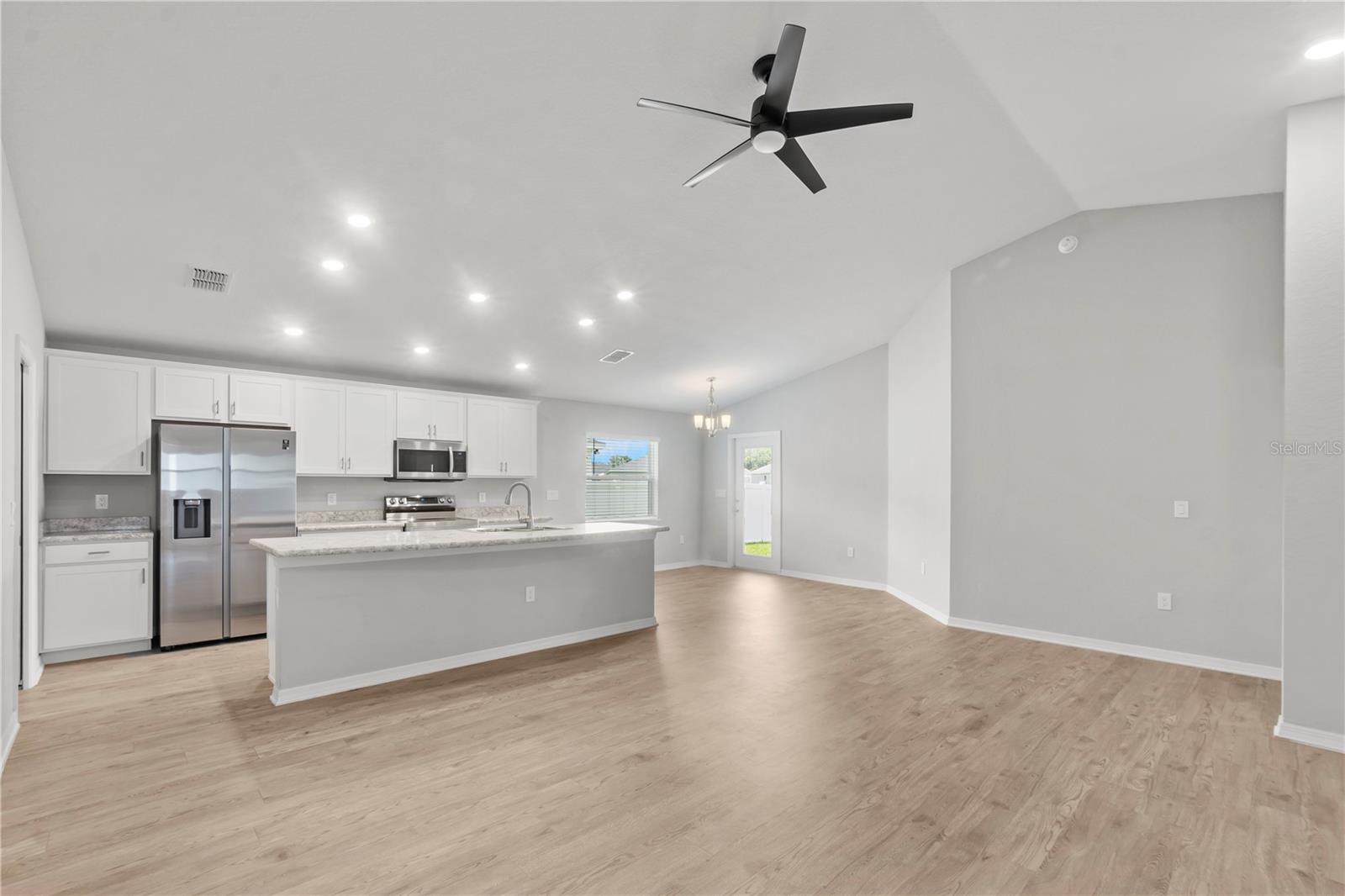 LOCATION! CENTRAL FLORIDA HOME! This home is MINUTES away from theme parks, shopping, dining and major highways! Built in 2021, this is a nearly new construction home, with a beautiful modern design you can make your own. Huge open floor plan adorning the living room, kitchen and dining room. The spacious master bedroom boasts a walk in closet and master bathroom with his and her sinks, as well as a luxurious walk-in shower. With 3 more guest bedrooms, the versatility is endless. Outside, discover your own slice of paradise within the fully fenced backyard. Enjoy al fresco dining and relaxation on the covered patio. Don't wait to make this your home!