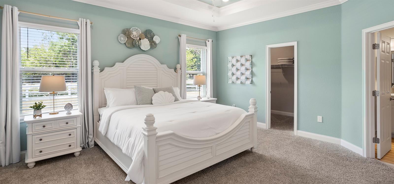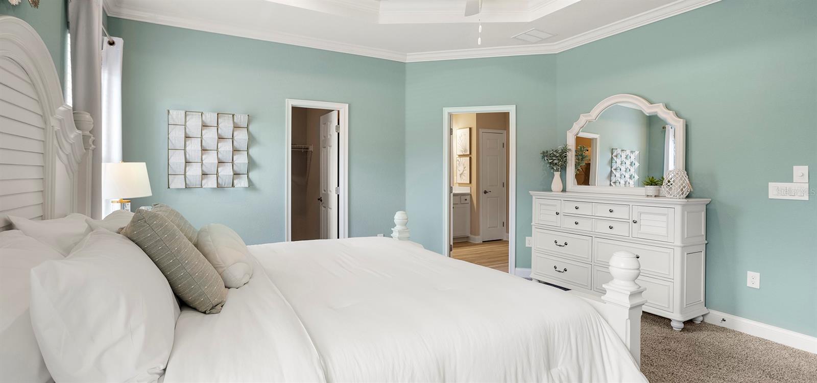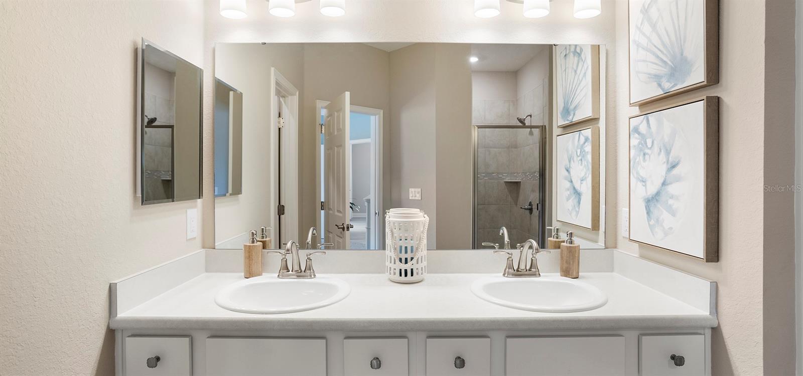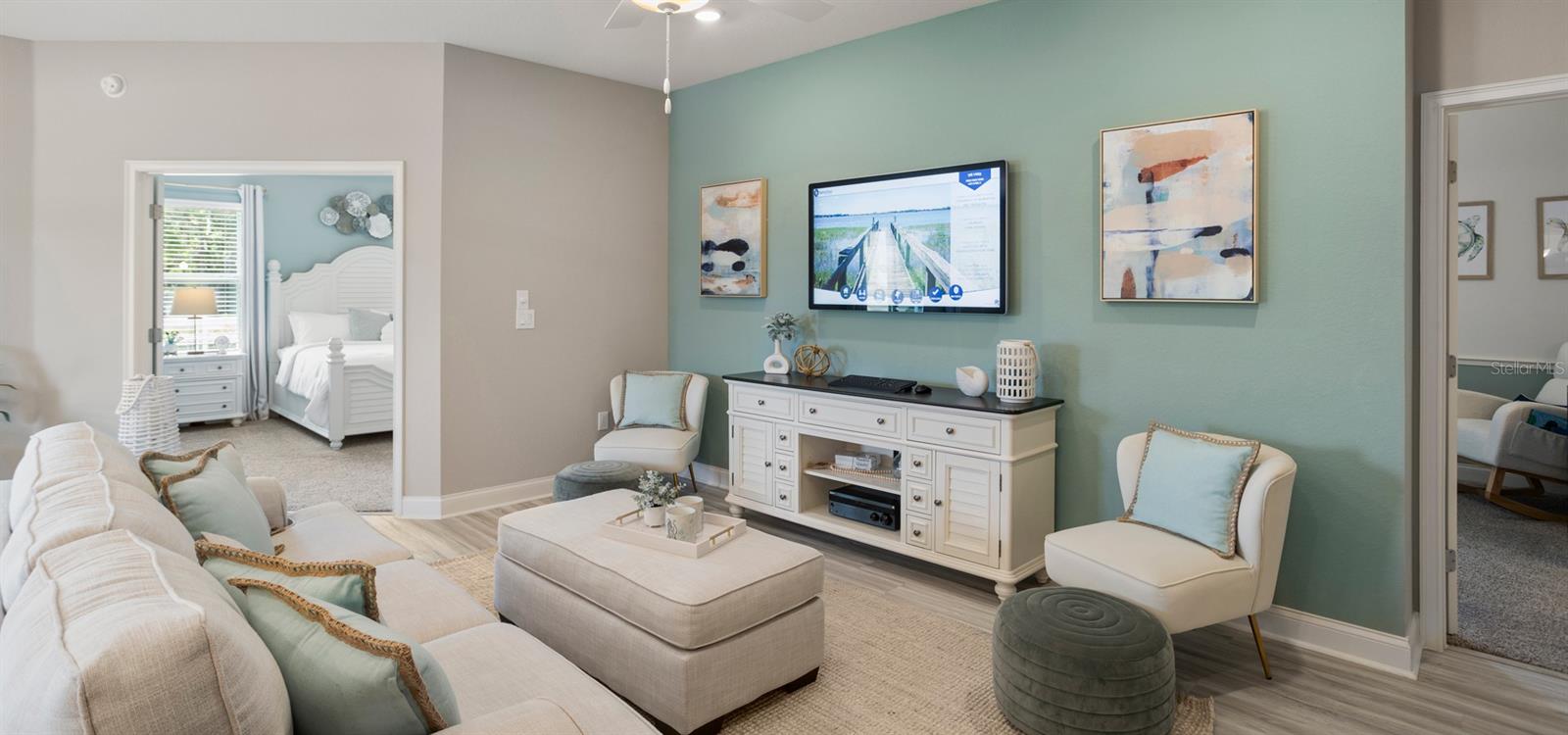 New construction home with 2029 square feet one-story including 3 bedrooms with den, 2.5 baths, and an open living area. Enjoy an open kitchen with Samsung stainless steel appliances, pantry, and a spacious counter height island, fully open to the dining café and gathering room. The living area, laundry room, and baths include luxury wood vinyl plank flooring, with stain-resistant carpet in the bedrooms. Your owner's suite is complete with a walk-in wardrobe and a private en-suite bath with dual vanities, a tiled shower, and a closeted toilet. Jack-and-Jill Hall bath with an enclosed tub and toilet, accessed from bedrooms 3 and 4. Plus, enjoy a covered lanai, 2-car garage, custom-fit window blinds, architectural shingles, energy-efficient insulation and windows, and a full builder warranty. Please note, virtual tour/photos showcases the home layout; colors and design options in actual home for sale may differ. Furnishings and décor do not convey.