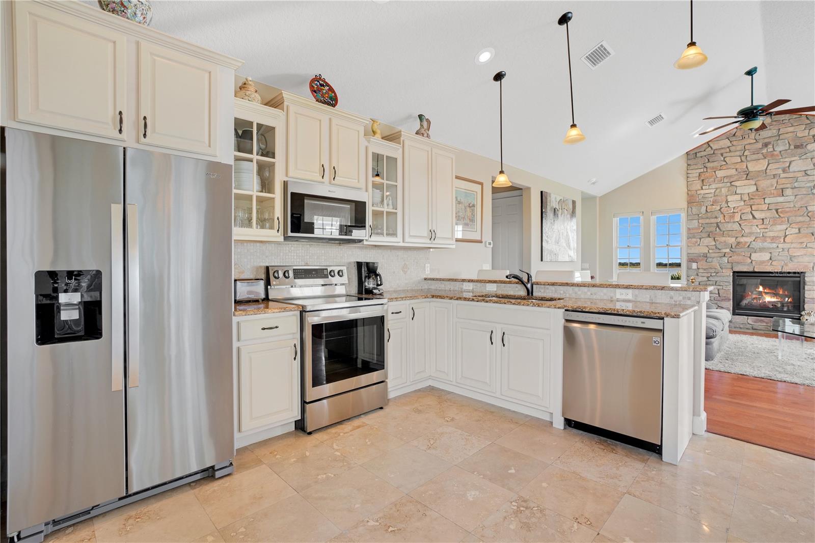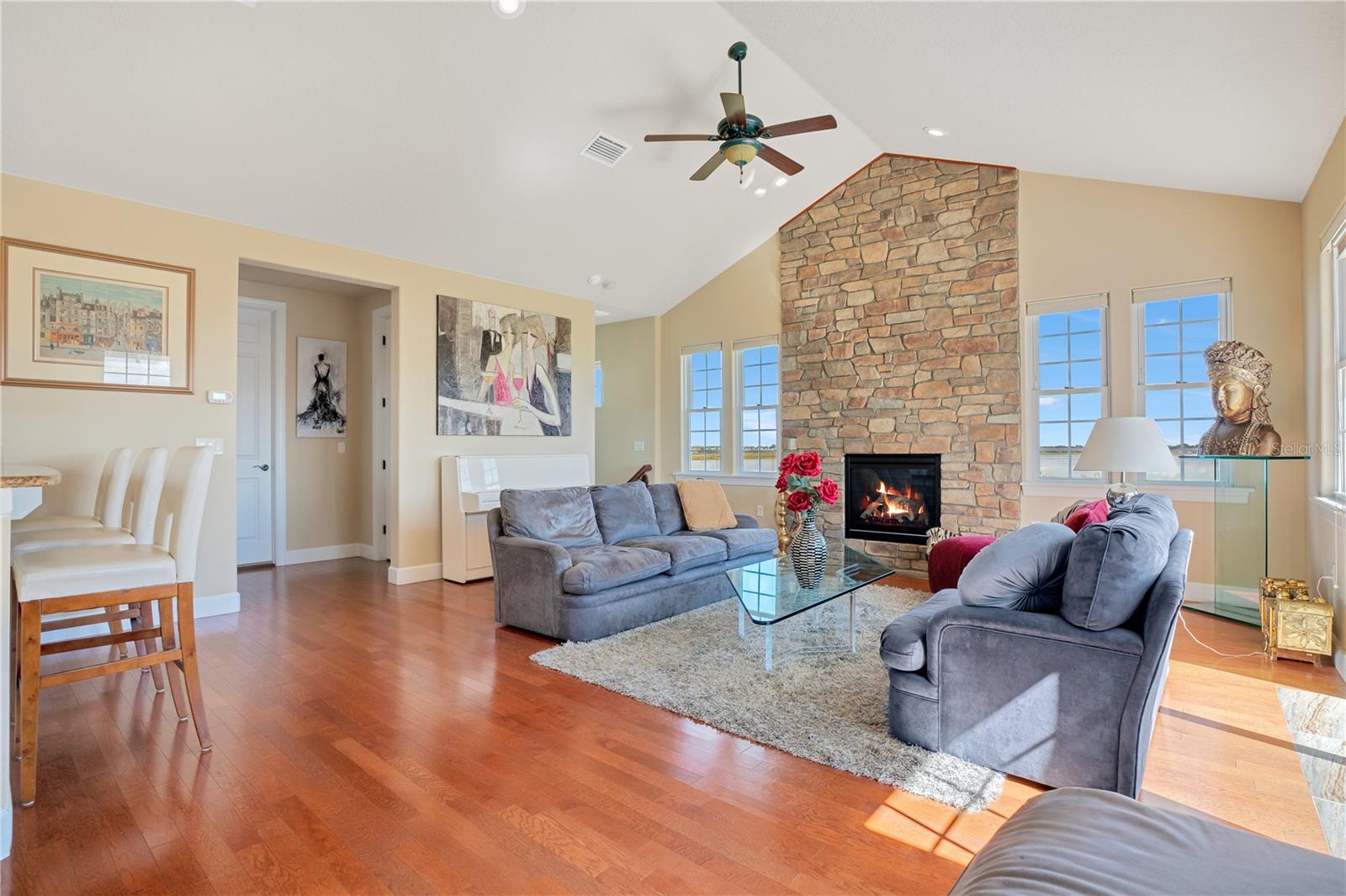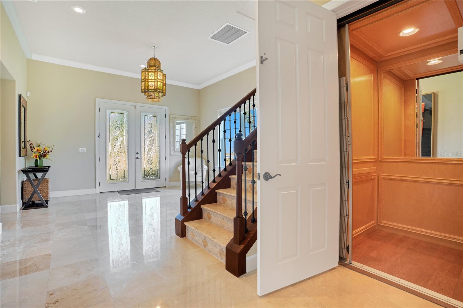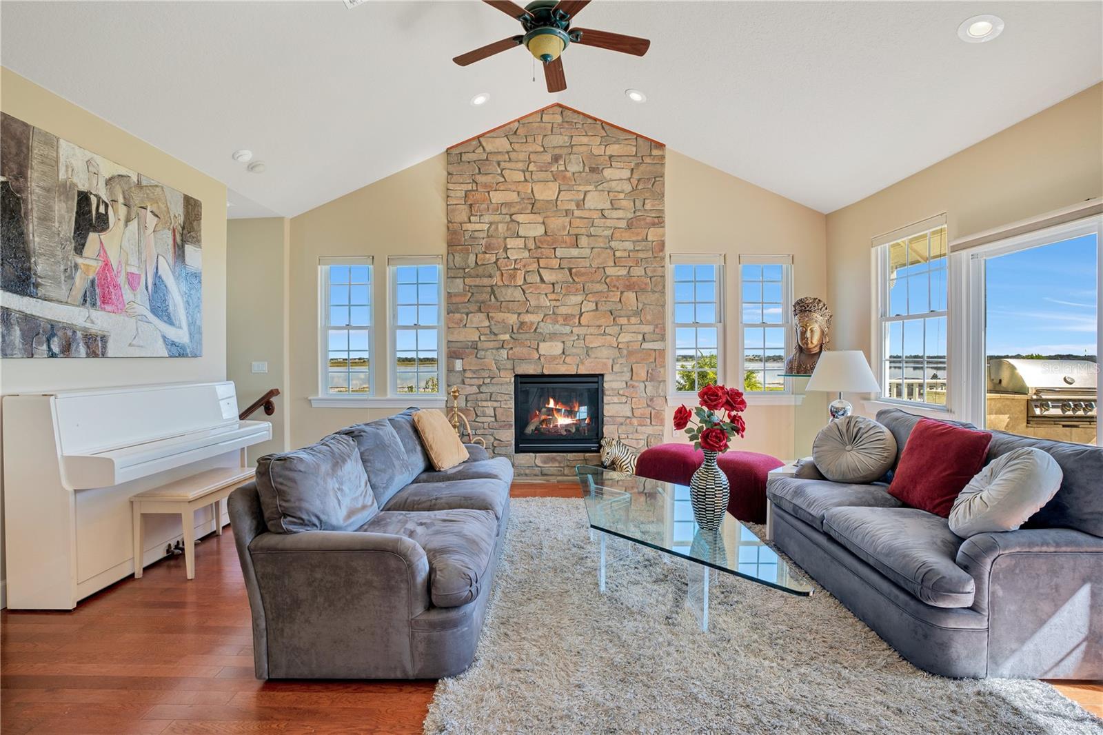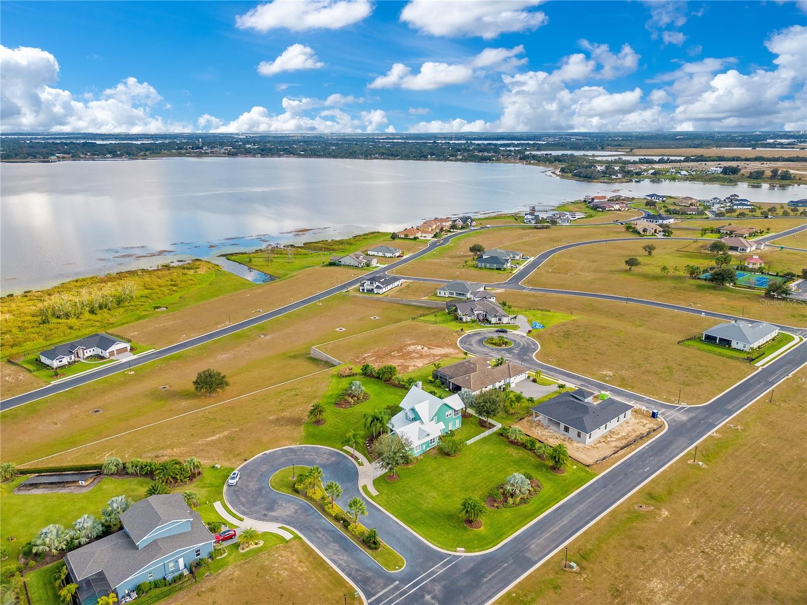One or more photo(s) has been virtually staged. Welcome to your Water Ridge paradise! This Key West-style two-story home with an elevator, graces THREE beautifully landscaped lots offering stunning elevated lake views. The lots must be purchased together. However, it provides the future owner the flexibility to sell the lots individually. The fully fenced property showcases premium features with over $400k in upgrades, including a metal roof, an elevator and staircase for seamless access to the 2nd floor, and a well for irrigation that cuts your water bill drastically! On the first floor you will find the primary bedroom, foyer with vaulted ceilings, office which could be used as a bedroom and guest room with travertine flooring throughout. Granite and premium stone accents grace the home, extending into the spacious primary bath with dual vanities, his & her closets, walk-in shower, and a garden tub. There is also access to your backyard from the primary bedroom and the back porch from the hallway. You can explore the possibility of adding a spiral staircase to access an unfinished second-floor room that can be converted into the ultimate home theater or hangout lounge. The 2nd floor houses the main living areas and the 4th bedroom with warm wood flooring throughout. The kitchen is adorned with a breakfast bar, stone counters, and NEW stainless steel appliances. The living room, complete with a fireplace, seamlessly connects to a dining area and a screened balcony featuring a Summer Kitchen for alfresco dining while taking in the sunrise and sunset lake views that are unobstructed forever! You'll never have to worry about the bugs as this property comes with a mosquito-repellant system. With almost an acreage of total land, you have the ability to create your dream outdoor oasis if desired, and renderings are available. Lake Alfred is a private sandy bottom lake with 726 acres to explore, perfect for water skiing, fishing, and scenic boat rides. The added luxury landscaping perfects the overall appeal and vibrancy of the home, with its palm trees lining the property. This home is located inside the gated community of Water Ridge, which also has excellent amenities to offer you the luxury of resort-style living without leaving home. Amenities include a stunning lakefront clubhouse, pickle ball, tennis, and basketball courts, 3 private community pools, tennis courts, a fitness center, a sauna, walking trails, 3 fishing docks, access to 2 PRIVATE boat ramps, and assigned boat storage. Less than 30 minutes from Tampa & Orlando, you can enjoy a luxury lifestyle while still being centrally located to top Florida cities right from the comfort of your home. This move-in-ready home caters to those who truly want to live the resort-style life. Don't miss the chance to claim this extraordinary piece of paradise as your own!