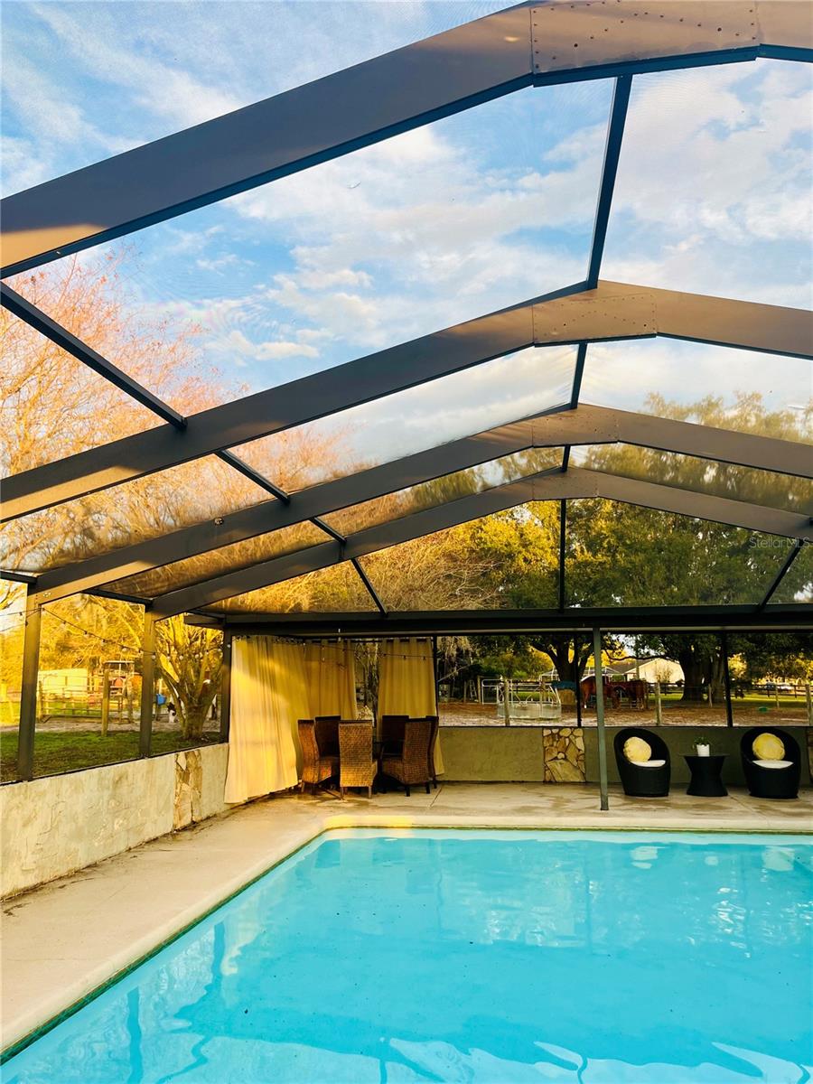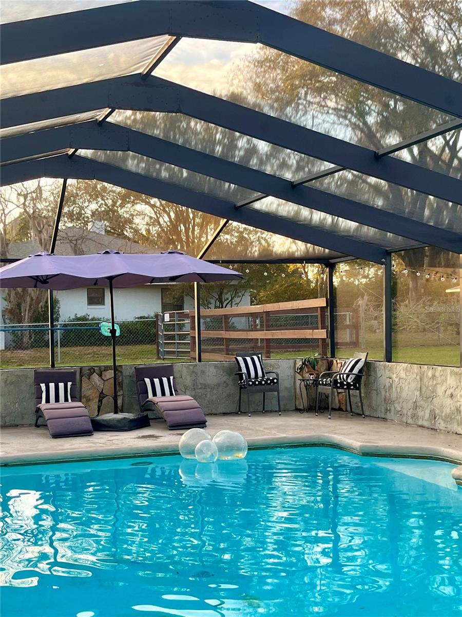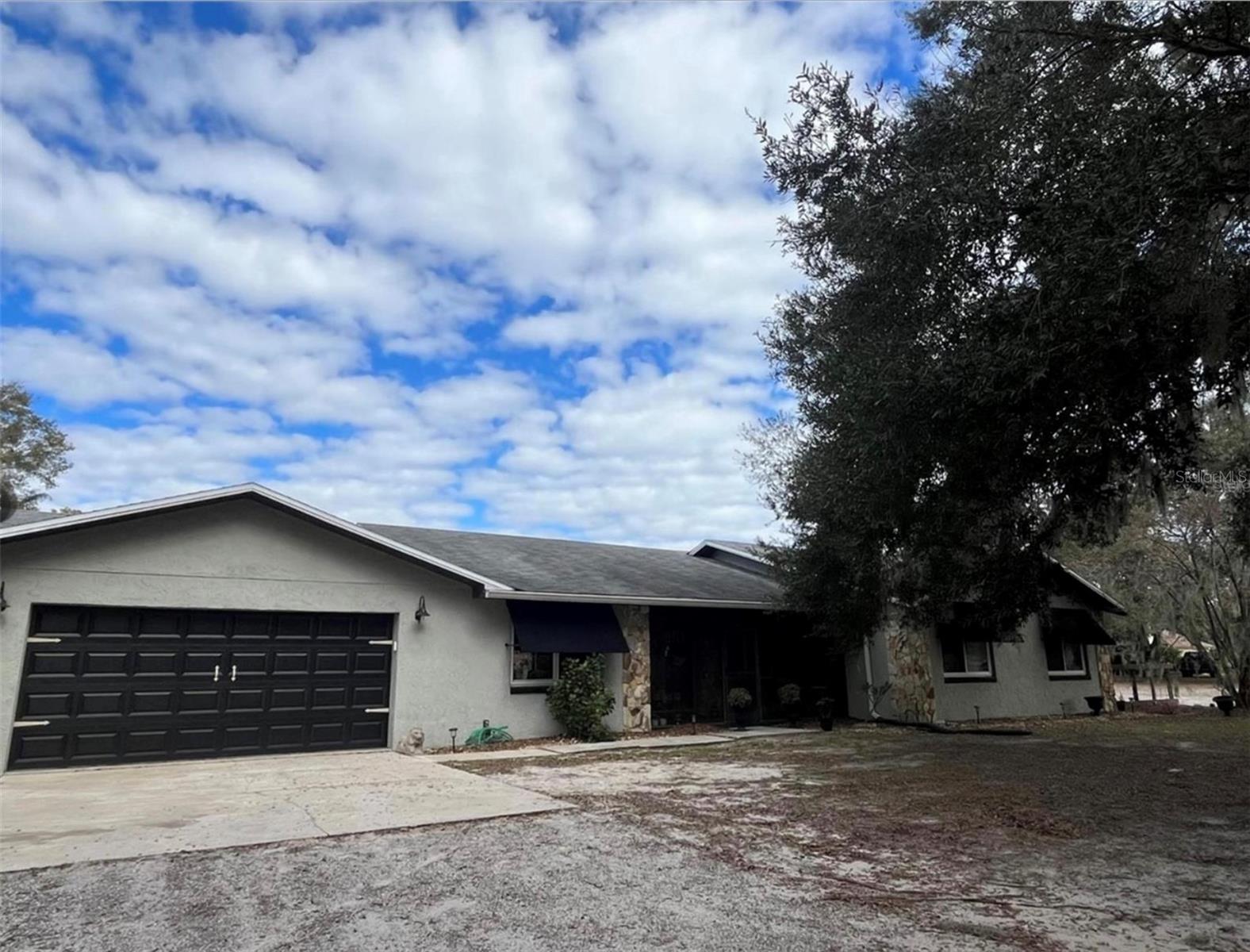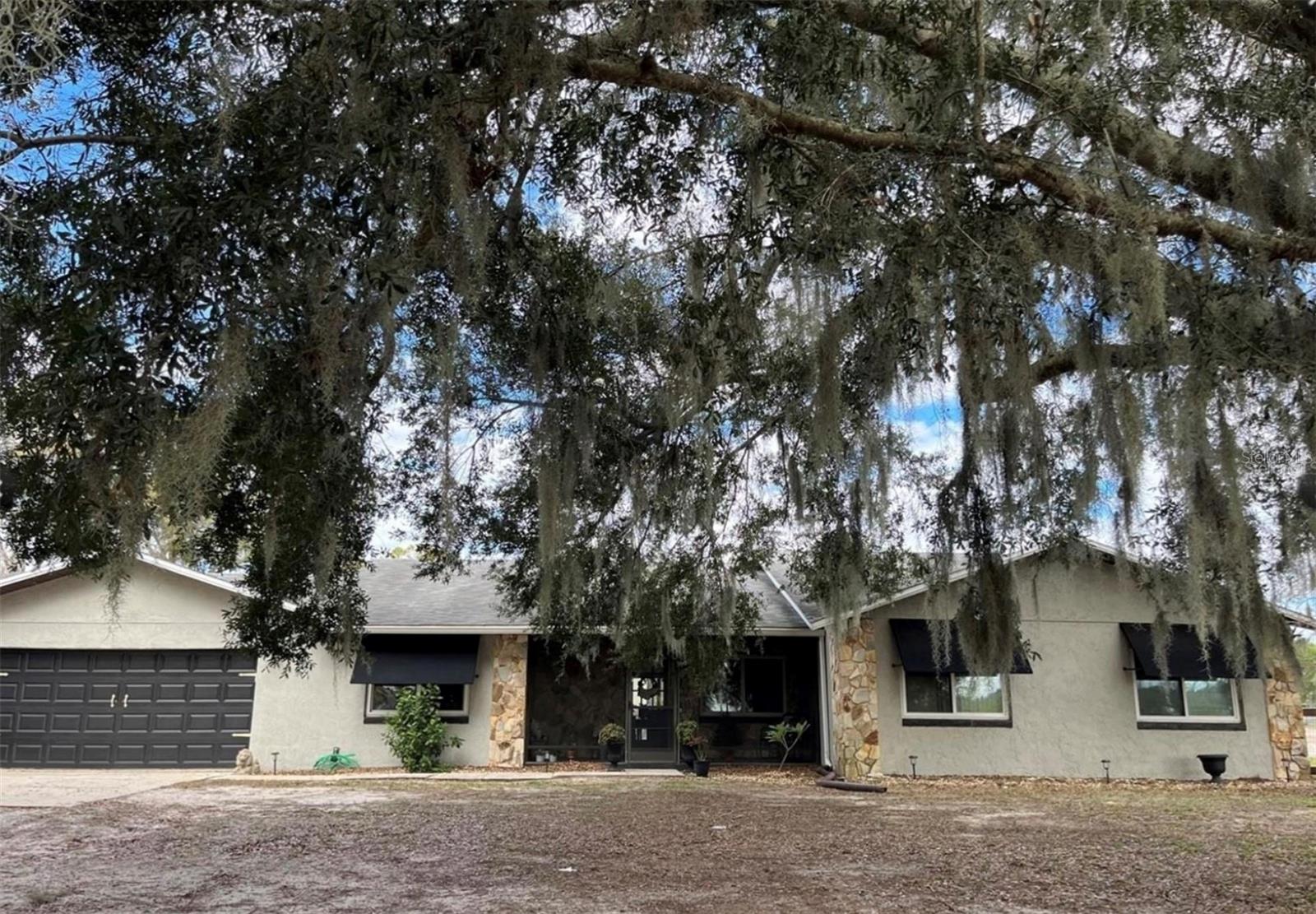 Must see to believe all that this charming, updated, three bedroom, 2 1/2 bathroom, attached garage, pool home on a sprawling +/- acre lot zoned for horses. As you enter the house, you are welcomed by a cozy screened in front porch. Enjoy the view of a tranquil lake as you sip your morning coffee. From there, walk through the front door into the spacious Great Room featuring new luxury vinyl tile which continues throughout the home. The wood-burning fireplace with cedar wood mantle and masonry rock wall is a favorite spot for friends and family to gather. Vaulted ceilings adorned with decorative natural wood plank trusses and whitewashed plank walls, are among the additional stunning details in the Great Room. To the left of the Great Room sits a beautifully renovated Kitchen featuring quartz counters, stainless steel appliances, ceramic tile backsplash, and an oversized walk-in pantry. Off to the right of the Great Room is the hallway leading you to the Primary En Suite Bedroom and two Secondary Bedrooms with a shared bath. The highlights of the large Primary Bedroom are the crystal “fandelier”, (a chandelier with disguised ceiling fan), a well appointed walk in closet, and sliding glass doors that lead to the pool and lanai area. The Primary Bathroom has a large, glass enclosed, ceramic tile, walk-in shower plus an oversized vanity with sink and ample storage space. The Secondary Bedrooms each have a picture window with scenic views of the park like front yard. They share a large Bathroom with a shower/tub combo. A separate Laundry Room is located just off the Great Room. As you exit the living space through the sliding glass doors you’ll walk out onto the pool deck. The fully screened outdoor pool oasis and the lanai area with retention wall offers plenty of space for large parties or a quiet spot for solo relaxation as you soak up the sun. Conveniently, the pool has its own bathroom to keep wet swimmers from entering the home. Beyond the pool area, you will find the fenced backyard. The yard features a stable and storage shed. The gem of this property, however, is the unique, insulated, air conditioned, 2250 ft.² workshop. This space has a wood framed mezzanine, steel support beams, plumbing hook up, garage door, and concrete flooring. The owners have converted the workshop into a recreation area with a basketball court as well as an additional party/entertainment space. This property also includes a whole house plus workshop generator, Kinetco Water Filtration System to optimize the quality well water. Looking for low cost living? Since there are no city utilities to pay and no HOA look no further, this is the home for you! This property could also be utilized as an investment property, or your very own compound to live, work, and play! The property is close to I4 and conveniently located near OIA, golfing and Central Florida attractions. Call to schedule your private showing. Mortgage is assumable.