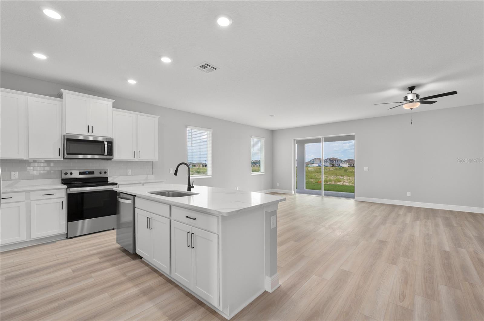 Pre-Construction. To be built. Welcome to the Azalea, a thoughtfully designed 4-bedroom, 2-bathroom home offering comfort, style, and beautiful surroundings. Step inside through the long foyer and into the spacious family room, dining area, and chef-ready kitchen. The kitchen features a large island breakfast bar, granite countertops, white wood cabinetry, a walk-in pantry, and stainless steel Whirlpool appliances. The private master retreat, tucked at the back of the home, boasts a large walk-in closet and a spa-inspired bathroom with dual sinks, a linen closet, and a relaxing garden tub. Luxury vinyl flooring flows throughout the main living areas and the master bedroom, while the additional bedrooms are carpeted for comfort. Outside, you’ll find a welcoming covered front porch, professional landscaping, and a rear patio perfect for relaxing. This home is perfectly situated on a homesite that backs up to a dry pond, offering added privacy, no rear neighbors, and stunning sunset views in the evenings. Nestled in Gum Lake Preserve, a picturesque lakeside community, homeowners enjoy direct access to Gum Lake with a boat ramp, future fishing dock, playground, picnic areas, and nature trails. Perfectly located just minutes from I-4 and centrally positioned between Tampa and Orlando, Gum Lake Preserve blends natural beauty with everyday convenience.