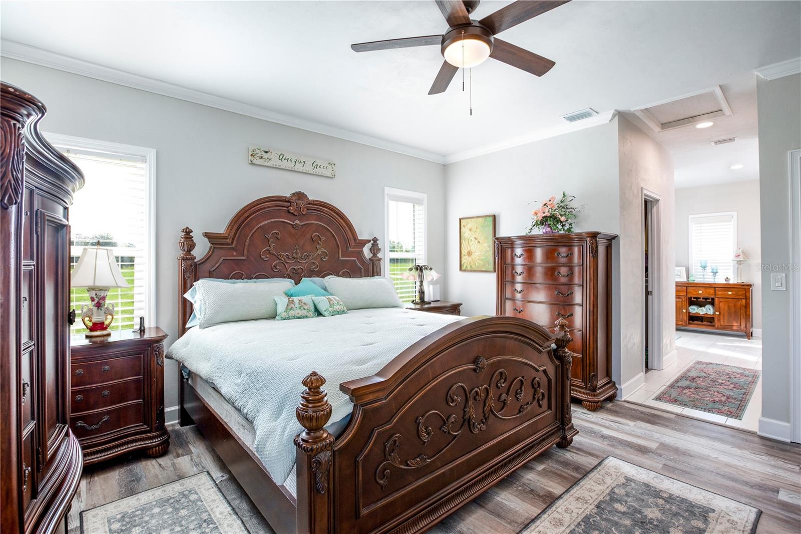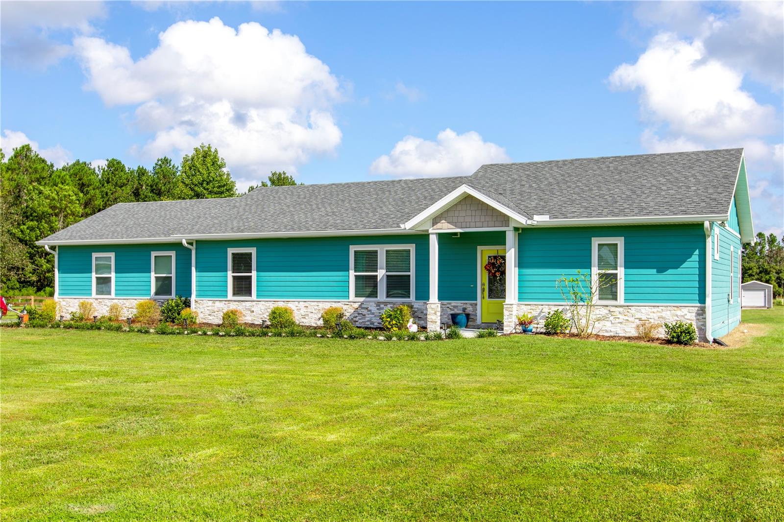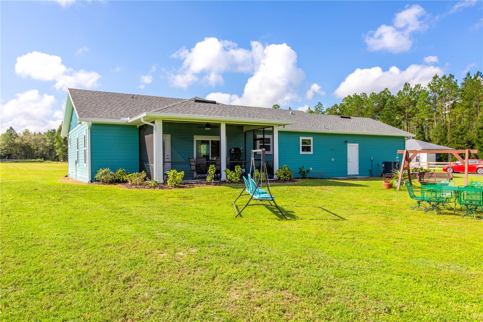 Discover this nearly-new, 2023 built home, nestled on just under 5 acres, offering the perfect blend of modern luxury and serene country living. This thoughtfully designed residence features a highly sought-after split floor plan with 2 spacious bedrooms and 2 full bathrooms, providing comfort and privacy for all. Inside you'll be captivated by the stunning open-concept living space, boasting vinyl plank flooring throughout. The gourmet kitchen is a chef’s dream, equipped with gorgeous farm sink, top-of-the-line stainless steel appliances, including a built-in oven, microwave and dishwasher. Dual islands provide ample counter space, ideal for meal prep and entertaining. The primary bedroom features lots of natural light, walk in closet with custom shelving, door that leads you to a screened in patio and an expansive en-suite bathroom offers a spa-like experience. Featuring a toilet room, double sinks, walk-in shower complete with floor to ceiling tile, a built-in bench for relaxation, as well as a convenient shampoo nook for all your shower essentials. Enjoy the convenience of a large laundry room, and take advantage of the extra storage in the attached 2 car garage. Step outside and explore the extensive outdoor amenities! An above ground pool with wooden stairss and deck, A versatile shed with an attached carport provides ample storage and makes it easy to store recreational and lawn vehicles. There is an additional dedicated RV /boat carport as well. Garden enthusiasts will love the spacious garden area, perfect for cultivating vegetables, flowers, or a personal retreat. NO HOA/CDD, bring your RV, Boat, or toys. This property is a rare find—offering both a peaceful rural lifestyle and all the modern comforts. Don’t miss out on this exceptional opportunity!