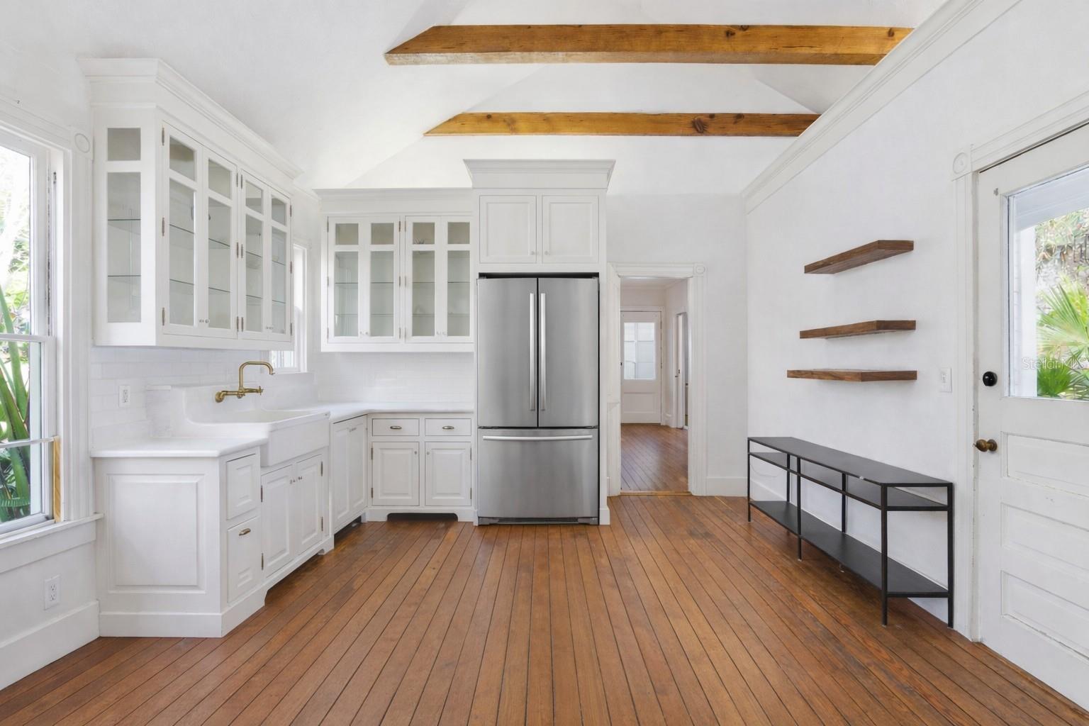 One or more photo(s) has been virtually staged. This luminous 1887 Victorian is a rare opportunity in Lake Helen’s historic corridor—restored with care, modernized for comfort, and wrapped in sunlight, character, and established gardens. Inside, natural light pours through large east- and south-facing windows, accentuating tall ceilings and original architectural craftsmanship. Heart-of-pine floors flow across the first and second levels, complemented by pocket doors that transition from the dining room into a flexible living space—ideal as a music room, den, bedroom, or office. The front living area centers around a working fireplace, setting the tone for evenings of quiet comfort. Photos have been digitally altered to remove all personal property on site. Best efforts have been made to preserve the characteristics of the property, though some minor changes may be present as a result of digital alterations. The kitchen delivers volume and drama with vaulted ceilings, exposed oak beams milled in Lake Helen, abundant cabinetry, and a door that opens to a breezy side porch. A bright rear mudroom/laundry anchors the everyday entrance from the garage, and both levels offer full bathrooms for convenience. Bedrooms are generously sized—notable for a home of this vintage—and the upstairs suite opens to its own private balcony. A fully finished third floor expands the home’s usable square footage with heat, air, four windows of daylight, and a lofty vantage point where you can watch launches from Cape Canaveral. Major system improvements include AC/heat upstairs installed December 2024, ductwork under the first floor (2023), a roof installed on the main structure in 2018, solar added within the last four years, and significant restoration in the early 2000s by the previous owner that included updated wiring, plumbing, and insulation. Outdoors, the property becomes a private botanical playground. A pergola draped in mature purple wisteria anchors a peaceful garden full of producing citrus, loquat, guava, olive, apple, plum, camellias, cedar, live oak, flowering shrubs, and established hardscape. A well supplies drinking water and irrigation, complemented by a salt filtration system at the source, sprinklers, and thoughtful landscape lighting. A Chicago-brick courtyard provides a secluded entertaining space beside the home, while a two-car garage offers storage and its own climate control. Located within the protected corridor, exterior modifications follow city preservation standards—protecting the surrounding character that makes this pocket of Lake Helen so loved. Timeless architecture. Meaningful renovations. Sun-filled rooms. Wraparound porches. Private gardens. This is the kind of historic Florida living that rarely comes to market—and even more rarely stays available.