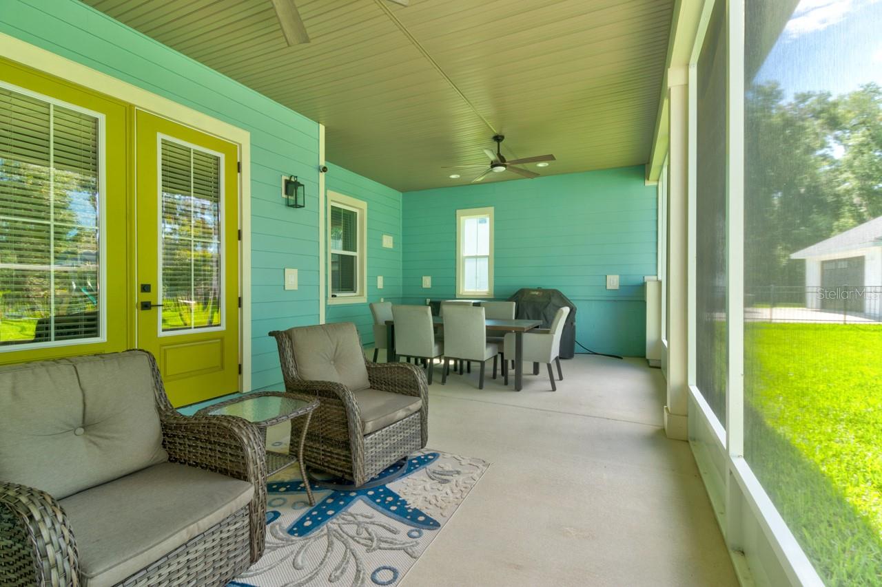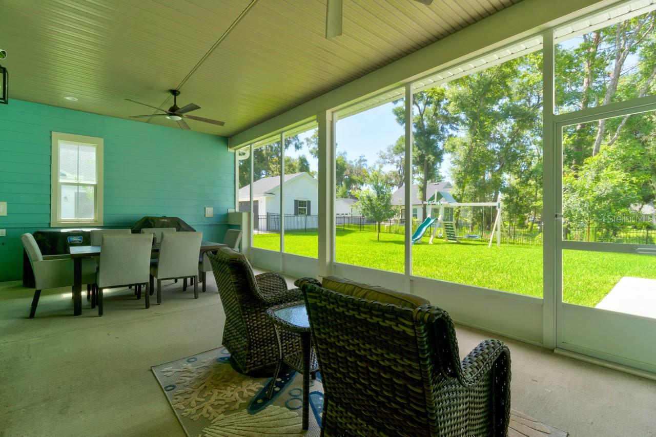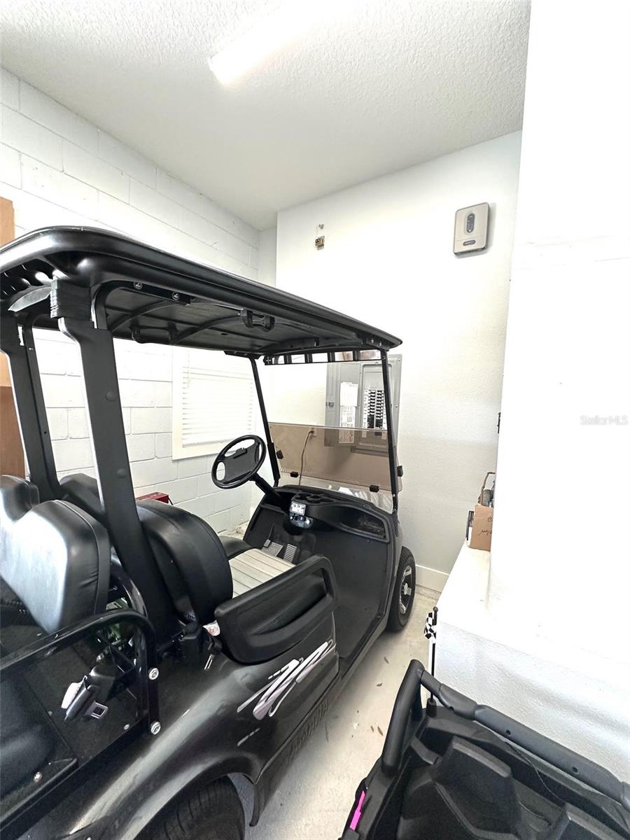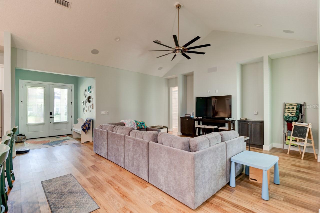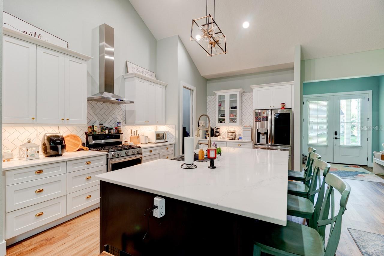 Gorgeous 4315 sq ft of house that includes a 12x23 WORKSHOP/ MAN CAVE and an OVERSIZED 24x24 two car garage with UPGRADED 220V outlets for multiple equipment use and a SEPARATE 7X9 GOLF CART GARAGE SPACE. Golf cart INCLUDED in the sale of the house. 2315 sq ft of heated space includes 3 bedrooms, 2.5 bathrooms and a 10x13 office/ den. With high vaulted ceilings in the great room reaching up to 14 FEET HIGH and plenty of oversized windows and 8 FEET CUSTOM DOORS for natural light. Great room has SURROUND SYSTEM and a GAS FIRE PLACE. Kitchen has 9x5 ISLAND with quartz counter top and CABINETS ON BOTH SIDES of the island for additional storage. GAS PROPANE TANK fuels the gas stove in the kitchen along with the washer and dryer and the water heater. CUSTOM BANQUETTE SEATING in the dining for endless entertainment. Master bedroom has TWO WALK IN CLOSETS, Master Bathroom has TWO Vanity Sinks. An innovative THREE zone HVAC SYSTEM WITH A HALO FILTRATION that ensures allergens and contaminants are effectively removed from air , providing a continuous supply of clean and fresh indoor air quality. 15x26 SCREENED IN LANAI. Other features include : WELL WATER FOR IRRIGATION. WROUGHT IRON FENCE IN THE BACKYARD, OUTDOOR SHOWER, INSTANT WATER HEATER, DEEP FREEZER IN THE GARAGE, SOFT CLOSE CABINETS IN THE KITCHEN, 2 WI-FI ACCESS POINTS IN HOUSE (ideal for work from home), LED WALL MOUNTED MIRRORS IN ALL BATHROOMS, GOLD FIXTURES, GOLD HARDWARE'S, DOUBLE ENTRY DOORS TO THE HOUSE AND TO THE WORKSHOP, SUPER OVERSIZED LONG DRIVEWAY, HUGE SEMI U-SHAPED FRONT PORCH. Community features: Golf cart friendly, has a park, basketball court and low HOA. Zoned for A rated schools and has A rated charter schools in the vicinity.