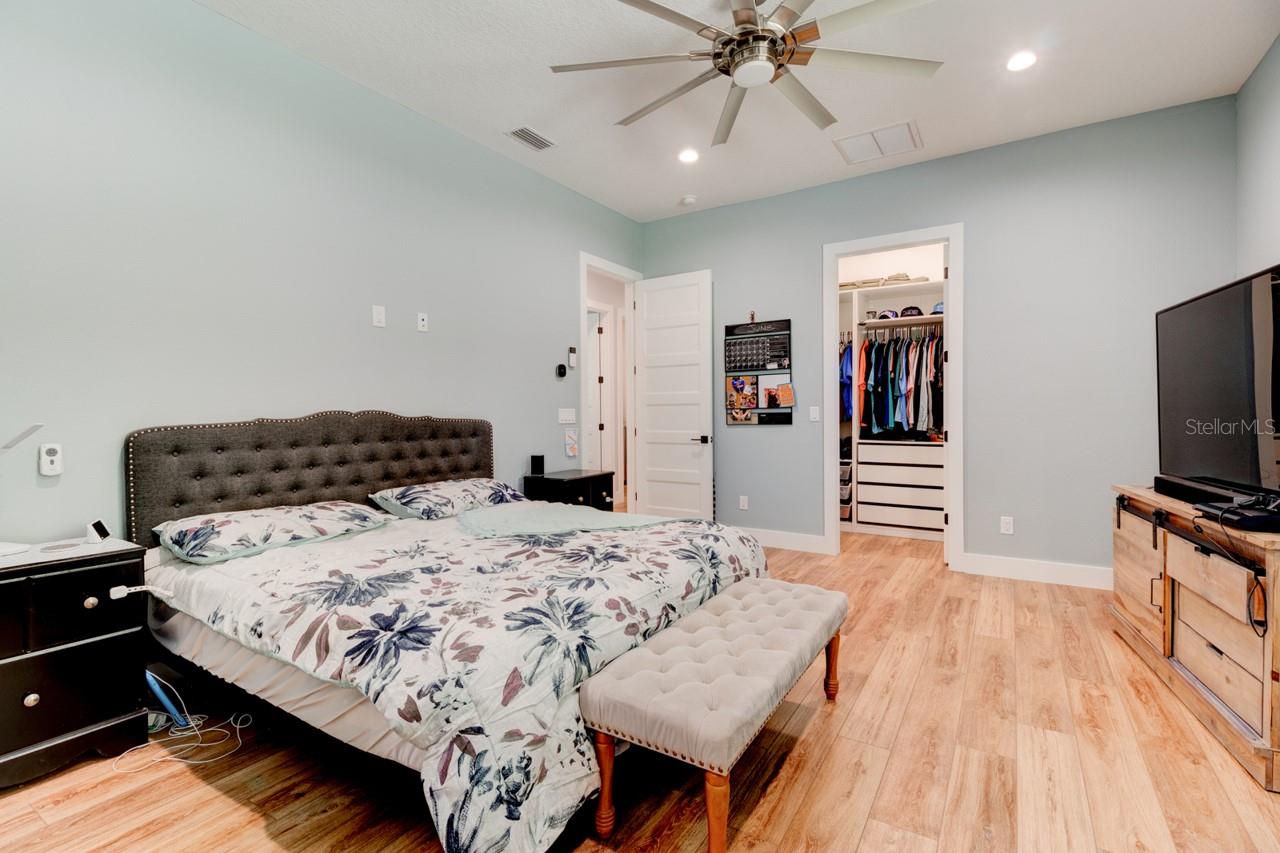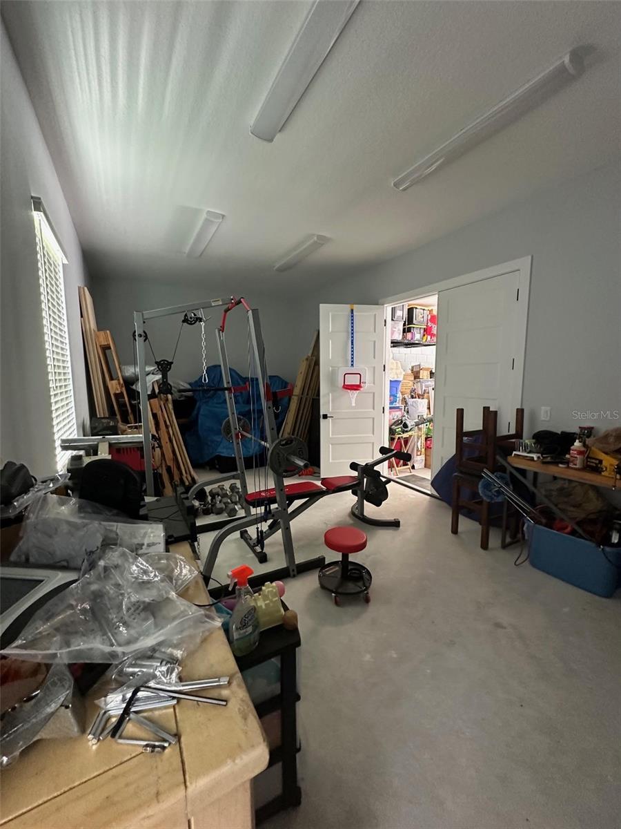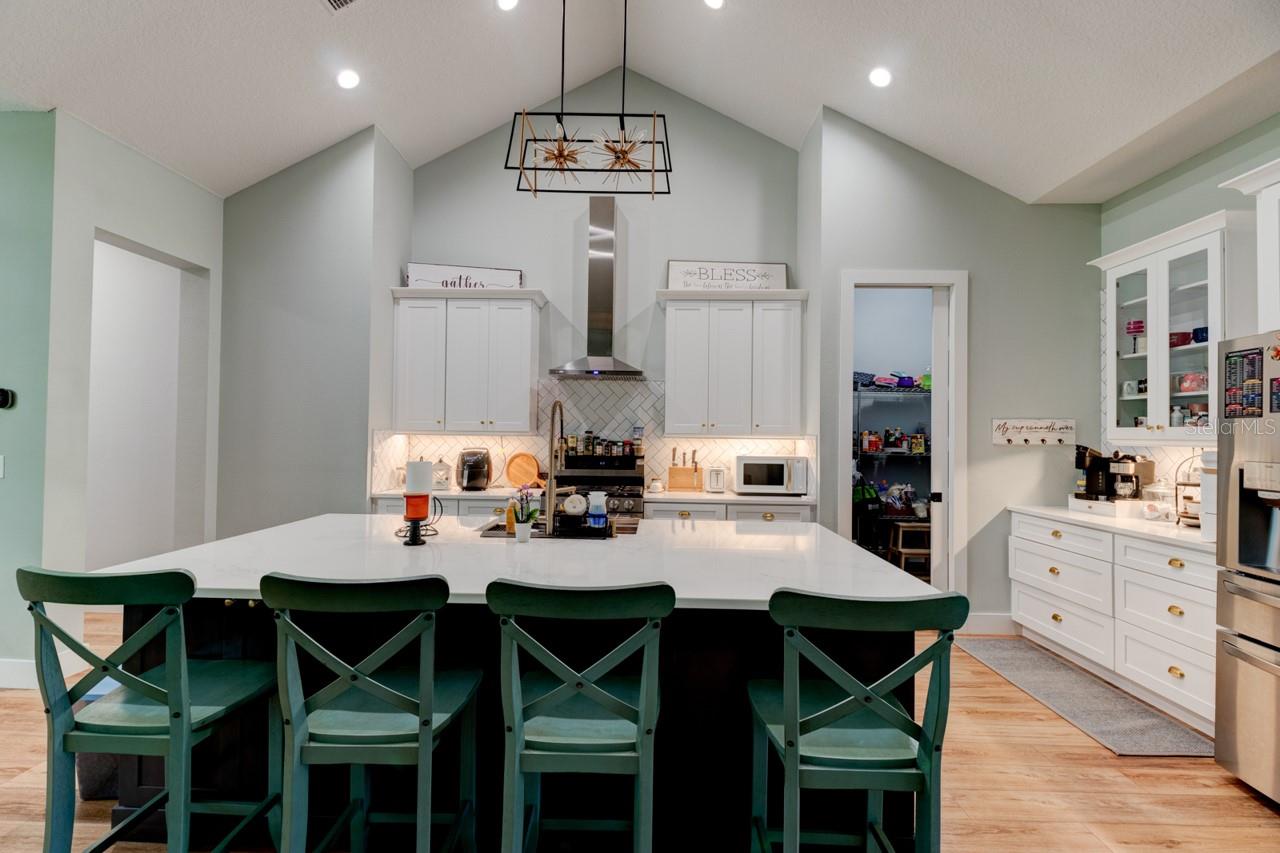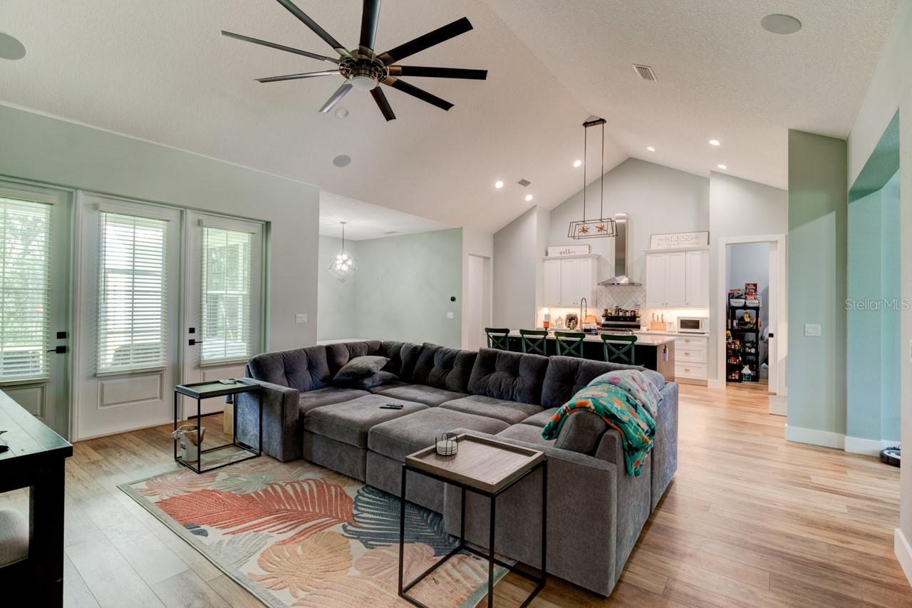Gorgeous 4315 sq ft of house that includes a 12x23 WORKSHOP/ MAN CAVE and an OVERSIZED 24x24 two car garage with UPGRADED 220V outlets for multiple equipment use and a SEPARATE 7X9 GOLF CART GARAGE SPACE. Golf cart INCLUDED in the sale of the house. 2315 sq ft of heated space includes 3 bedrooms, 2.5 bathrooms and a 10x13 office/ den. With high vaulted ceilings in the great room reaching up to 14 FEET HIGH and plenty of oversized windows and 8 FEET CUSTOM DOORS for natural light. Great room has SURROUND SYSTEM and a GAS FIRE PLACE. Kitchen has 9x5 ISLAND with quartz counter top and CABINETS ON BOTH SIDES of the island for additional storage. GAS PROPANE TANK fuels the gas stove in the kitchen along with the washer and dryer and the water heater. CUSTOM BANQUETTE SEATING in the dining for endless entertainment. Master bedroom has TWO WALK IN CLOSETS, Master Bathroom has TWO Vanity Sinks. An innovative THREE zone HVAC SYSTEM WITH A HALO FILTRATION that ensures allergens and contaminants are effectively removed from air , providing a continuous supply of clean and fresh indoor air quality. 15x26 SCREENED IN LANAI. Other features include : WELL WATER FOR IRRIGATION. WROUGHT IRON FENCE IN THE BACKYARD, OUTDOOR SHOWER, INSTANT WATER HEATER, DEEP FREEZER IN THE GARAGE, SOFT CLOSE CABINETS IN THE KITCHEN, 2 WI-FI ACCESS POINTS IN HOUSE (ideal for work from home), LED WALL MOUNTED MIRRORS IN ALL BATHROOMS, GOLD FIXTURES, GOLD HARDWARE'S, DOUBLE ENTRY DOORS TO THE HOUSE AND TO THE WORKSHOP, SUPER OVERSIZED LONG DRIVEWAY, HUGE SEMI U-SHAPED FRONT PORCH. Community features: Golf cart friendly, has a park, basketball court and low HOA. Zoned for A rated schools and has A rated charter schools in the vicinity.