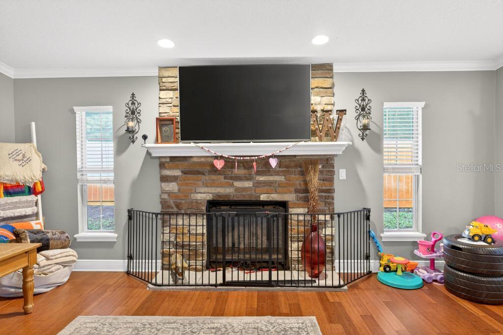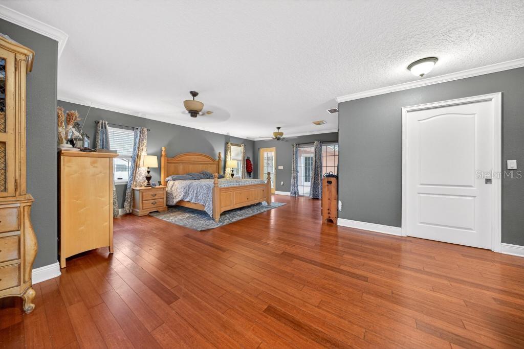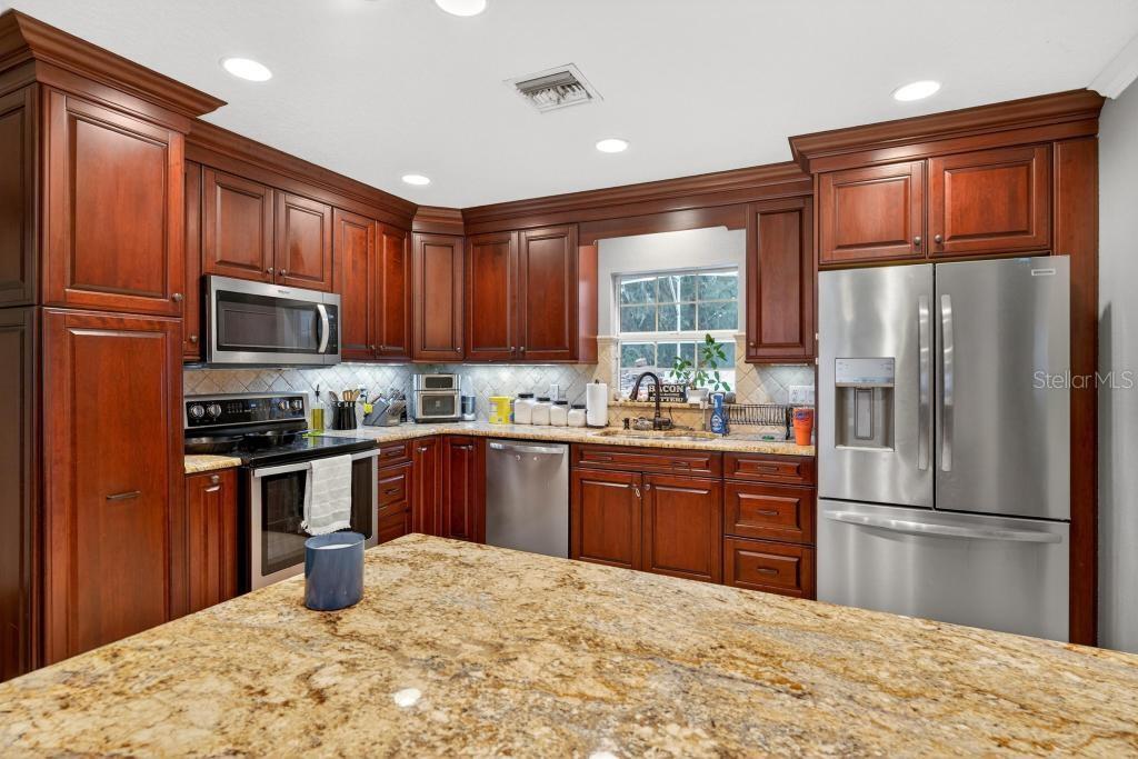 Assumable mortgage is available for this stunning residence in a highly desirable, well-established neighborhood, offering luxury upgrades, accessibility, and resort-style outdoor living. This magnificent 3 bedrooms, 2 baths, 3,500 sq ft residence sits on an extra-large, fully fenced lot with everything thoughtfully designed on one level for easy, comfortable living. Recent upgrades include a new roof installed last year, new central air conditioning, a new gas tankless hot water heater completed in 2025. The interior shines with real wood floors throughout, crown molding, upgraded baseboards, and extra-wide doors with smooth wood-to-tile transitions—designed for comfortable accessibility and barrier-free movement for persons with disabilities. The grand master suite features a spacious walk-in closet (newly customized in 2025) and a luxurious master bath with an upgraded shower package, including a large frameless open glass shower and premium finishes. Additional living spaces include a formal living area with fireplace, formal dining area, spacious family room, casual dining nook, and wet bar. The custom kitchen offers an open concept with timeless cherry wood cabinetry matched throughout the home, abundant storage, contrasting dark granite countertops on the bar and island, a large standalone island, and a breakfast area that overlooks the backyard. Step outside to your private resort-style oasis: a huge sparkling pool surrounded by an expansive paved deck—perfect for entertaining and enjoying Florida's long, sunny months. Perfection, value, and location all in one—this sought-after area is poised for growth with schools, shopping, dining, and much more nearby. Schedule your private showing today!