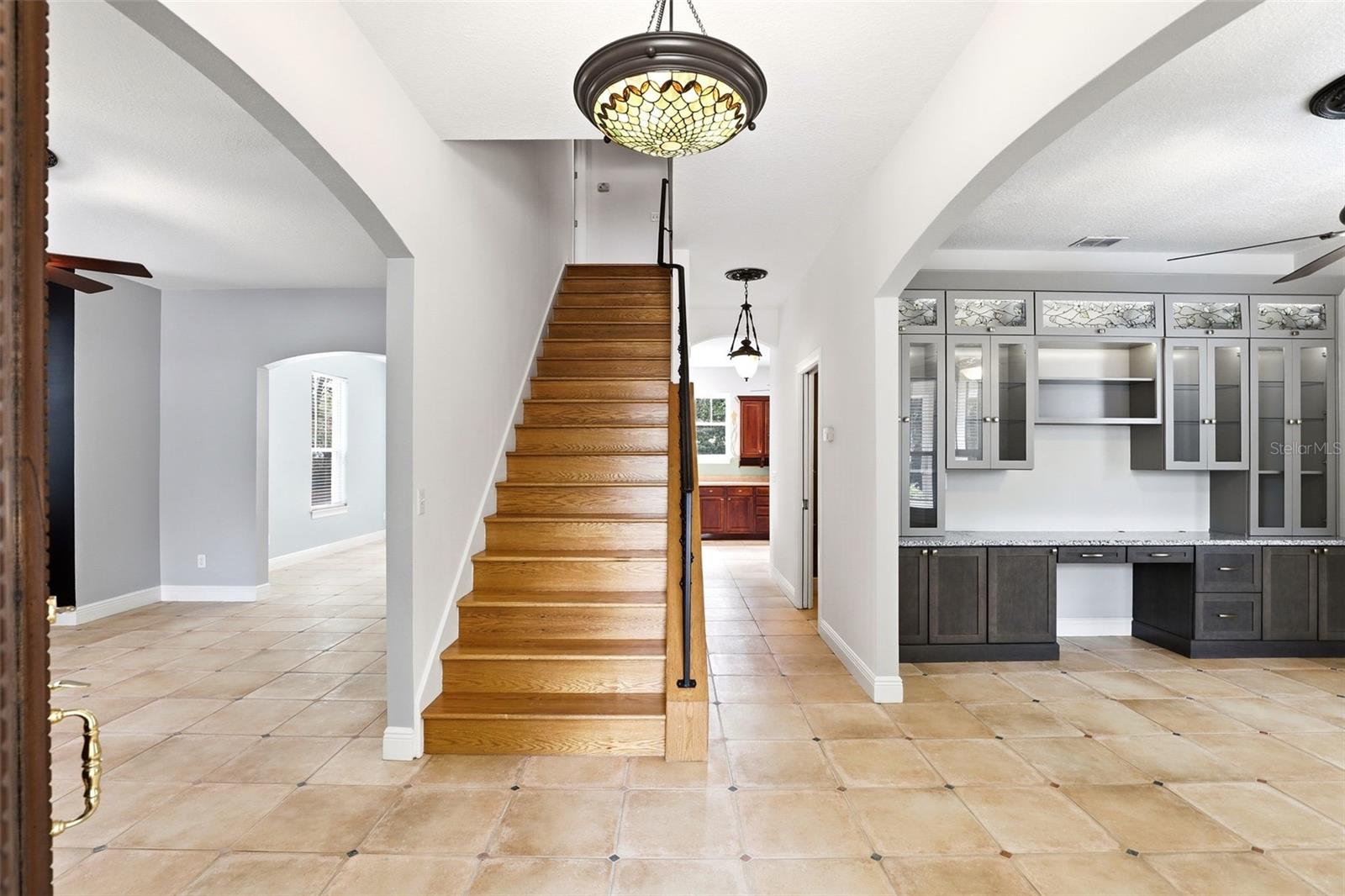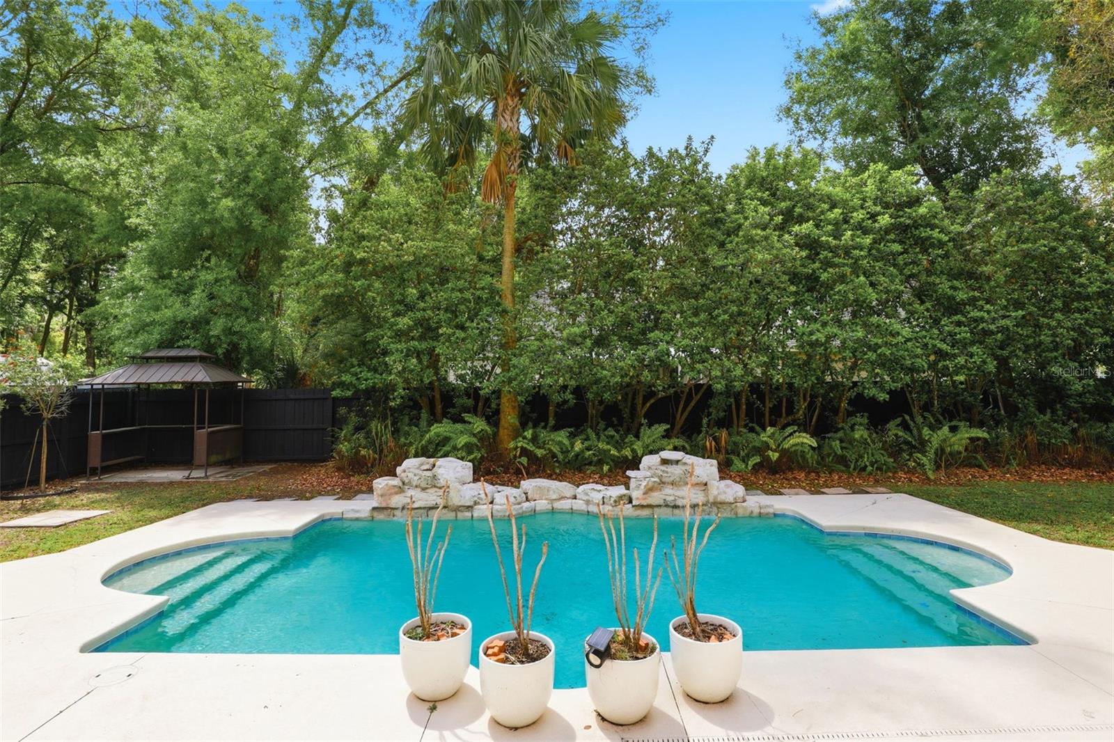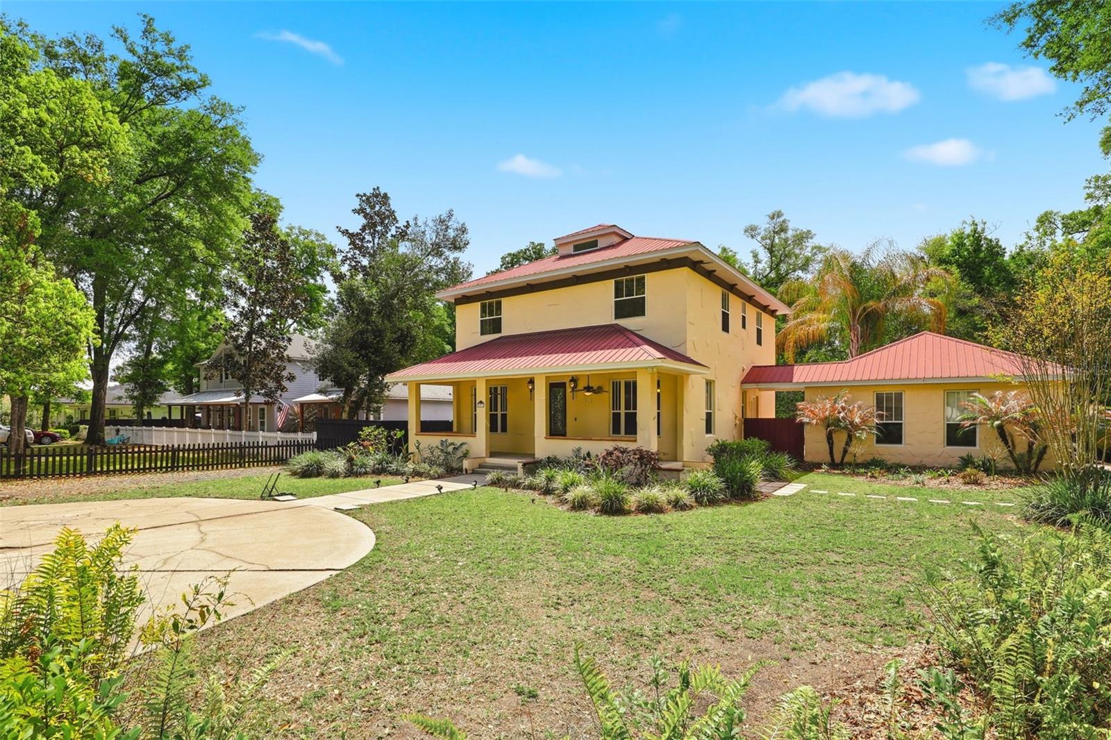 Welcome to 289 Garden Street in Lake Helen. Situated on an oversized corner lot, this 3BR/2.5BA home offers nearly 2,400 sq ft of living space, over 3,300 sq ft under roof, a two-car garage under air, and an in-ground heated pool. Located just outside the historic district with no HOA, Lake Helen is known for quiet streets and low-density living, just minutes from DeLand with easy access to I-4. Mediterranean-inspired and built with concrete block, stucco, and a durable metal roof, the home features a circular driveway, second side entrance drive to the garage, and space for boat or RV parking. A large front veranda overlooks mature landscaping. Inside, enjoy tile and hardwood floors, a custom entry door, and a functional layout with foyer, half bath, office/den with built-ins, family room with propane fireplace, dining room, spacious kitchen, and laundry room with second-floor chute. French doors lead to a covered lanai and a fully fenced backyard with an expansive pool deck and rock waterfall feature. Upstairs offers three bedrooms, including a large primary suite with dual ensuite baths, soaking tub, separate shower, and walk-in closet. A third full bath serves additional bedrooms. Recently upgraded with new landscaping sprinkler system, pool heater, fencing. Features include a built-in home office, garage floor coating, and a split HVAC system in the garage. A rare blend of character, functionality, and Florida living in a well-designed setting.