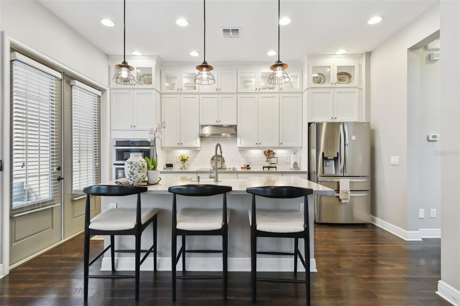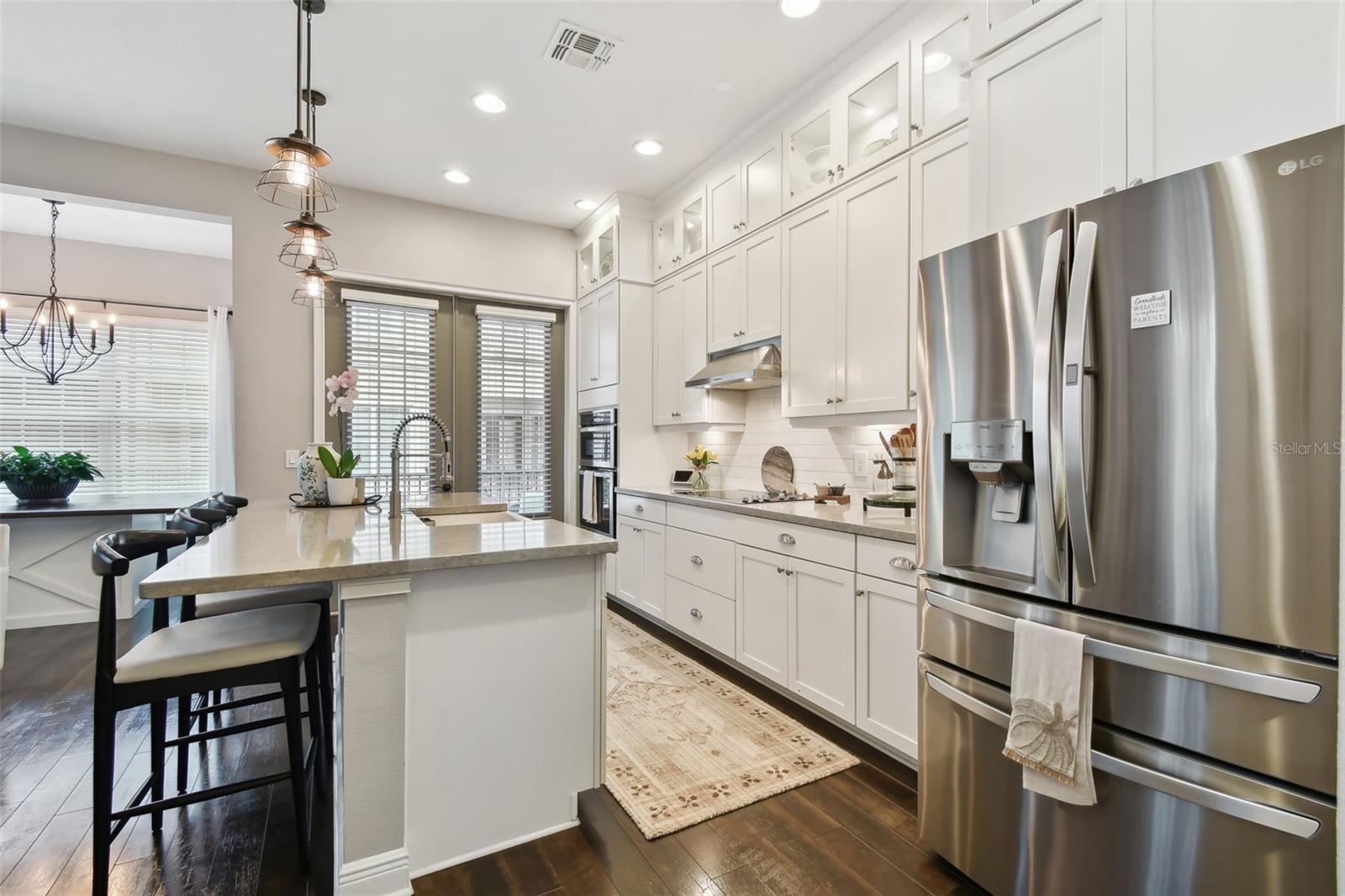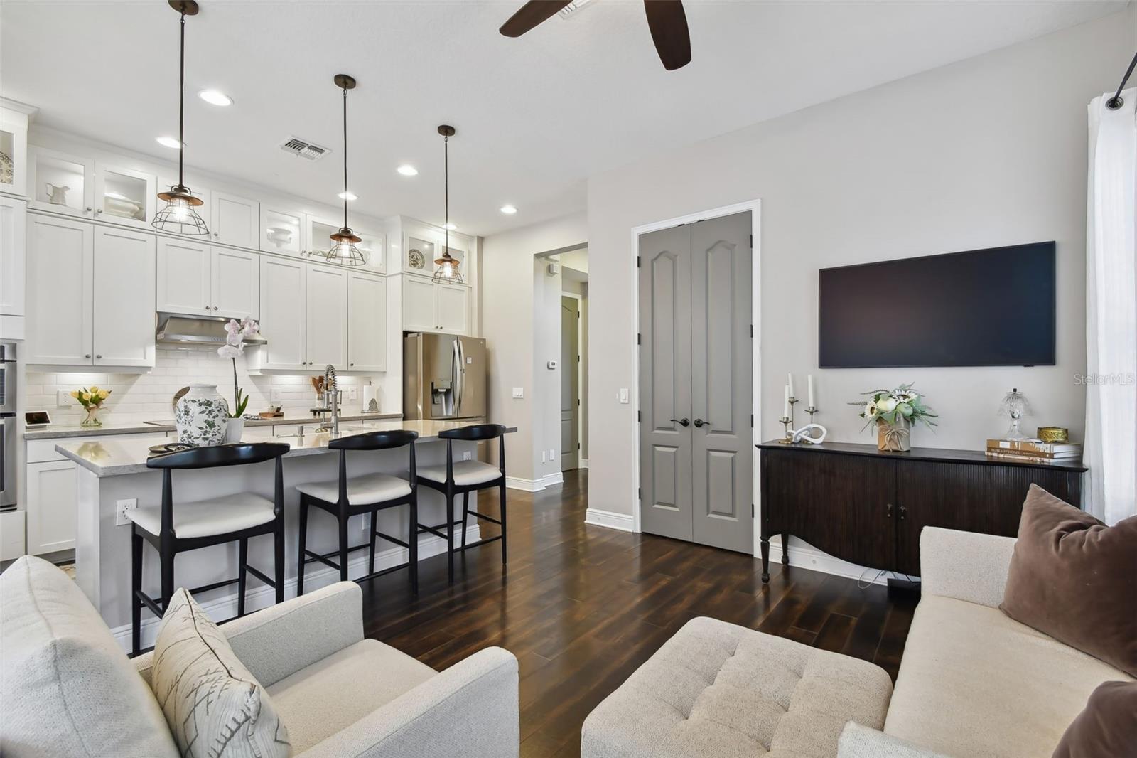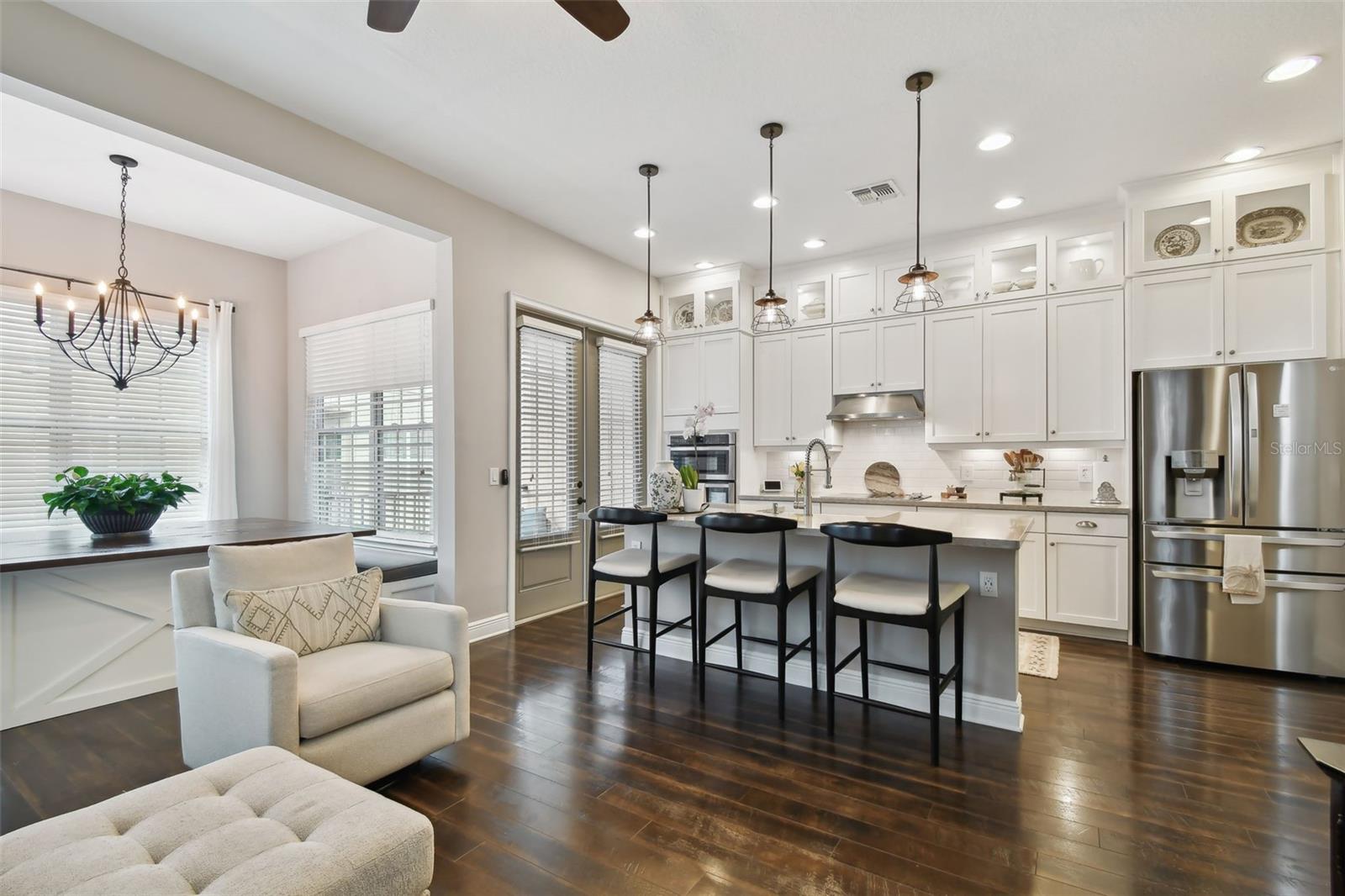 Do you need and in-law suite right on the first floor? then we got it for you! Don't miss this opportunity and shedule your private viewing first! Welcome to Fountain Parke at Lake Mary. This 4 bedroom, 3 and a half bath is located on a premium lot, just steps away from the community clubhouse, pool, tennis courts and guest parking. This end unit home allows for great natural light and is full of upgrades from the moment you walk through the door! As you travel through the home, you will notice the shiplap walls, wood floors and stair risers, the custom built-ins completed by a local carpenter and the 10'ceilings and 8' doors. The gourmet kitchen comes equipped with a built-in convection oven, microwave and glass cooktop as well as quartz countertops, 42 in shaker cabinets with glass uppers and cabinet lighting. Enjoy the cooking island with farm sink and breakfast bar while entertaining family and friends. There is plenty of room for all those get togethers with seating for 12 at the giant custom built-in kitchen table with bench seating or open the French doors and take the get together out on the screened porch/balcony. This home has two master suites one on the first floor with a kitchenette (perfect for in-laws or the returning college kid), the second master suite is located on the third floor with a walk-in closet and en-suite. Two more bedrooms located on the third floor share a Jack & Jill bathroom and have plenty of closet space. The third floor is complete with custom built-ins and office/library nook. Additional upgrades include light fixtures, Bronzed hardware and bathroom/shower fixtures, custom garage flooring, Electrical Vehicle Charger, water softener, home defense pest system and whole house central vac system. The community provides a 24 hour GUARD GATE, fitness center, community pool, tennis courts, playground and dog park. It is conveniently located near Downtown Lake Mary, shopping, restaurants and grocery stores with easy access to I-4 and SR 417. This home is ready for immediately occupancy, we can close in two weeks.