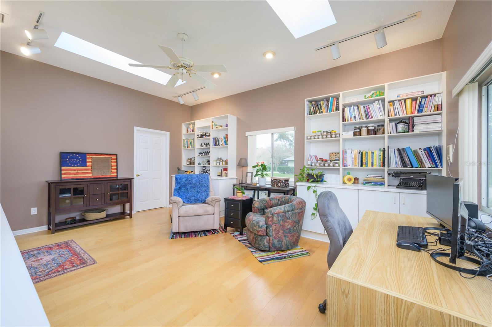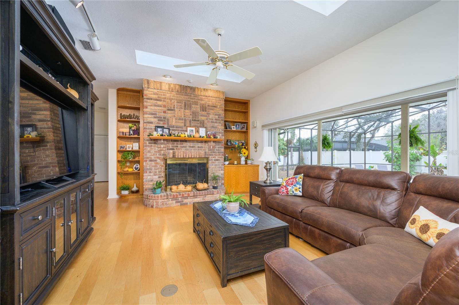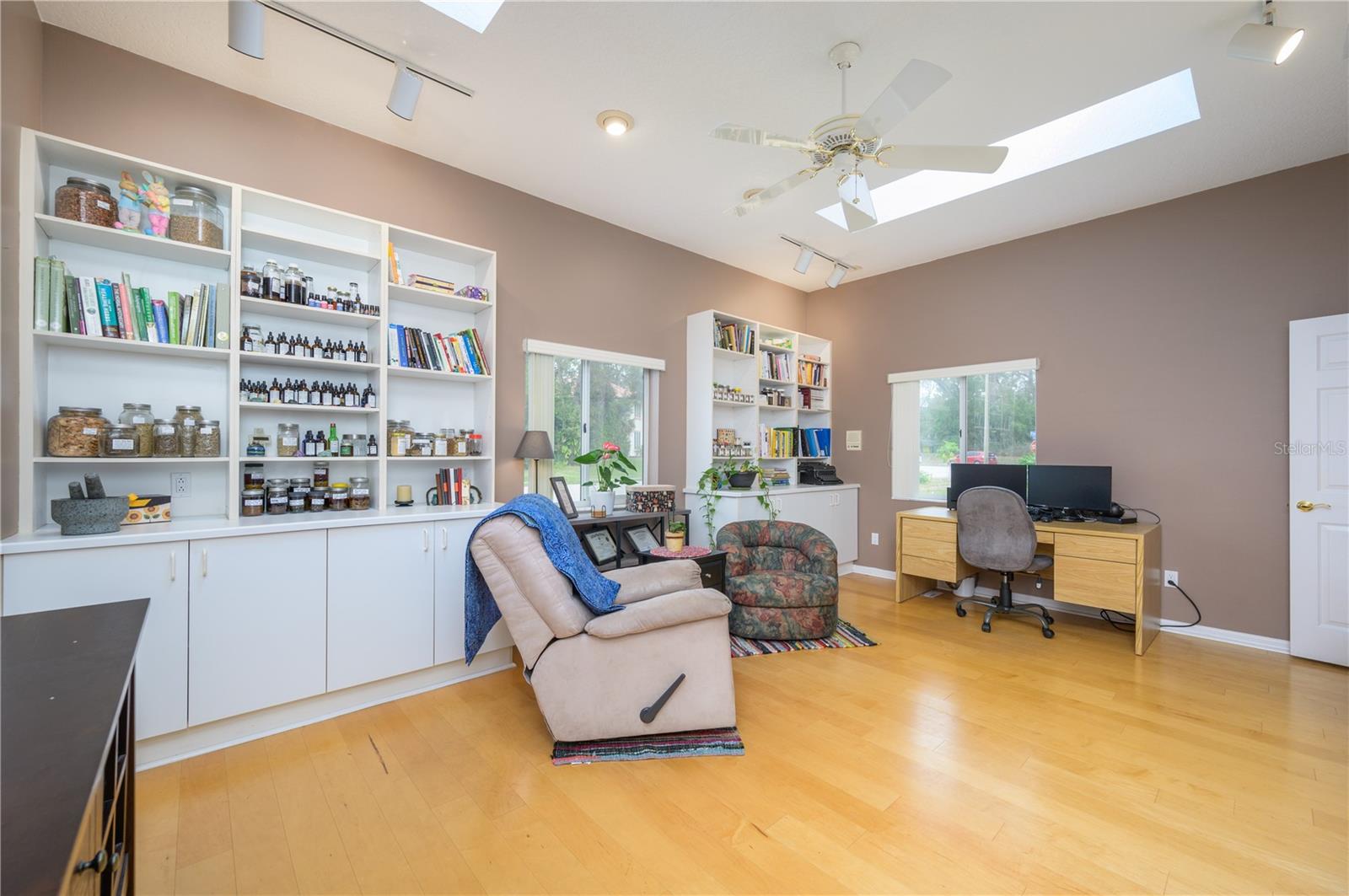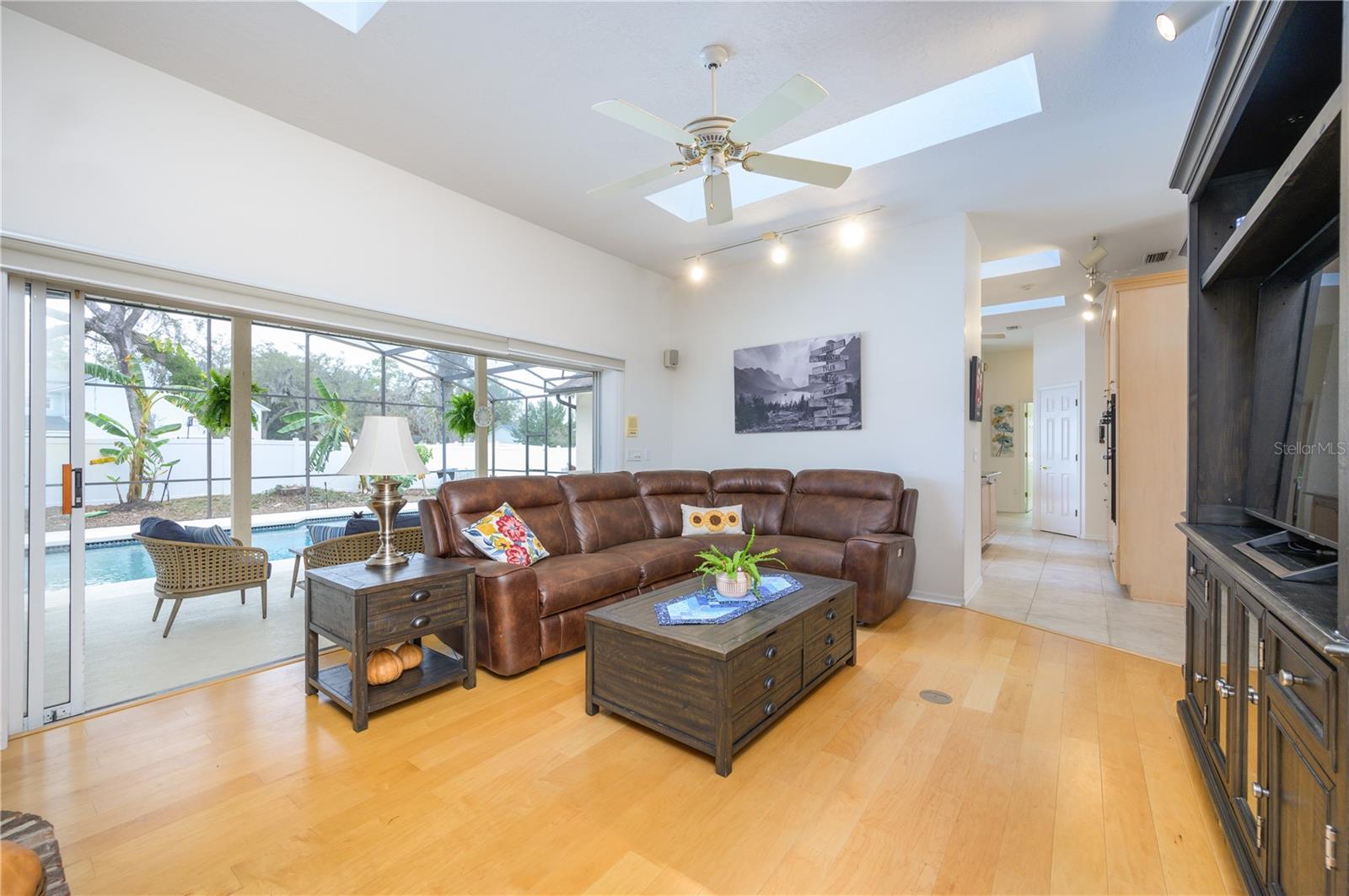Nestled in Cardinal Oaks Cove in sunny Lake Mary, this lovely pool home boasts over 3,000 square feet and five bedrooms. The home is LIGHT and BRIGHT with seven skylights! In addition to the five bedrooms, there is a spacious bonus room perfect for an office space or den in the east wing of the house, right down the hall from the primary bedroom. Three of the other bedrooms are in the west wing of this sprawling home. Centrally located kitchen features double ovens, granite counter tops, island workspace, sink overlooking the pool and lanai walk-in pantry and ample cabinetry. This home is loaded with build ins and storage! The office features wall-to-wall built in cabinets and storage, as does the utility room, and formal dining room. Two of the bedrooms have built in shelving as well. Family room features a brick wood burning fireplace, even more built in cabinetry and shelving and three large sliders that hide into a pocket, opening the space up onto the expansive 48 foot long covered back porch. The solar heated pool has a screen enclosure, child safety barrier and vinyl privacy fence that completely encloses the back yard for added privacy. The side entry garage also has built in storage cabinets! The current owners planted a food forest on the property for the ultimate in Florida friendly, sustainable gardening. Current food forest varieties include: Peach, Plum, Nectarine, Citrus, Moringa, Avocado, Mountain Soursop, sweet potato, Tomato, Mulberry, Sunchoke, Cassava/Yucca, Chaya, Papaya, Banana, Katuk, Muscadine Grapes, Pigeon Pea, Okinawa Spinach, Longevity spinach Cranberry Hibiscus, Roselle, a culinary herb garden and more! This move in ready home won't last, come and see it today!