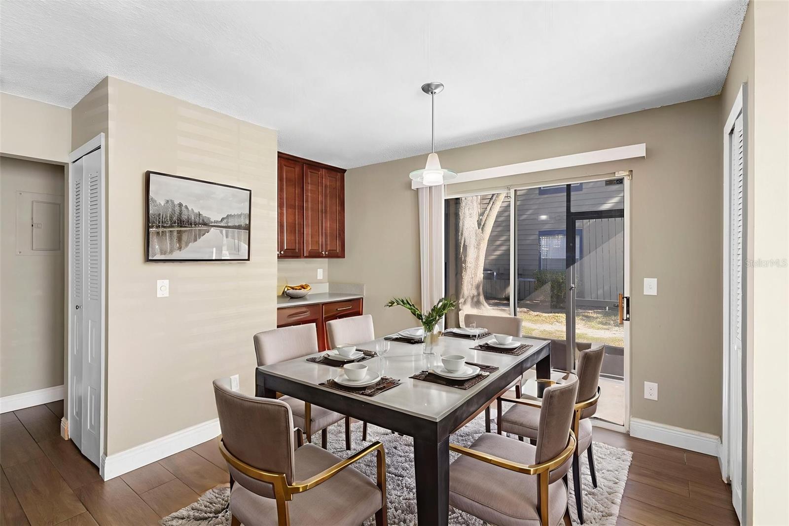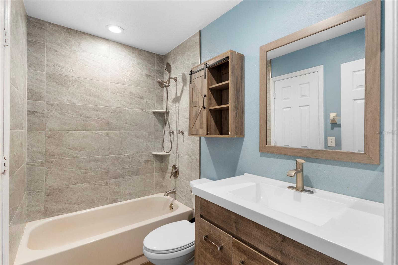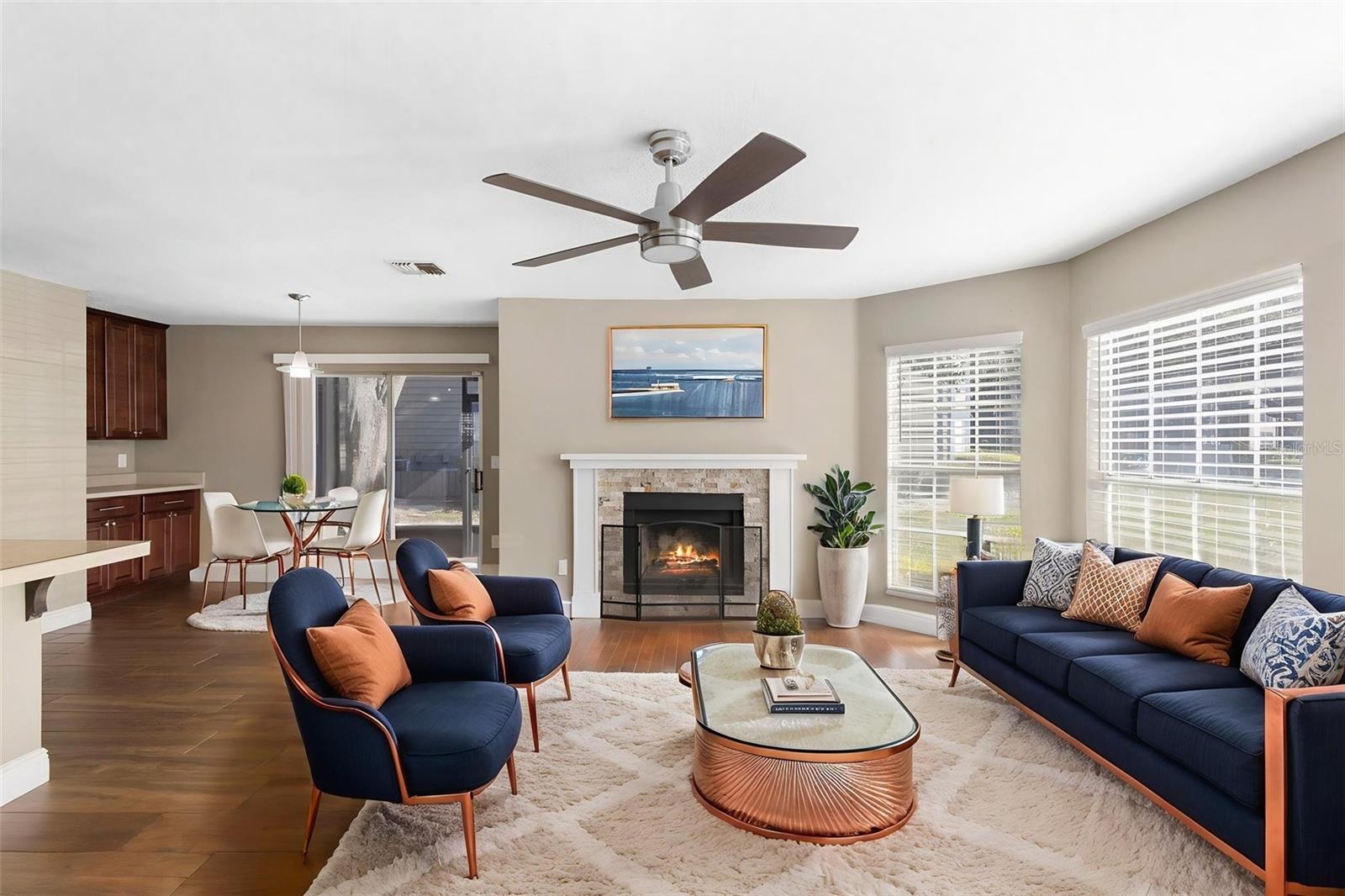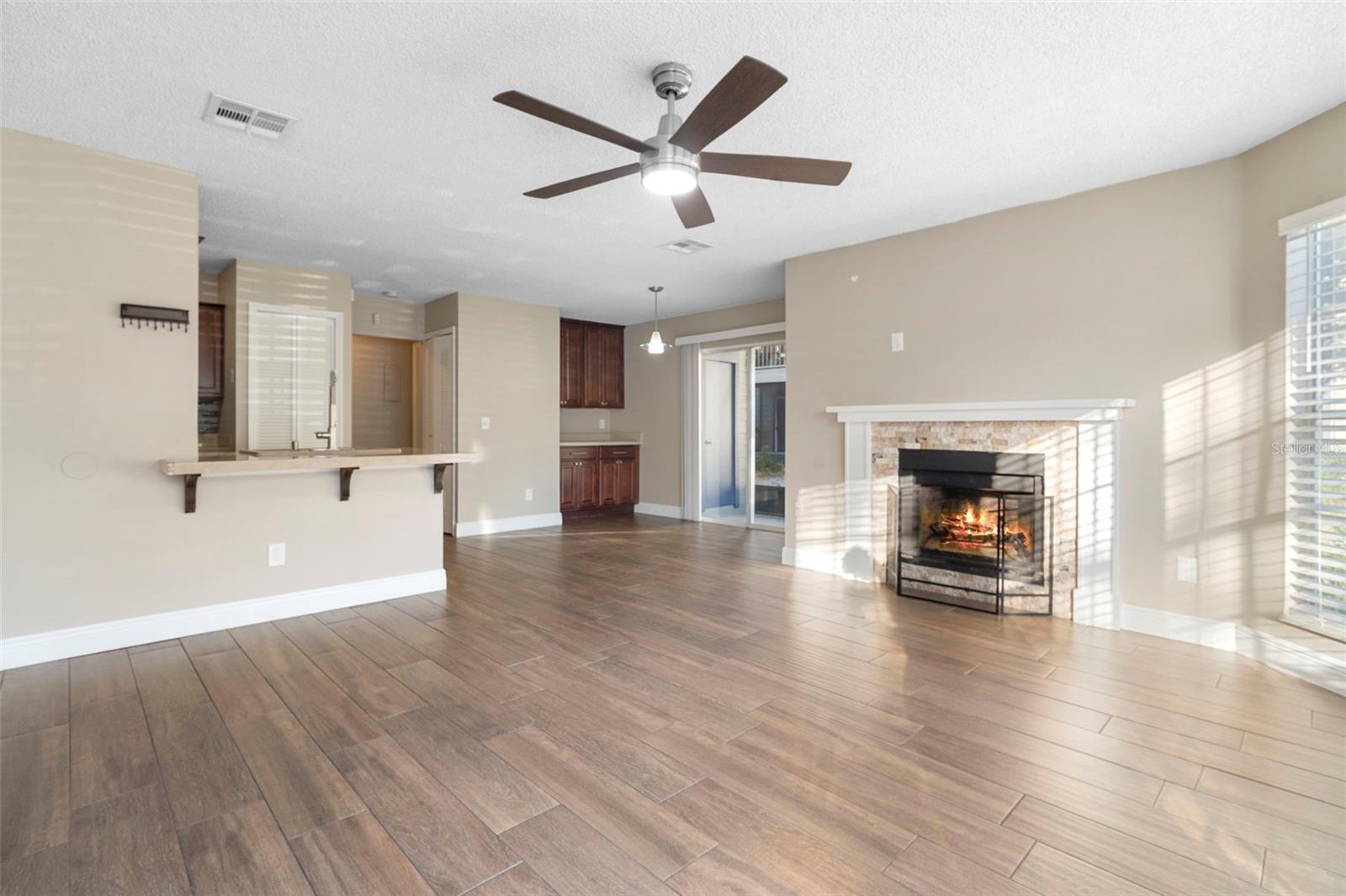 Welcome to easy, LOW-MAINTENANCE LIVING in this beautifully updated FIRST-FLOOR CORNER UNIT located in the park-like Hidden Village community of Lake Mary. This charming, MOVE-IN READY condo features numerous recent upgrades, including wood-look tile flooring throughout, a stylish open kitchen with custom tile countertops, brand-new cabinetry, and added storage ideal for a coffee bar. Both bathrooms have been fully renovated—one showcasing a walk-in shower, new vanity, and tiled walls, while the second bath also offers updated vanities and modern tile finishes. Filled with NATURAL LIGHT, the home boasts VAULTED CEILINGS and an OPEN-CONCEPT living and dining area that creates a bright, airy feel. The living room is anchored by a cozy FIREPLACE, adding warmth and charm, while French doors off the third bedroom lead to a SCREENED-IN LANAI, perfect for relaxing and enjoying the peaceful surroundings bug-free. Additional upgrades include a NEW water heater, dishwasher, and brand-new ceiling fans in every room, offering comfort and peace of mind. Residents of Hidden Village enjoy mature landscaping, a COMMUNITY POOL, and a tranquil, well-maintained setting, all just minutes from 417, I-4, and Lake Mary Boulevard with easy access to shopping, dining, and everyday conveniences. Stylish, updated, and perfectly positioned, this first-floor condo is a standout opportunity in one of Lake Mary’s most desirable locations. Schedule your private tour today and fall in love with your HOME SWEET HOME! Seller may consider buyer concessions. Some pictures are virtually staged.