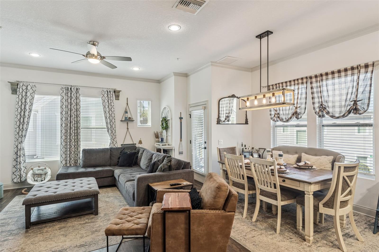 Enjoy the WORK, LIVE, PLAY lifestyle in this stunning end-unit luxury townhome located in the highly sought-after Griffin Park community in Lake Mary. Featuring modern farmhouse architecture and a thoughtfully designed reverse living floor plan across three levels, this beautifully appointed home offers exceptional style, functionality, and flexibility. Upon entering through your private gated courtyard, you are welcomed by stylish upgrades including crown molding, five-panel interior doors, upgraded light fixtures, and easy-to-maintain Mohawk laminate wood-look flooring throughout the main living areas. The first floor features a versatile flex space ideal for a home office, study, or fitness room, along with an additional bedroom and a full bathroom. The hallway leads to extra storage closet, drop off zone and a rear-facing full-sized two-car garage with garage door opener. The second floor offers a bright and open living space designed for both everyday living and entertaining. The upgraded kitchen boasts stainless steel appliances, a built-in microwave and wall oven, a 5-burner cooktop, 42-inch cabinetry, stunning quartz countertops, pantry, and a large island with plenty of seating. The kitchen flows seamlessly into the dining and living areas and opens to a private balcony, creating the perfect gathering space. A conveniently located powder room and laundry room are also on this level. The spacious primary suite serves as a relaxing retreat, complete with a walk-in closet and an ensuite bathroom featuring dual sinks and a large, tiled walk-in shower with a frameless glass enclosure. The third floor offers a generous bonus retreat with a closet that can easily function as a third bedroom, media room, playroom, game room, or additional office—providing incredible flexibility for today’s lifestyle. Additional highlights include a small fenced front yard space perfect for pets or relaxing outdoors, as well as recent upgrades including a new dryer (2024), washer (2025), dishwasher (2025), and professionally installed window tint (2025) for enhanced comfort and energy efficiency. Griffin Park is an upscale gated community ideally located between the Lake Mary Business Corridor and downtown Lake Mary. Residents enjoy resort-style amenities including a community pool with a cabana space, dog park, and legacy lawn perfect for entertaining a large group or setting up your fire pit for the evening. You’ll have easy access to shopping, dining, fitness, and self-care services, with convenient access to major highways and toll roads. The home is also zoned for Seminole County’s highly rated A schools. Meticulously maintained and filled with thoughtful upgrades throughout, this home truly shows like a model. Schedule your private showing today—this home is a must see.