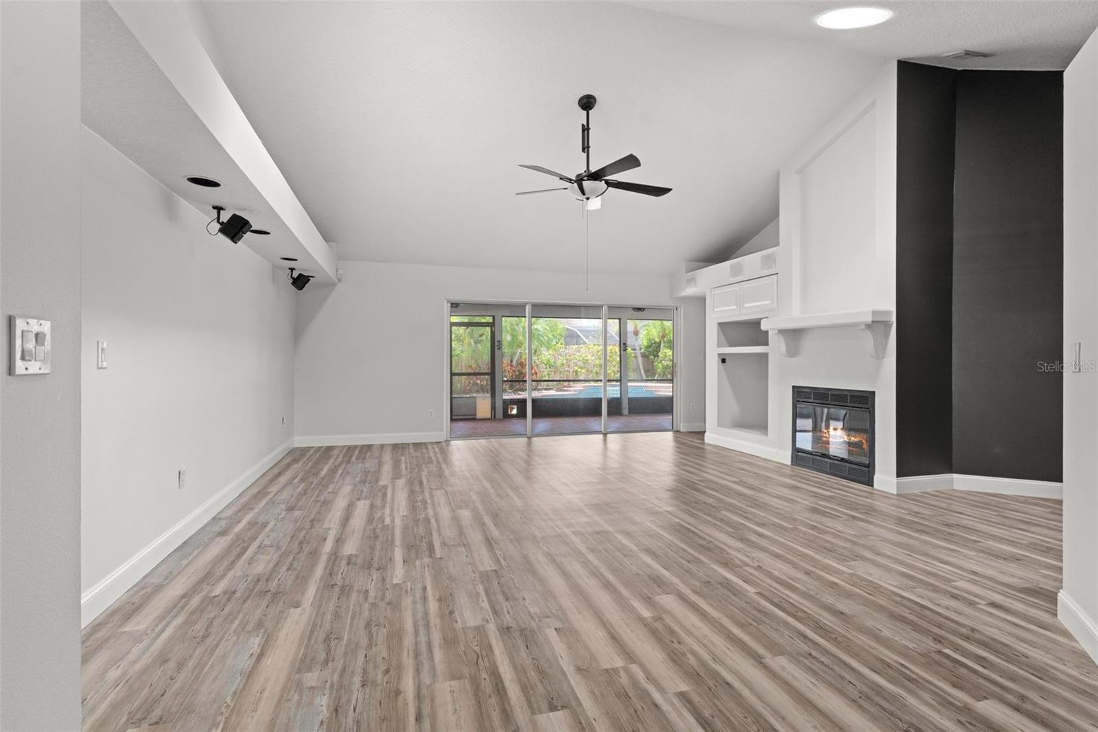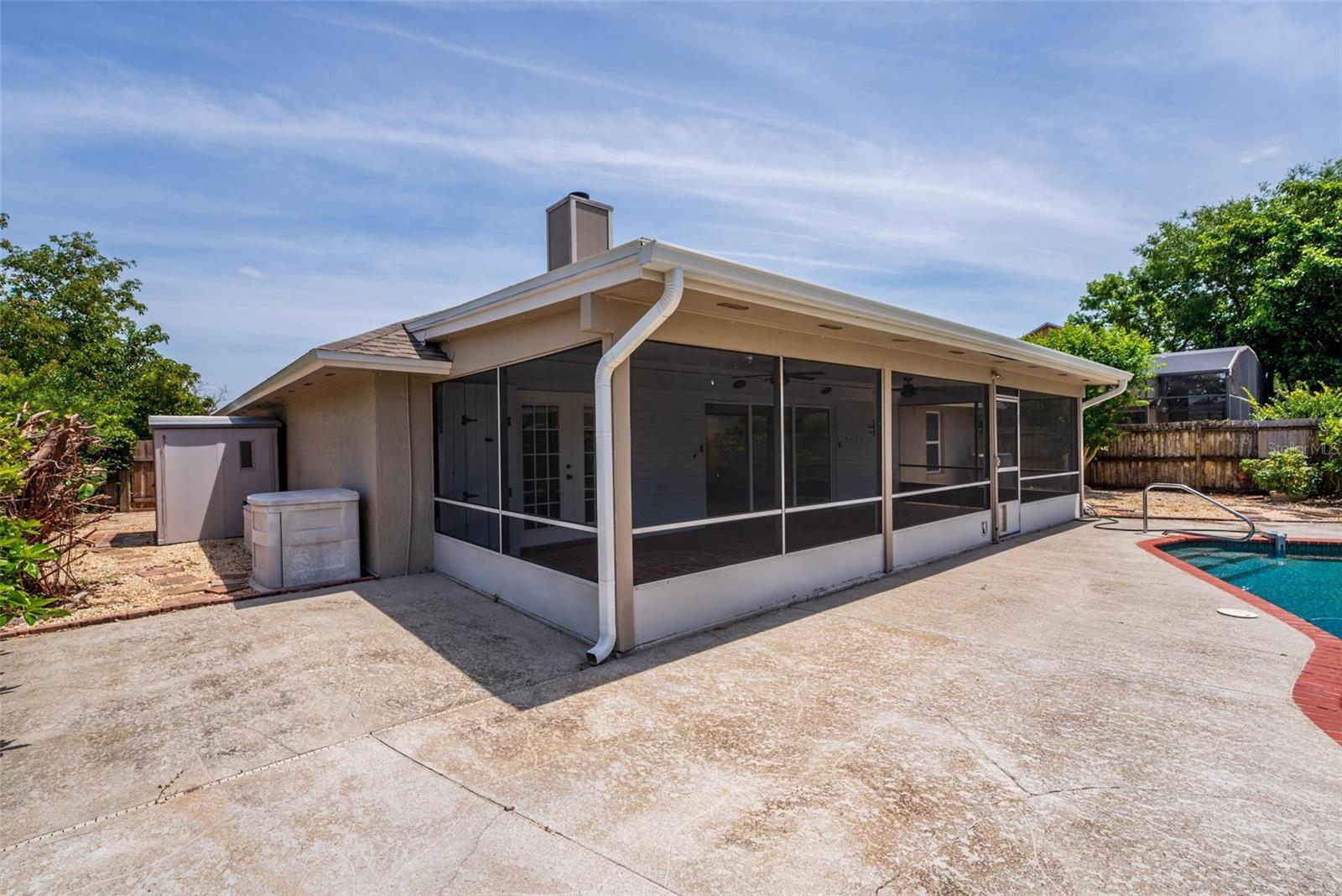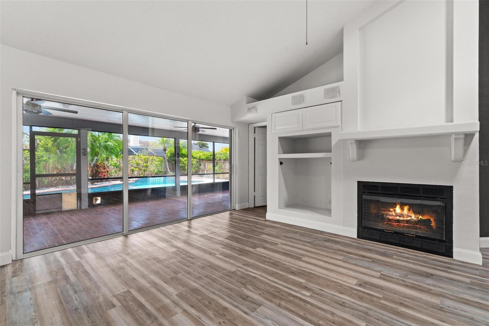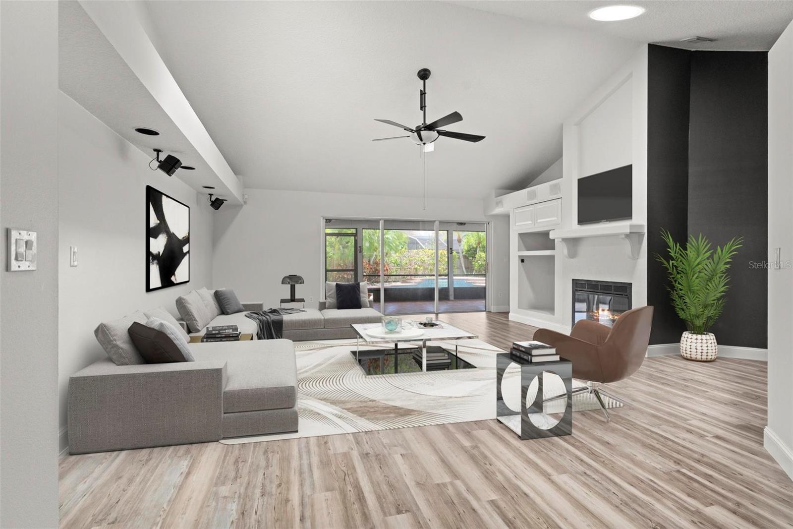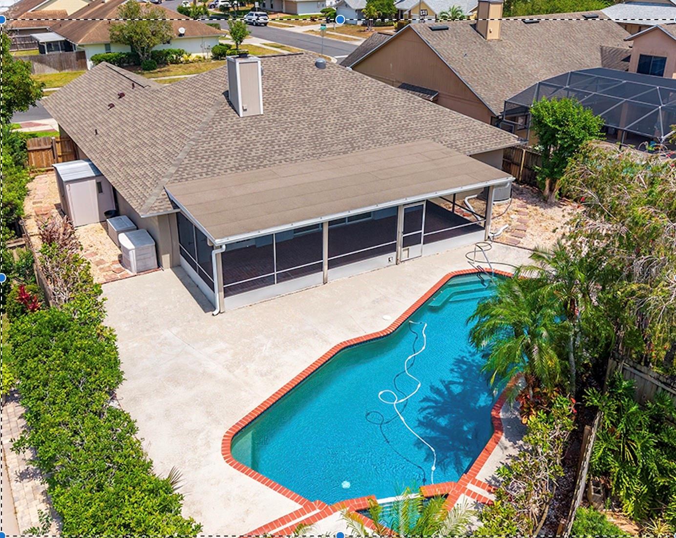 One or more photo(s) has been virtually staged. Nestled in the desirable Lakewood at the Crossings community, this meticulously maintained 4-bedroom, 2-bathroom pool home offers a serene retreat with modern amenities. The home features a split floor plan, providing privacy and comfort for all residents. The expansive living room boasts high ceilings, a wood-burning fireplace, and built-in surround sound, creating an inviting atmosphere. Sliding doors lead to an enclosed patio that overlooks a lush, tropical pool area, perfect for relaxation and entertaining. The spacious primary suite features French doors that open to the enclosed patio, offering pool views. The ensuite bathroom is a spa-like haven, complete with an upgraded double vanity with granite counters, modern lighting, and faucets. Two separate step-in closets provide generous storage, and the updated step-in shower includes a rain shower head and multiple shower options for a luxurious experience. NEWER ROOF (April 2022) HVAC (2015) with newer compressor, blower & A frame coil (2017), Water softener (2019), Exterior paint Sherwin Williams (2017), Dual Pane Low E windows (2006). Conveniently located just minutes from top rated schools,