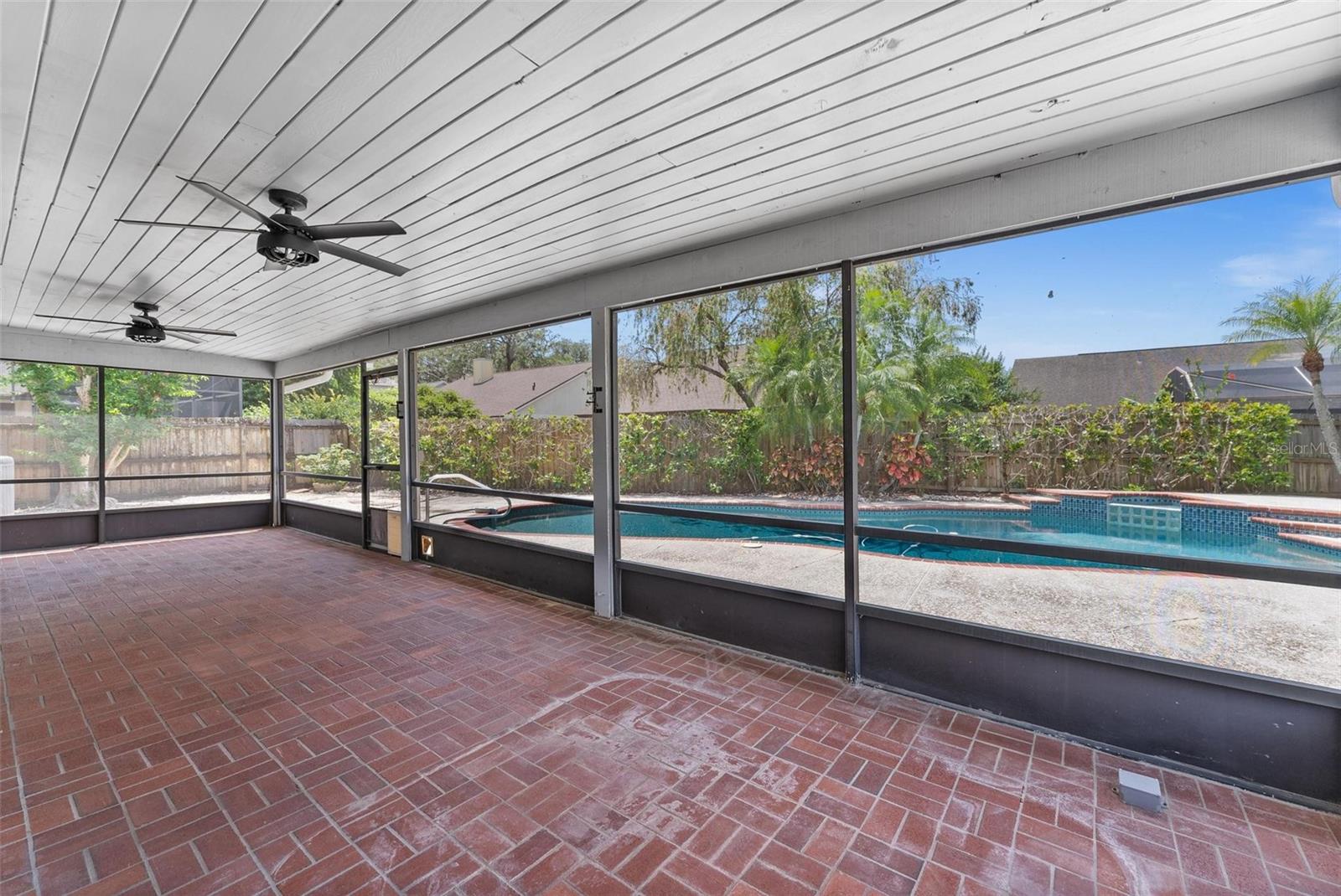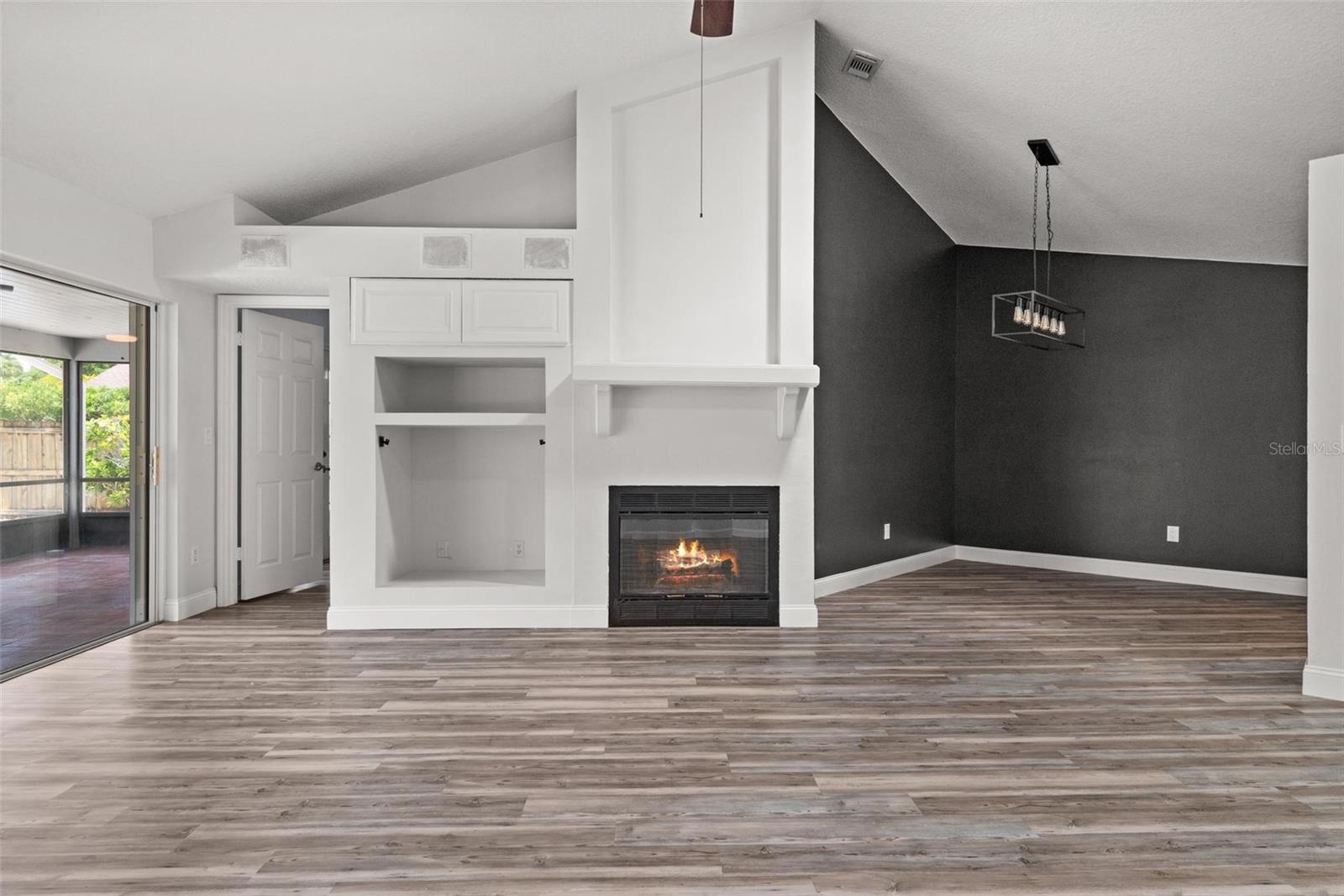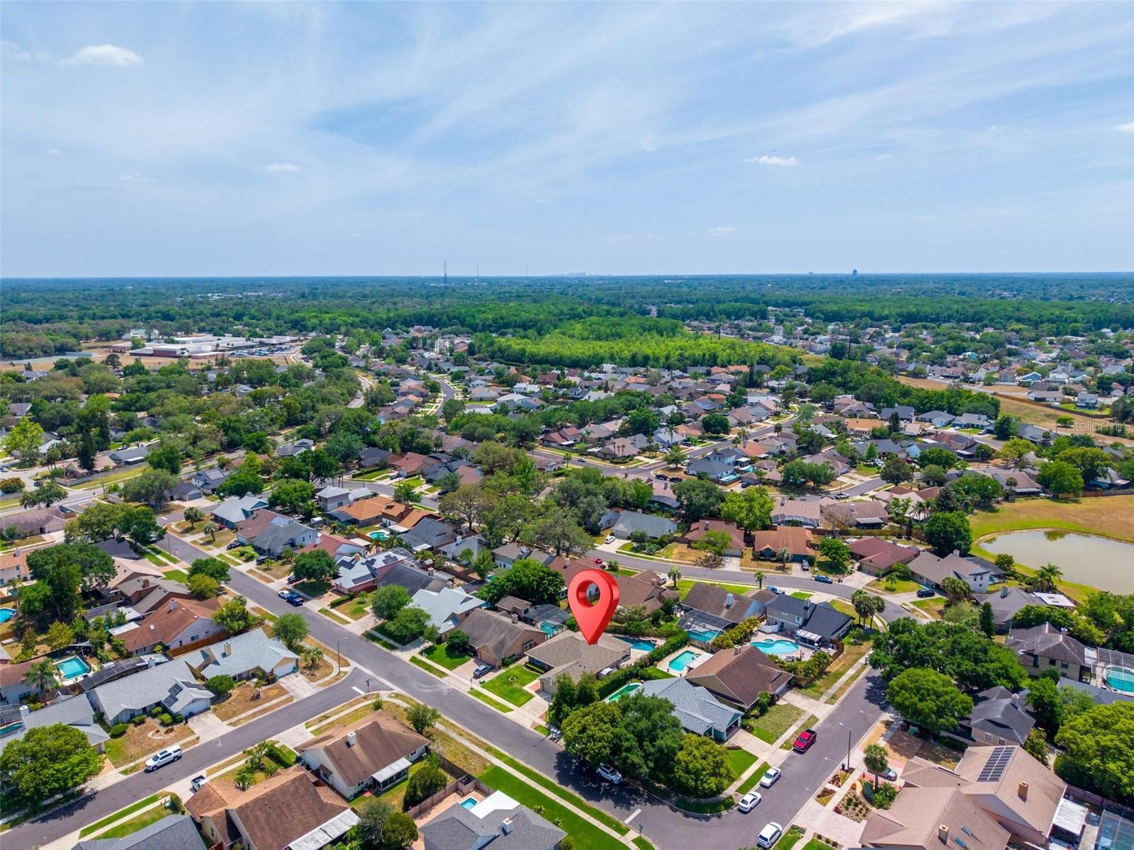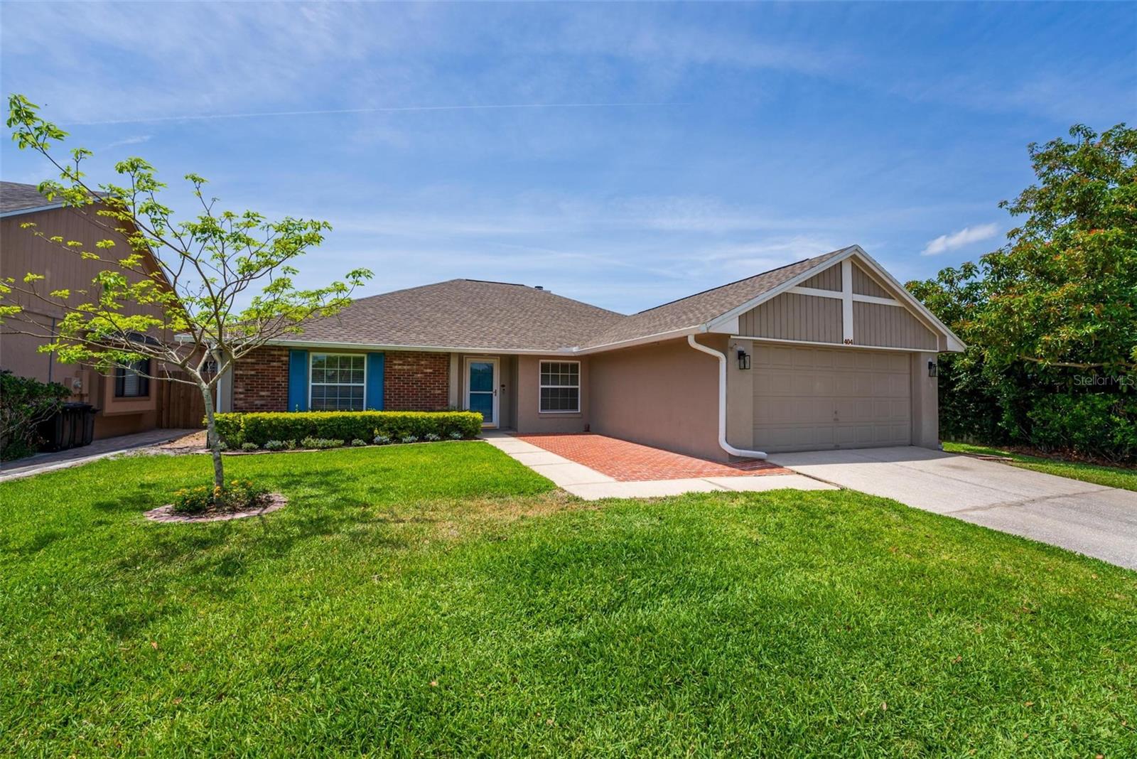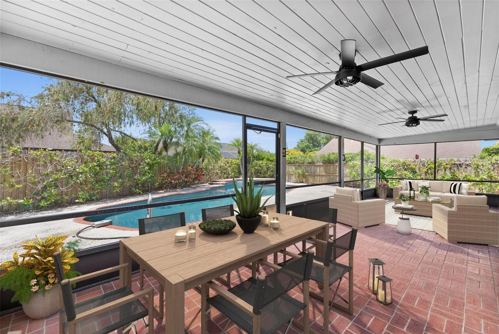 One or more photo(s) has been virtually staged. Nestled in the desirable Lakewood at the Crossings community, this meticulously maintained 4-bedroom, 2-bathroom pool home offers a serene retreat with modern amenities. The home features a split floor plan, providing privacy and comfort for all residents. The expansive living room boasts high ceilings, a wood-burning fireplace, and built-in surround sound, creating an inviting atmosphere. Sliding doors lead to an enclosed patio that overlooks a lush, tropical pool area, perfect for relaxation and entertaining. The spacious primary suite features French doors that open to the enclosed patio, offering pool views. The ensuite bathroom is a spa-like haven, complete with an upgraded double vanity with granite counters, modern lighting, and faucets. Two separate step-in closets provide generous storage, and the updated step-in shower includes a rain shower head and multiple shower options for a luxurious experience. NEWER ROOF (April 2022) HVAC (2015) with newer compressor, blower & A frame coil (2017), Water softener (2019), Exterior paint Sherwin Williams (2017), Dual Pane Low E windows (2006). Conveniently located just minutes from top rated schools,