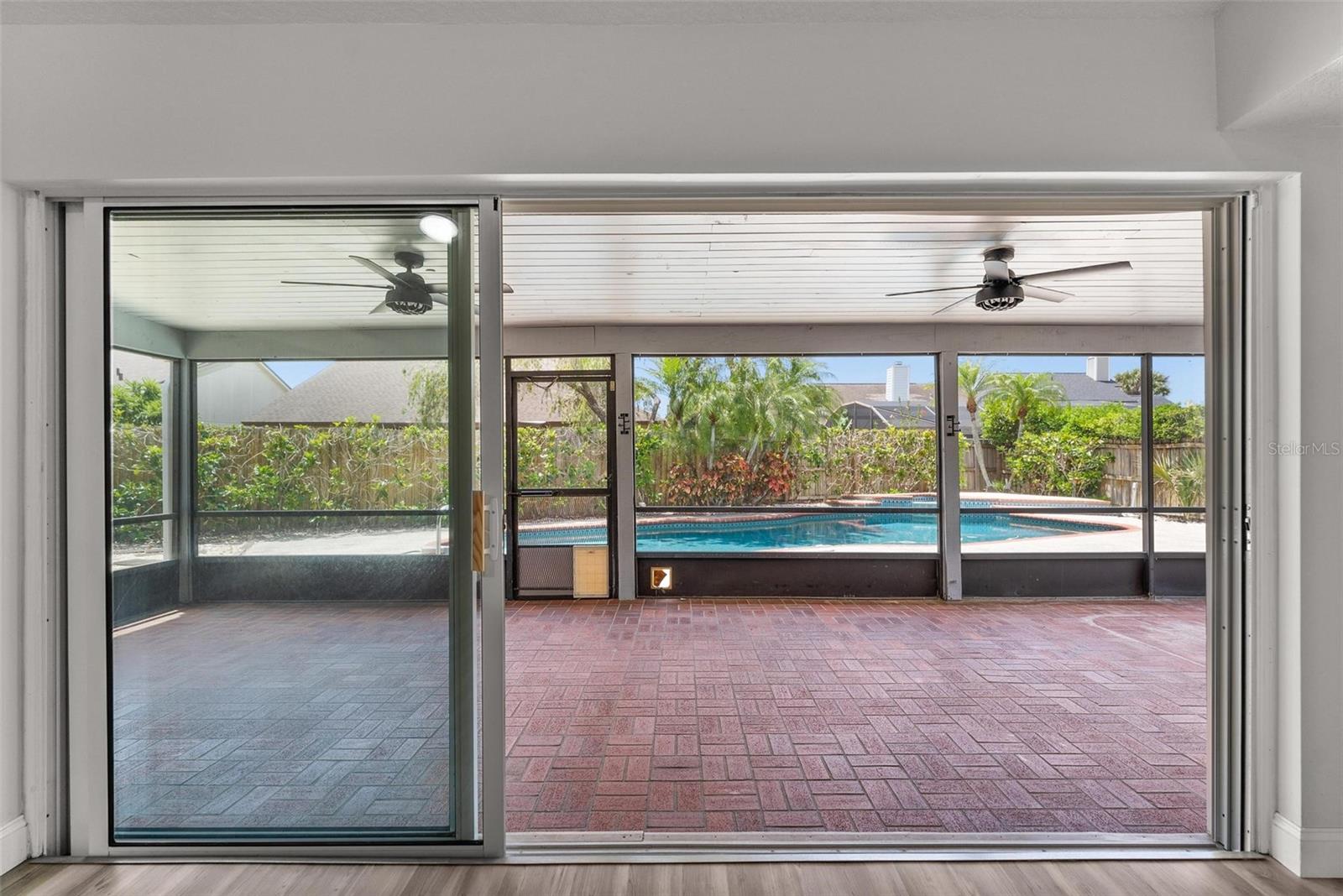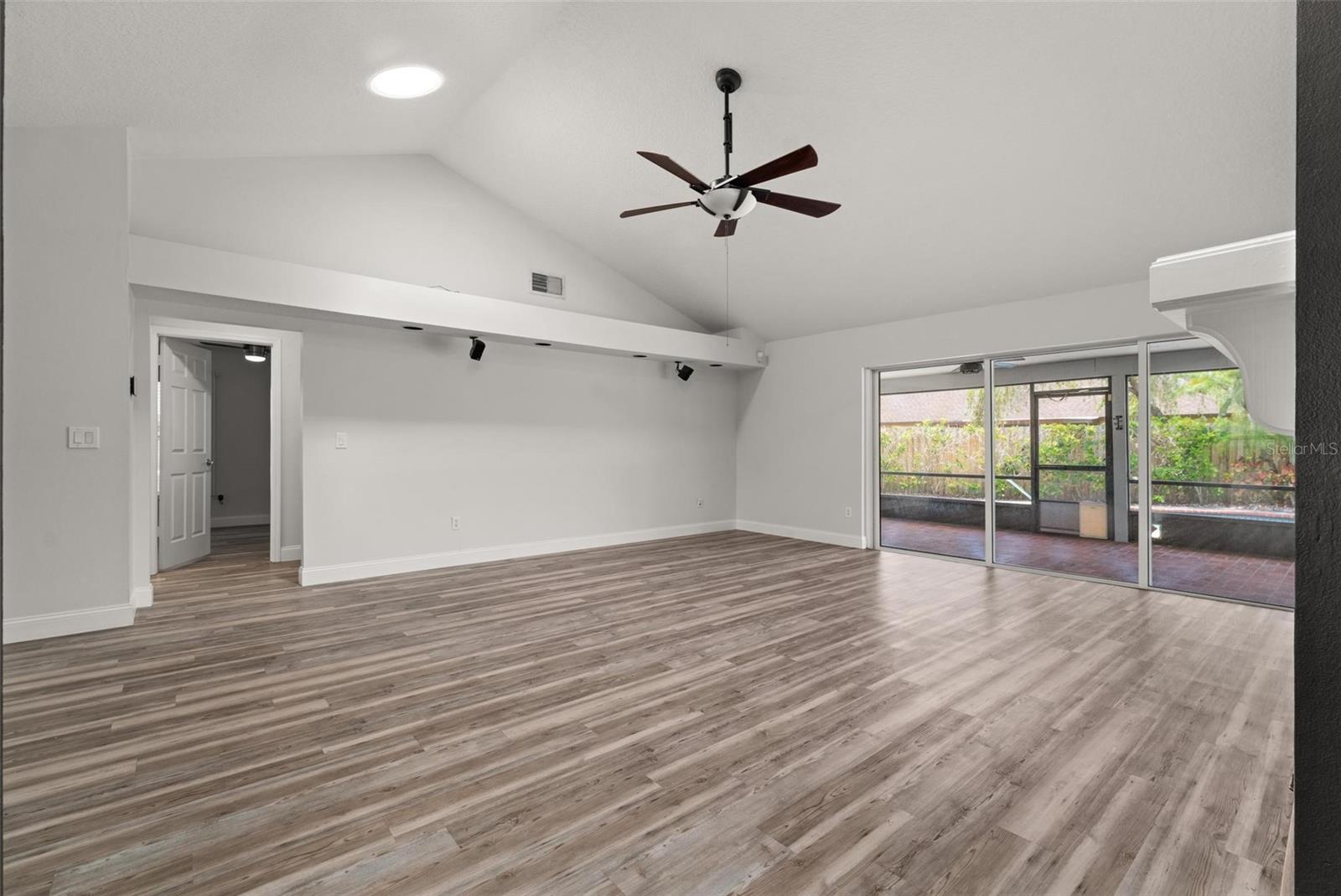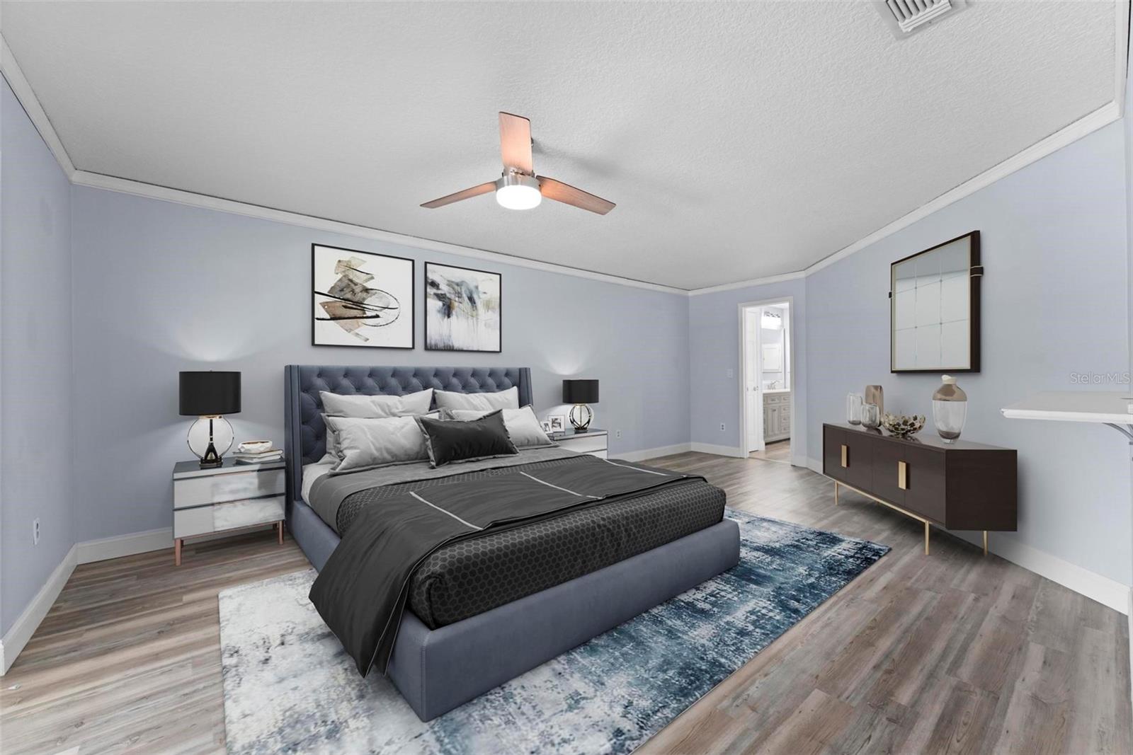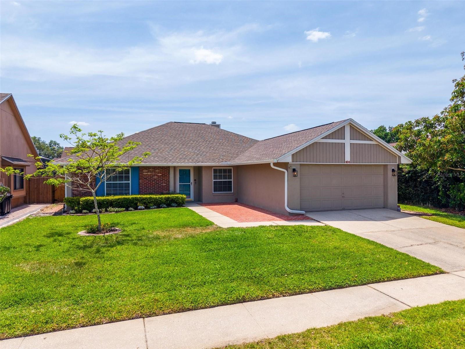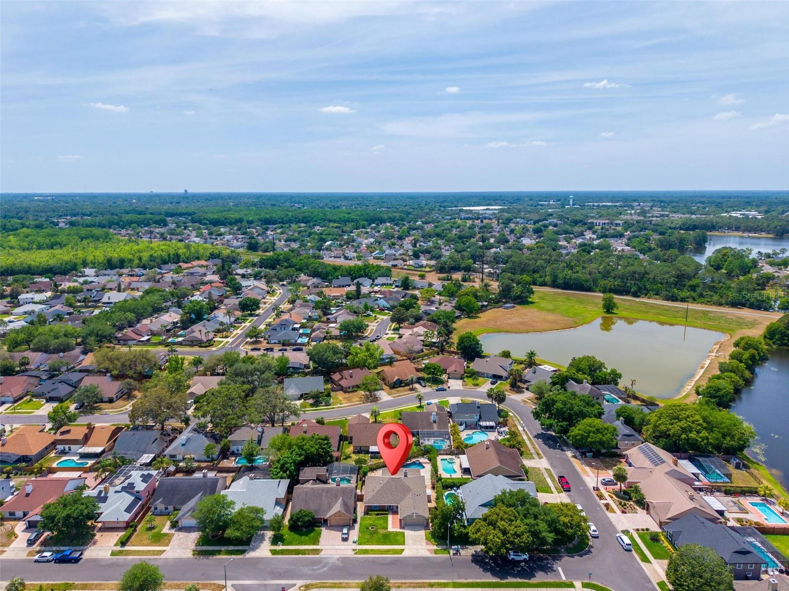 One or more photo(s) has been virtually staged. Nestled in the desirable Lakewood at the Crossings community, this meticulously maintained 4-bedroom, 2-bathroom pool home offers a serene retreat with modern amenities. The home features a split floor plan, providing privacy and comfort for all residents. The expansive living room boasts high ceilings, a wood-burning fireplace, and built-in surround sound, creating an inviting atmosphere. Sliding doors lead to an enclosed patio that overlooks a lush, tropical pool area, perfect for relaxation and entertaining. The spacious primary suite features French doors that open to the enclosed patio, offering pool views. The ensuite bathroom is a spa-like haven, complete with an upgraded double vanity with granite counters, modern lighting, and faucets. Two separate step-in closets provide generous storage, and the updated step-in shower includes a rain shower head and multiple shower options for a luxurious experience. NEWER ROOF (April 2022) HVAC (2015) with newer compressor, blower & A frame coil (2017), Water softener (2019), Exterior paint Sherwin Williams (2017), Dual Pane Low E windows (2006). Conveniently located just minutes from top rated schools,