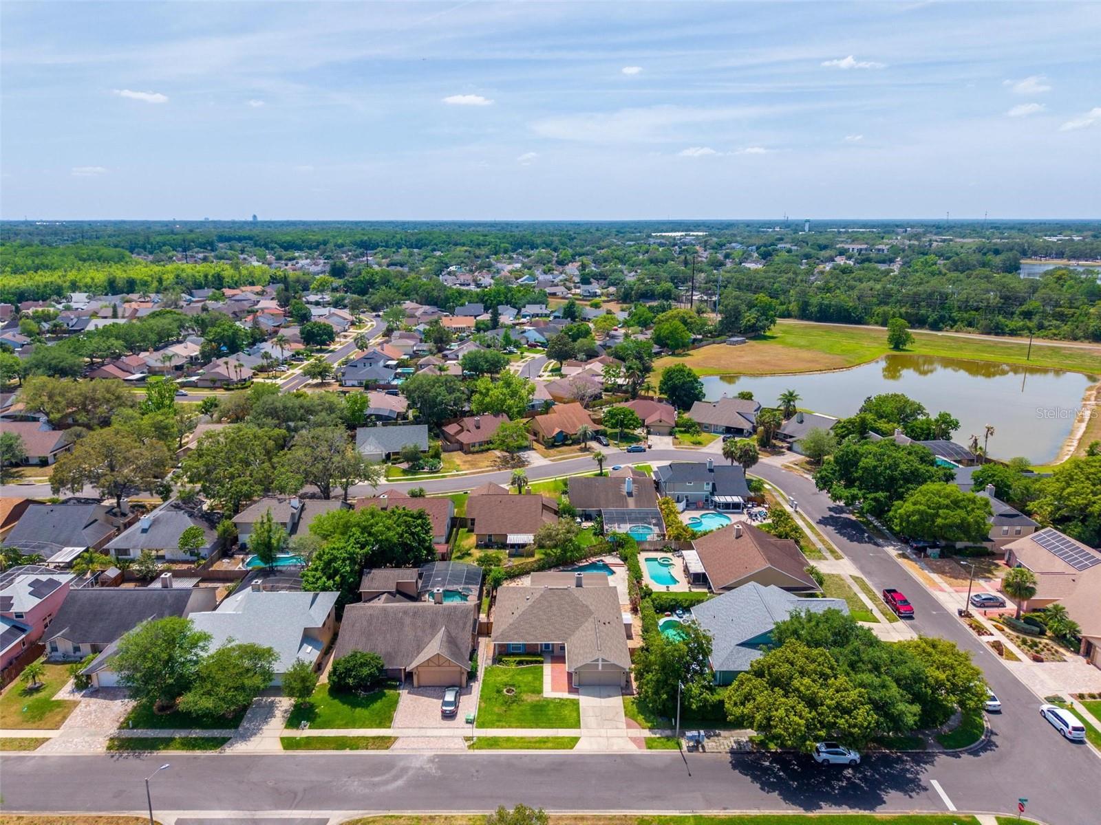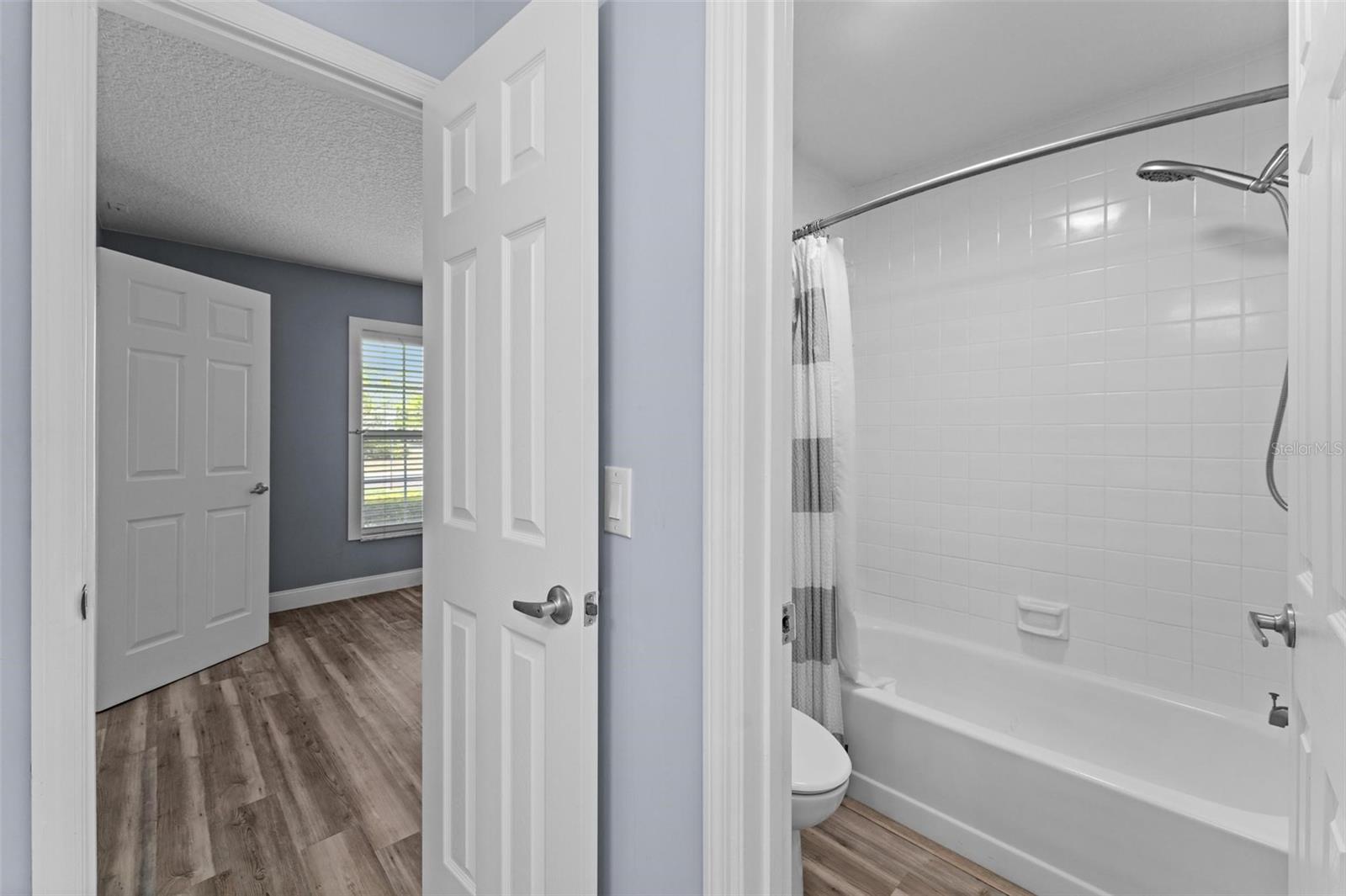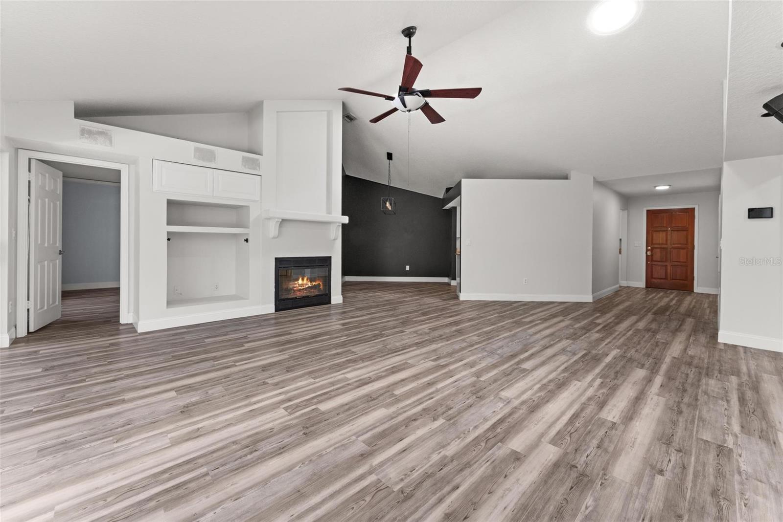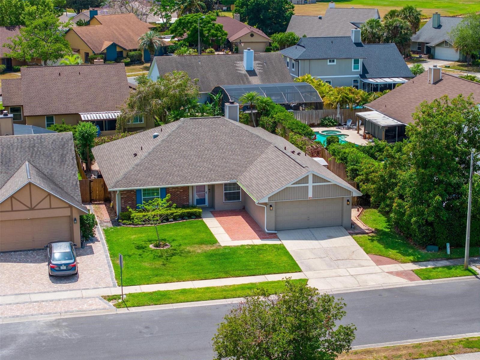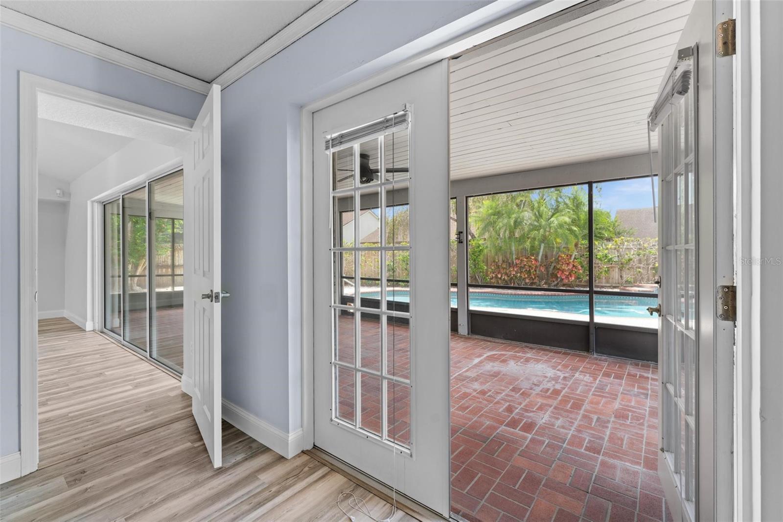 One or more photo(s) has been virtually staged. Nestled in the desirable Lakewood at the Crossings community, this meticulously maintained 4-bedroom, 2-bathroom pool home offers a serene retreat with modern amenities. The home features a split floor plan, providing privacy and comfort for all residents. The expansive living room boasts high ceilings, a wood-burning fireplace, and built-in surround sound, creating an inviting atmosphere. Sliding doors lead to an enclosed patio that overlooks a lush, tropical pool area, perfect for relaxation and entertaining. The spacious primary suite features French doors that open to the enclosed patio, offering pool views. The ensuite bathroom is a spa-like haven, complete with an upgraded double vanity with granite counters, modern lighting, and faucets. Two separate step-in closets provide generous storage, and the updated step-in shower includes a rain shower head and multiple shower options for a luxurious experience. NEWER ROOF (April 2022) HVAC (2015) with newer compressor, blower & A frame coil (2017), Water softener (2019), Exterior paint Sherwin Williams (2017), Dual Pane Low E windows (2006). Conveniently located just minutes from top rated schools,